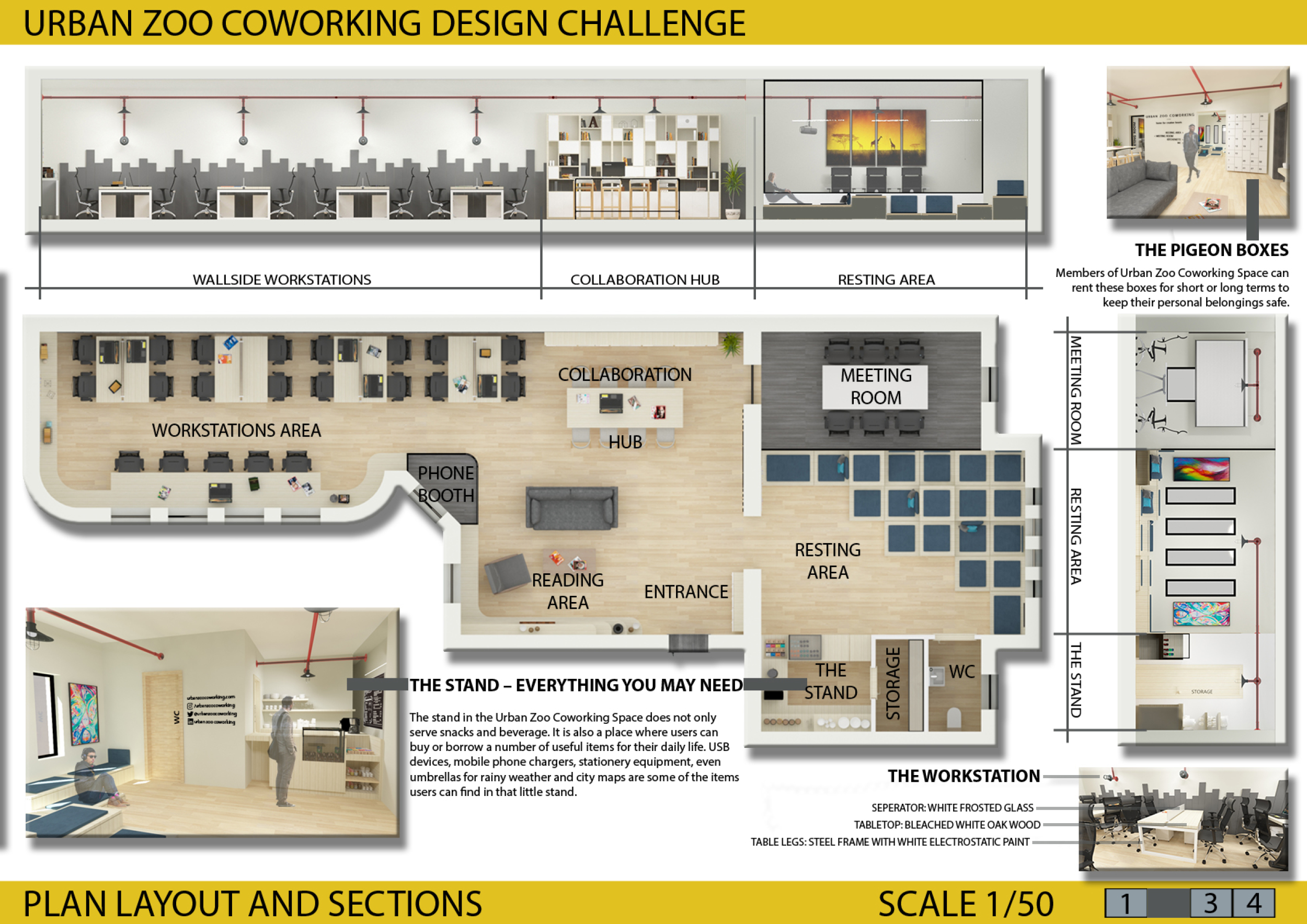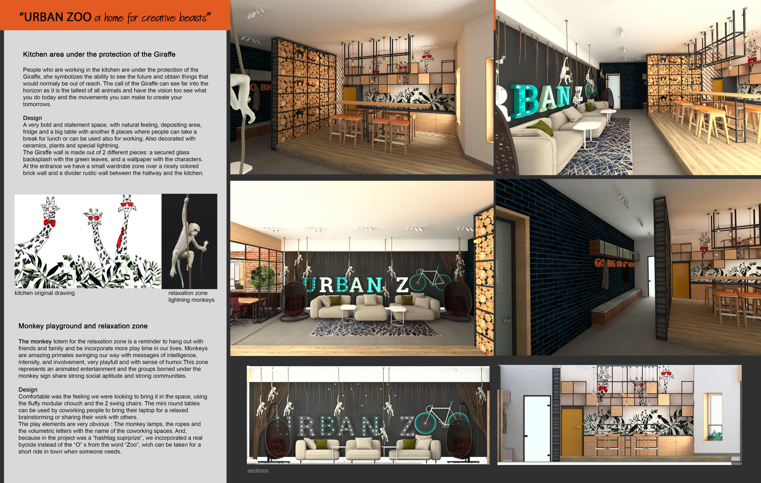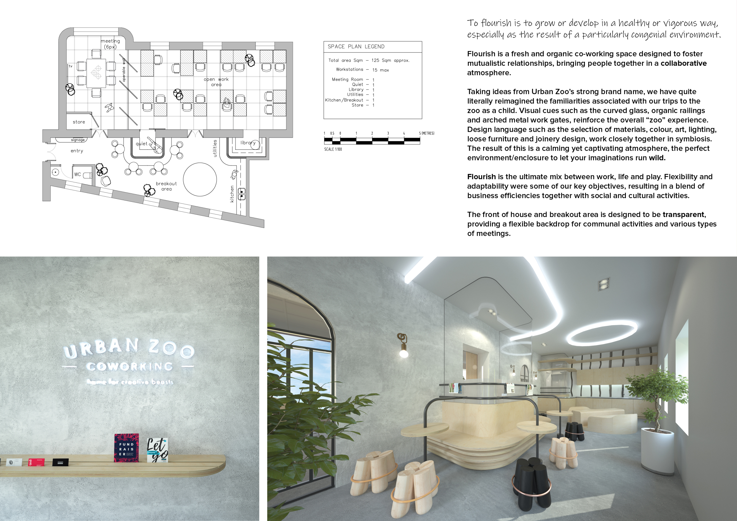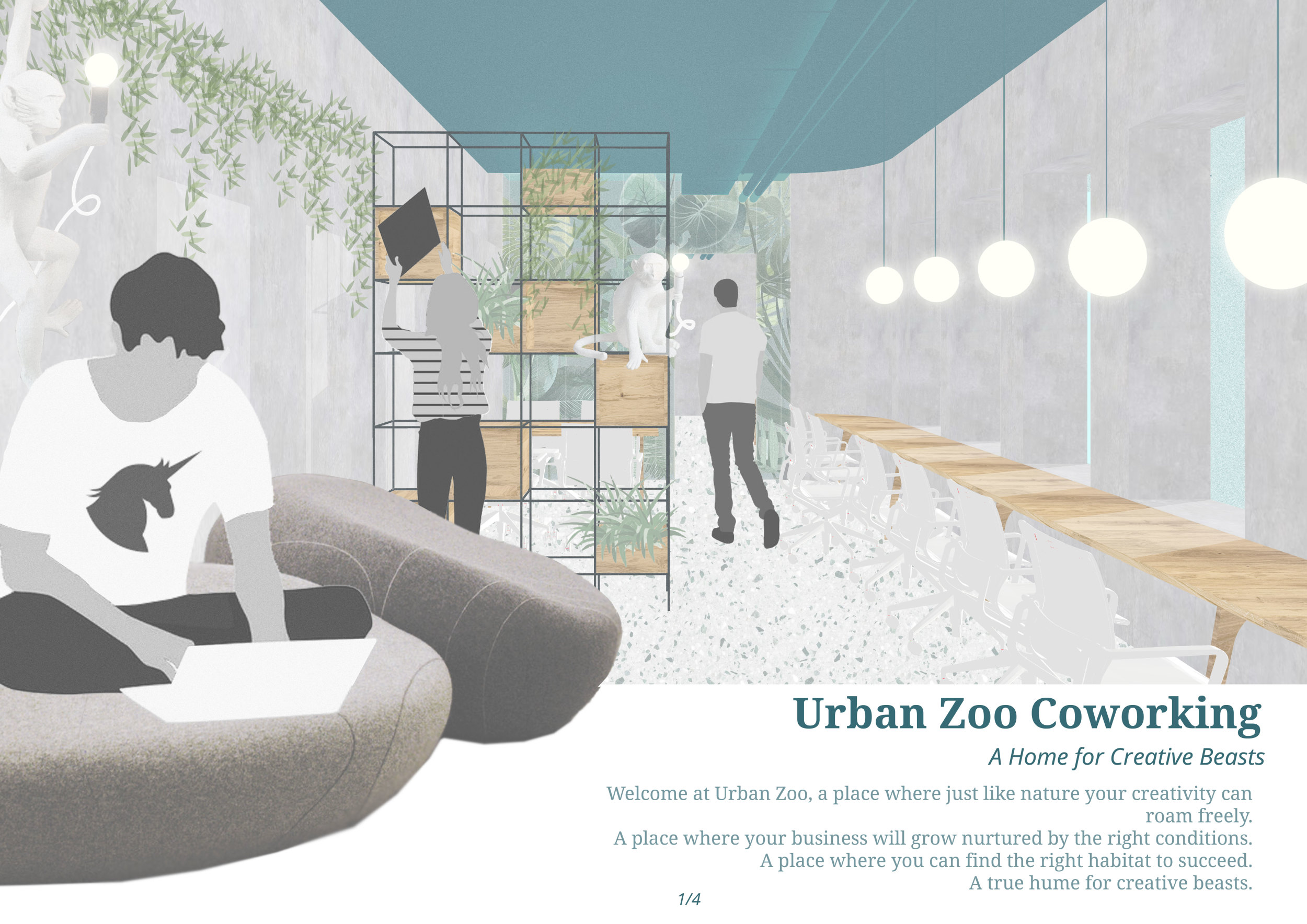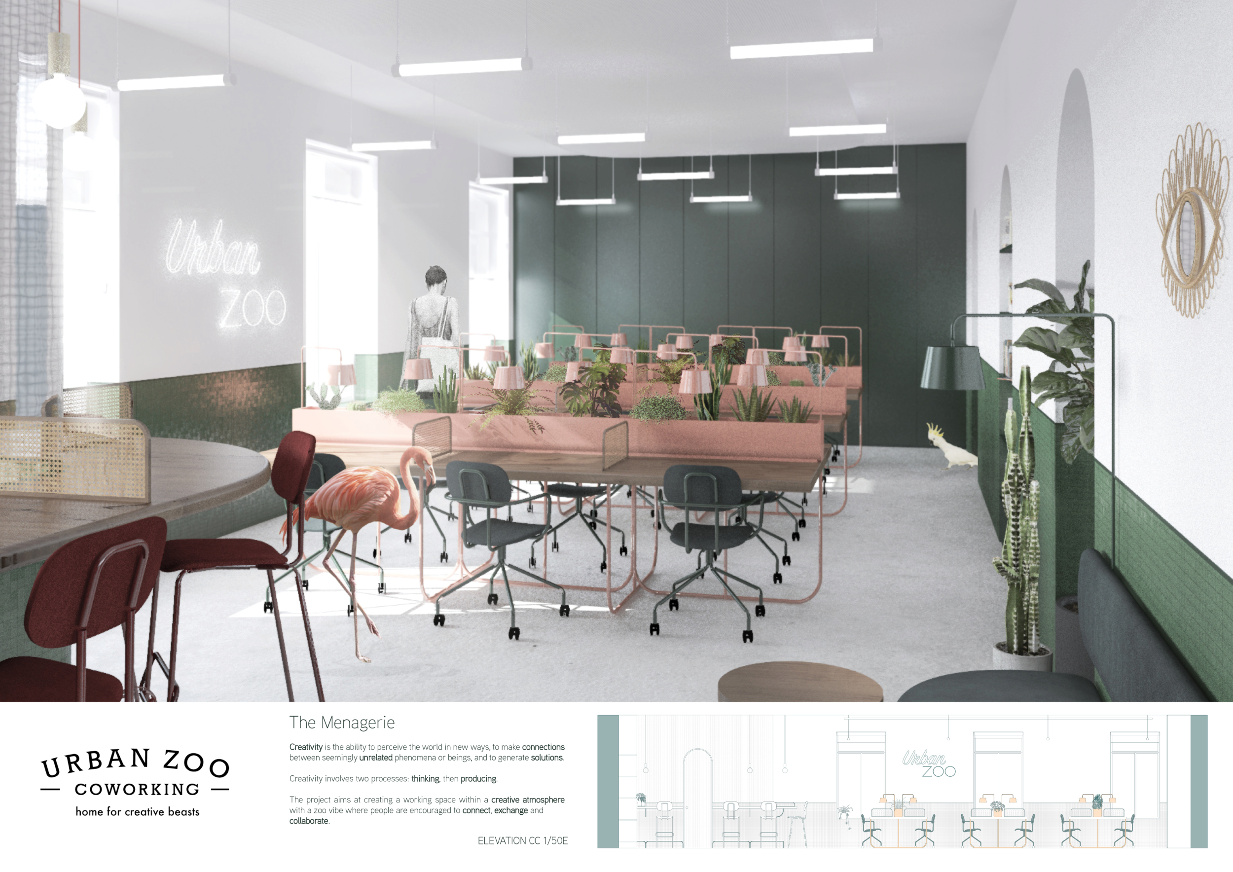 Urban Zoo Coworking was looking for a signature style for their co-working spaces, an interior design that could be applied to each new venue and customised to suit the creative needs of its users, from freelancers to startups and small businesses. Participants were challenged to create a unique space that would distinguish it from other traditional offices, invoking a sense of creativity and collaboration within the space.