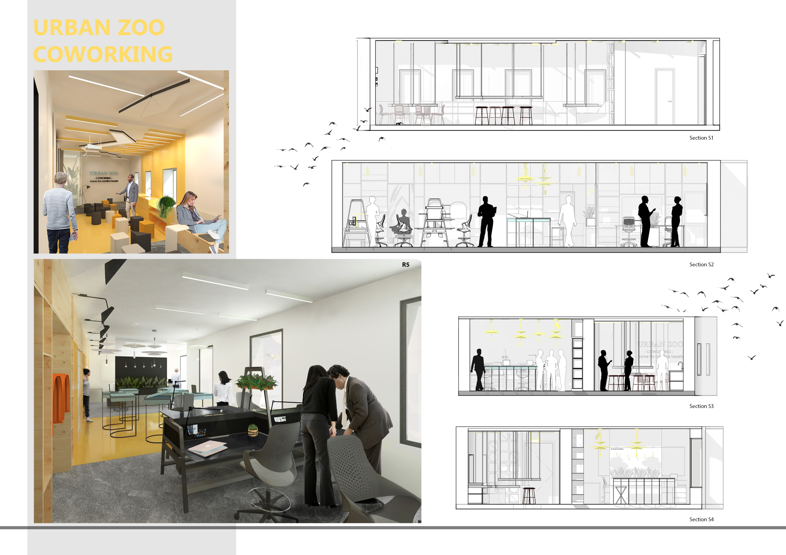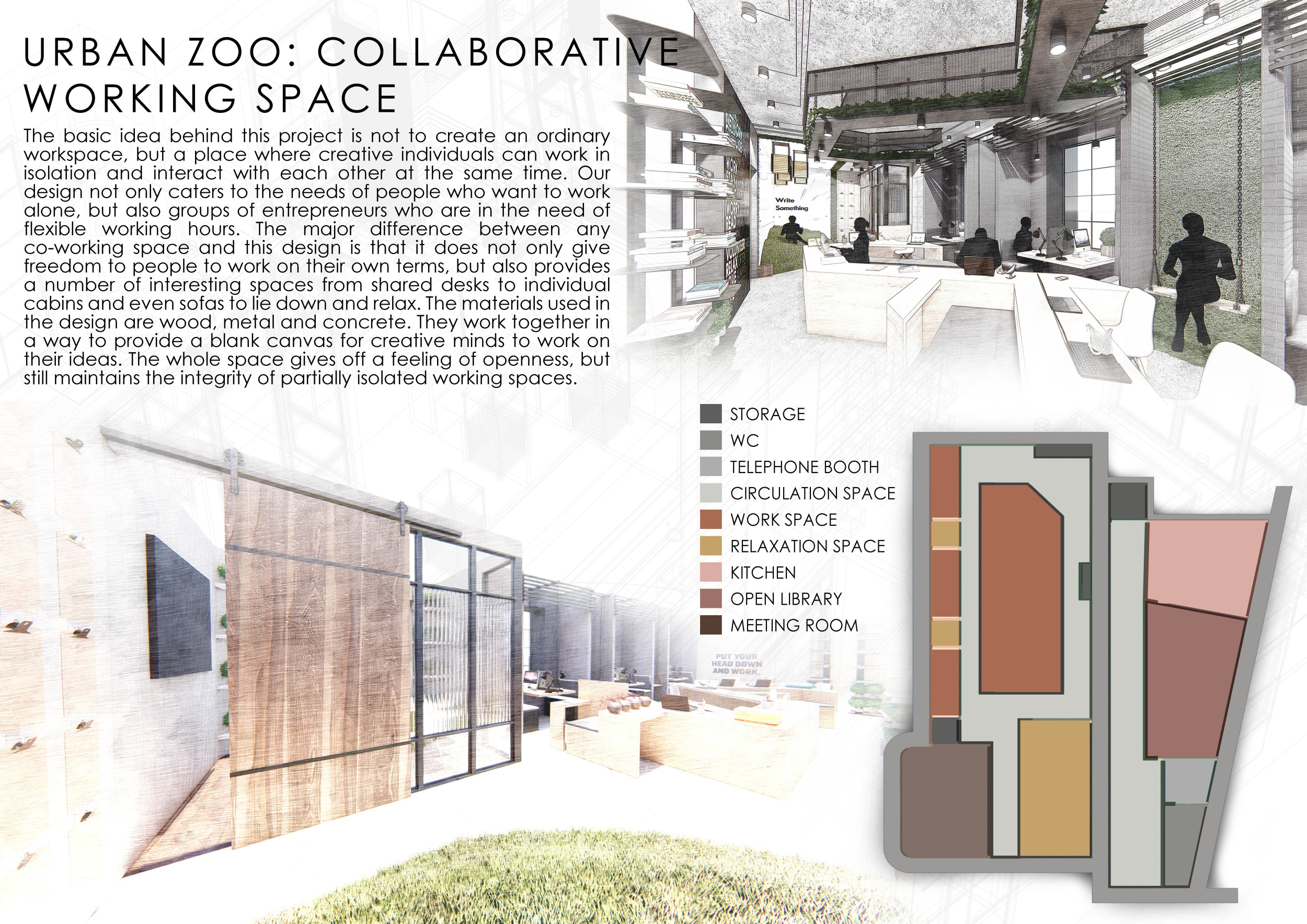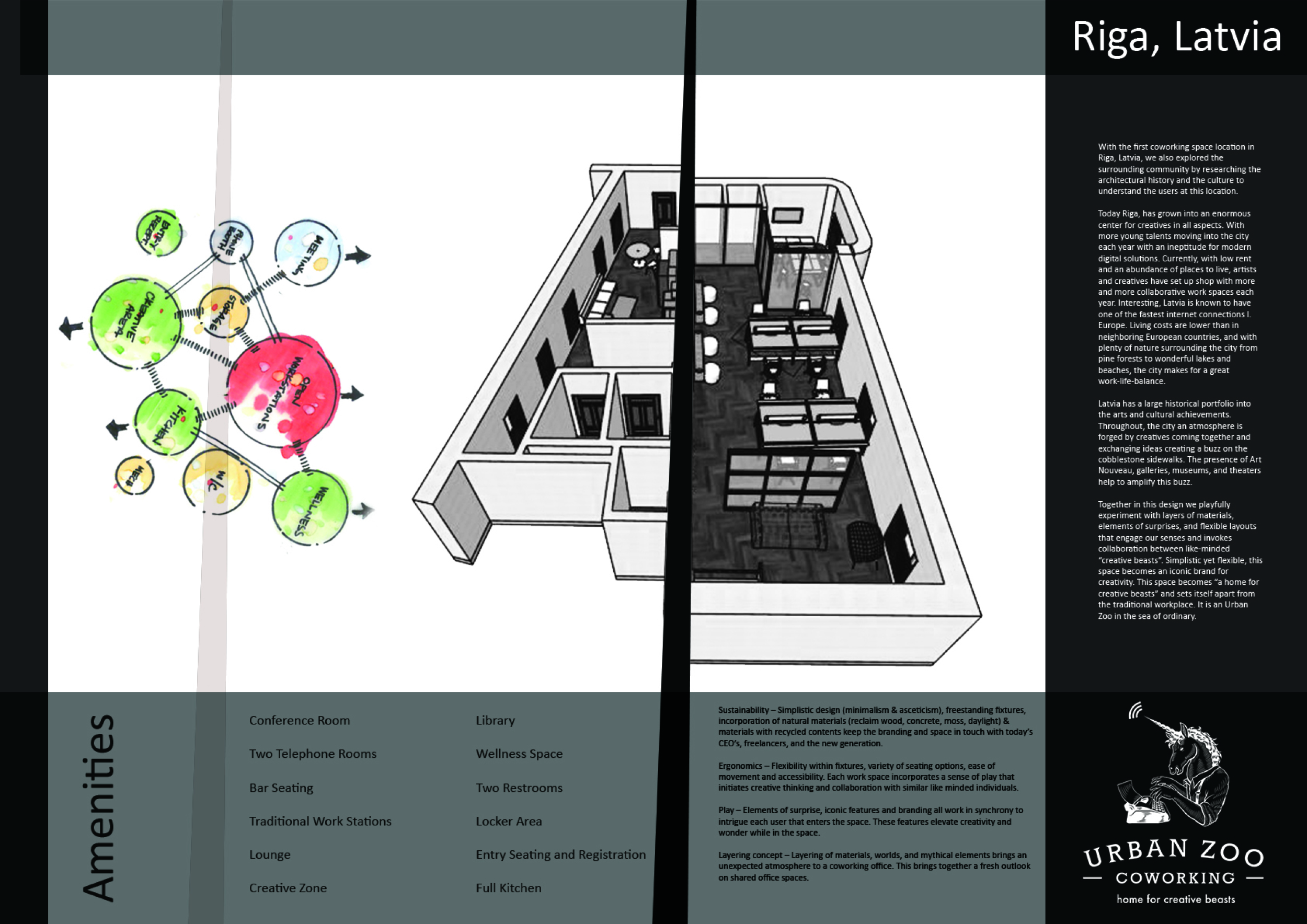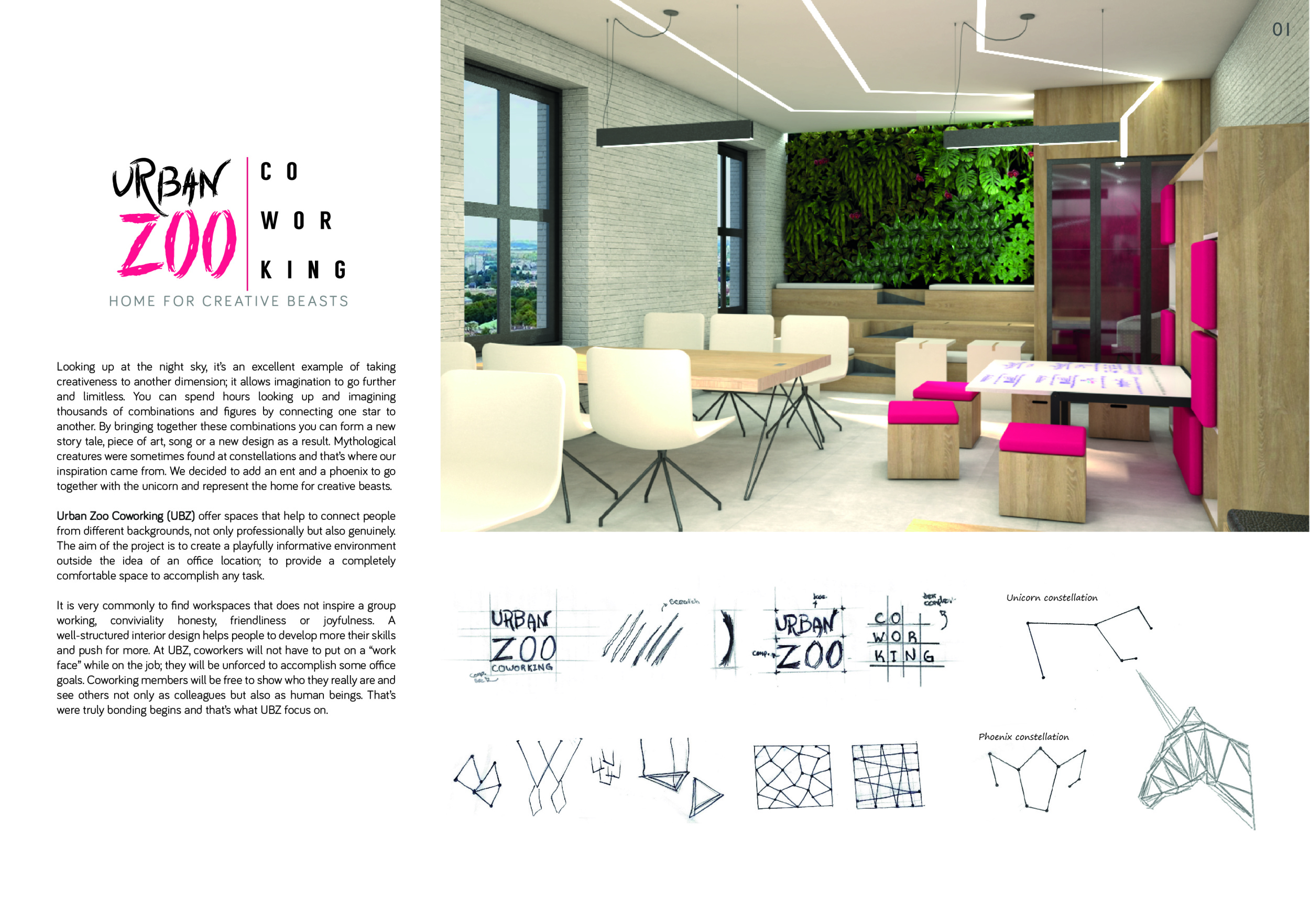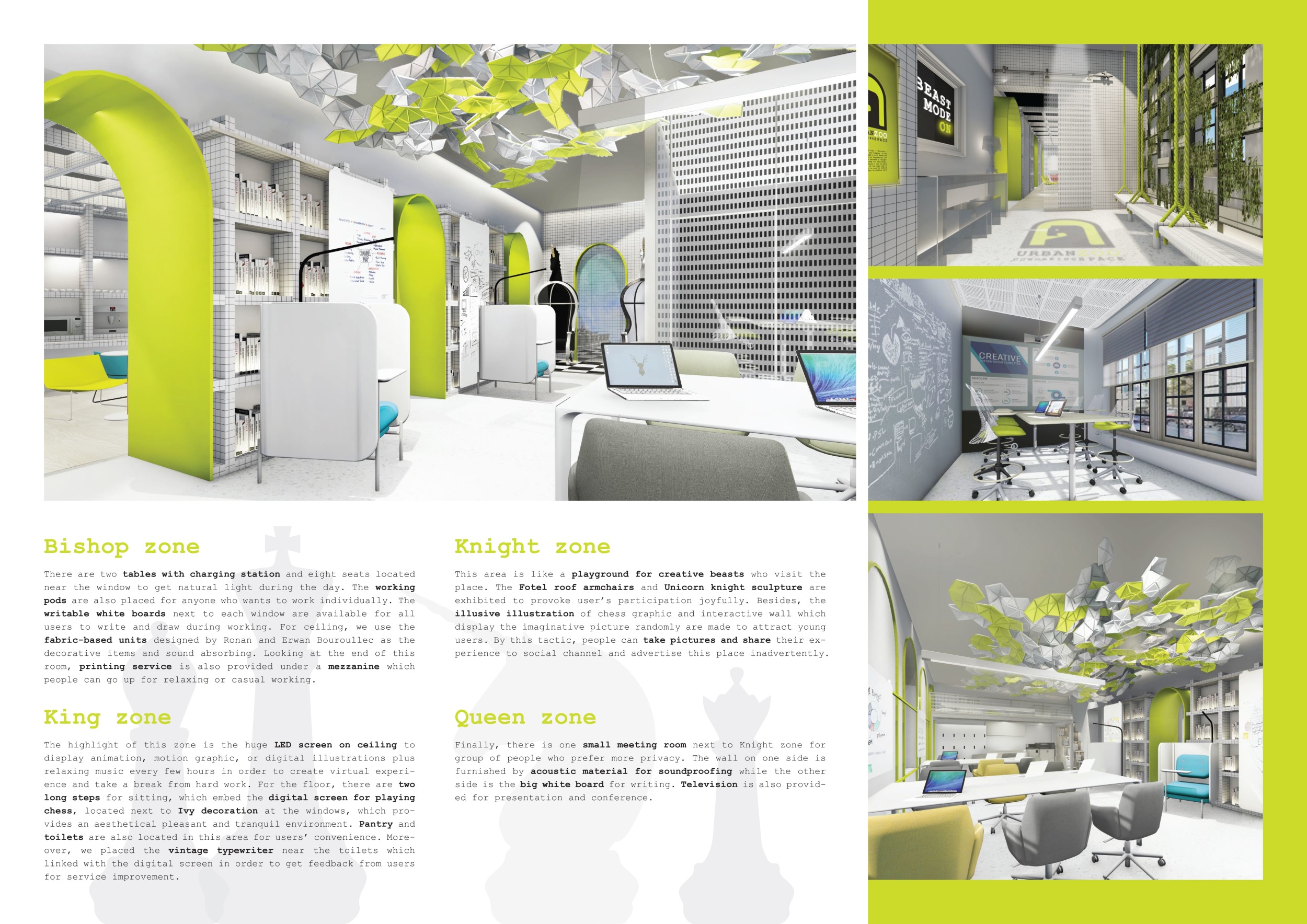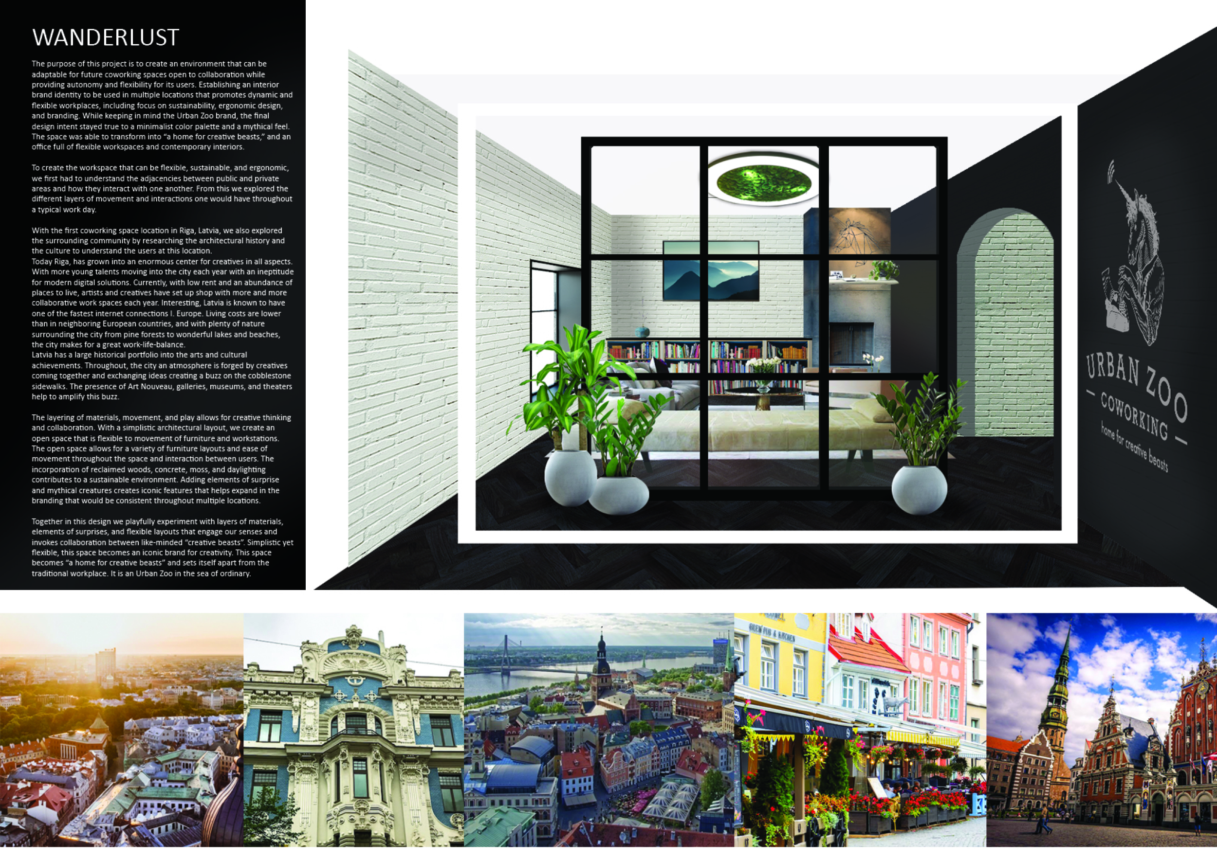 Urban Zoo Coworking was looking for a signature style for their co-working spaces, an interior design that could be applied to each new venue and customised to suit the creative needs of its users, from freelancers to startups and small businesses. Participants were challenged to create a unique space that would distinguish it from other traditional offices, invoking a sense of creativity and collaboration within the space.