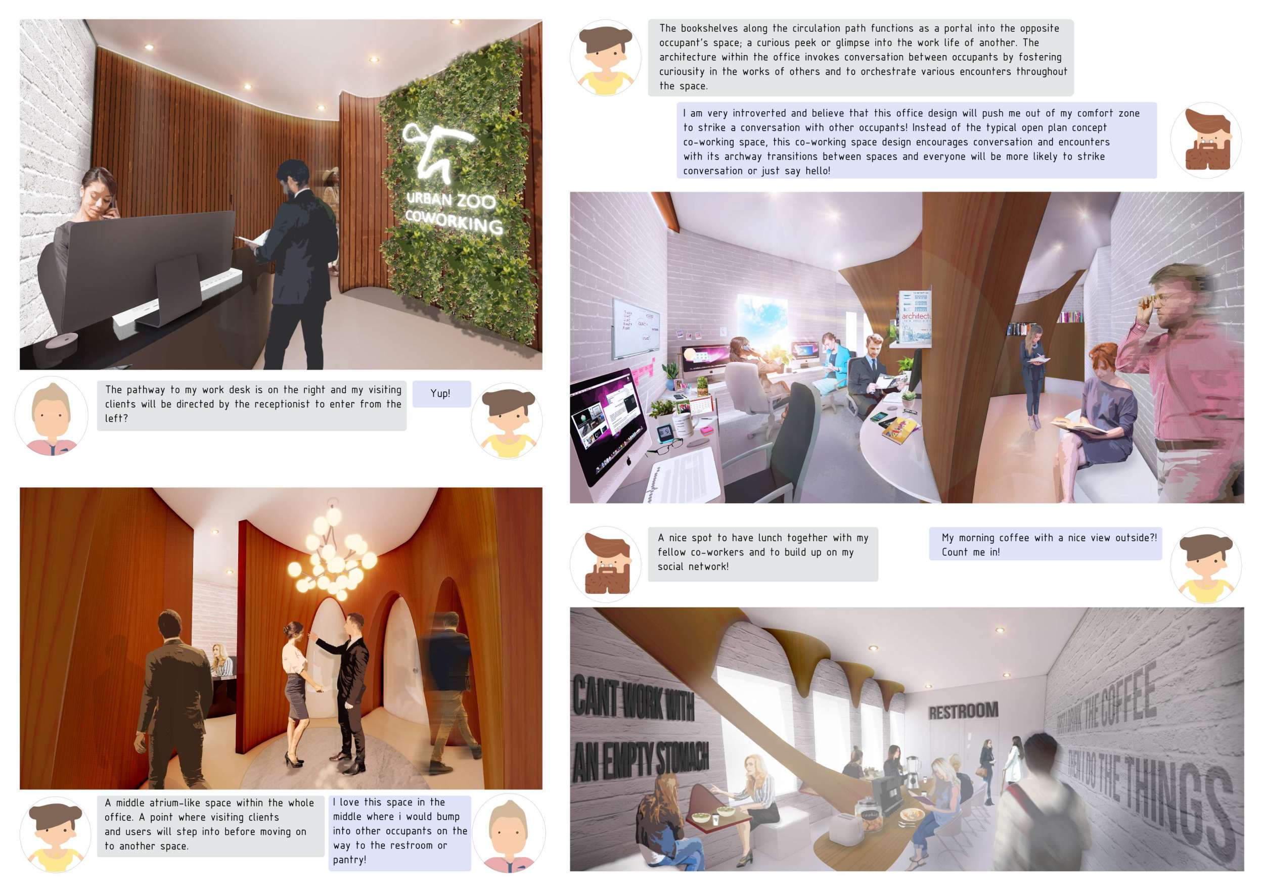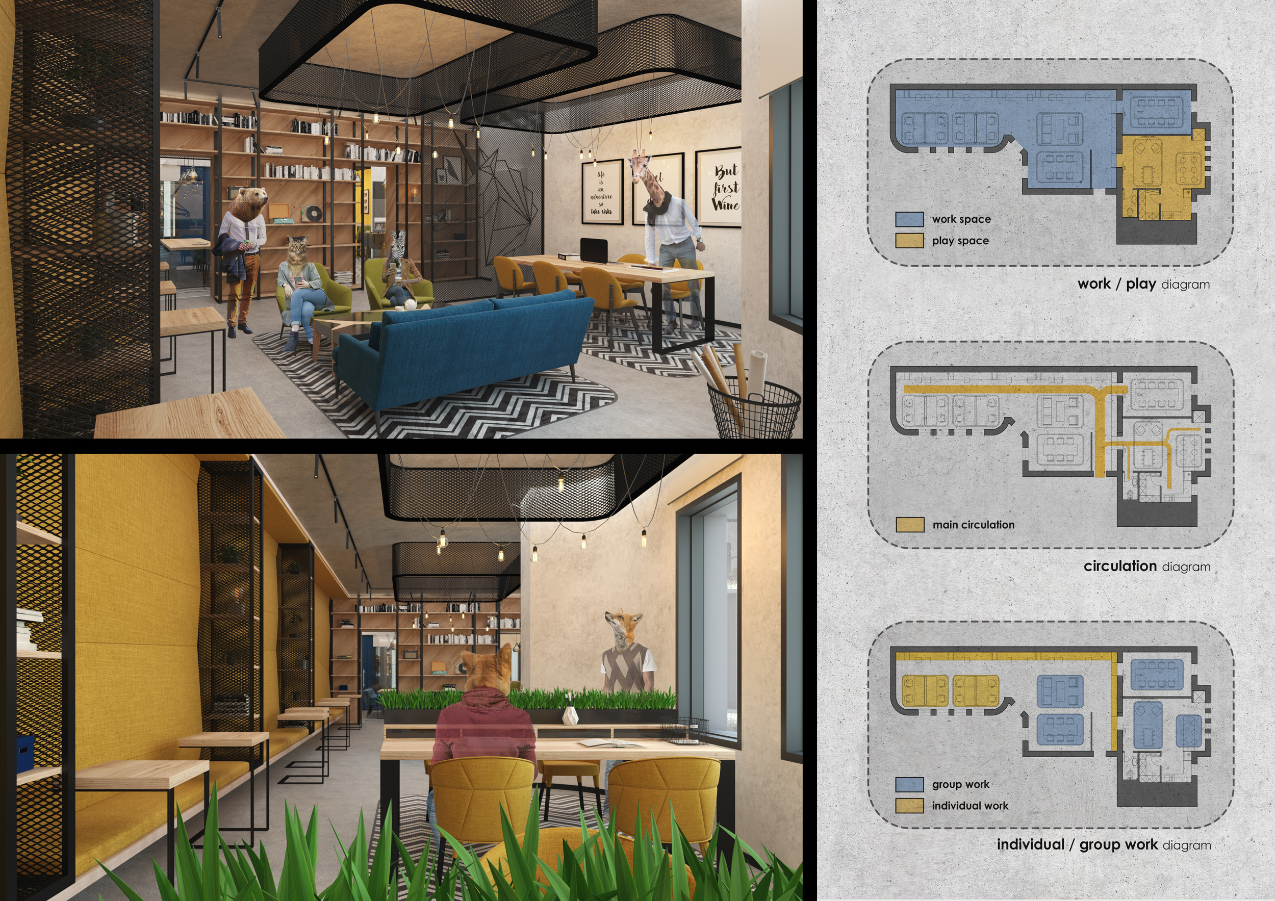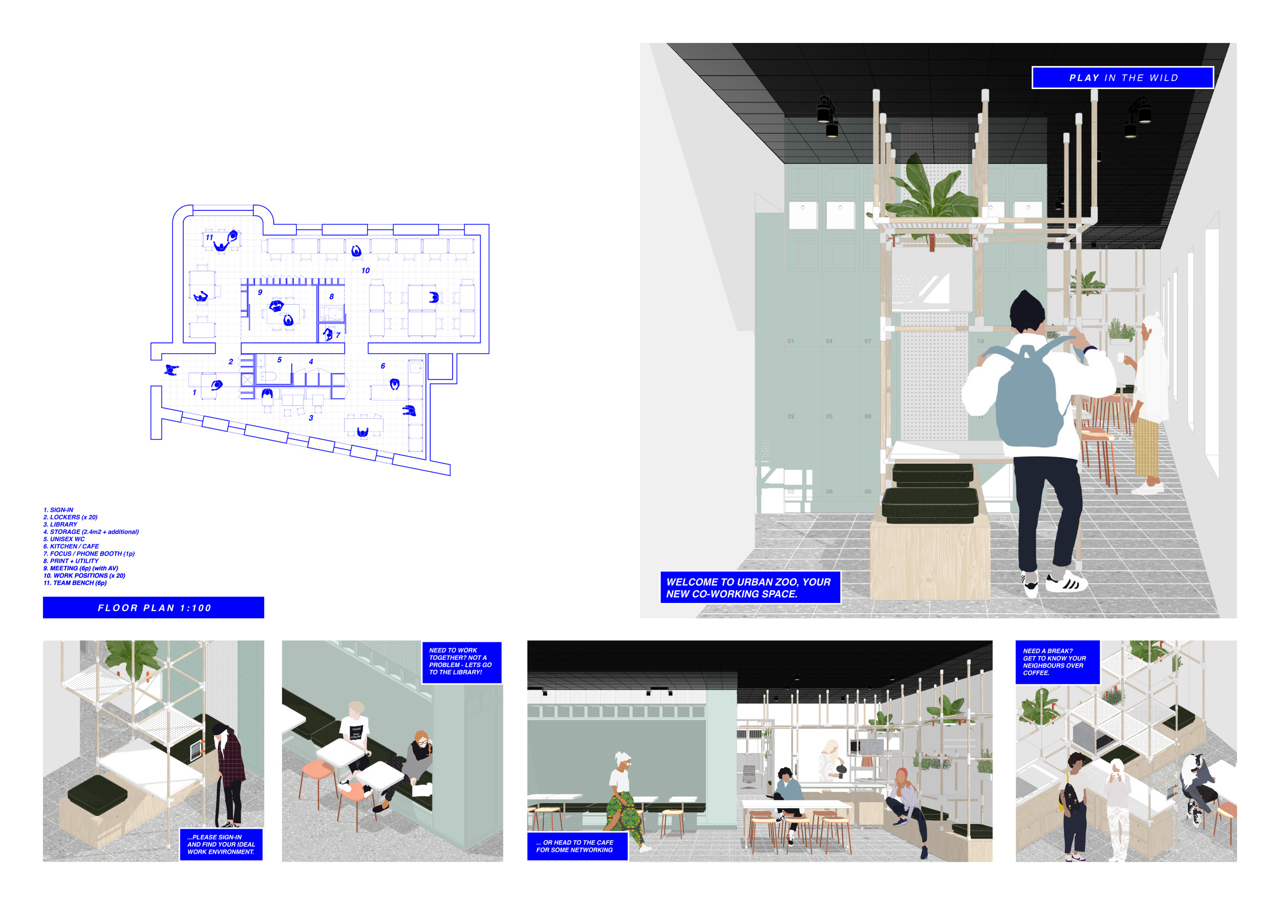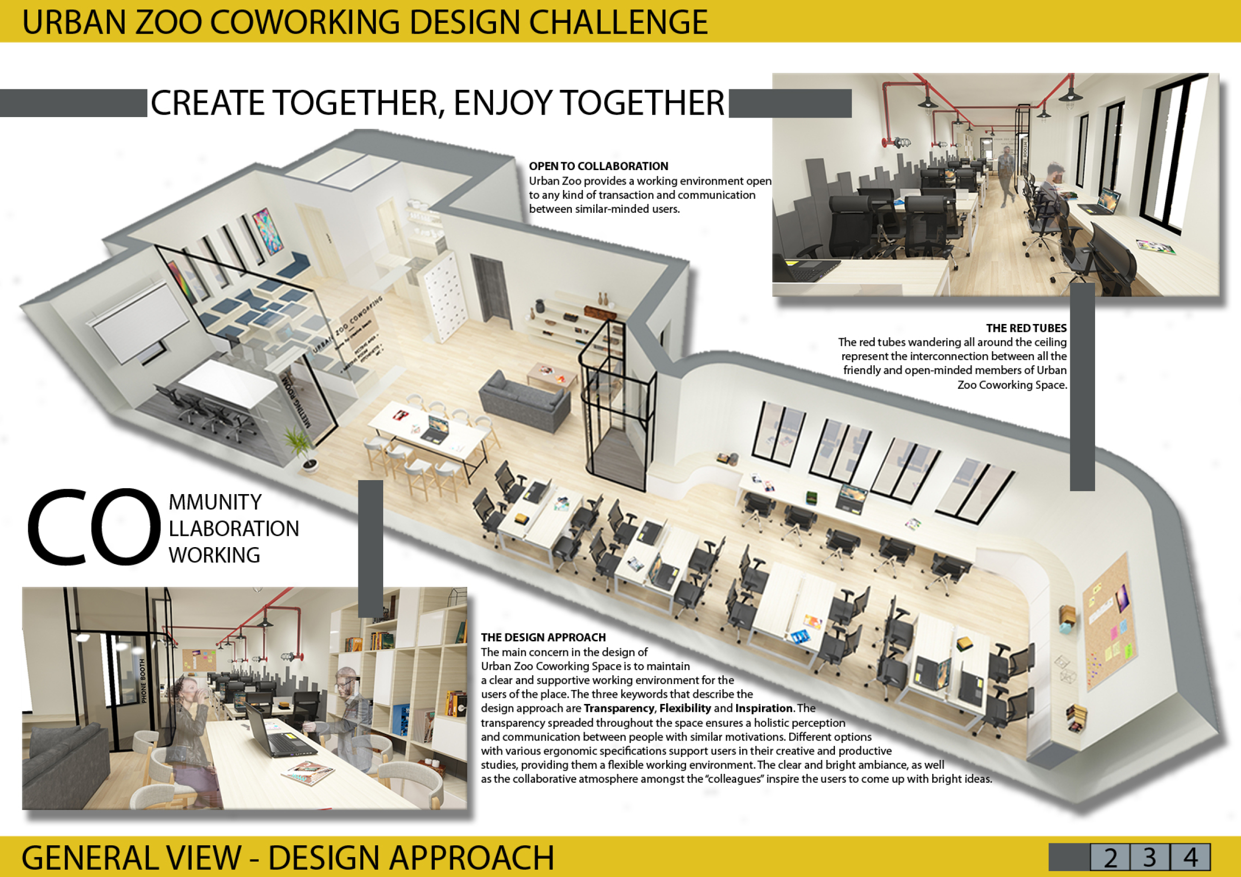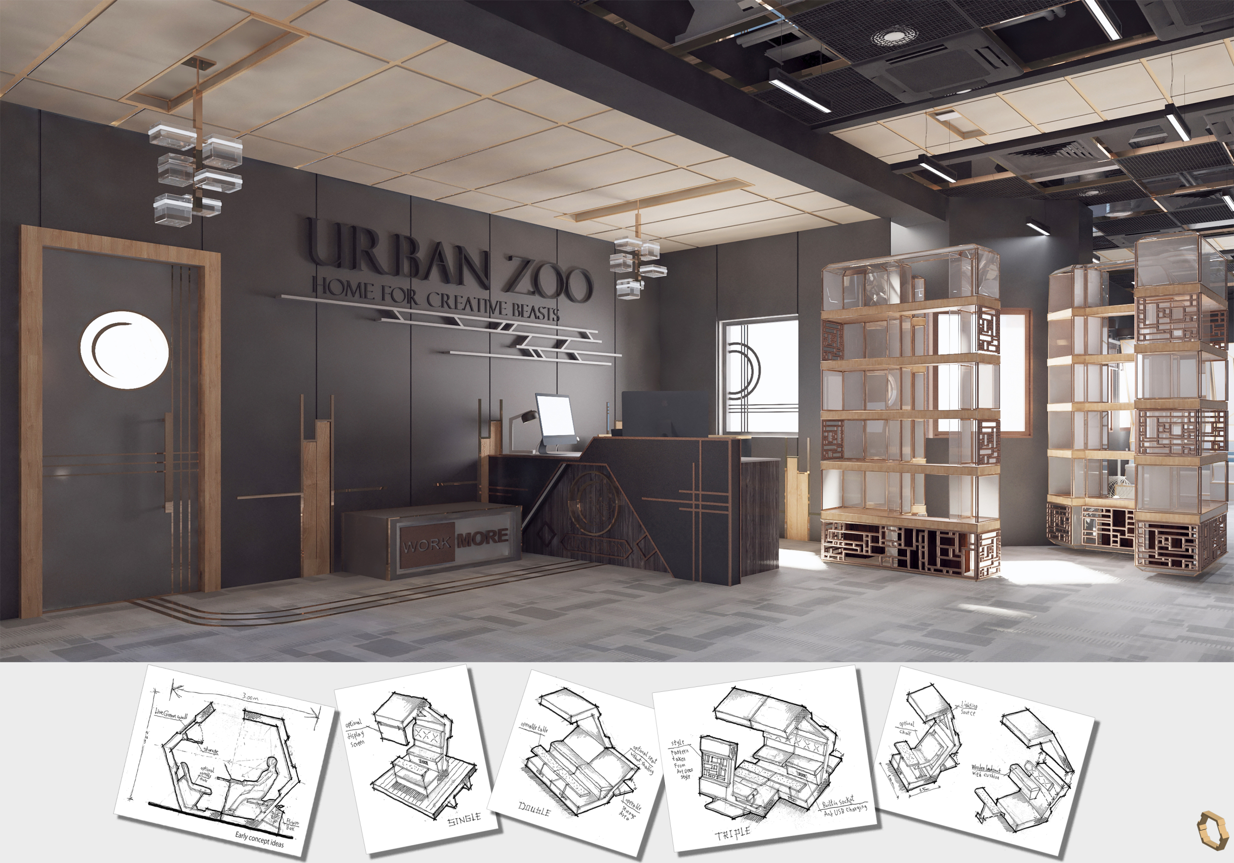 Urban Zoo Coworking was looking for a signature style for their co-working spaces, an interior design that could be applied to each new venue and customised to suit the creative needs of its users, from freelancers to startups and small businesses. Participants were challenged to create a unique space that would distinguish it from other traditional offices, invoking a sense of creativity and collaboration within the space.