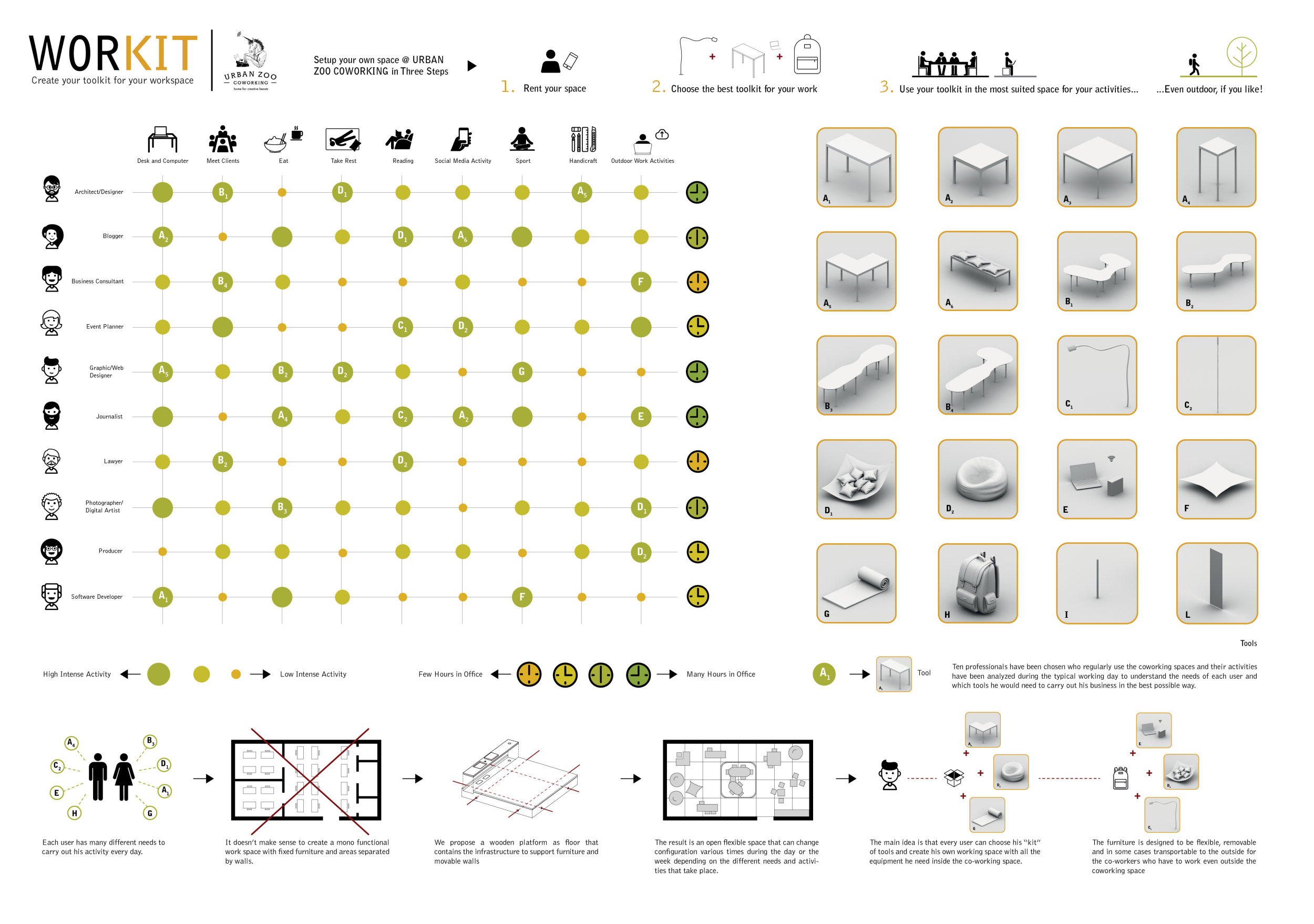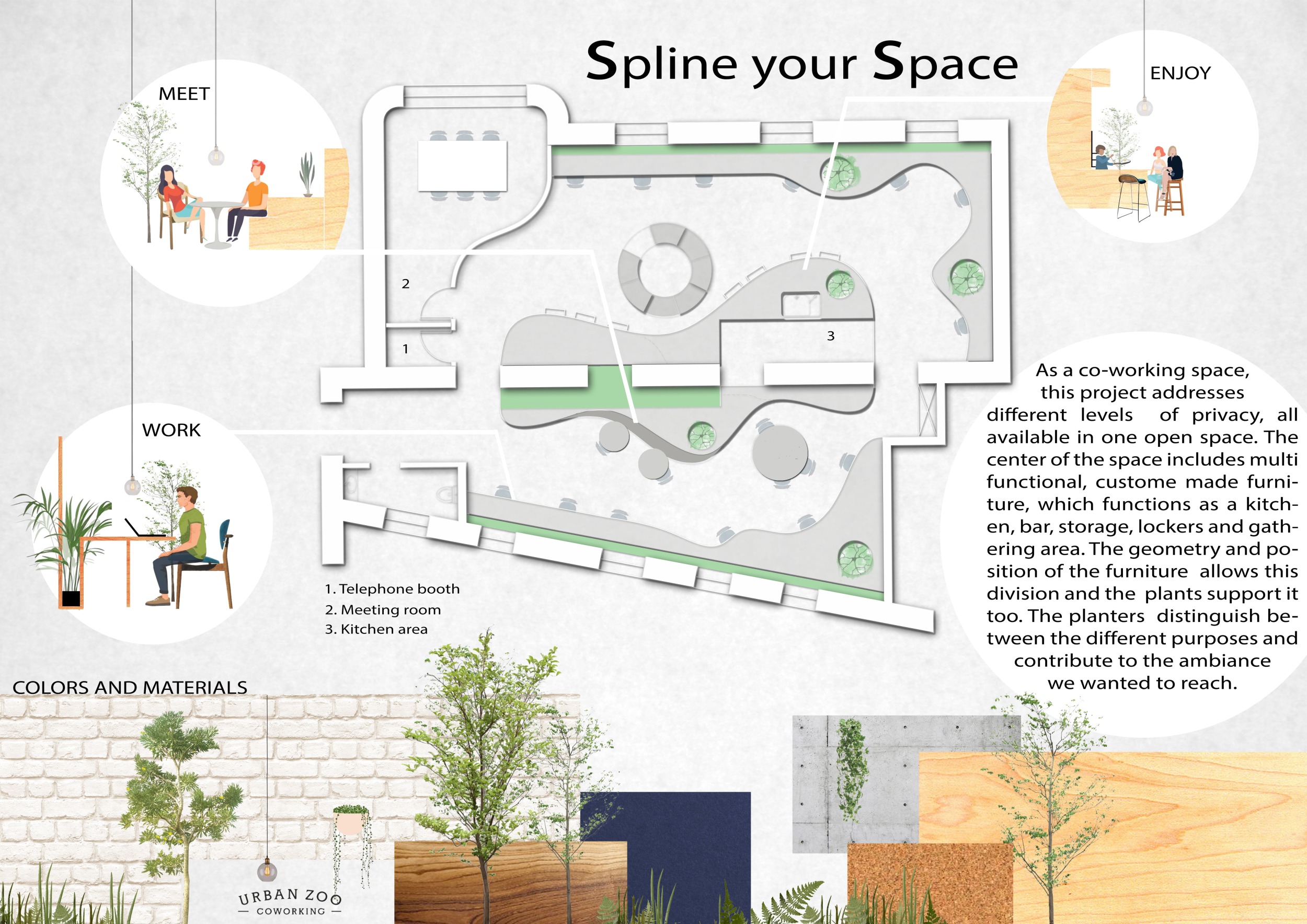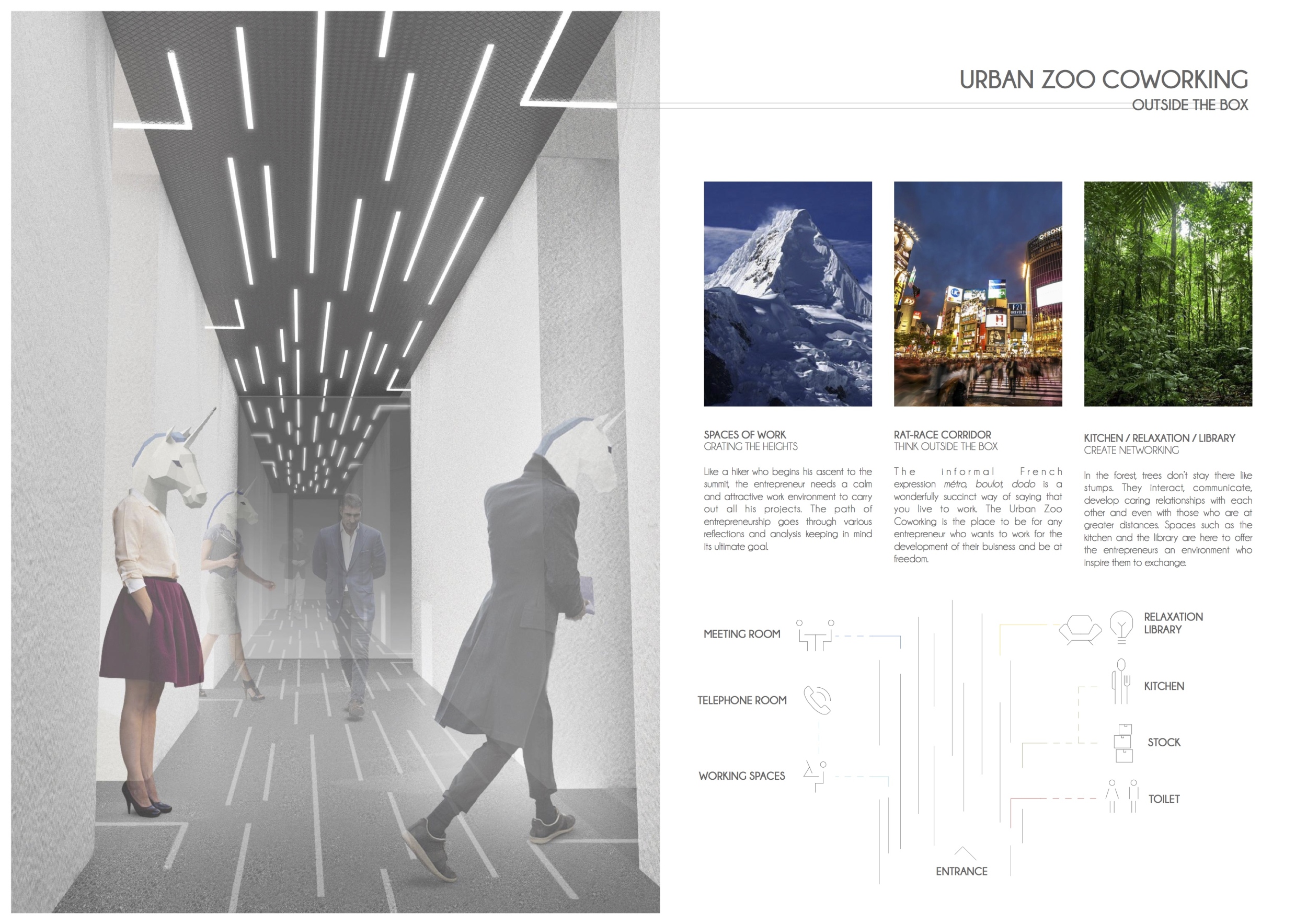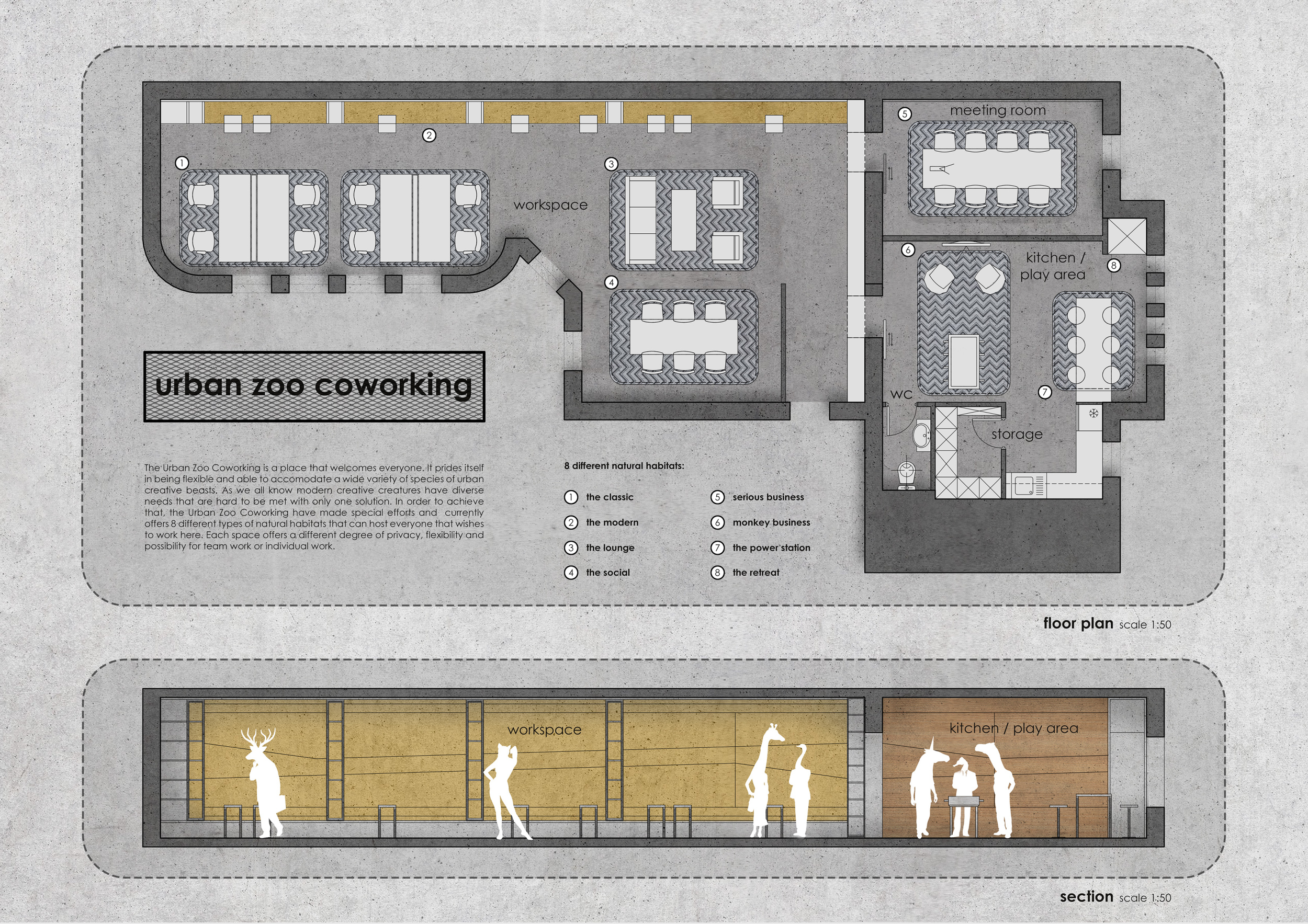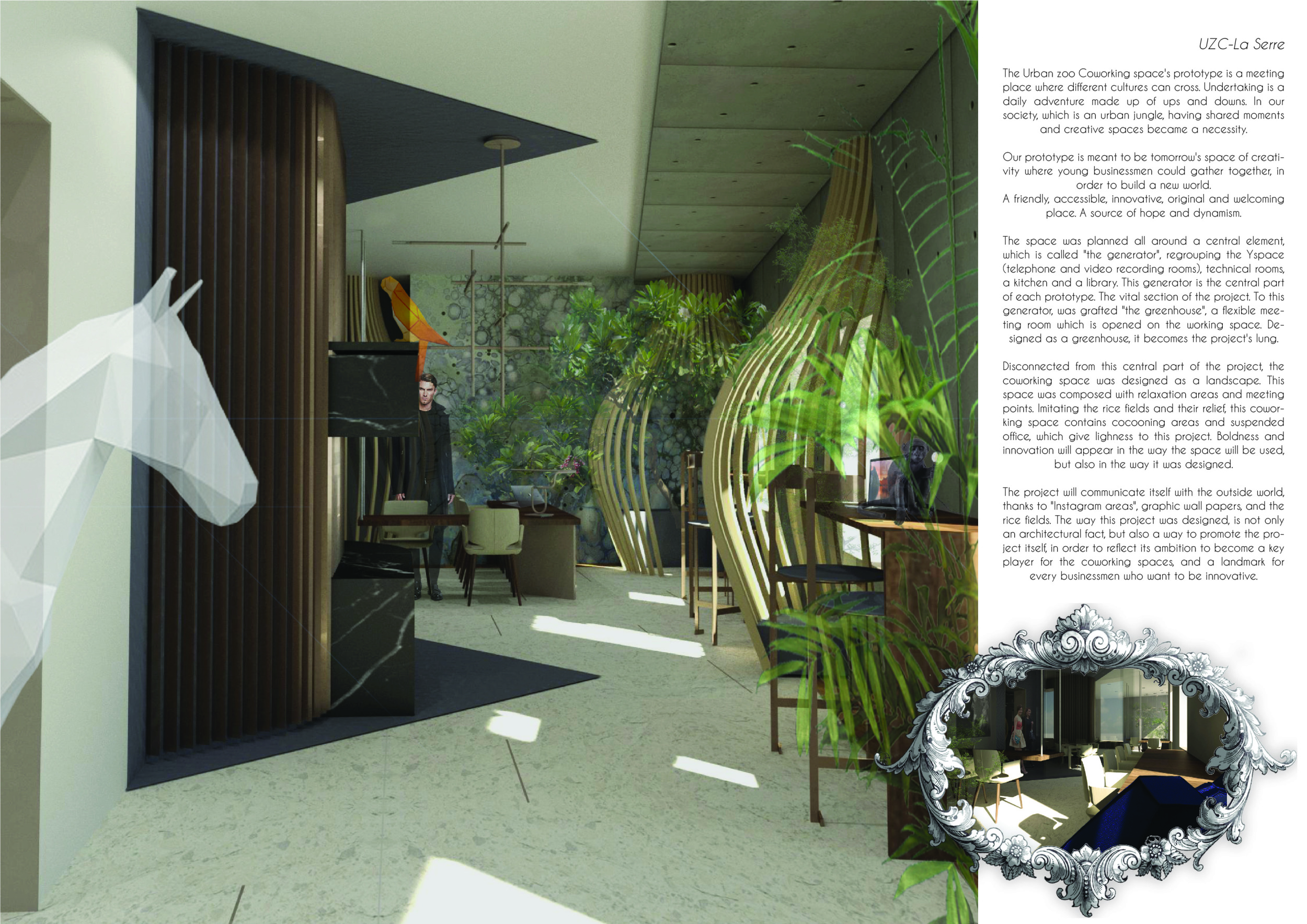 Urban Zoo Coworking was looking for a signature style for their co-working spaces, an interior design that could be applied to each new venue and customised to suit the creative needs of its users, from freelancers to startups and small businesses. Participants were challenged to create a unique space that would distinguish it from other traditional offices, invoking a sense of creativity and collaboration within the space.