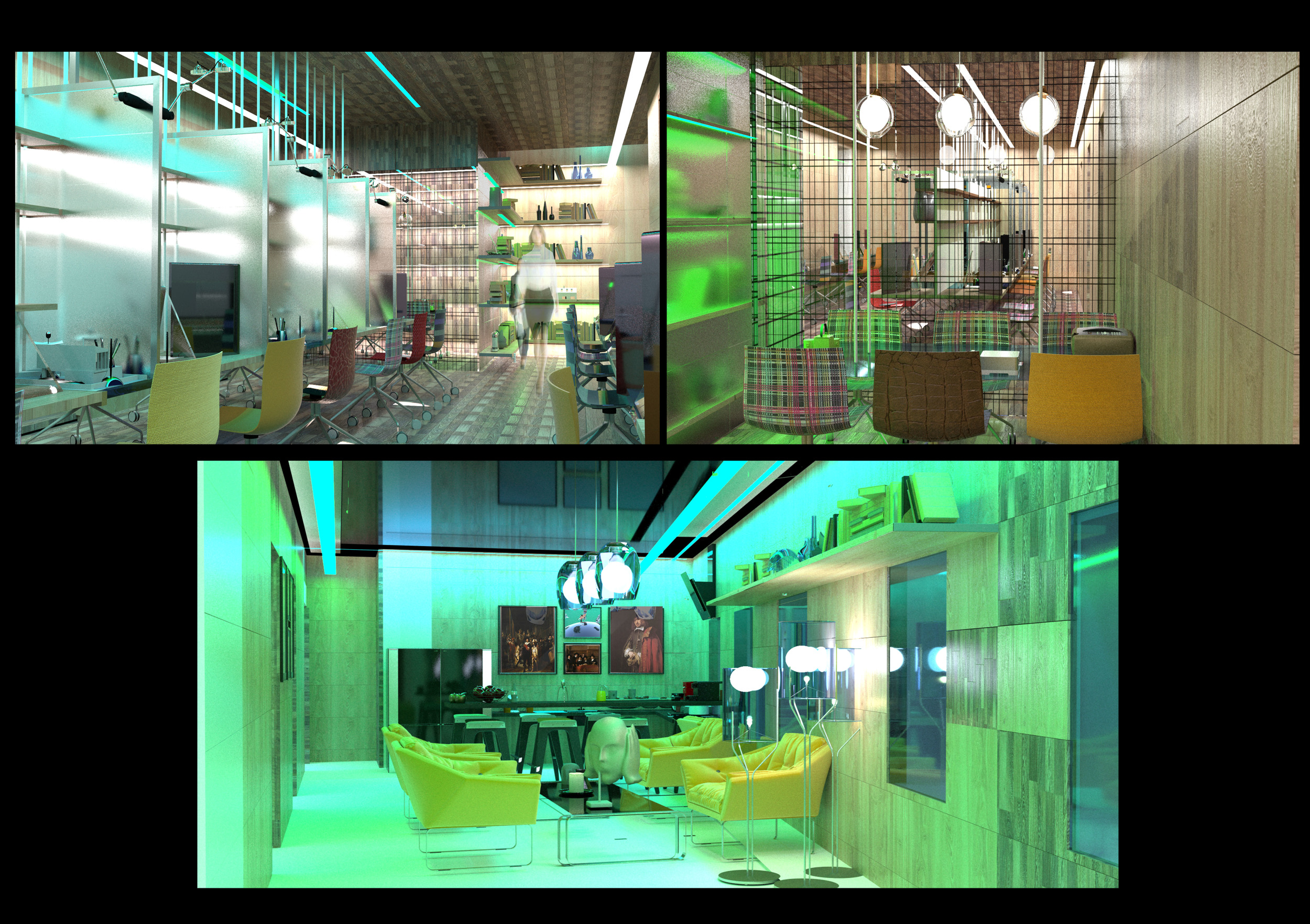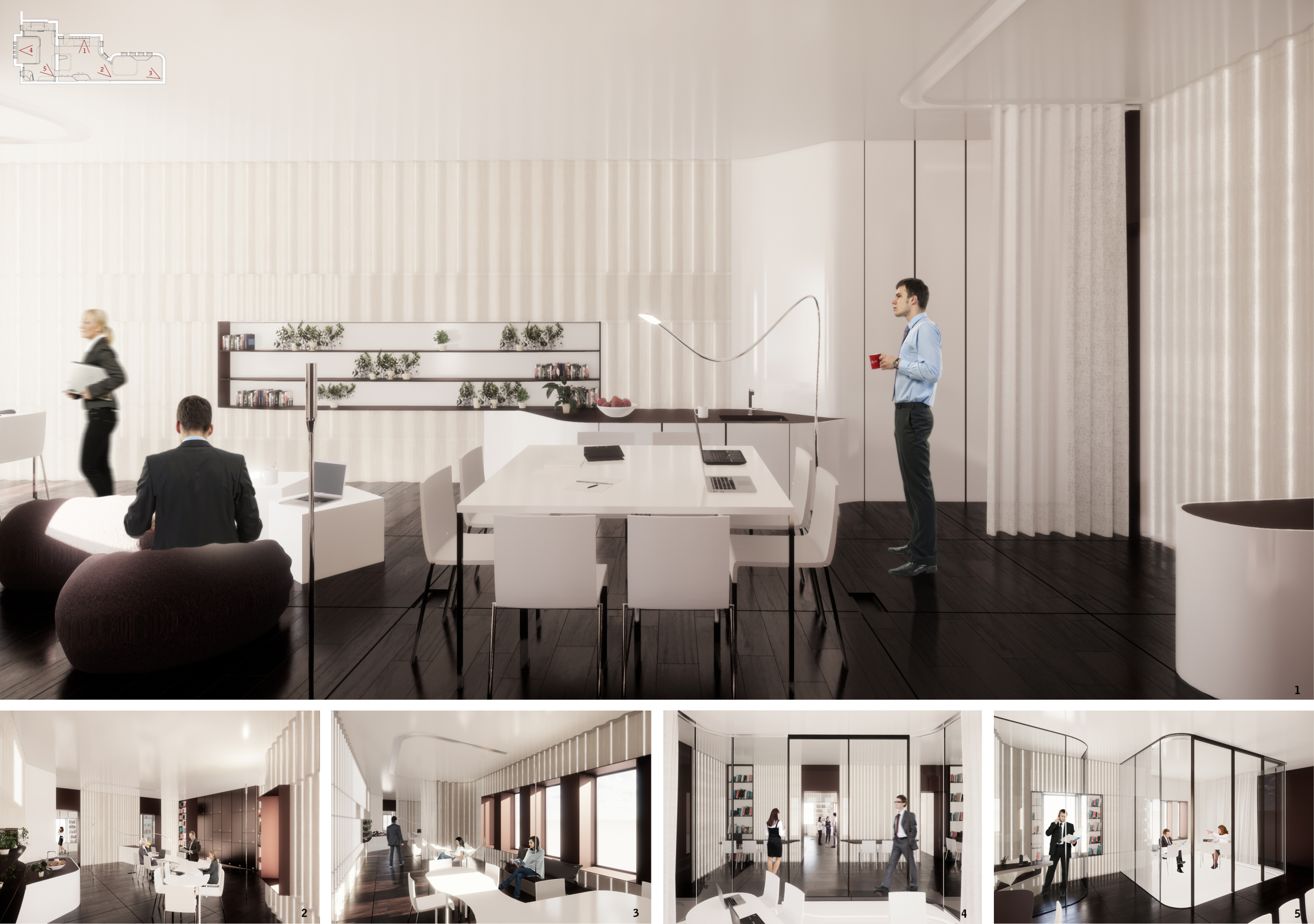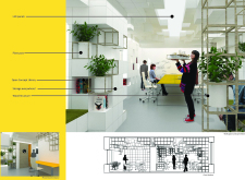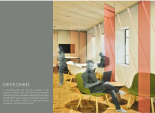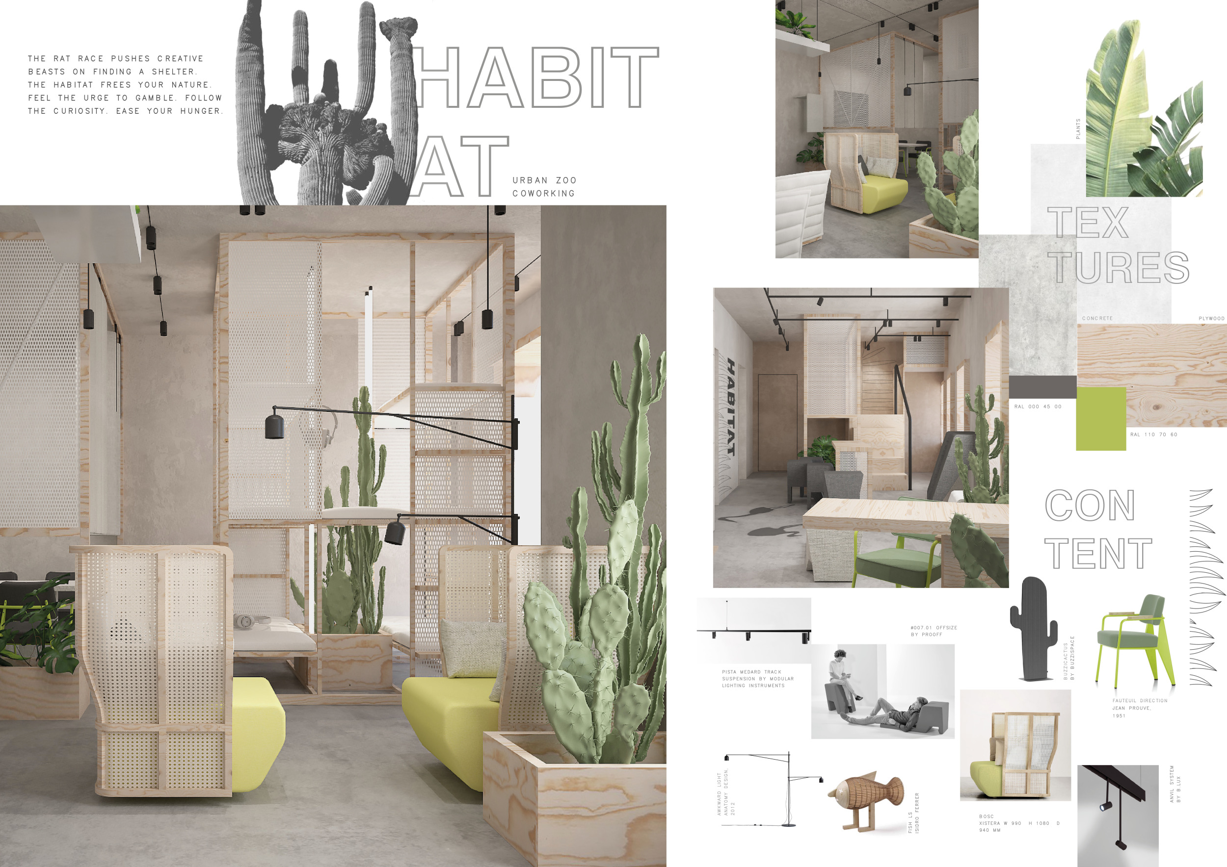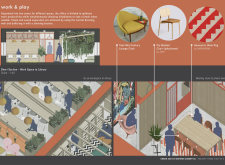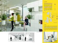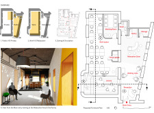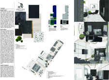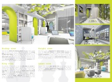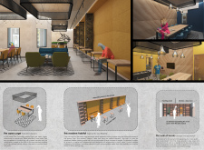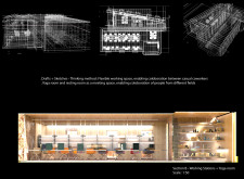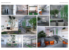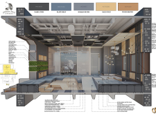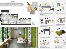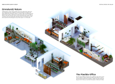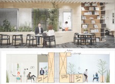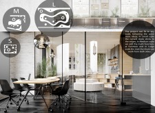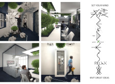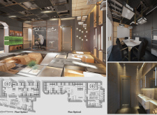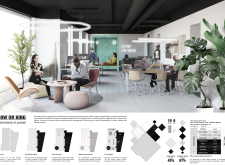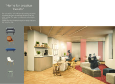 The Habitat project is one of the few conventional designs, with a straightforward color scheme of natural wood and plants to create a habitat where creatives could escape the rat race. The jury panel especially complimented the smart and coherent approach to zoning, with different areas being defined as settlements, nests, and jungles, each constructed by a unique arrangement of modular units. Read more The selection of the modular furniture, as well as the overall level of the concept detail, made for a compelling and intriguing working environment.