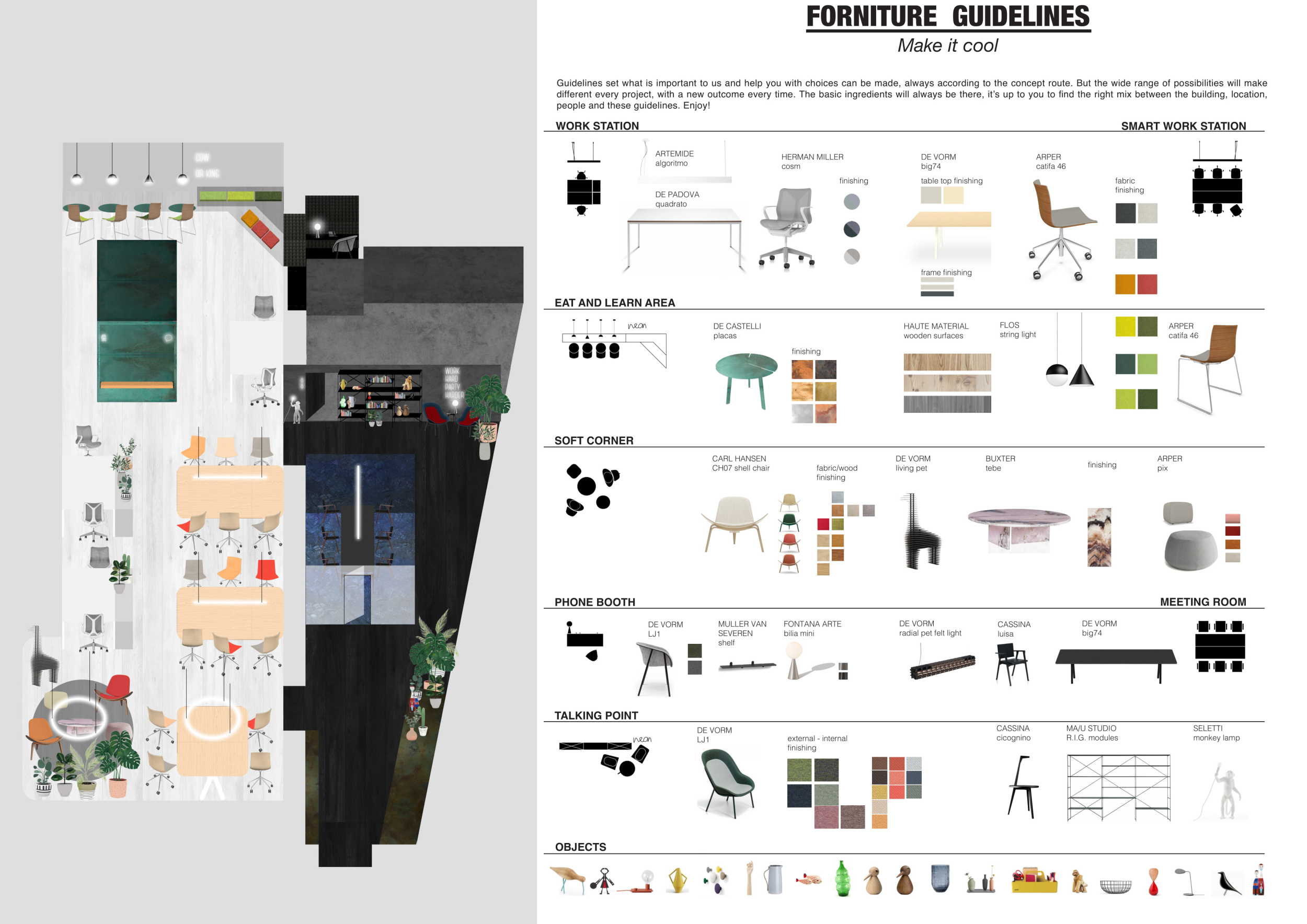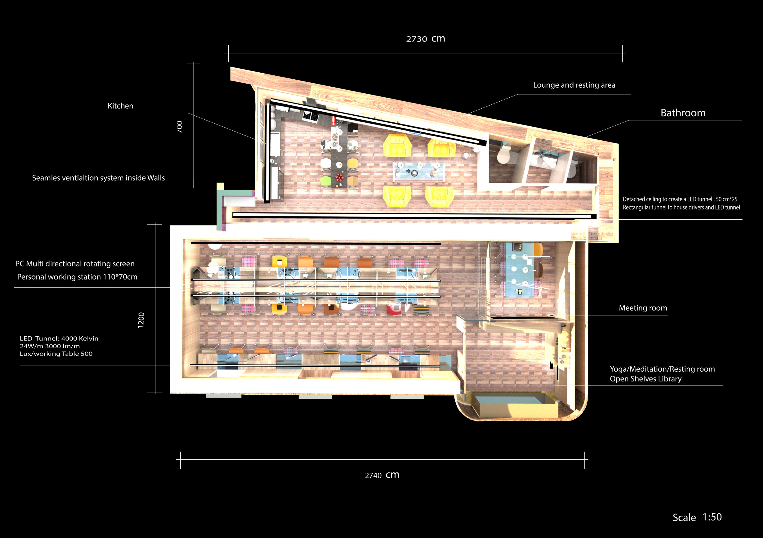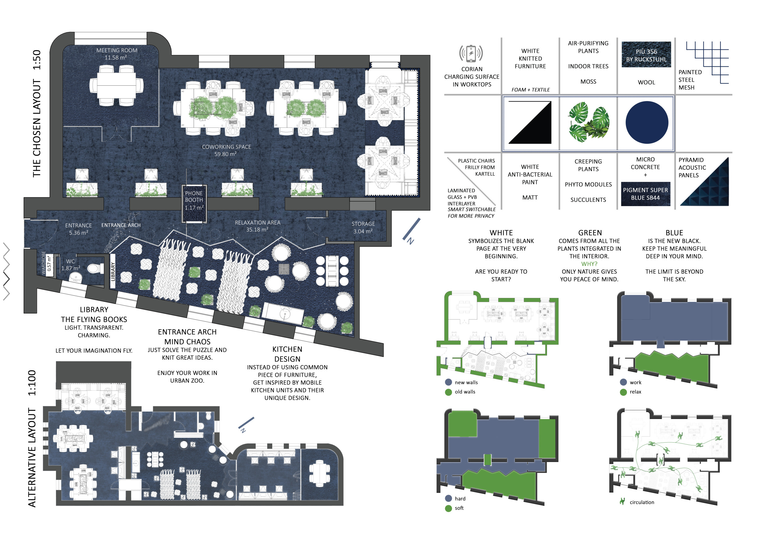 The Habitat project is one of the few conventional designs, with a straightforward color scheme of natural wood and plants to create a habitat where creatives could escape the rat race. The jury panel especially complimented the smart and coherent approach to zoning, with different areas being defined as settlements, nests, and jungles, each constructed by a unique arrangement of modular units. Read more The selection of the modular furniture, as well as the overall level of the concept detail, made for a compelling and intriguing working environment.