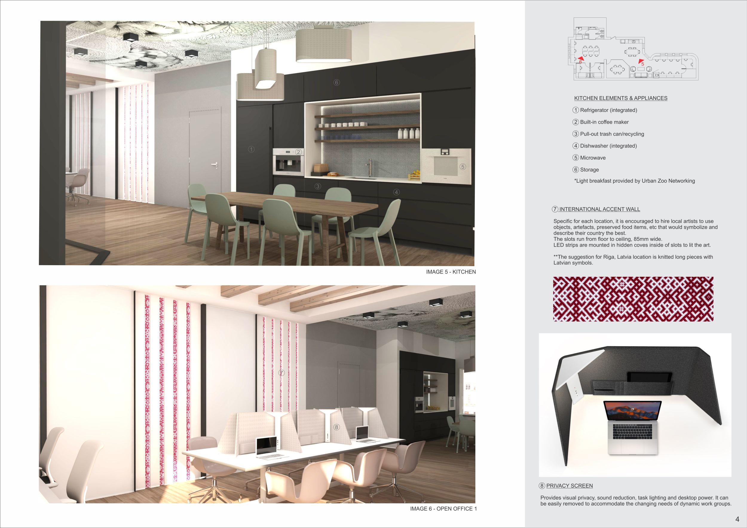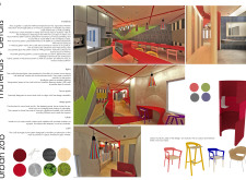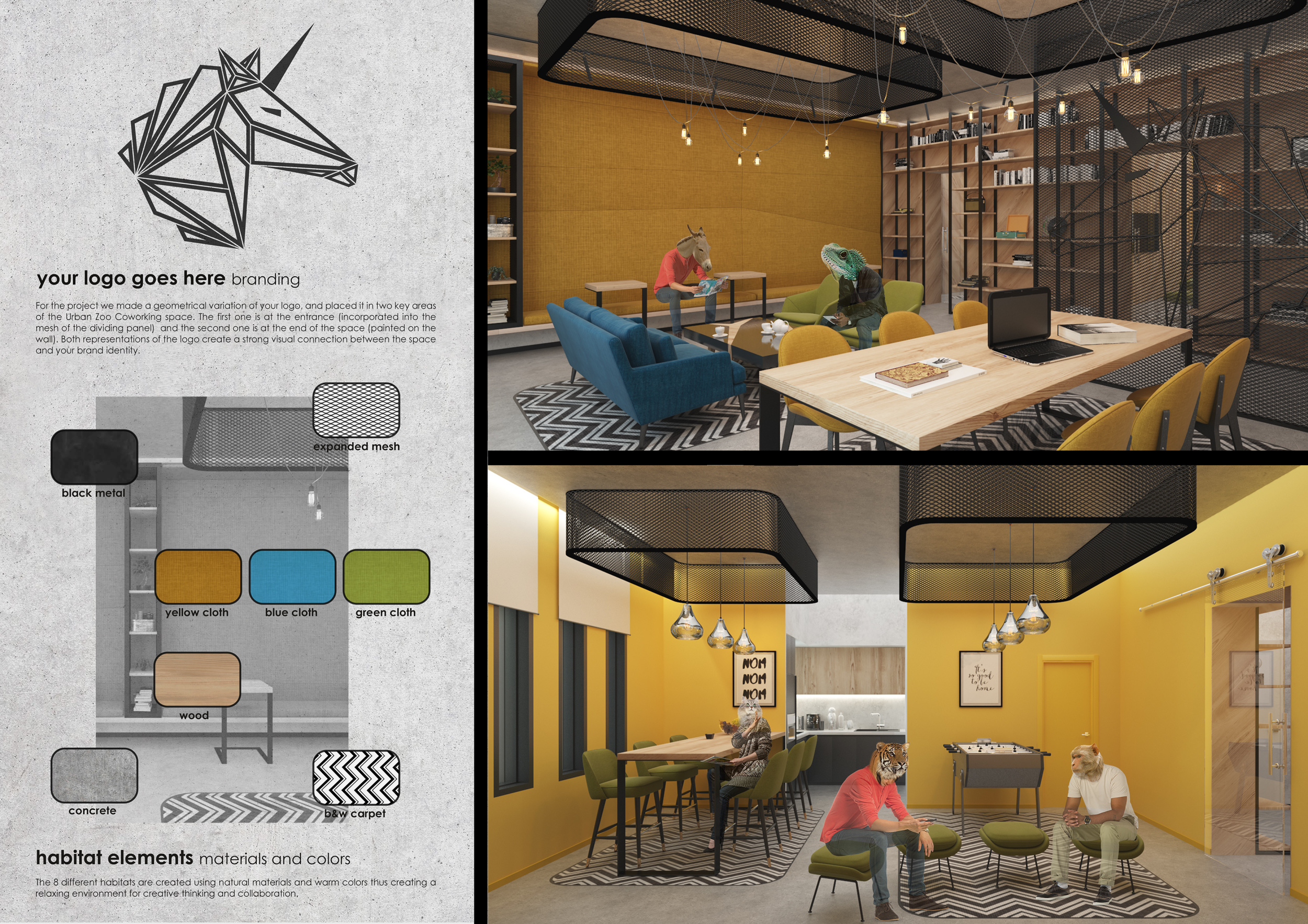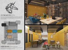 The Menagerie project features a modern and coherent color scheme that was eye catching, inviting, and incredibly stylised. It really complimented the concept of an “urban zoo”, creating an energetic atmosphere in which workers could connect, exchange, and collaborate. The submitted designs offered a clear and understandable concept that included an uncomplicated scheme of forms, shapes, and colors that complimented the furniture. Read more And while unique, the scheme could easily be replicated in any type of space and has the potential to become the signature interior for the Urban Zoo Coworking brand.