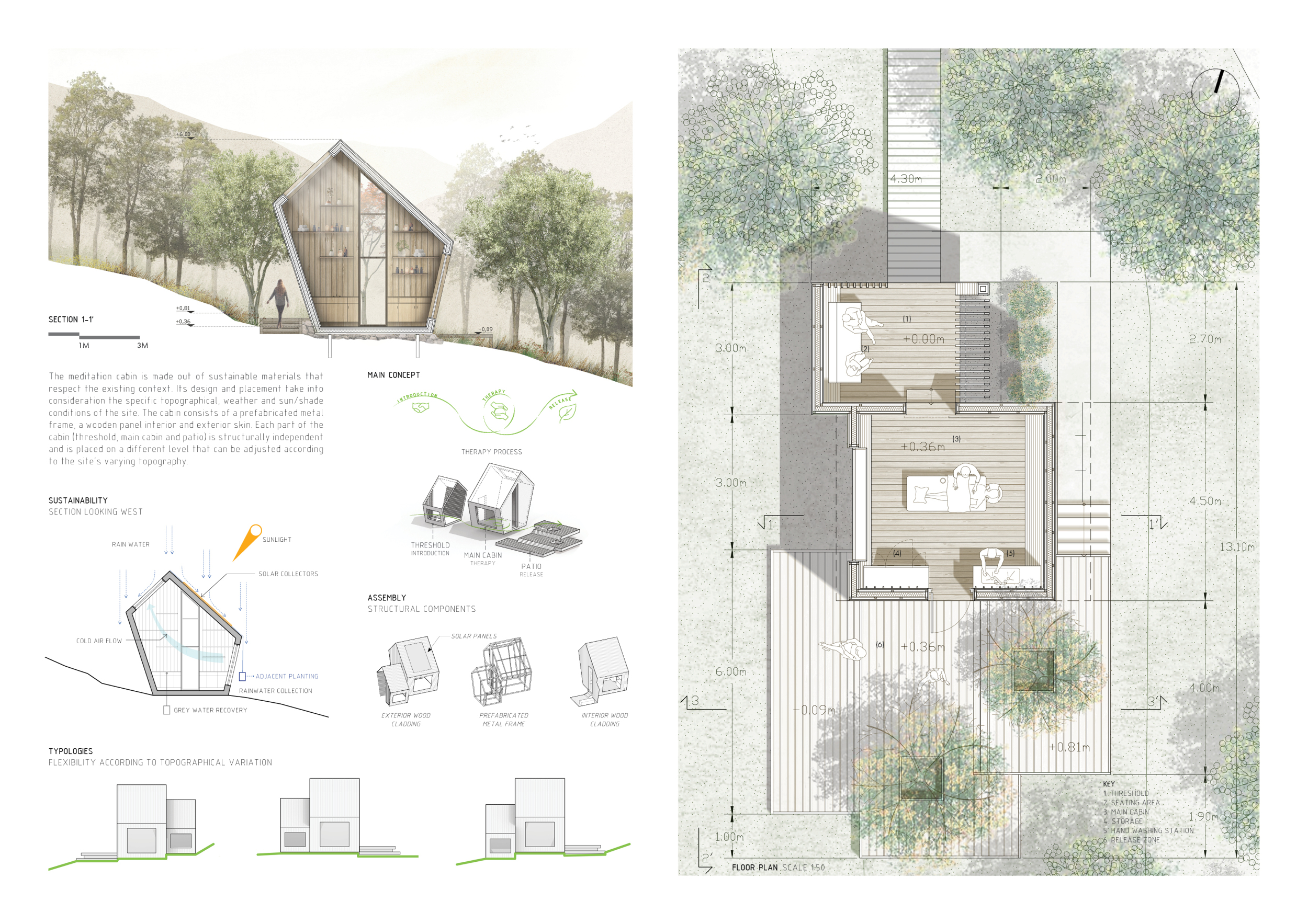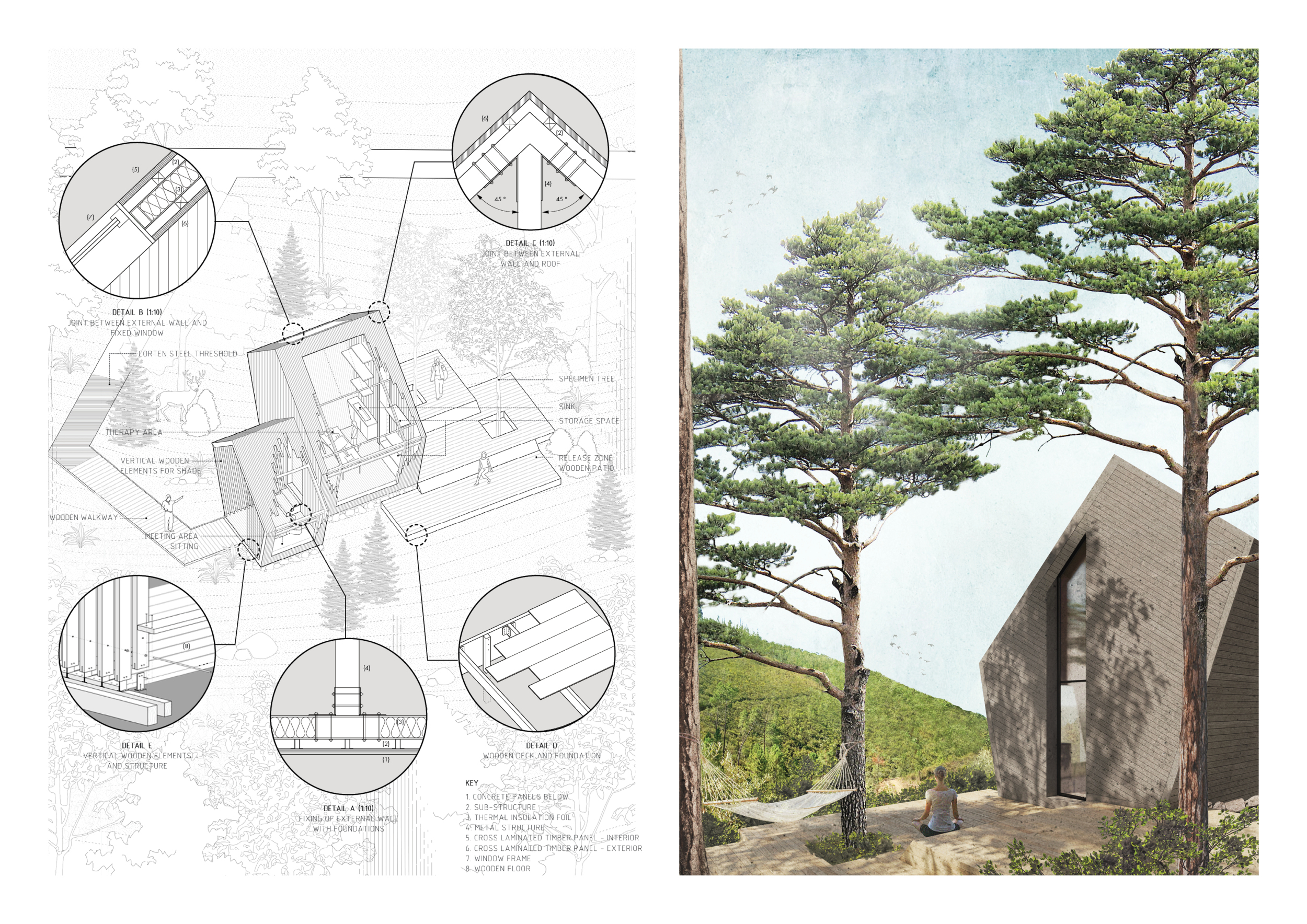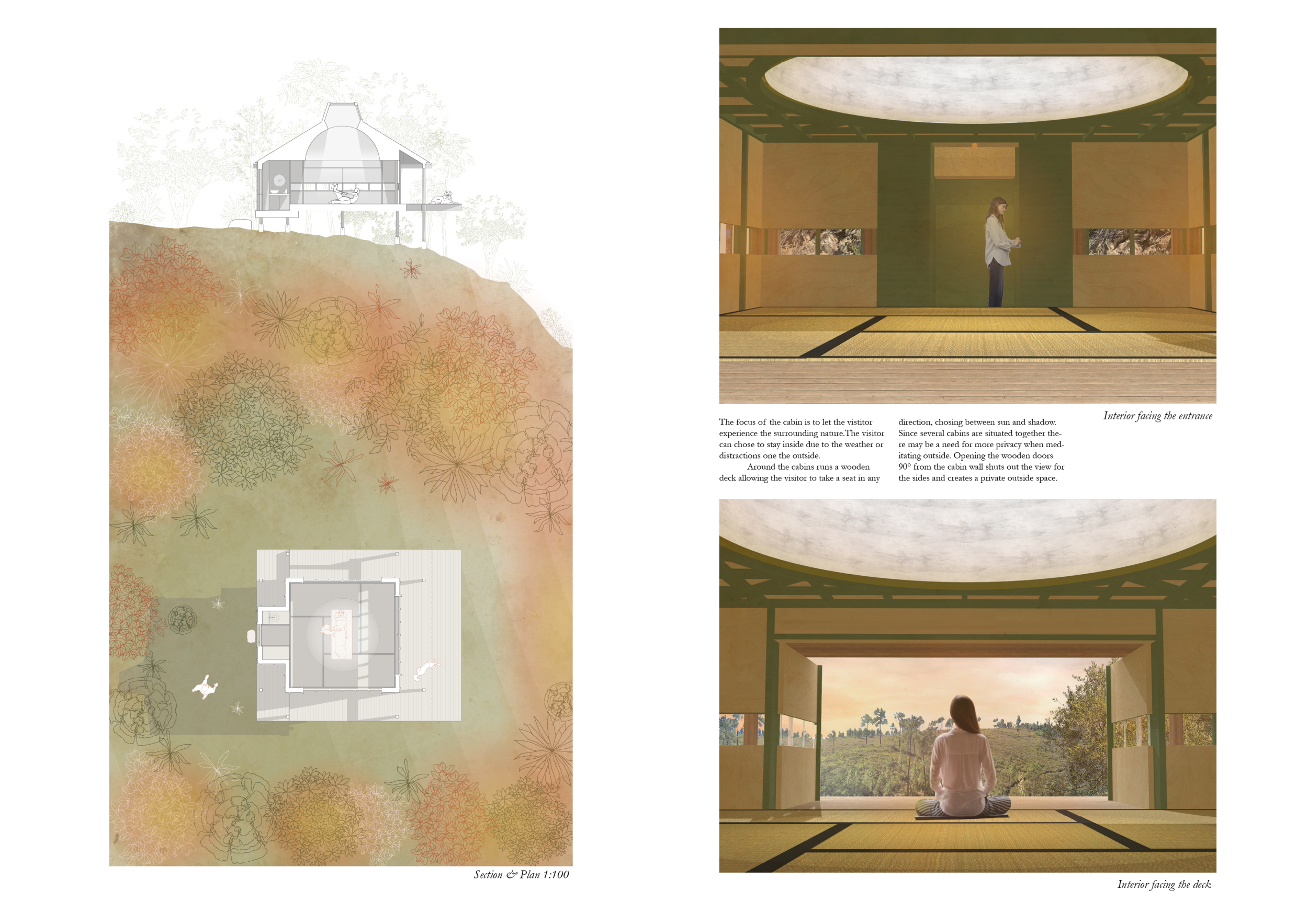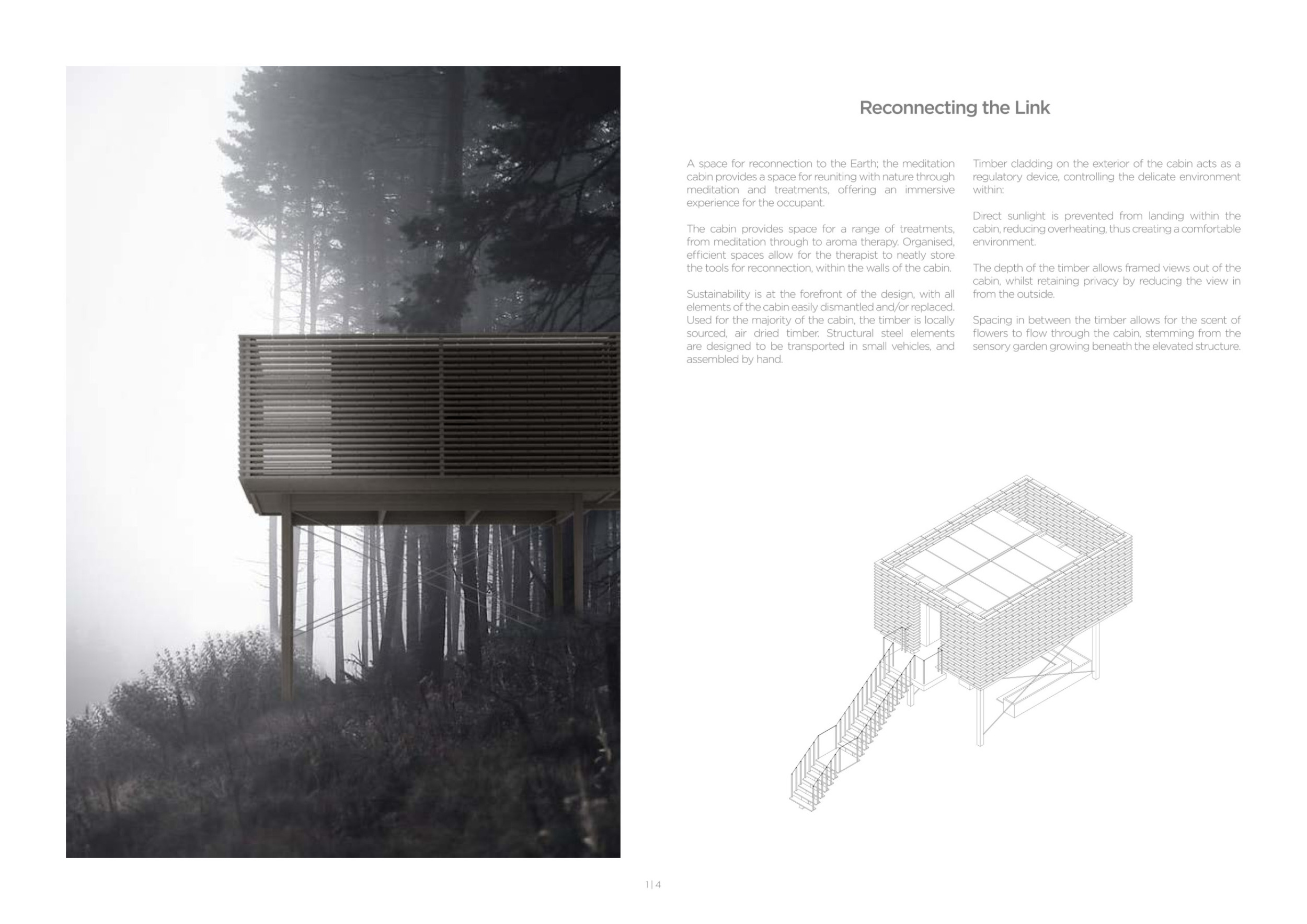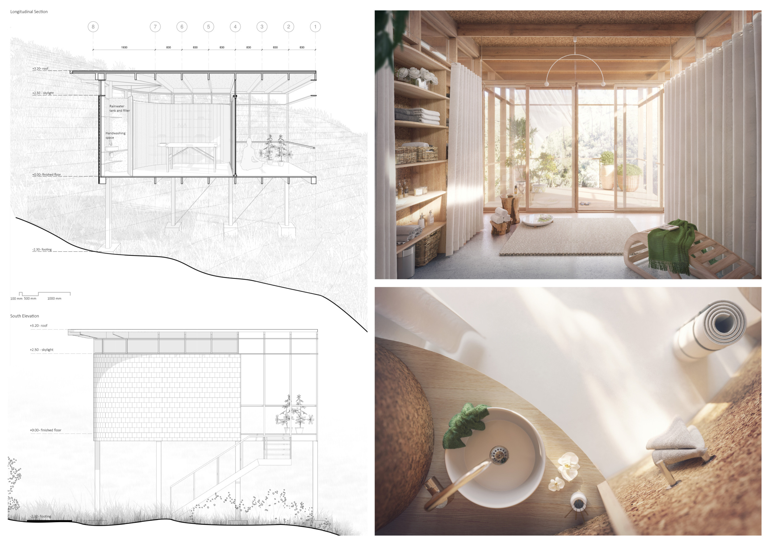Participants were tasked here with submitting designs for a replicable ‘cabin’ for guest treatments and meditation sessions. The cabin is to be a space that allows guests to connect with the surrounding forest and gardens as part of a meditative and personal experience. Each cabin should provide sufficient space for one guest and one therapist.