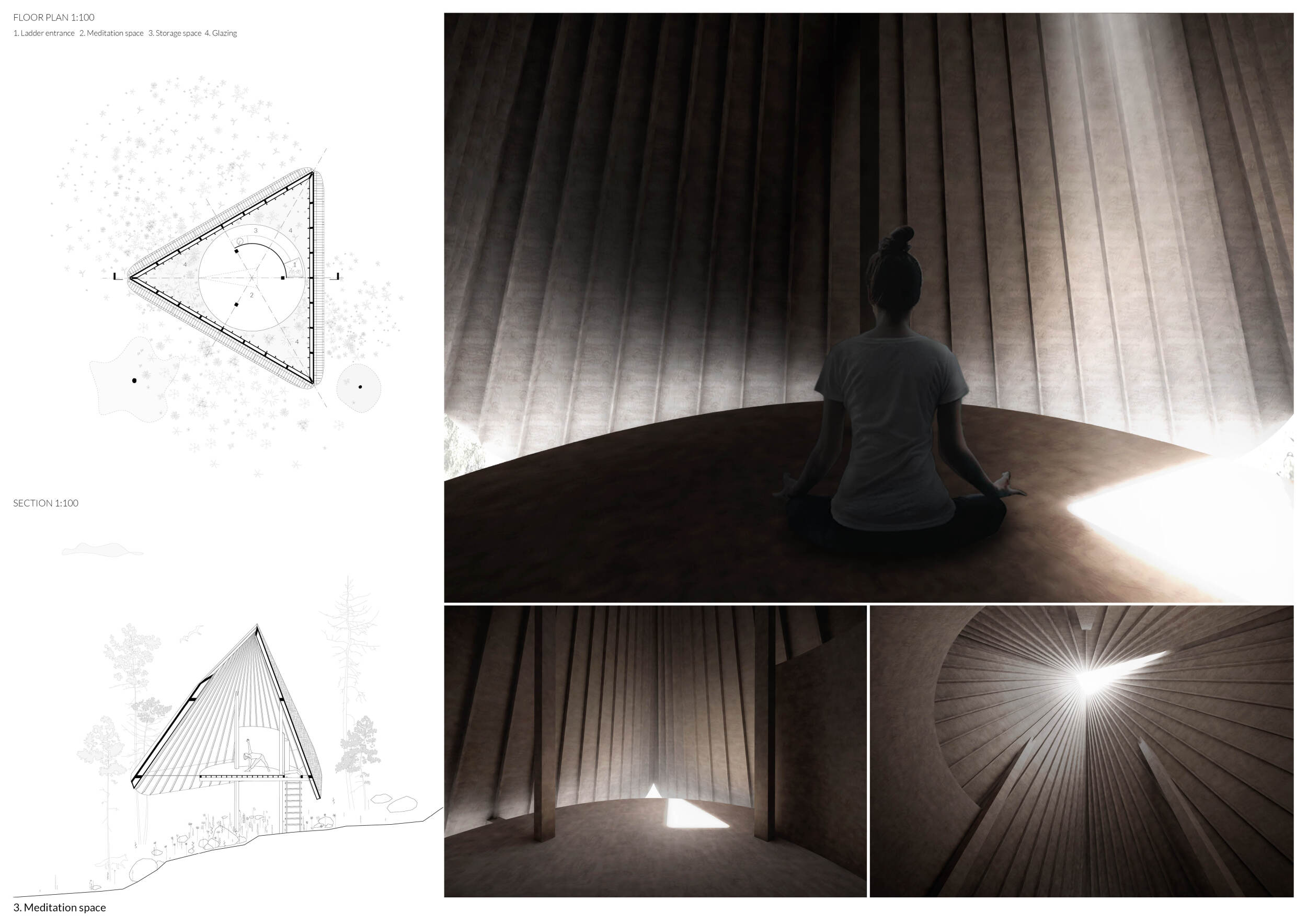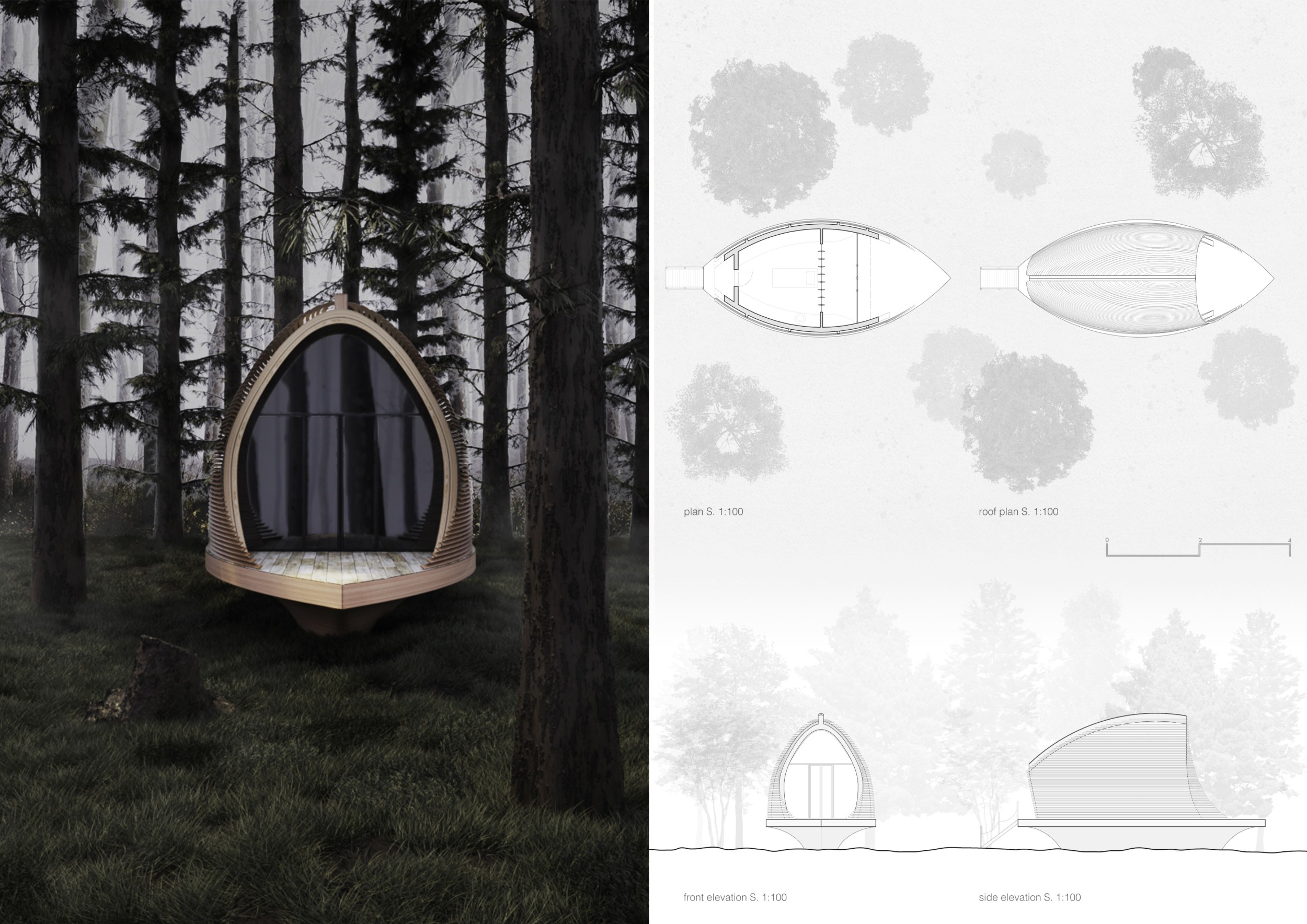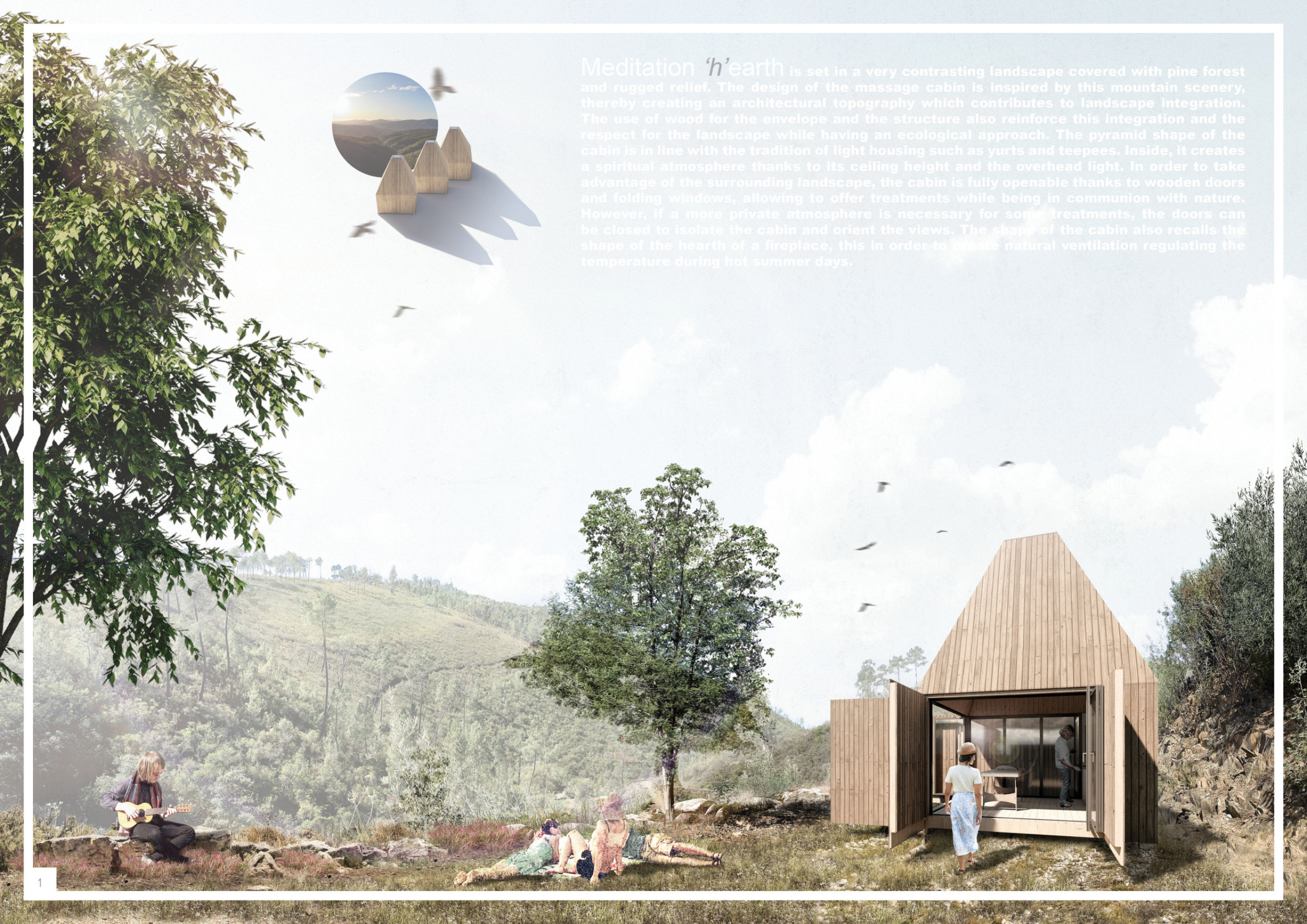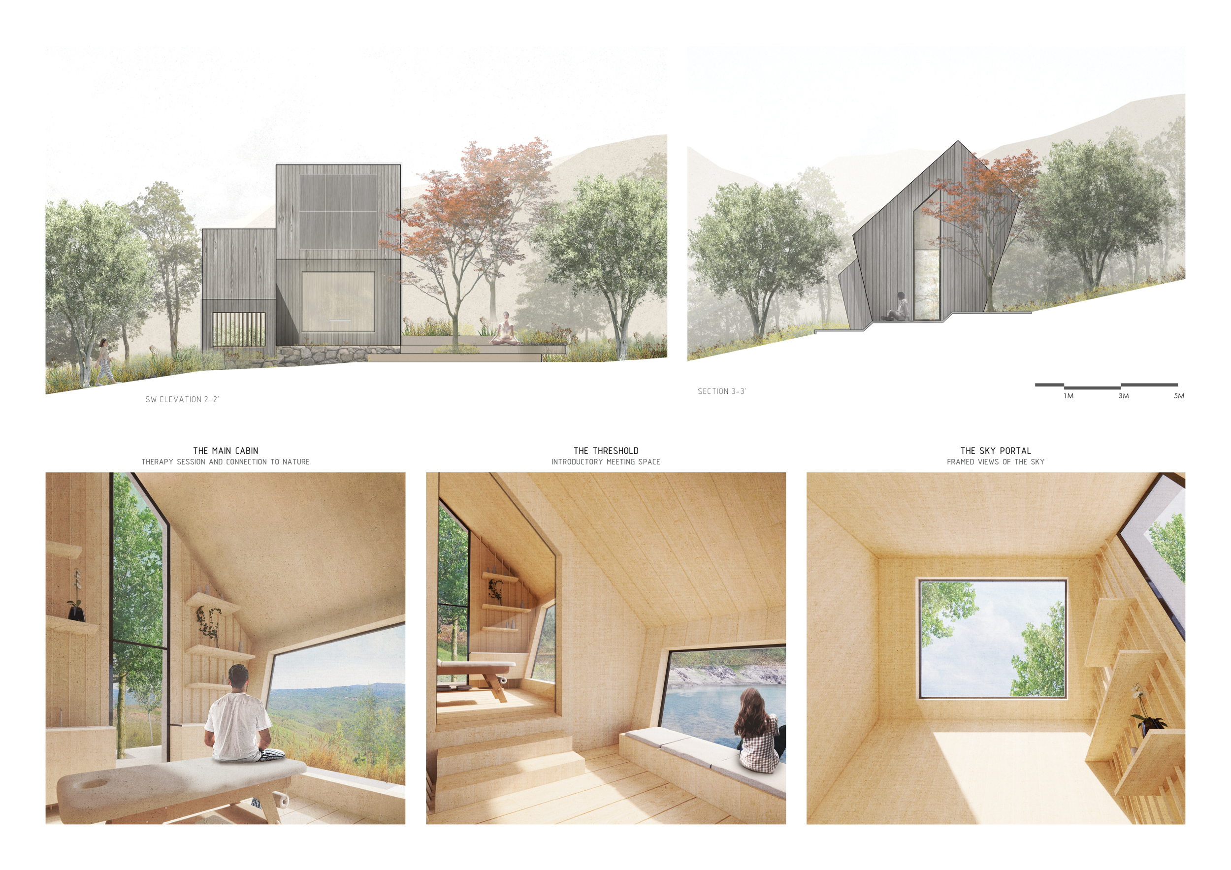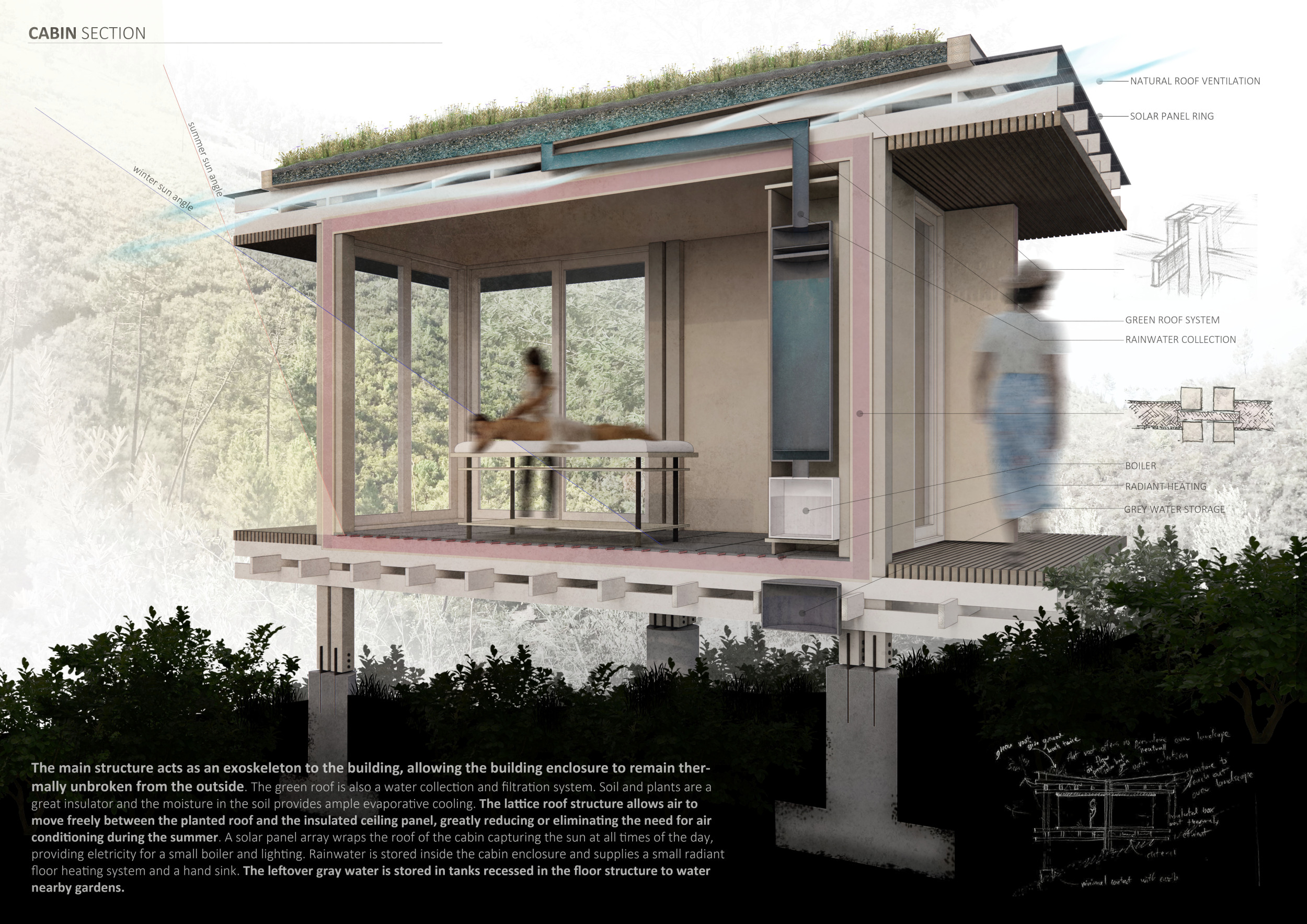 Participants were tasked here with submitting designs for a replicable ‘cabin’ for guest treatments and meditation sessions. The cabin is to be a space that allows guests to connect with the surrounding forest and gardens as part of a meditative and personal experience. Each cabin should provide sufficient space for one guest and one therapist.