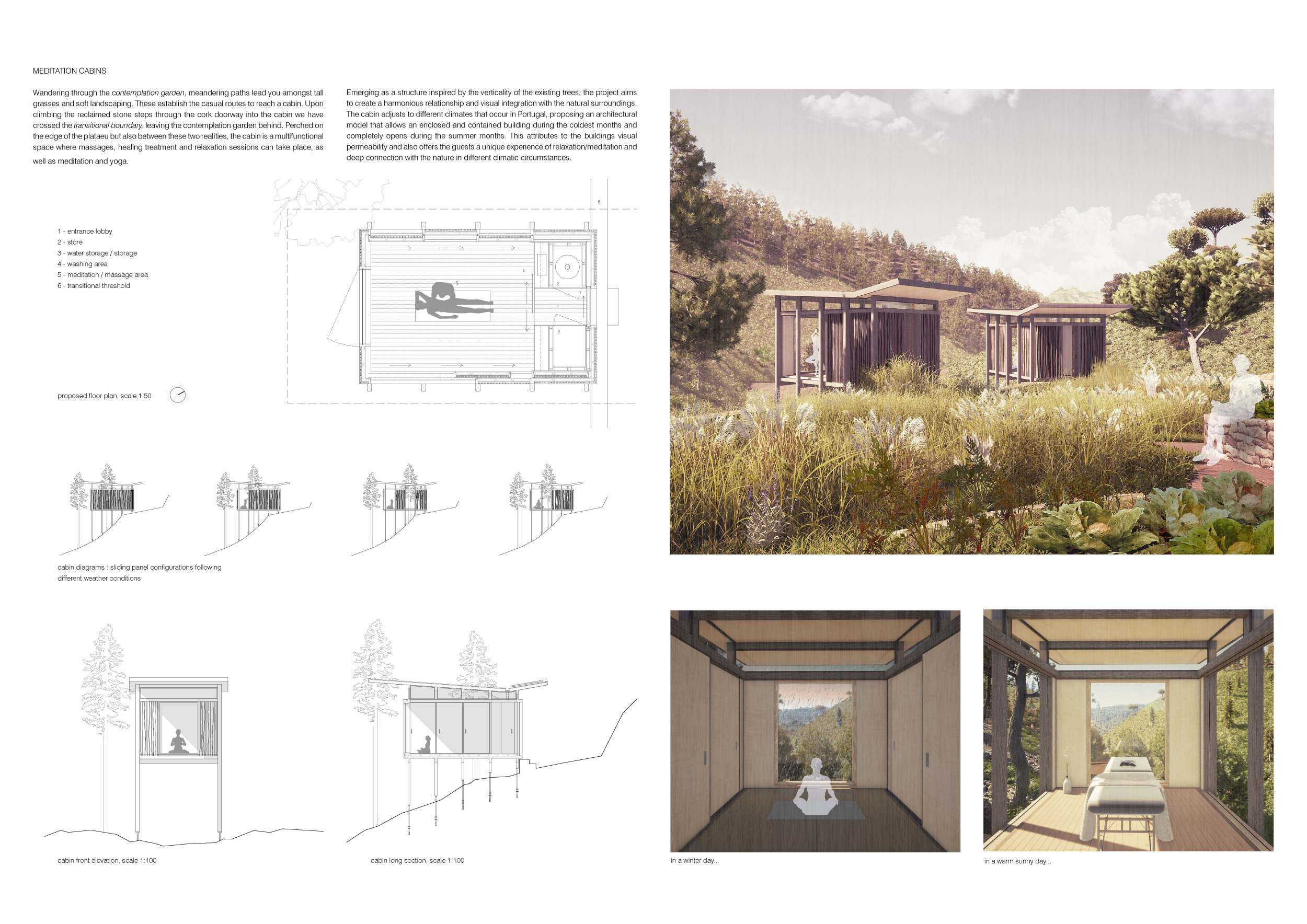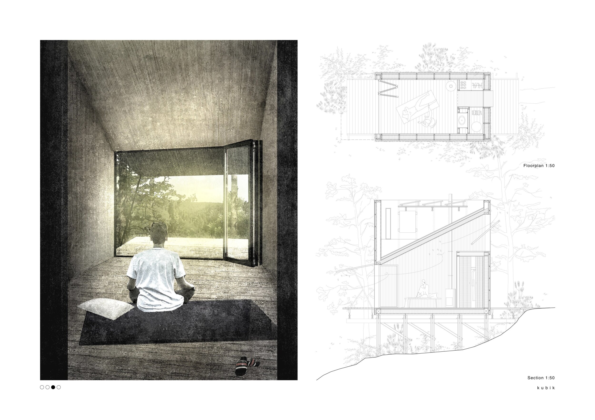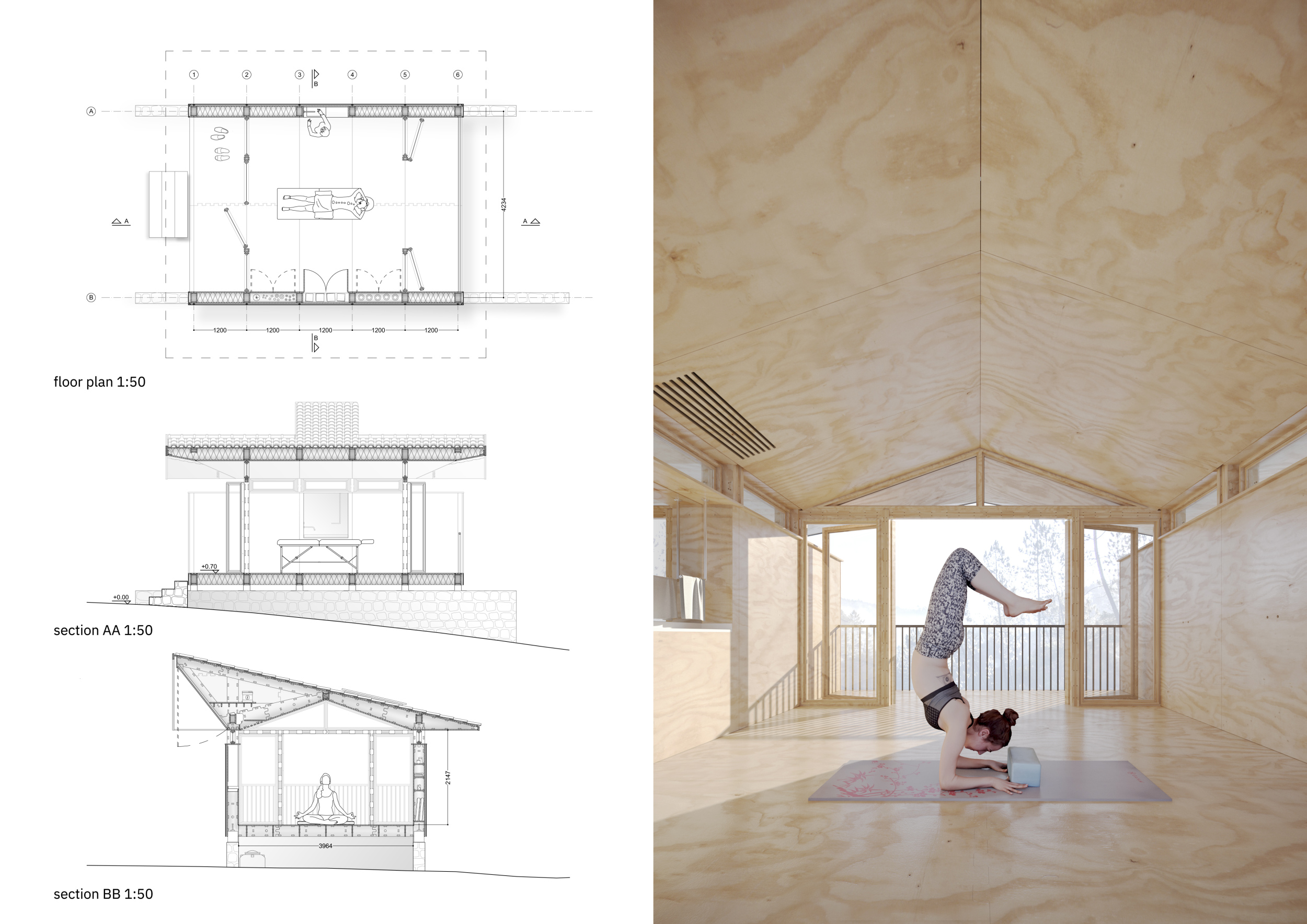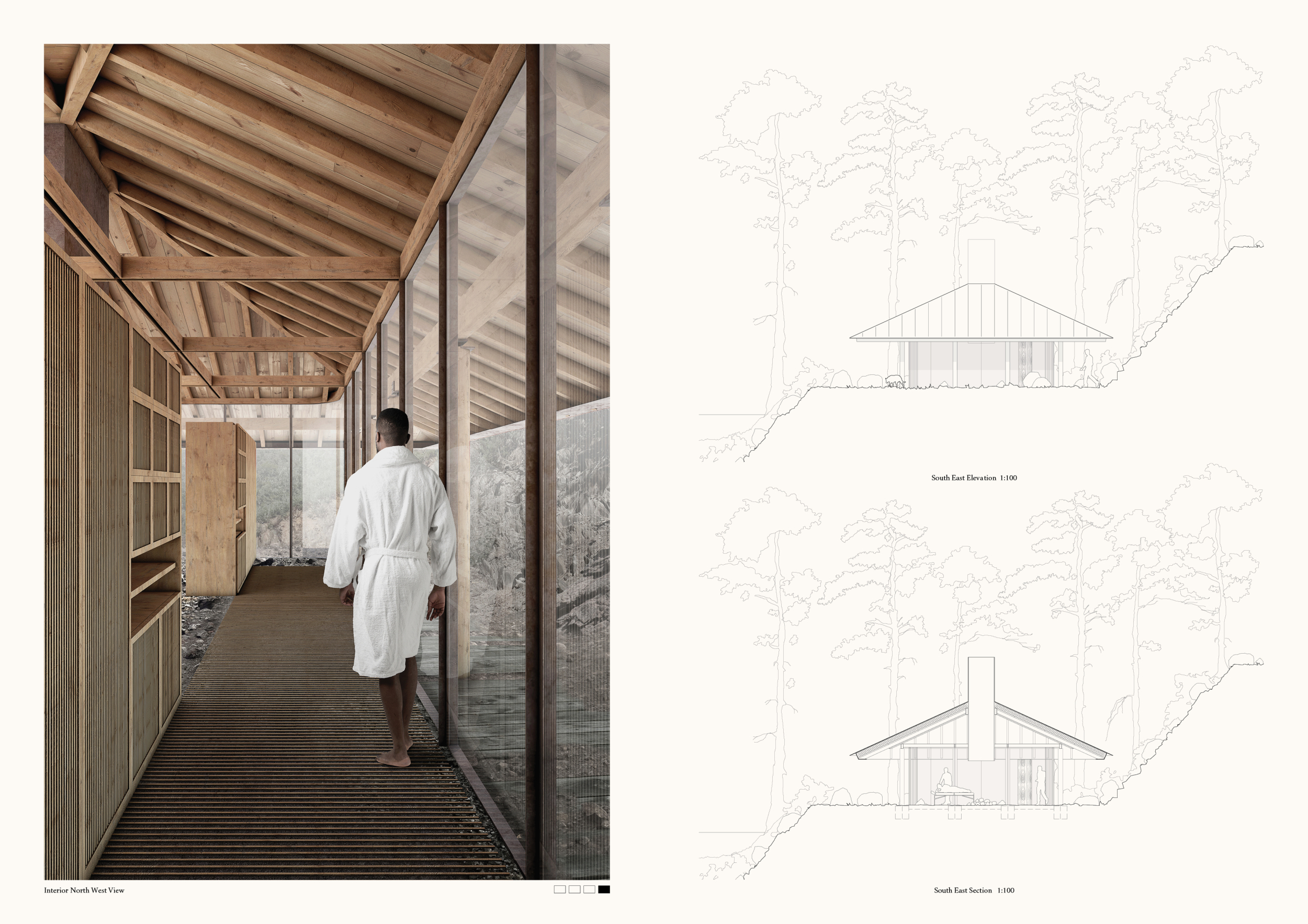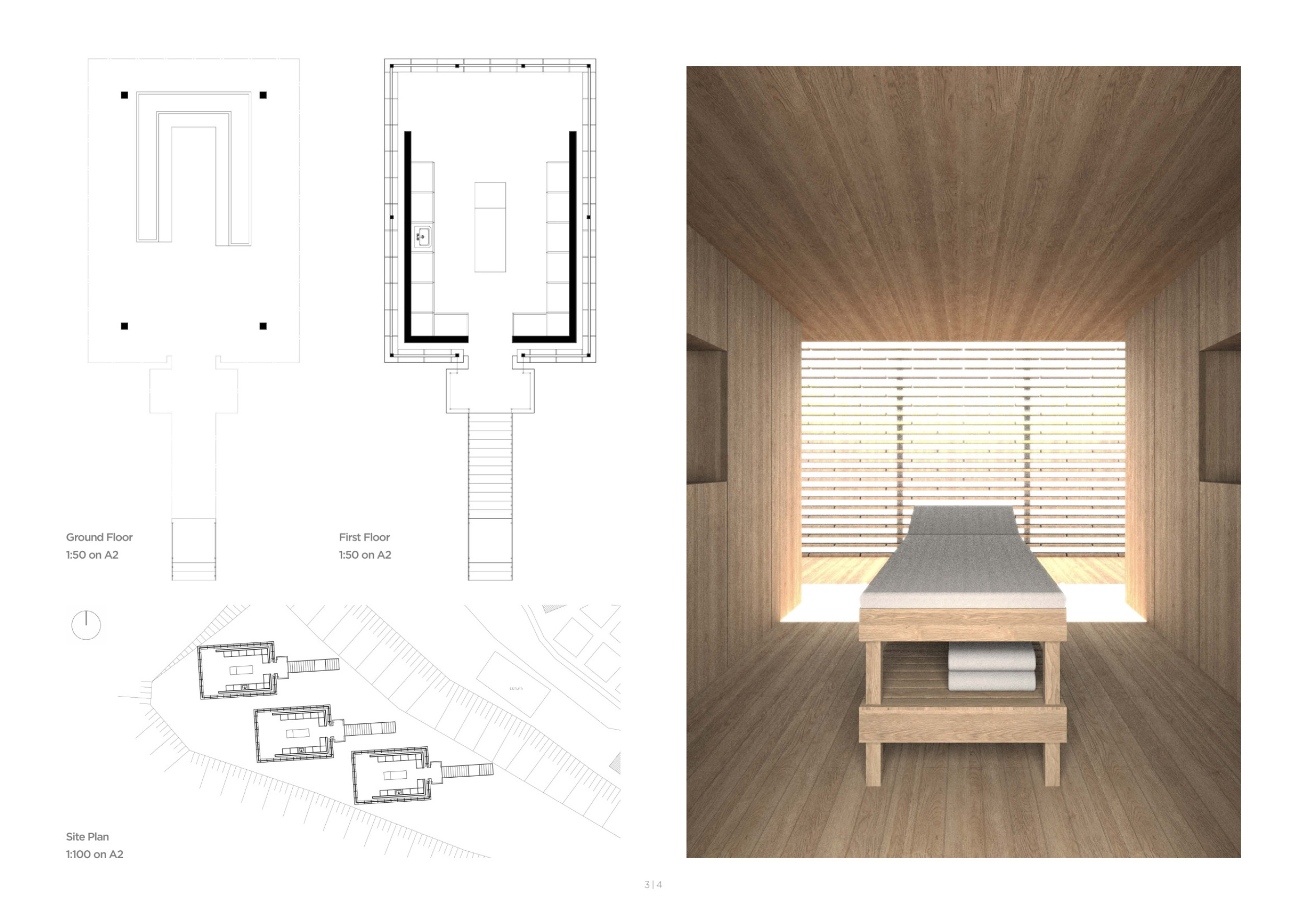 Participants were tasked here with submitting designs for a replicable ‘cabin’ for guest treatments and meditation sessions. The cabin is to be a space that allows guests to connect with the surrounding forest and gardens as part of a meditative and personal experience. Each cabin should provide sufficient space for one guest and one therapist.