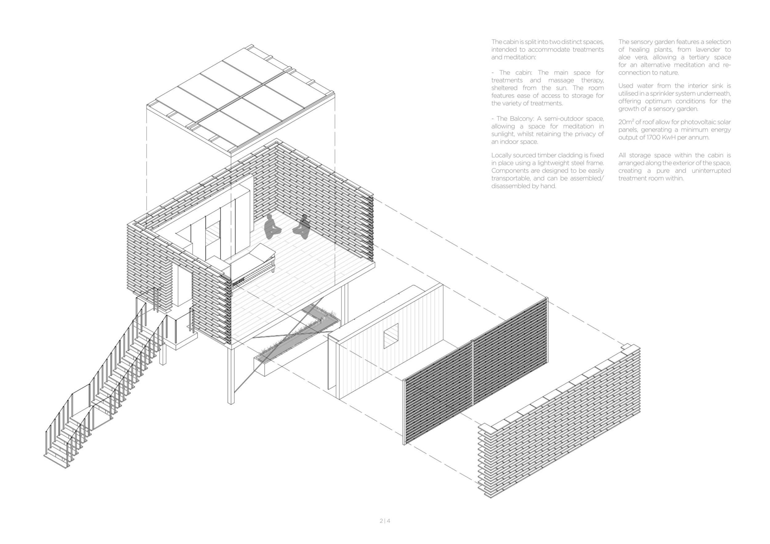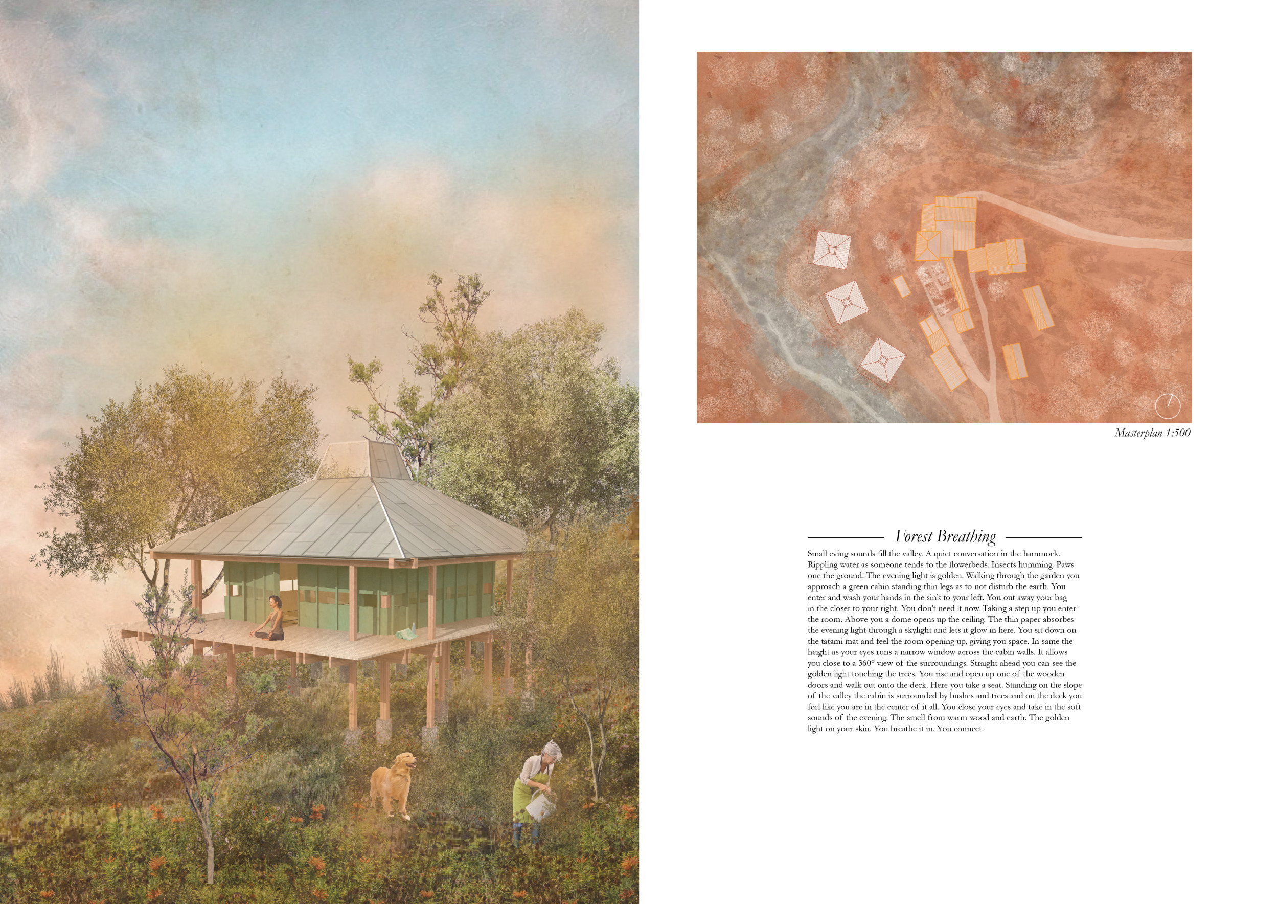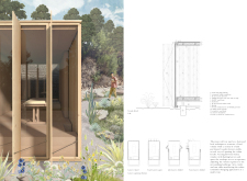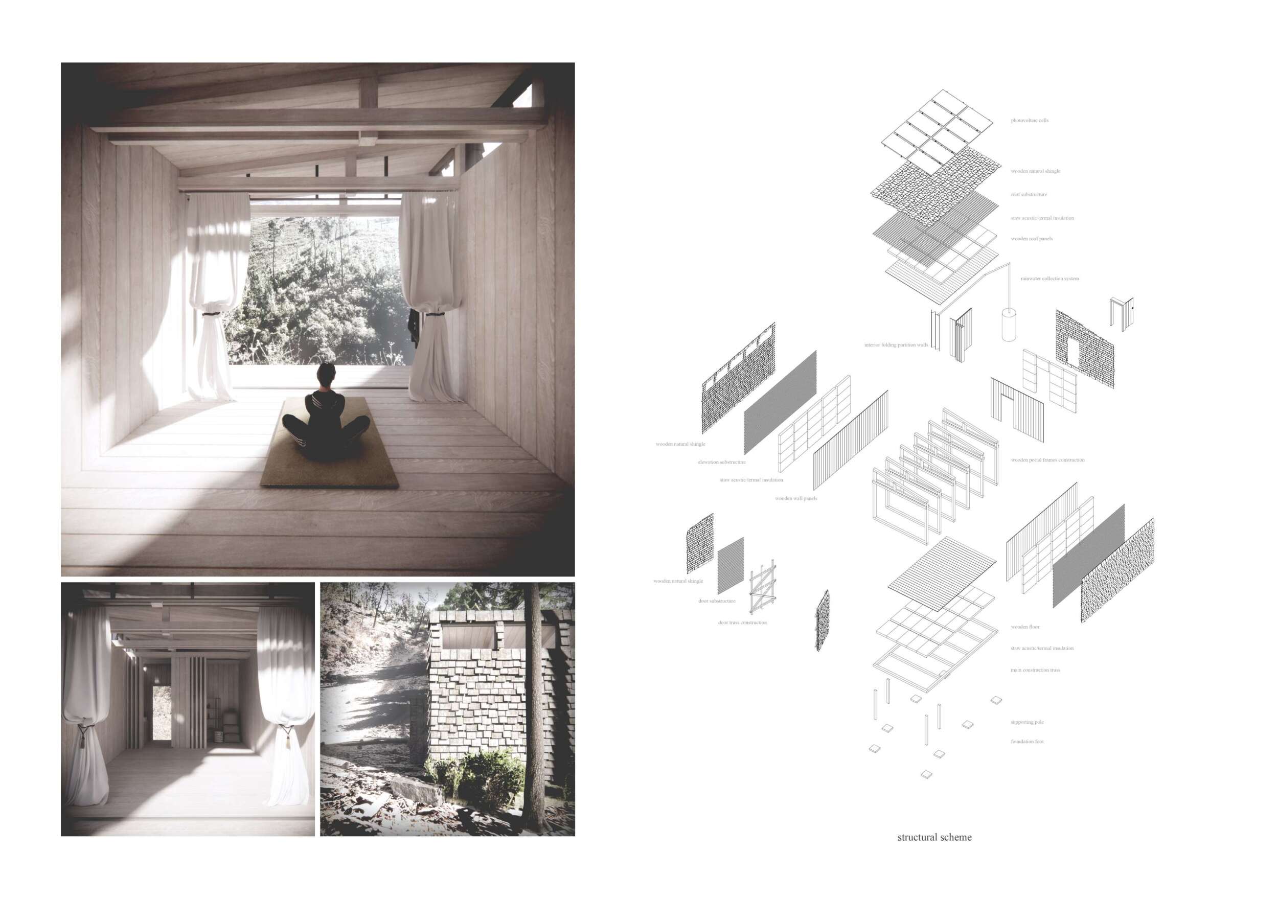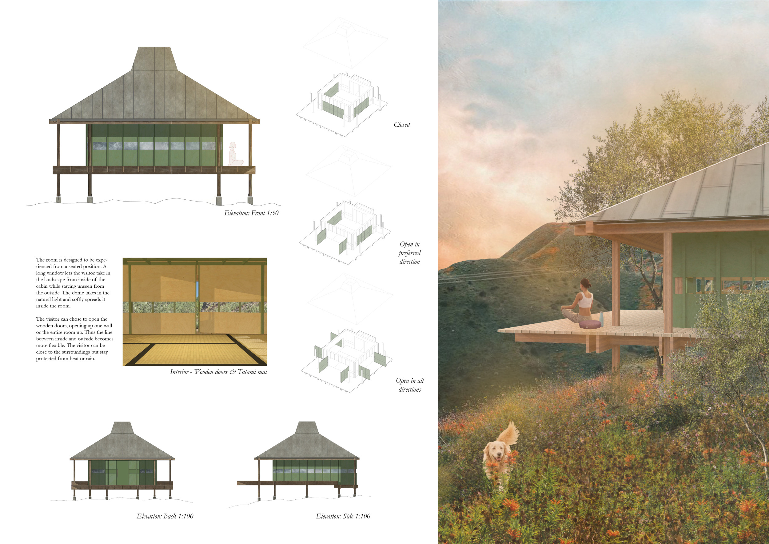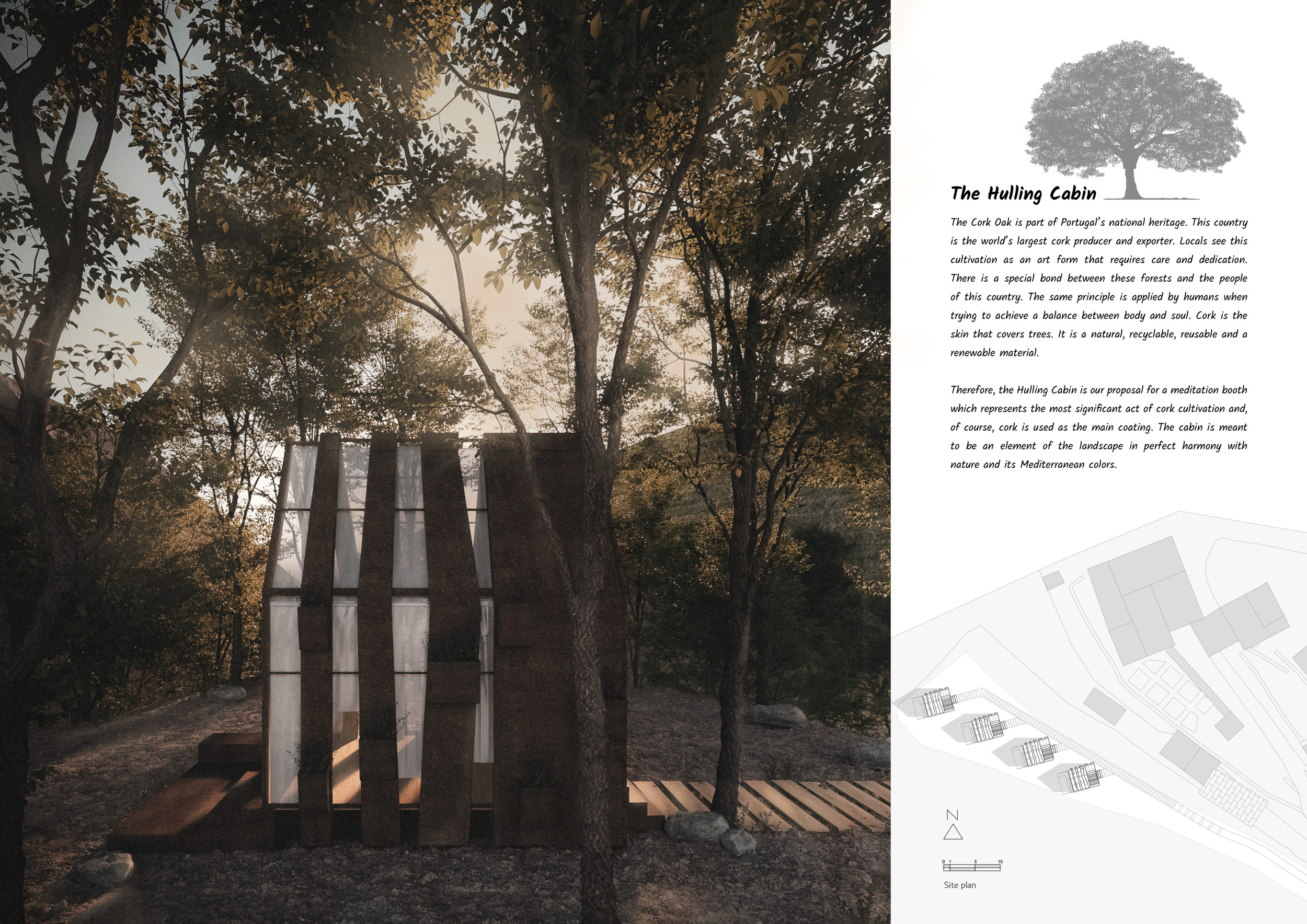 Participants were tasked here with submitting designs for a replicable ‘cabin’ for guest treatments and meditation sessions. The cabin is to be a space that allows guests to connect with the surrounding forest and gardens as part of a meditative and personal experience. Each cabin should provide sufficient space for one guest and one therapist.