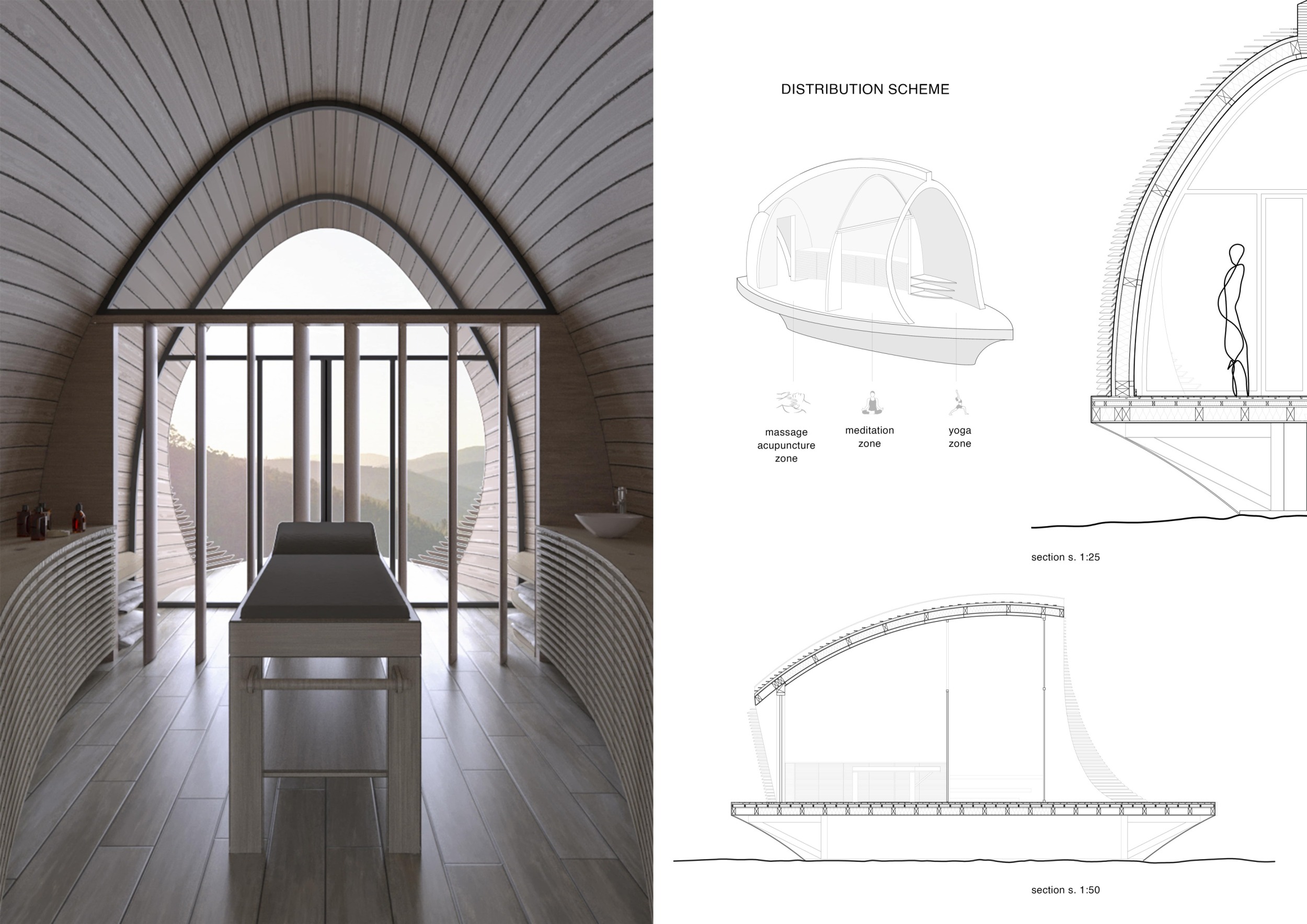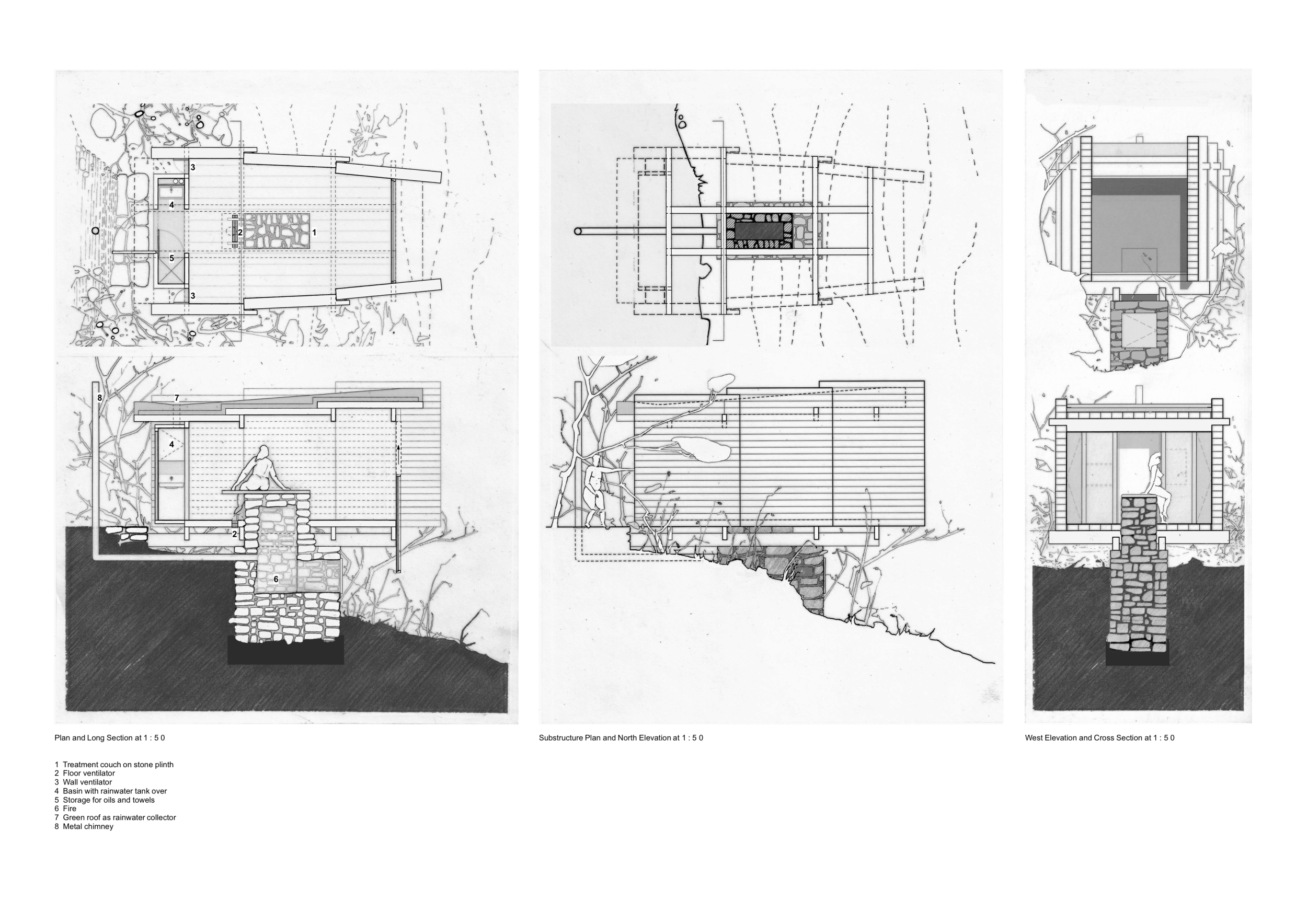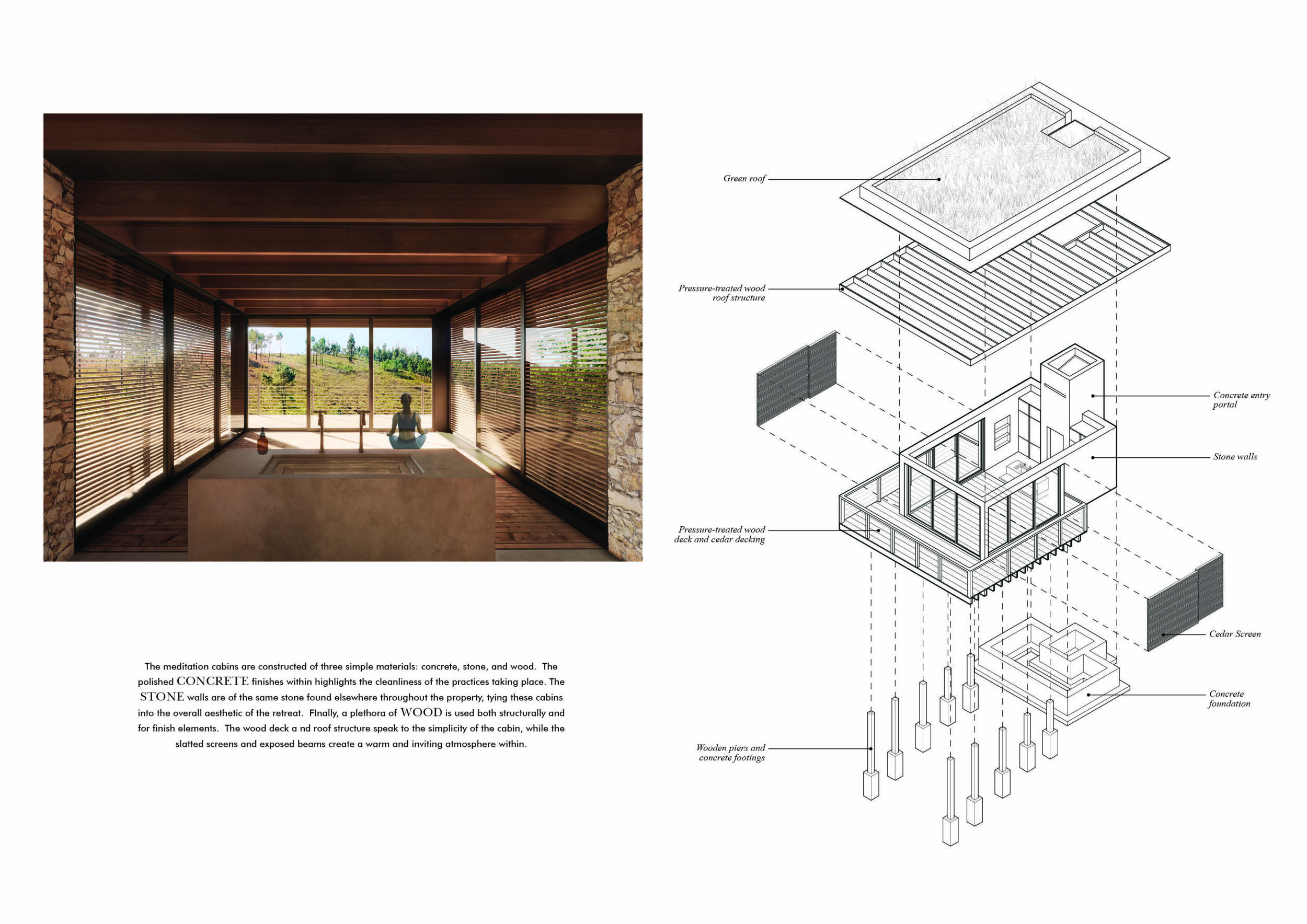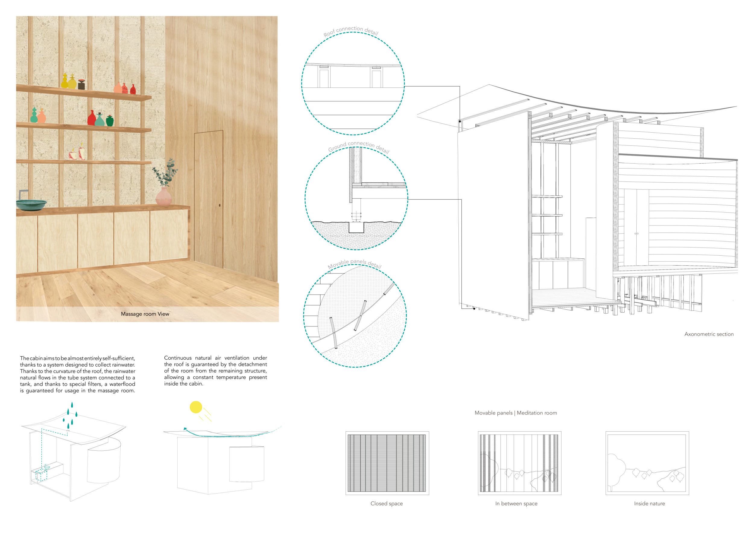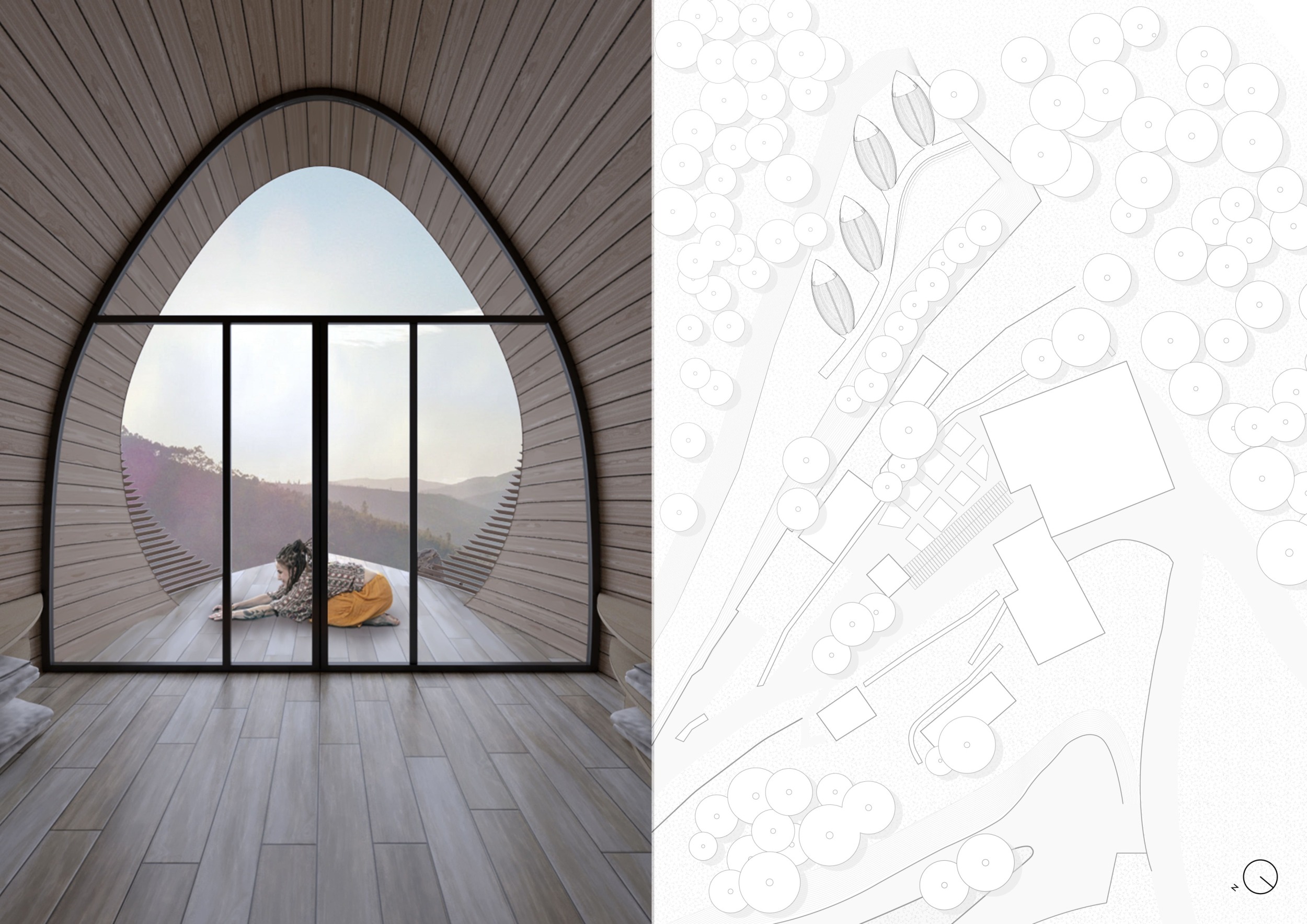 Participants were tasked here with submitting designs for a replicable ‘cabin’ for guest treatments and meditation sessions. The cabin is to be a space that allows guests to connect with the surrounding forest and gardens as part of a meditative and personal experience. Each cabin should provide sufficient space for one guest and one therapist.