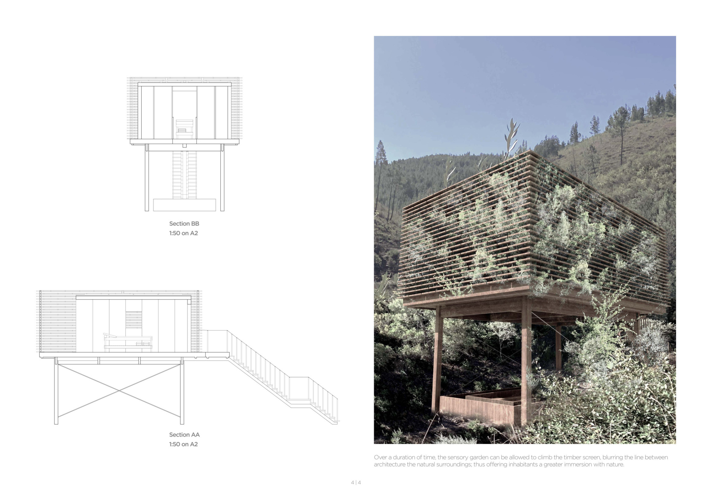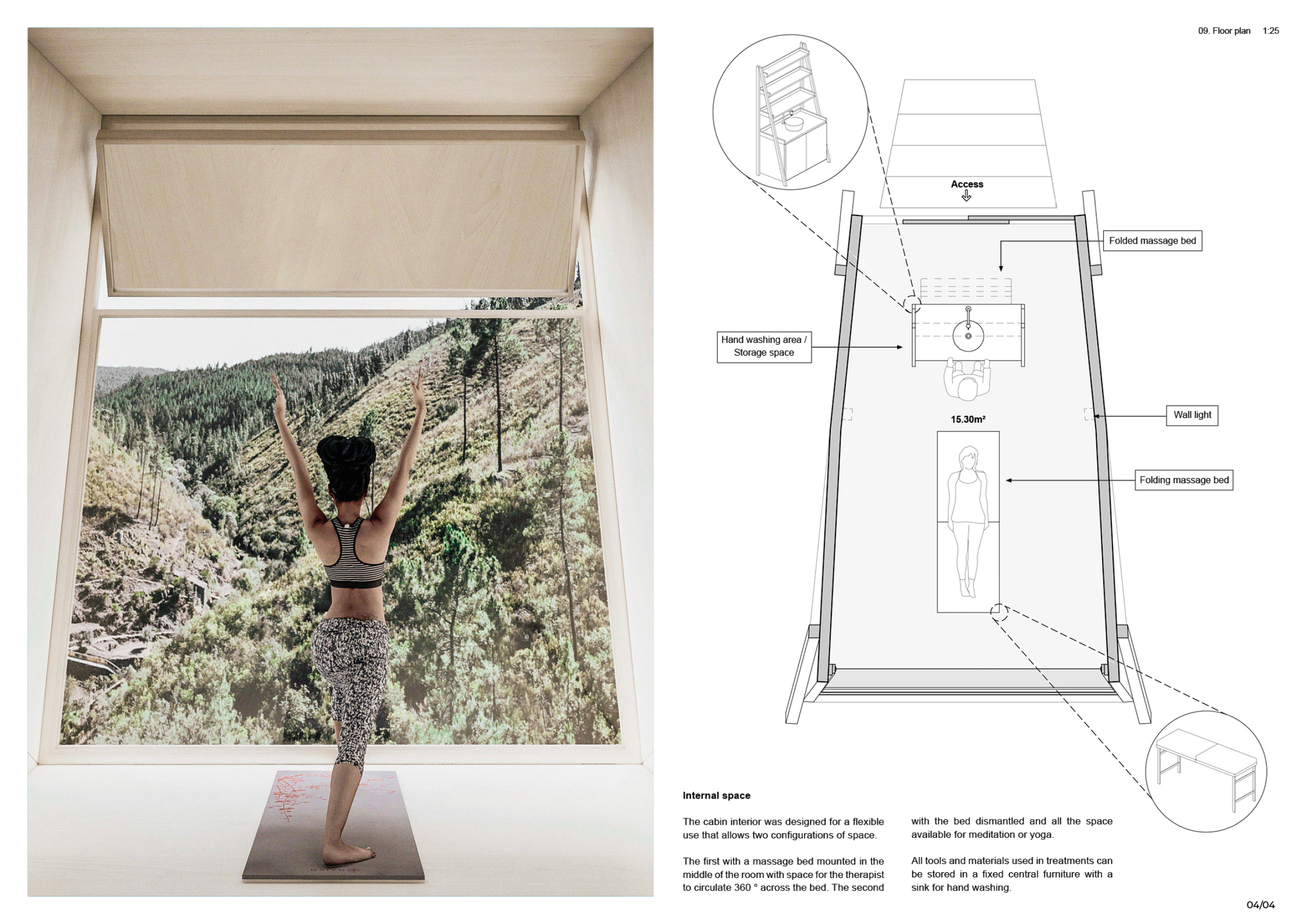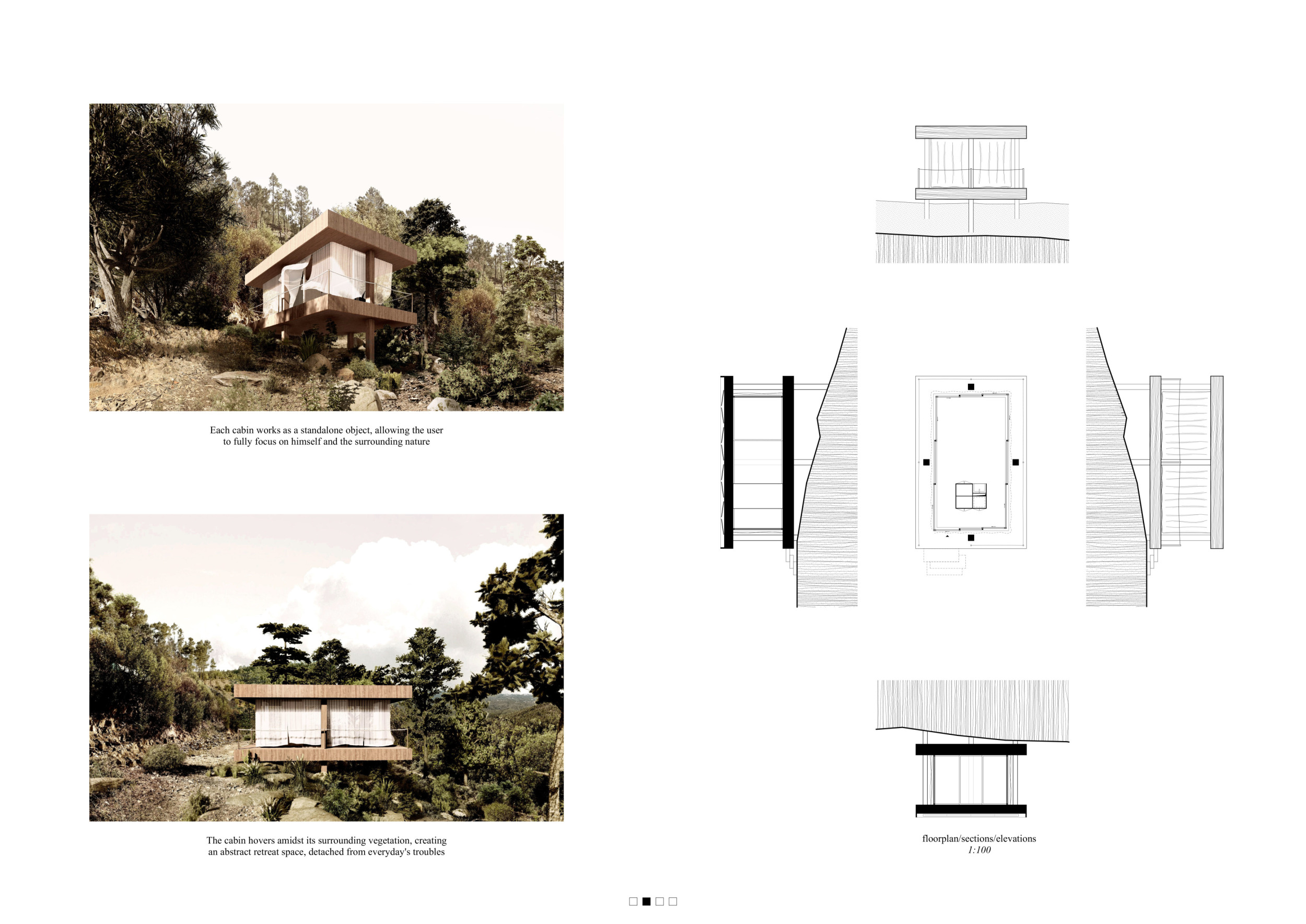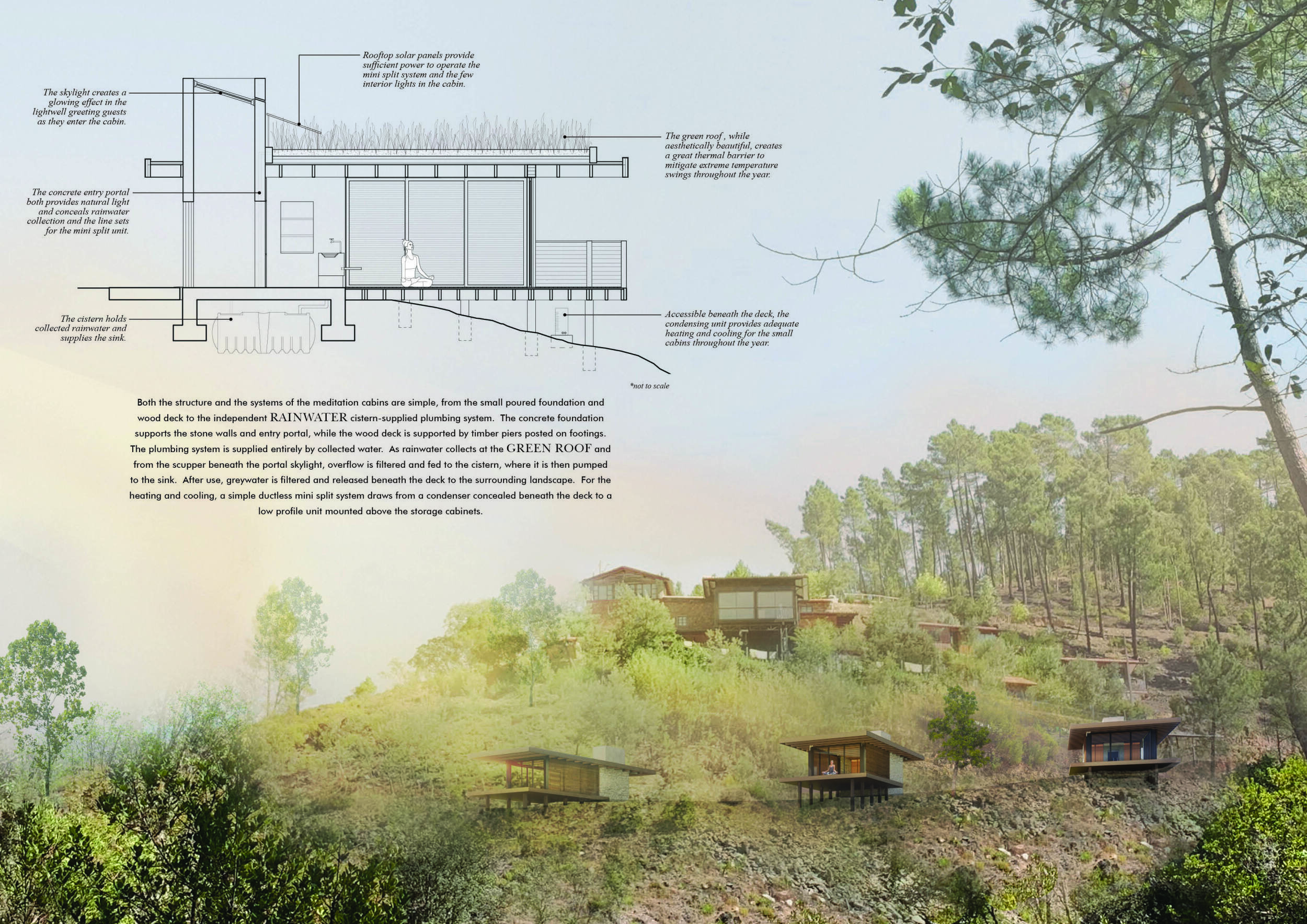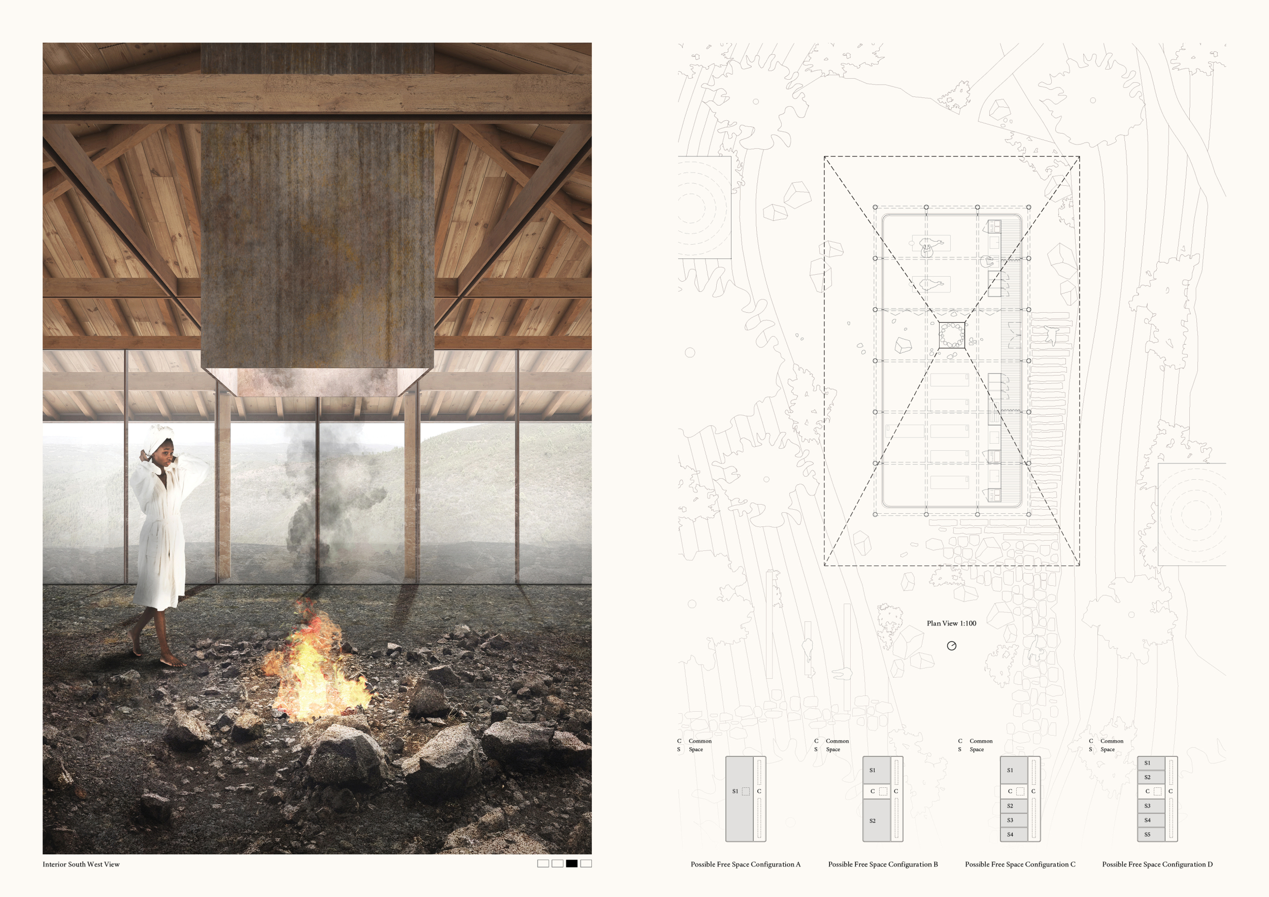 Participants were tasked here with submitting designs for a replicable ‘cabin’ for guest treatments and meditation sessions. The cabin is to be a space that allows guests to connect with the surrounding forest and gardens as part of a meditative and personal experience. Each cabin should provide sufficient space for one guest and one therapist.