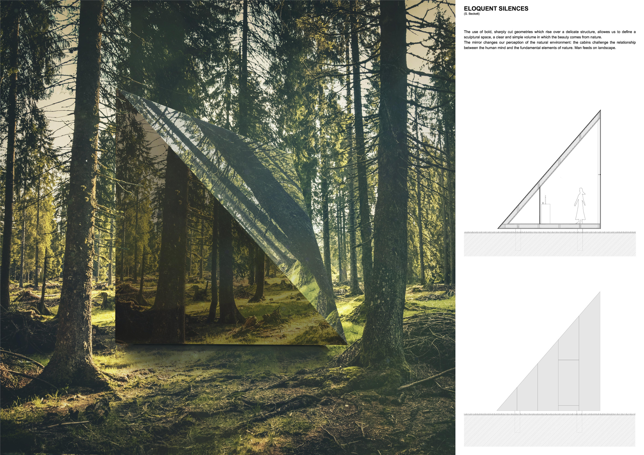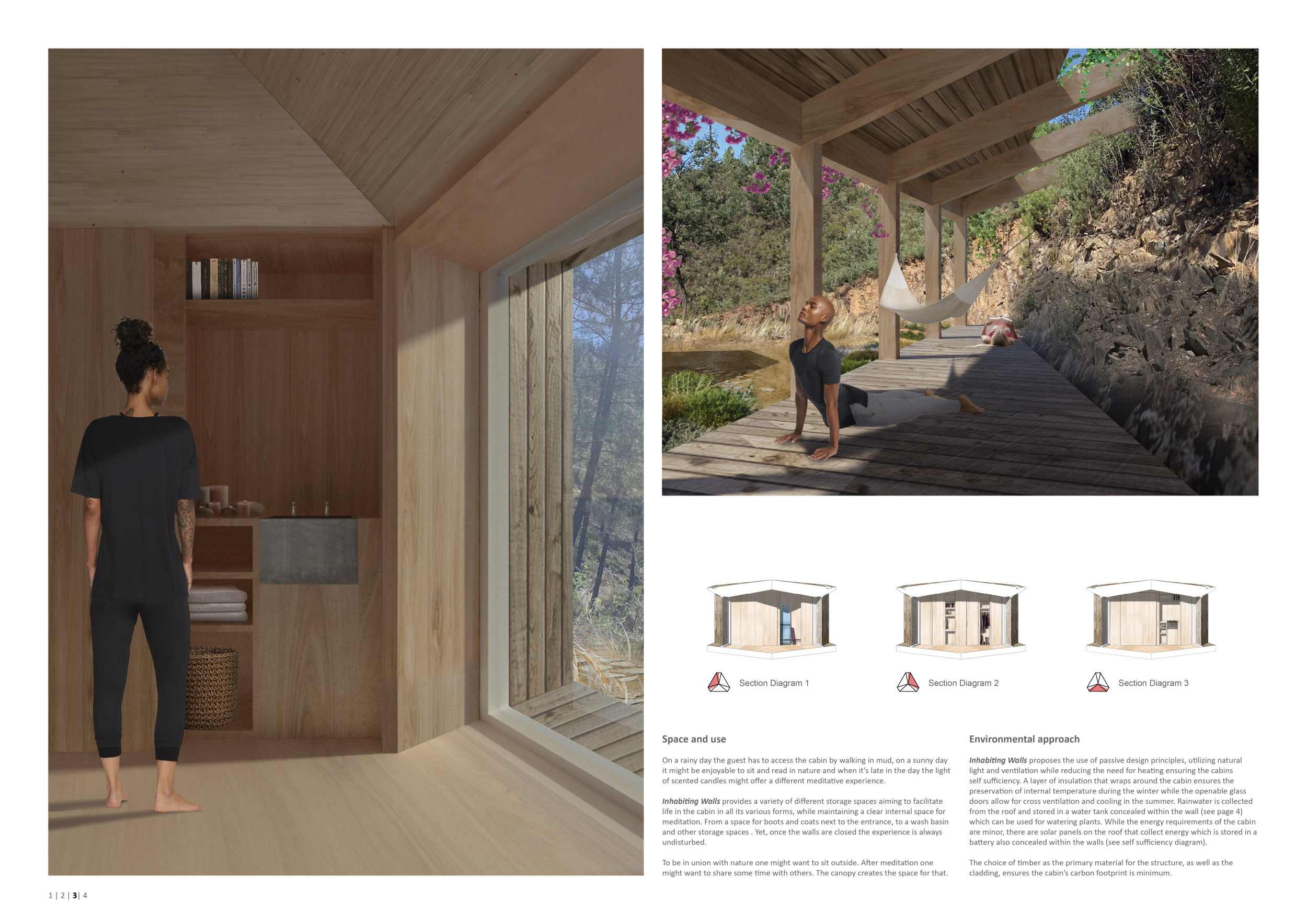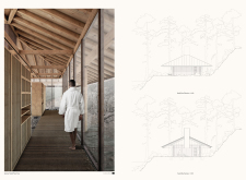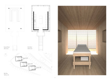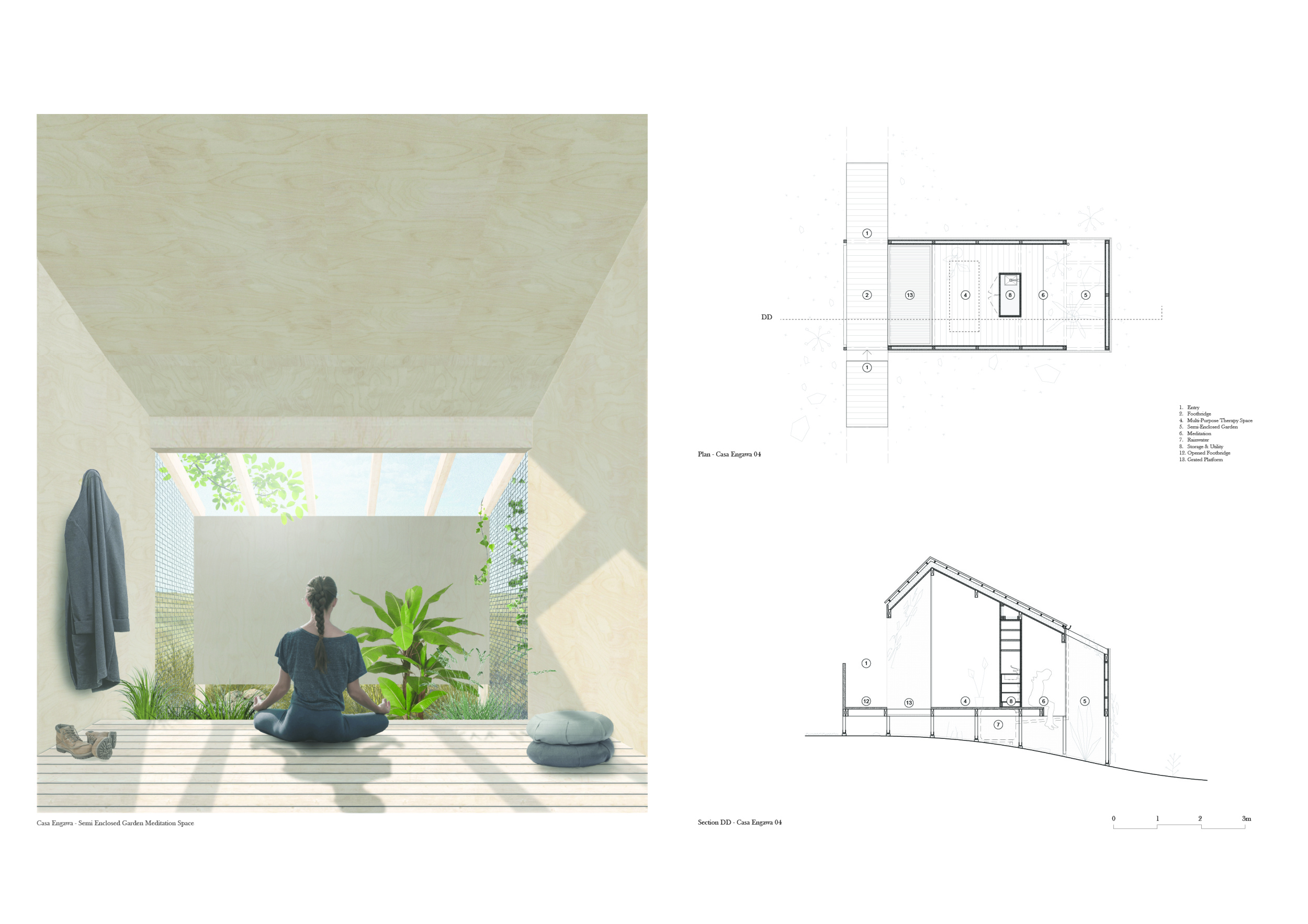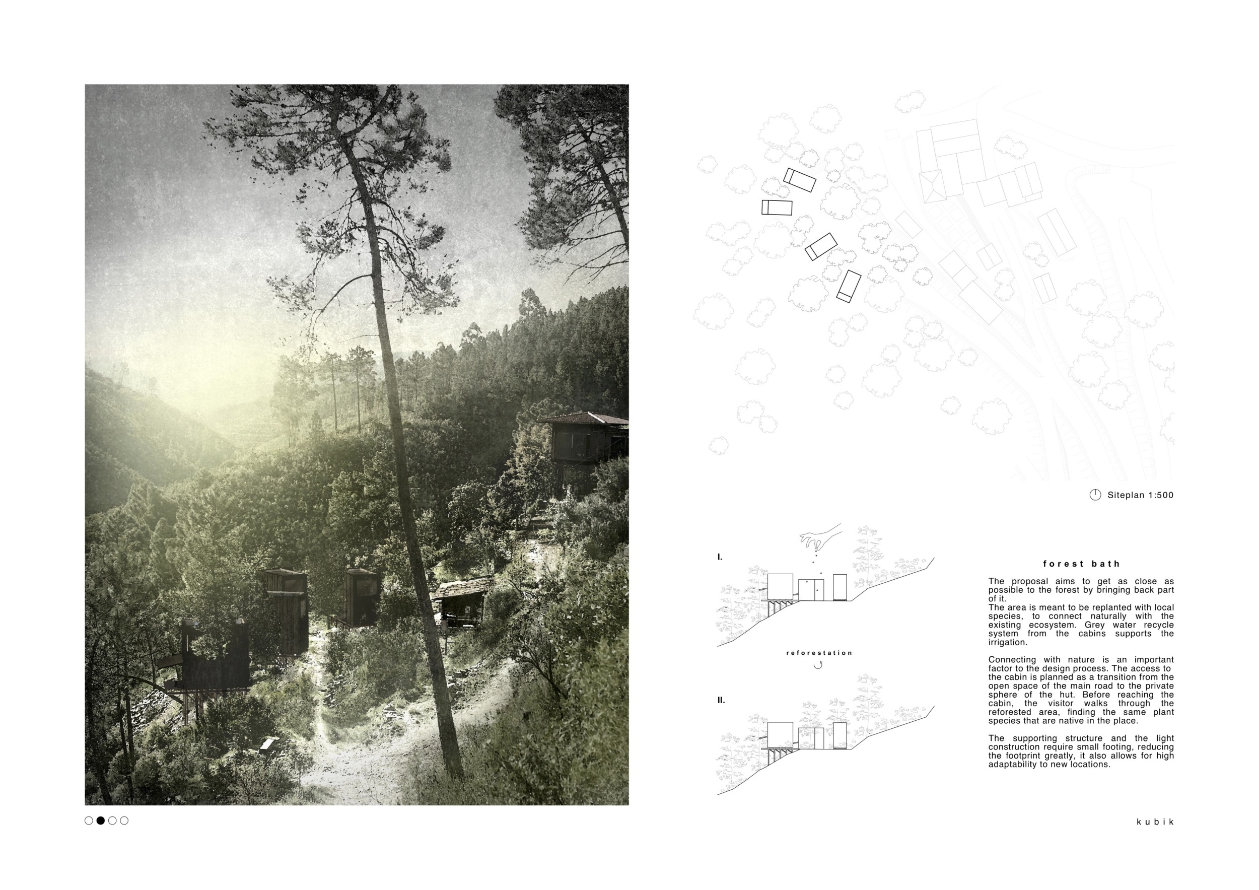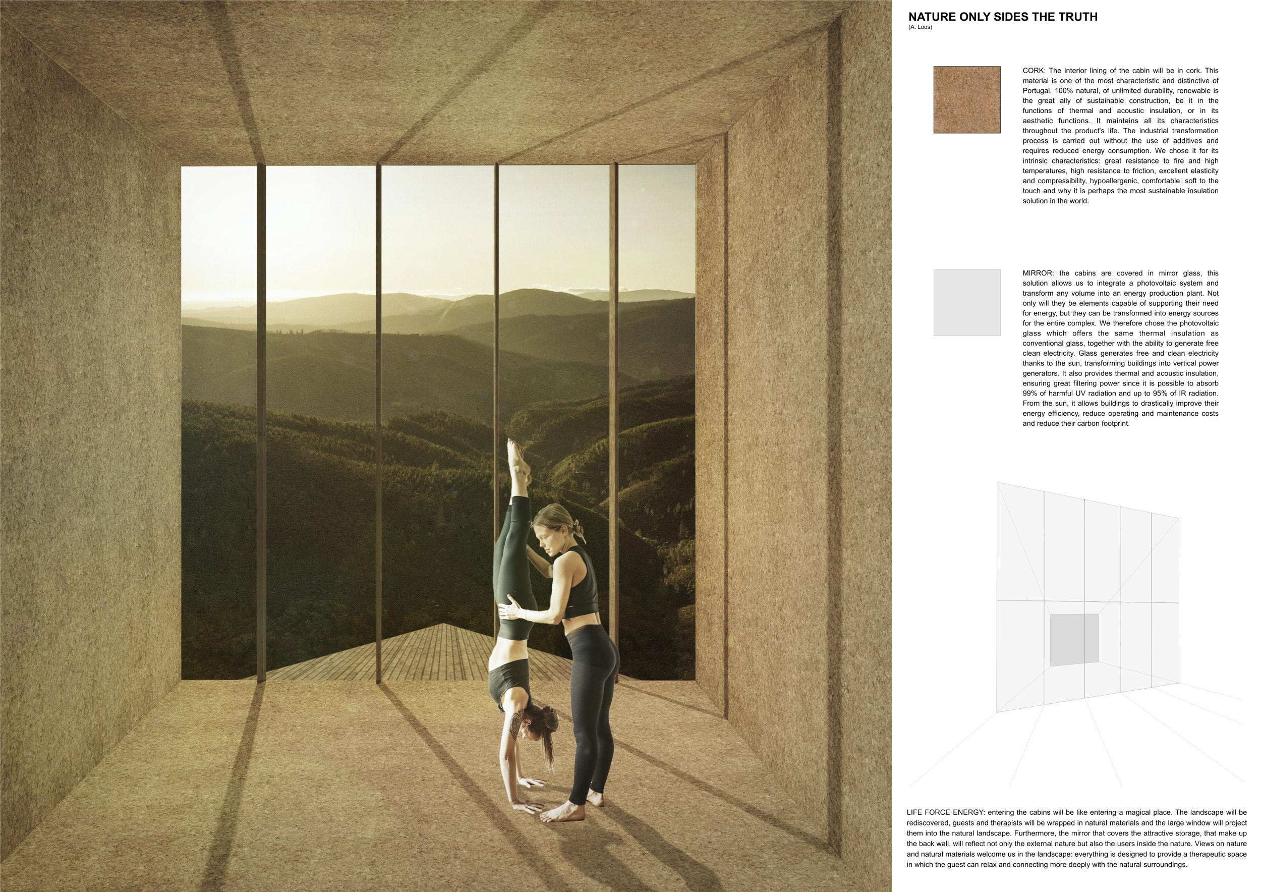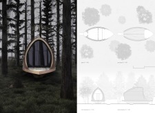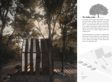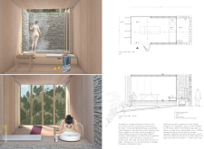 Participants were tasked here with submitting designs for a replicable ‘cabin’ for guest treatments and meditation sessions. The cabin is to be a space that allows guests to connect with the surrounding forest and gardens as part of a meditative and personal experience. Each cabin should provide sufficient space for one guest and one therapist.