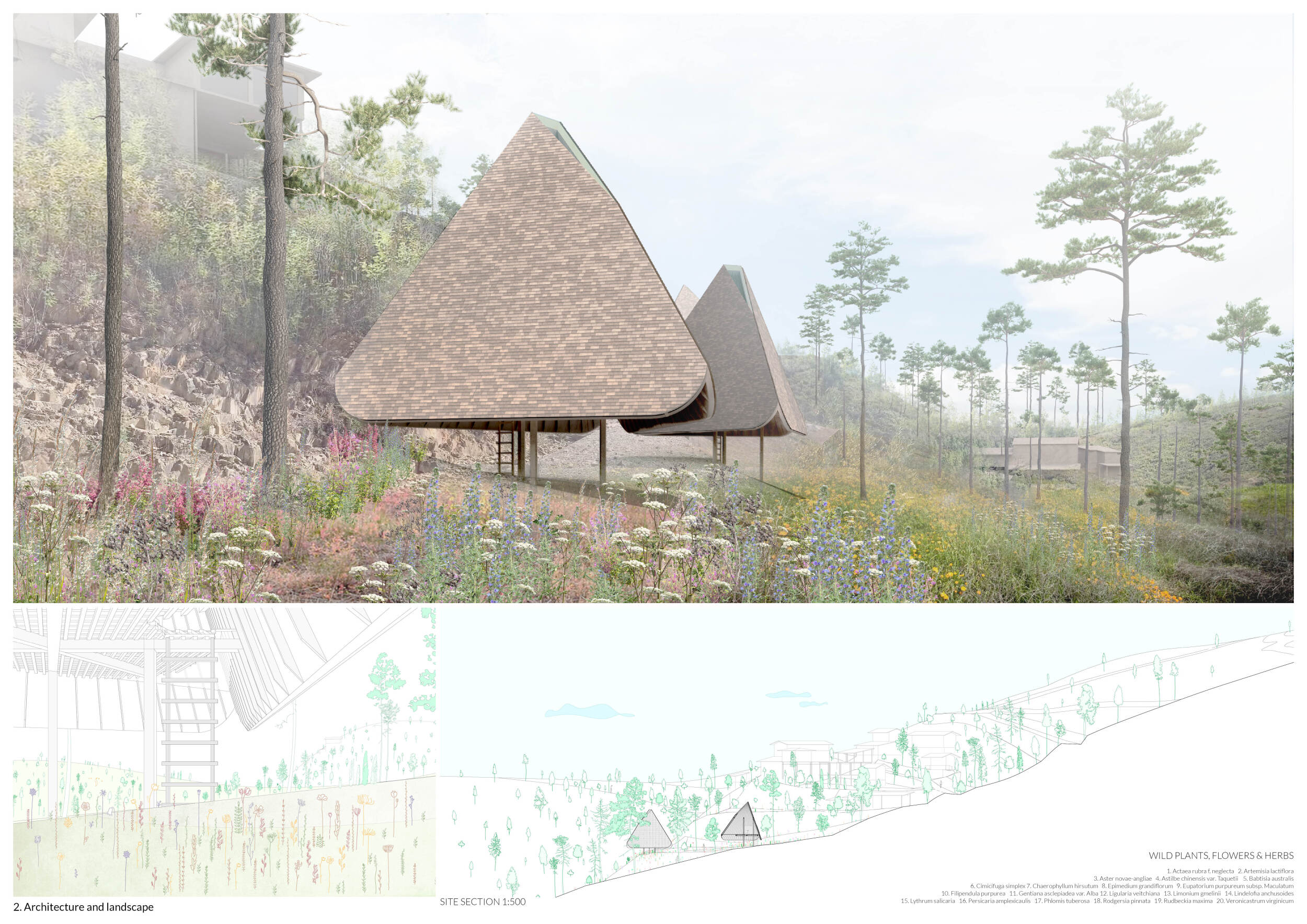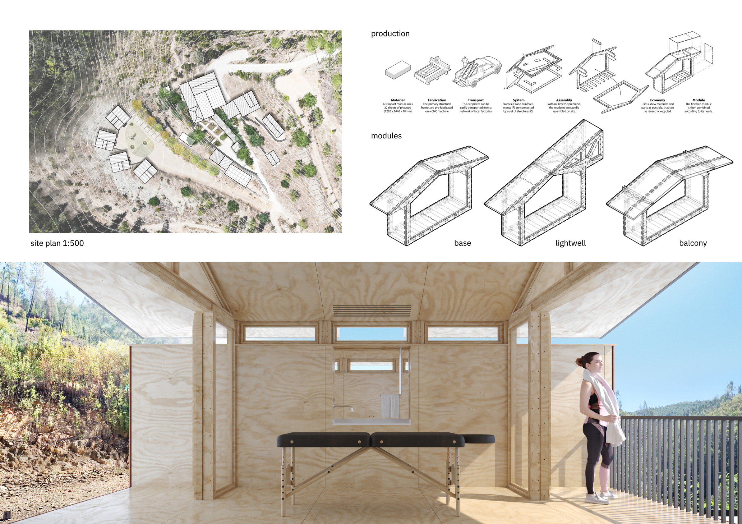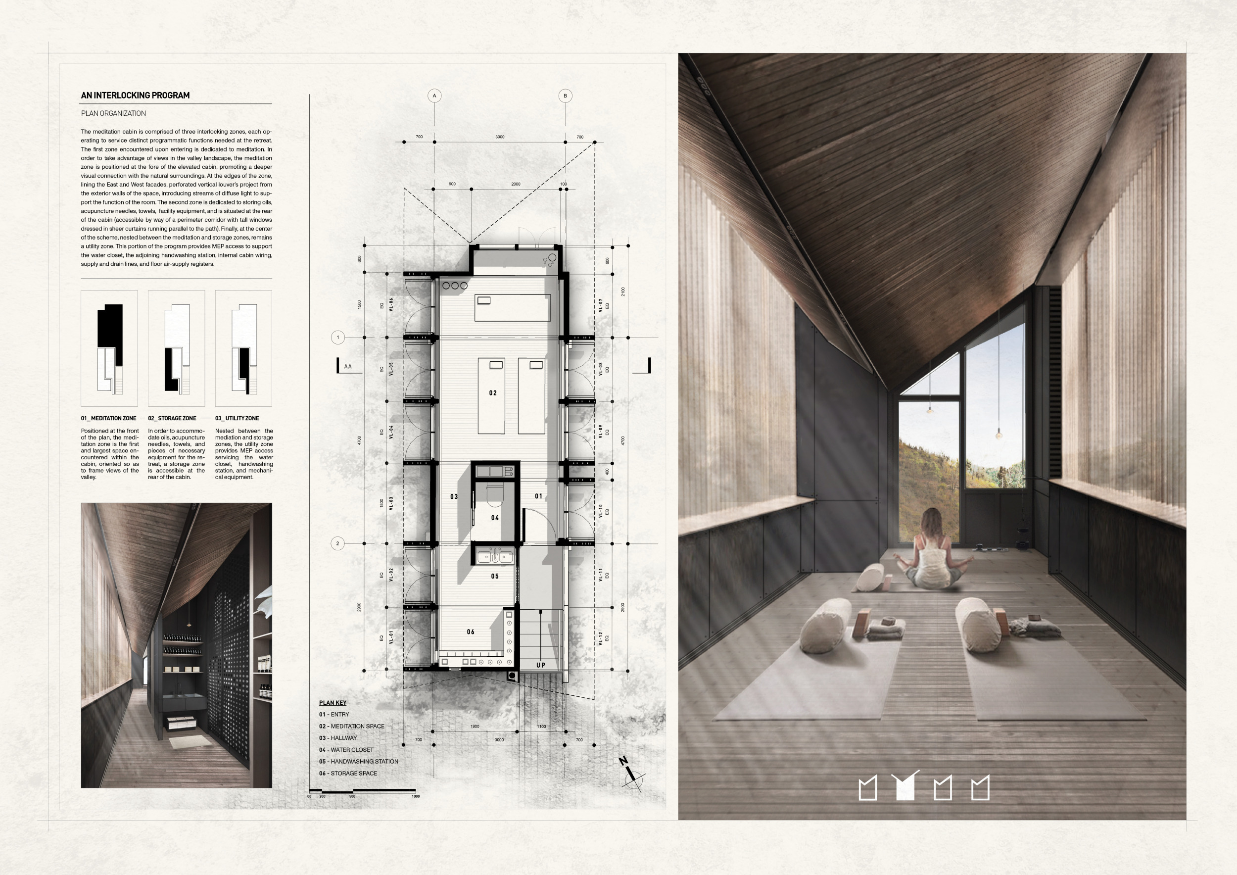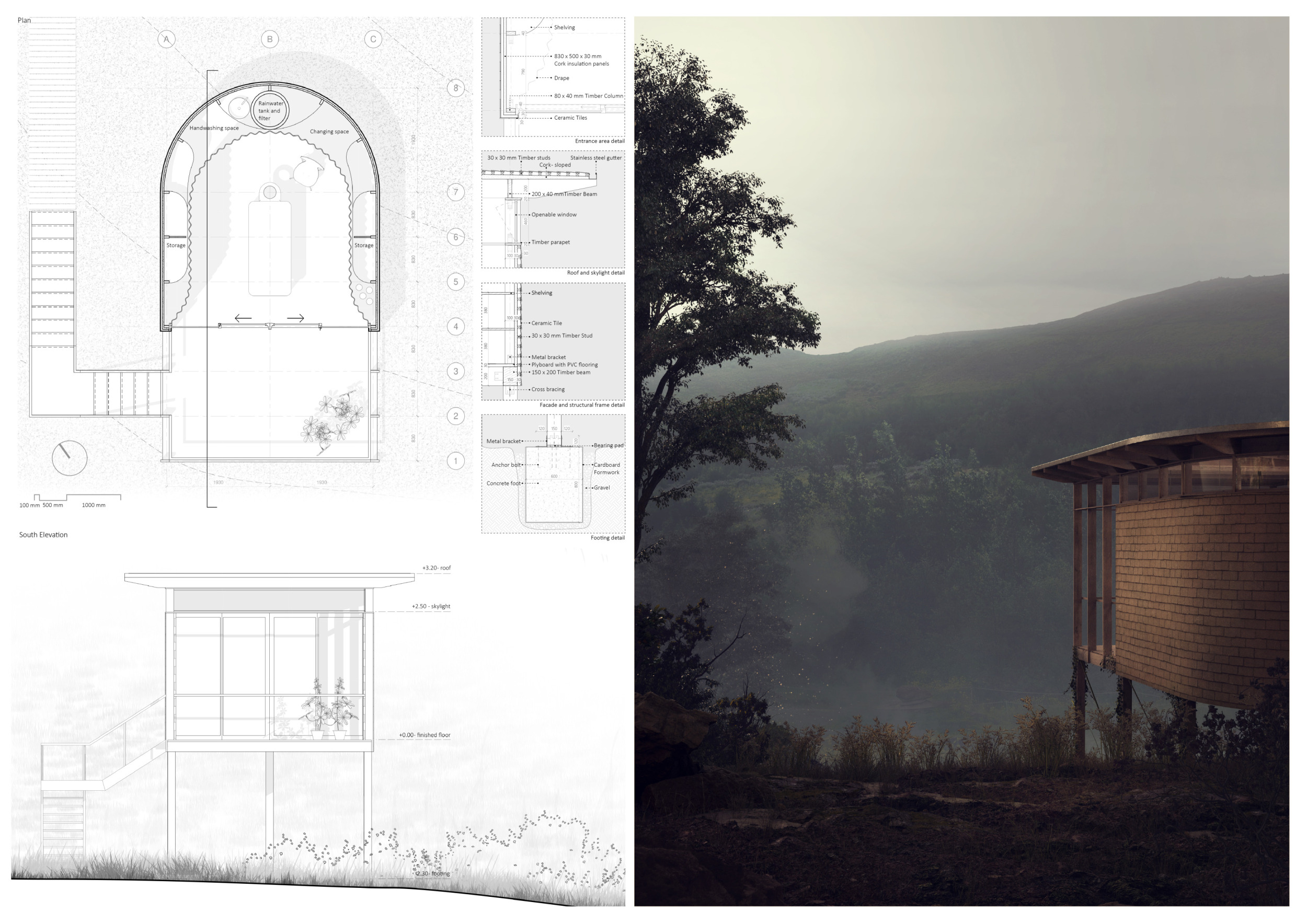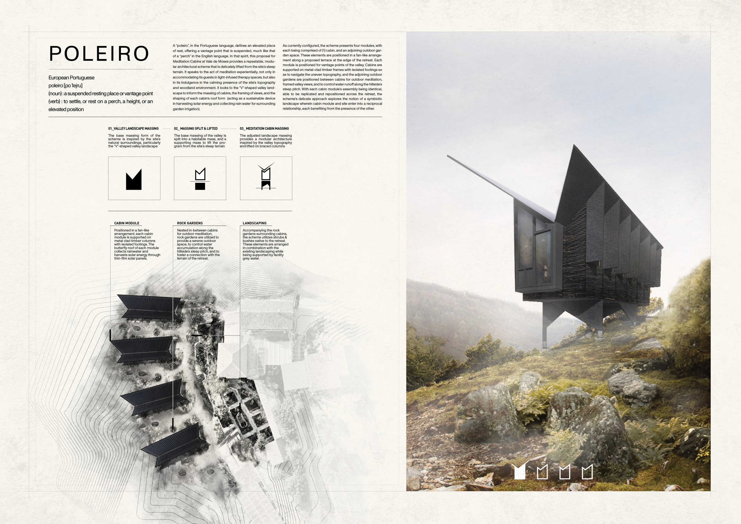 Participants were tasked here with submitting designs for a replicable ‘cabin’ for guest treatments and meditation sessions. The cabin is to be a space that allows guests to connect with the surrounding forest and gardens as part of a meditative and personal experience. Each cabin should provide sufficient space for one guest and one therapist.