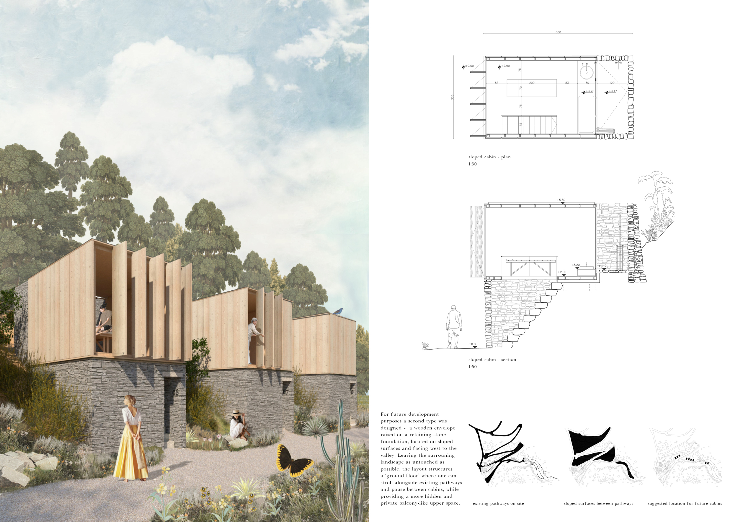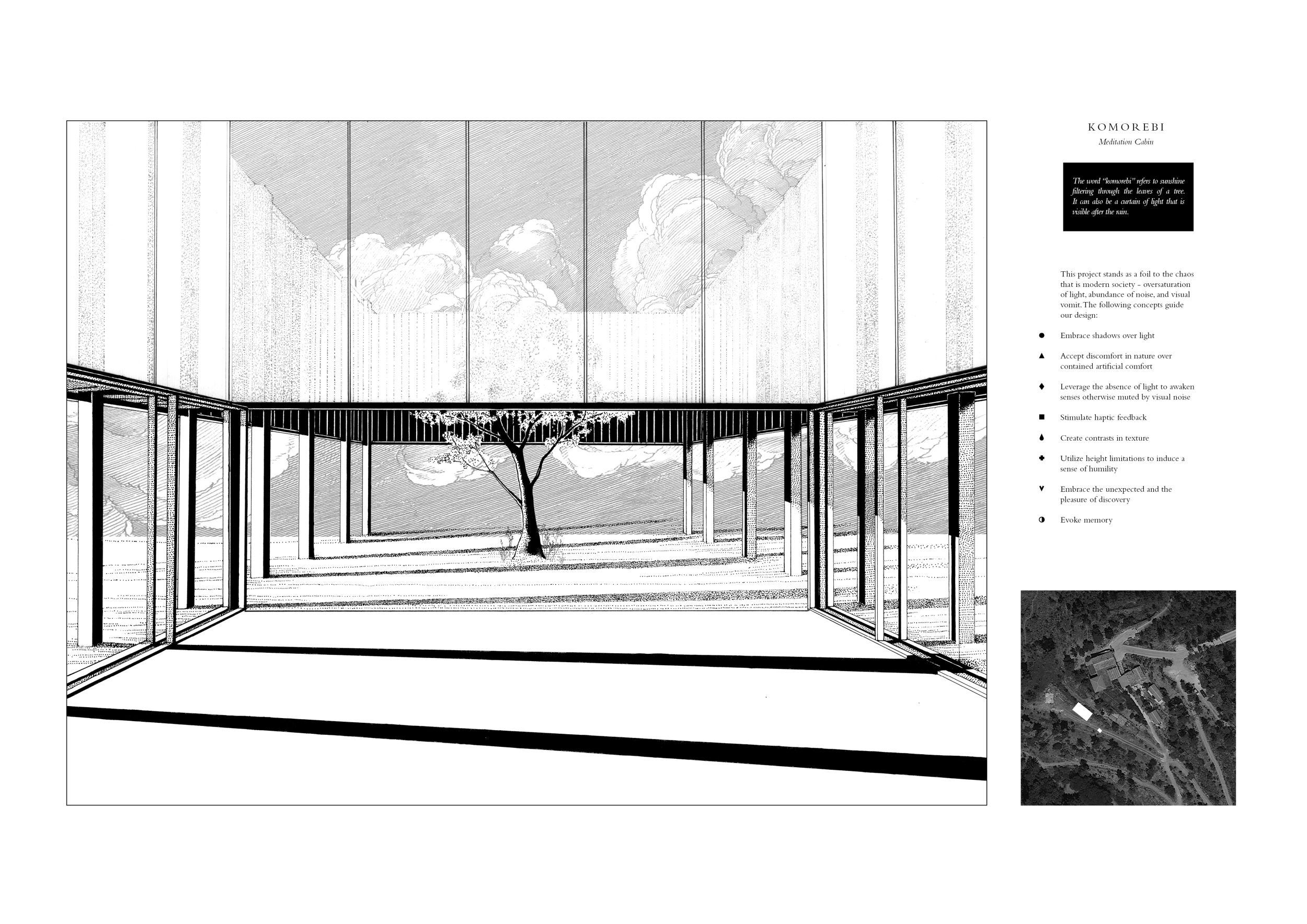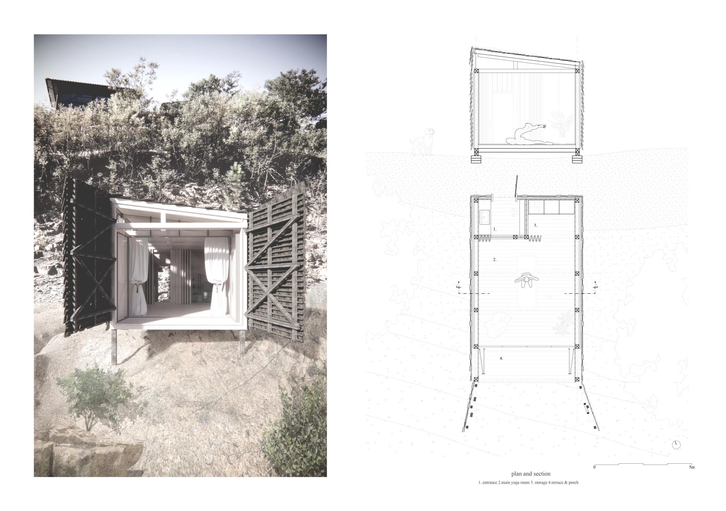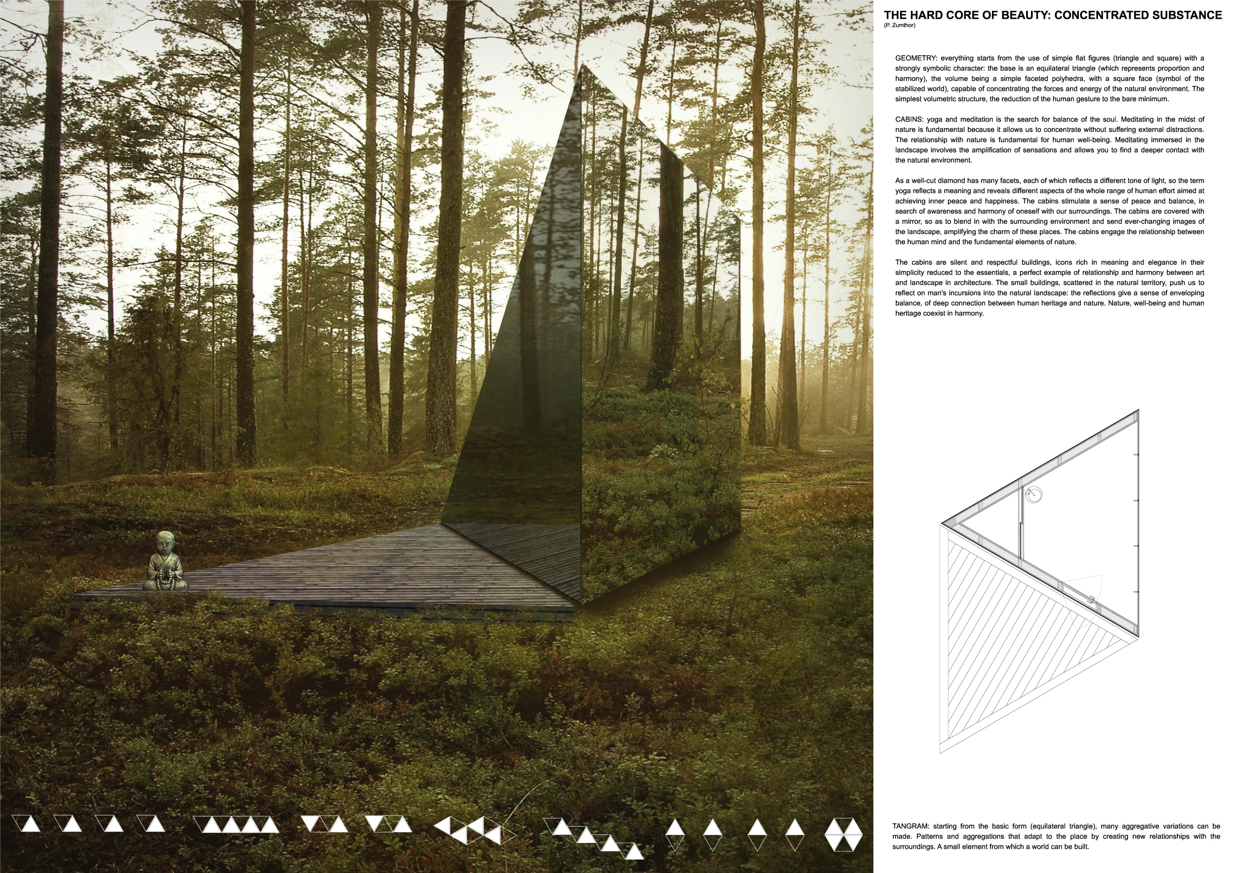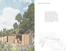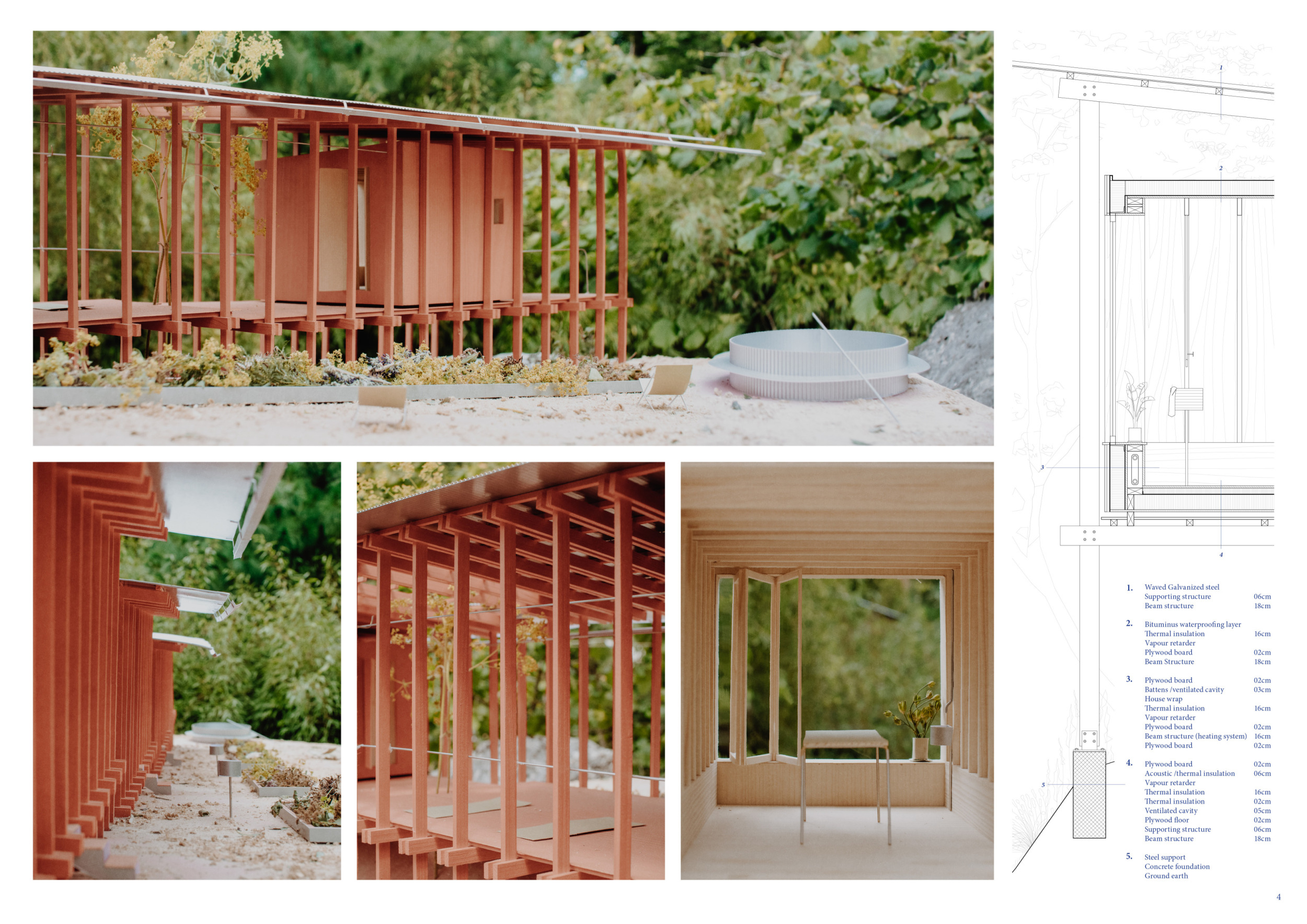 Participants were tasked here with submitting designs for a replicable ‘cabin’ for guest treatments and meditation sessions. The cabin is to be a space that allows guests to connect with the surrounding forest and gardens as part of a meditative and personal experience. Each cabin should provide sufficient space for one guest and one therapist.