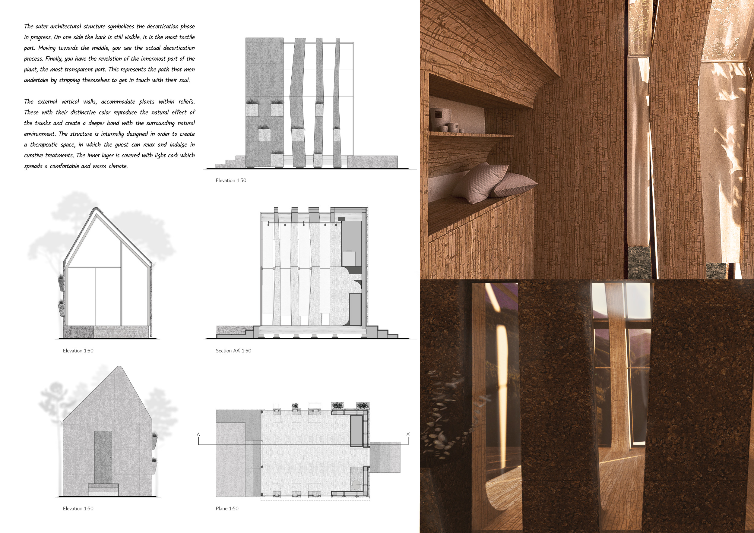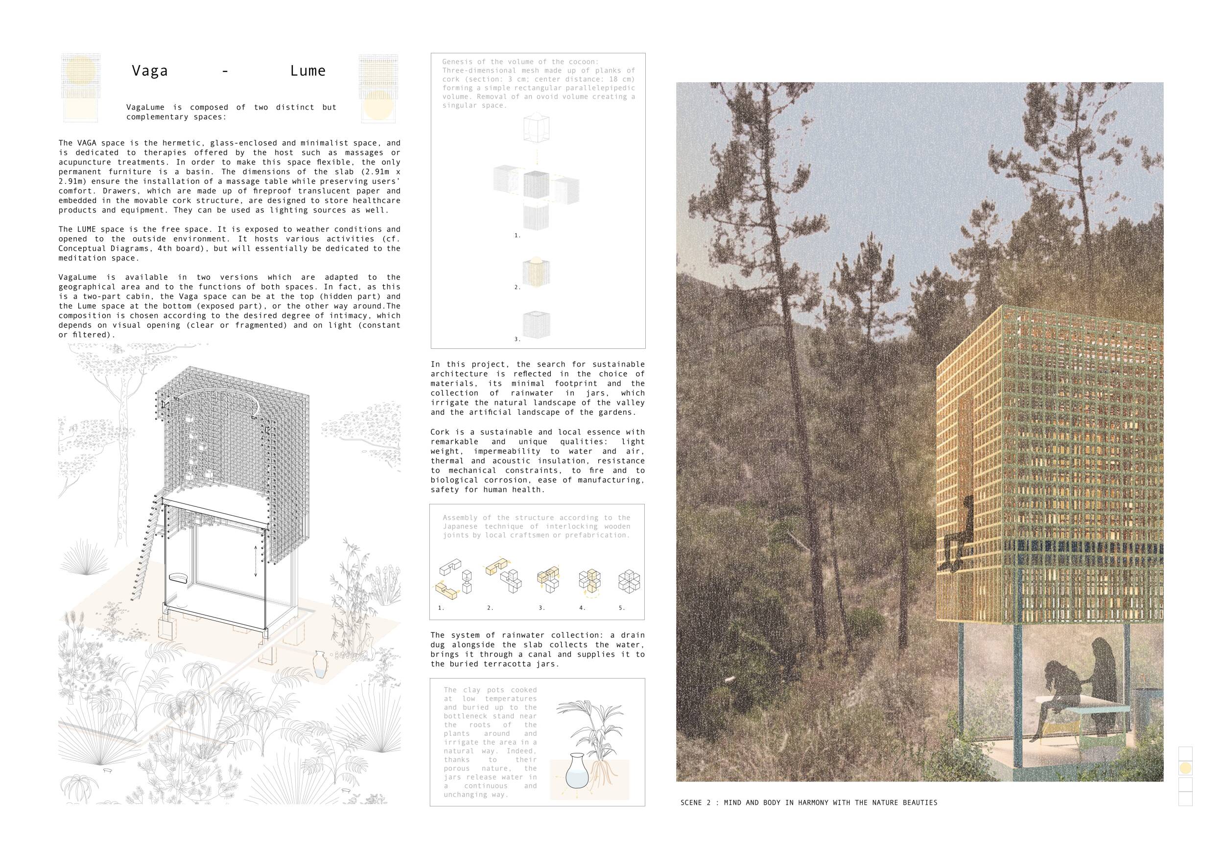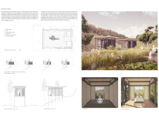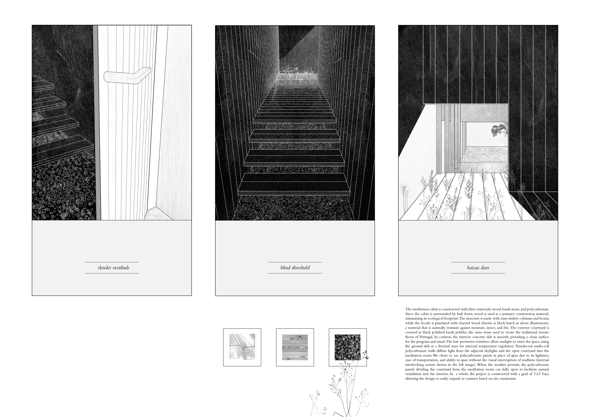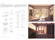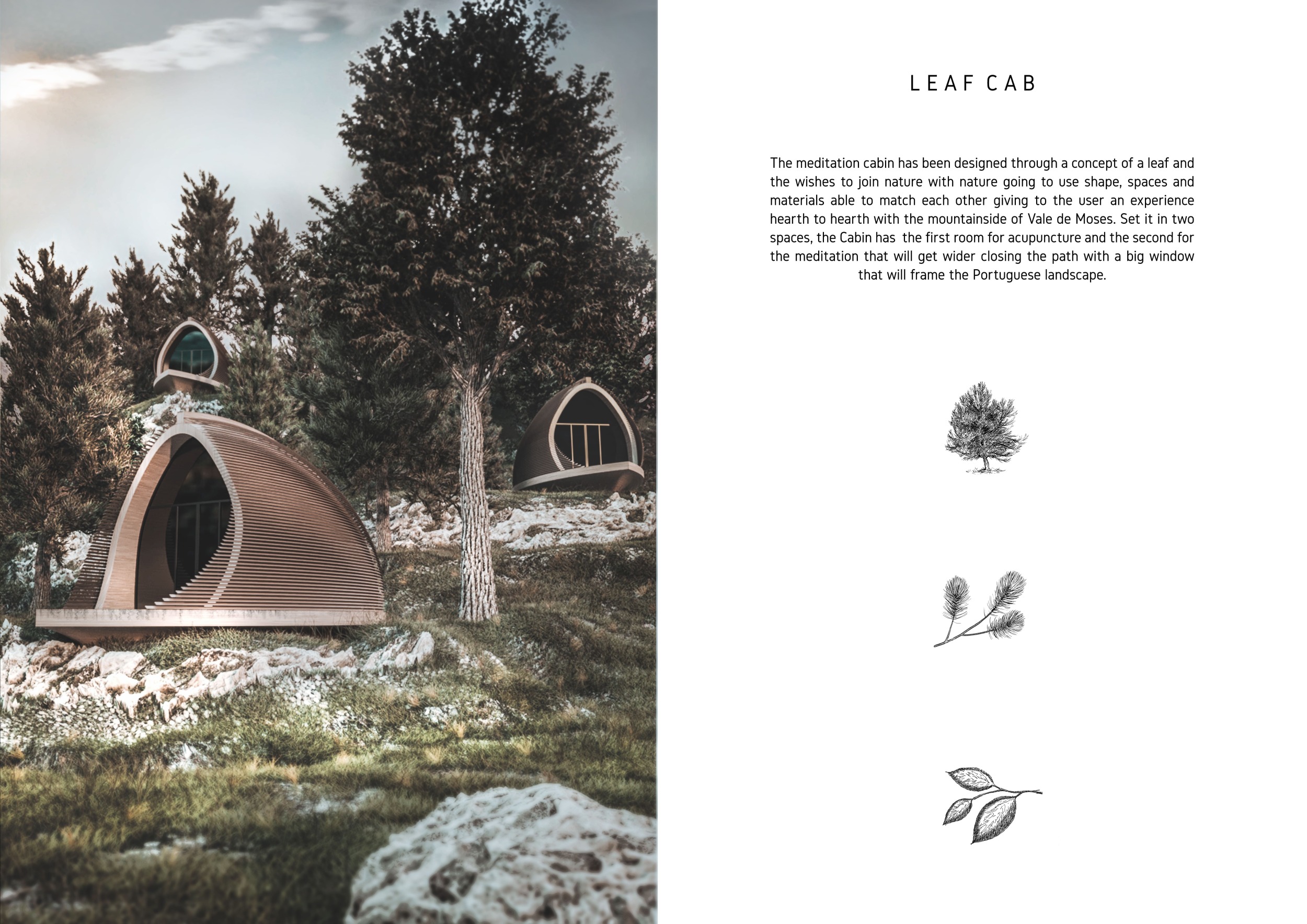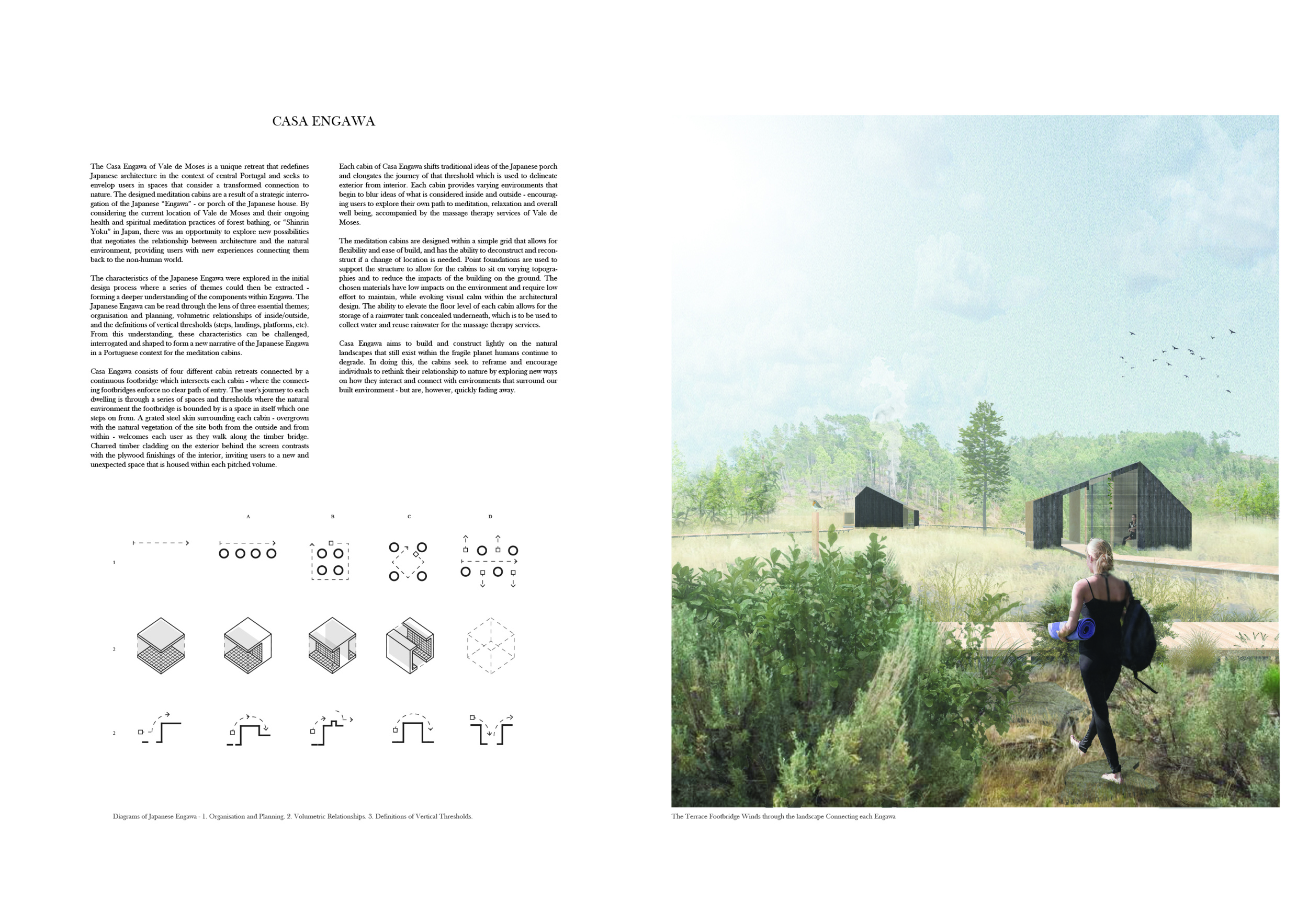 Participants were tasked here with submitting designs for a replicable ‘cabin’ for guest treatments and meditation sessions. The cabin is to be a space that allows guests to connect with the surrounding forest and gardens as part of a meditative and personal experience. Each cabin should provide sufficient space for one guest and one therapist.