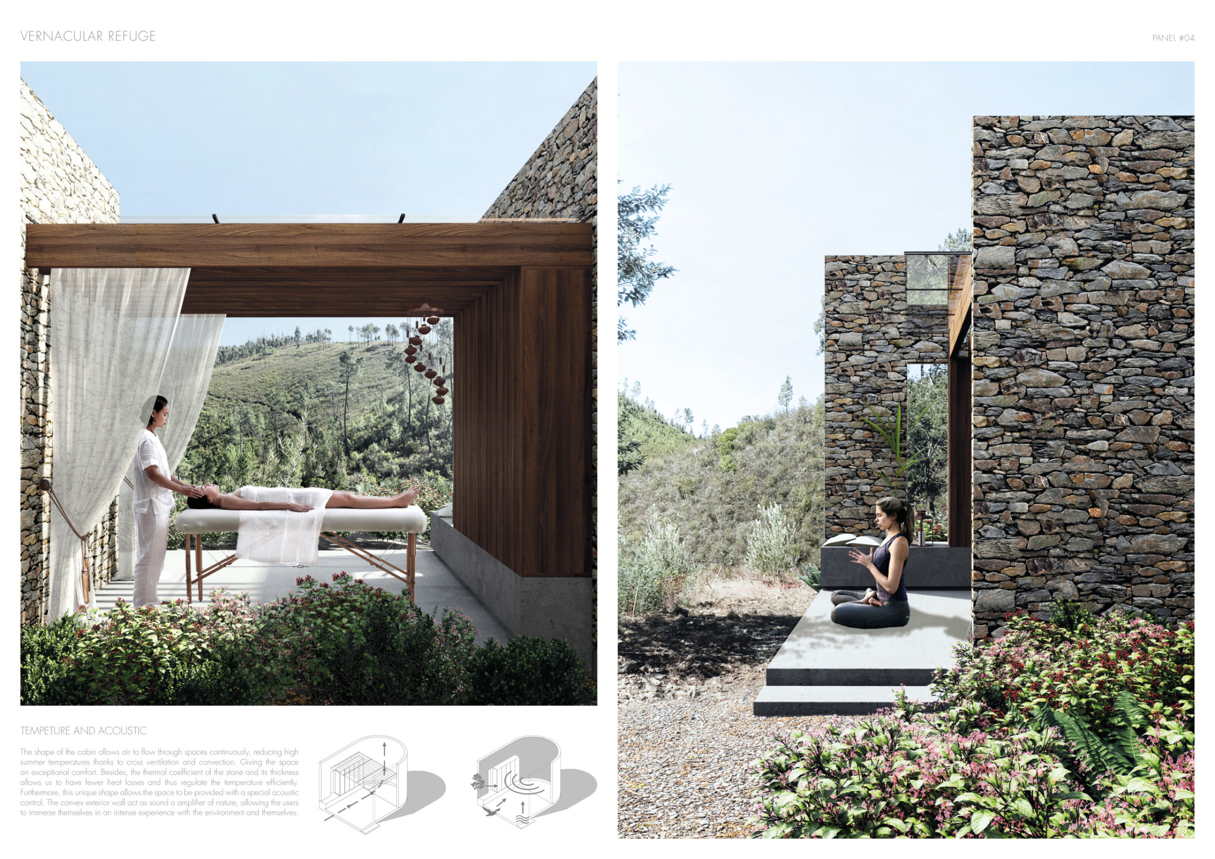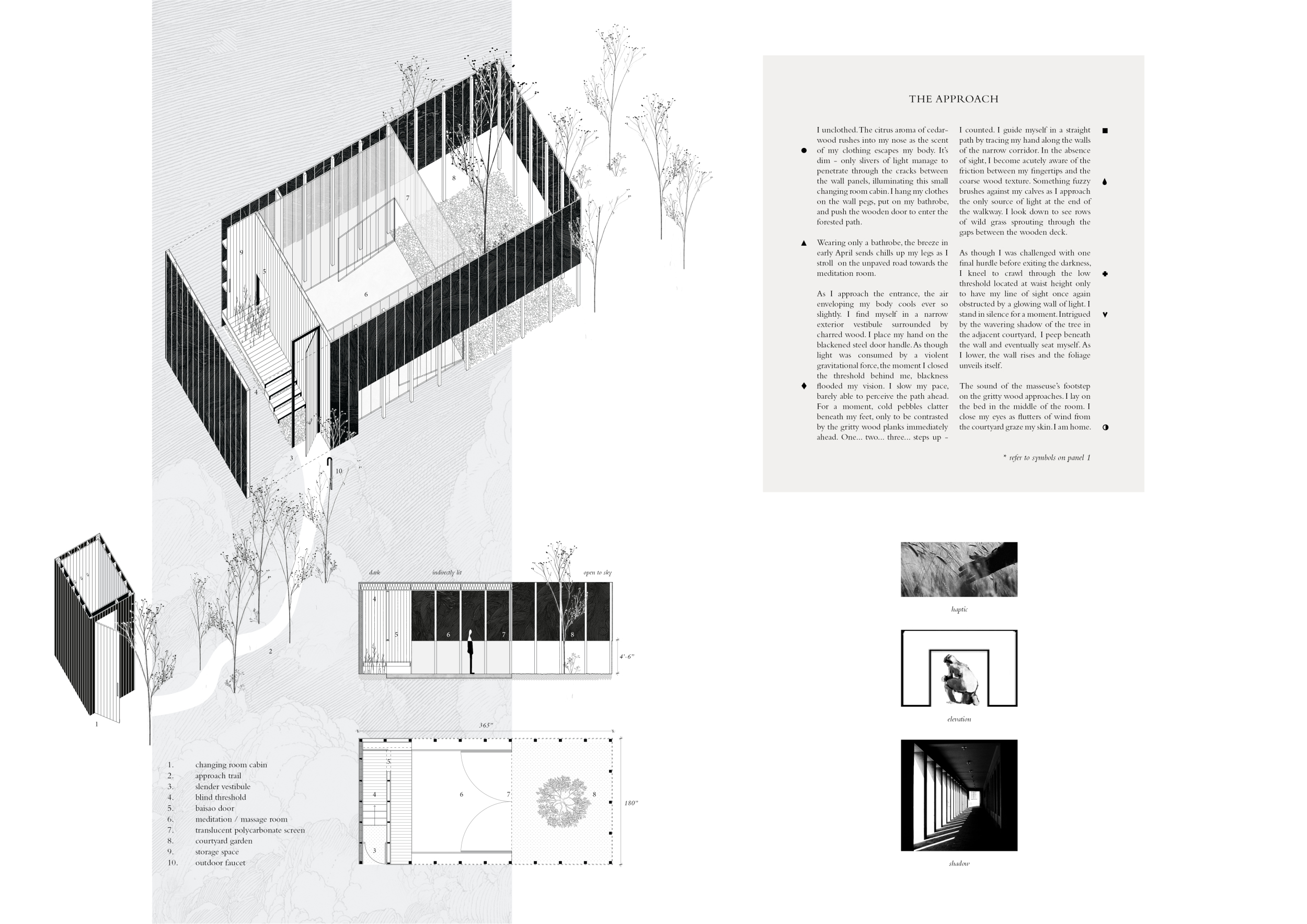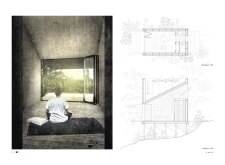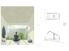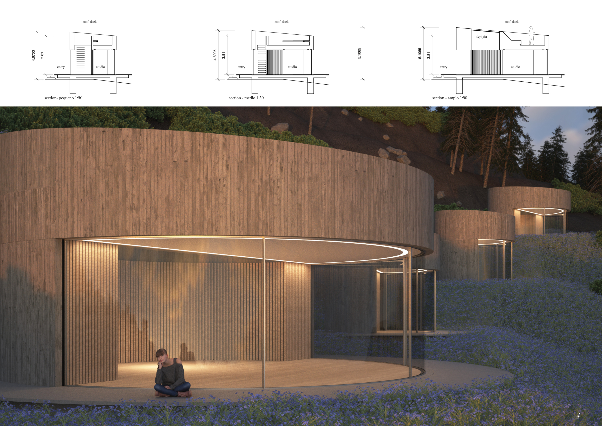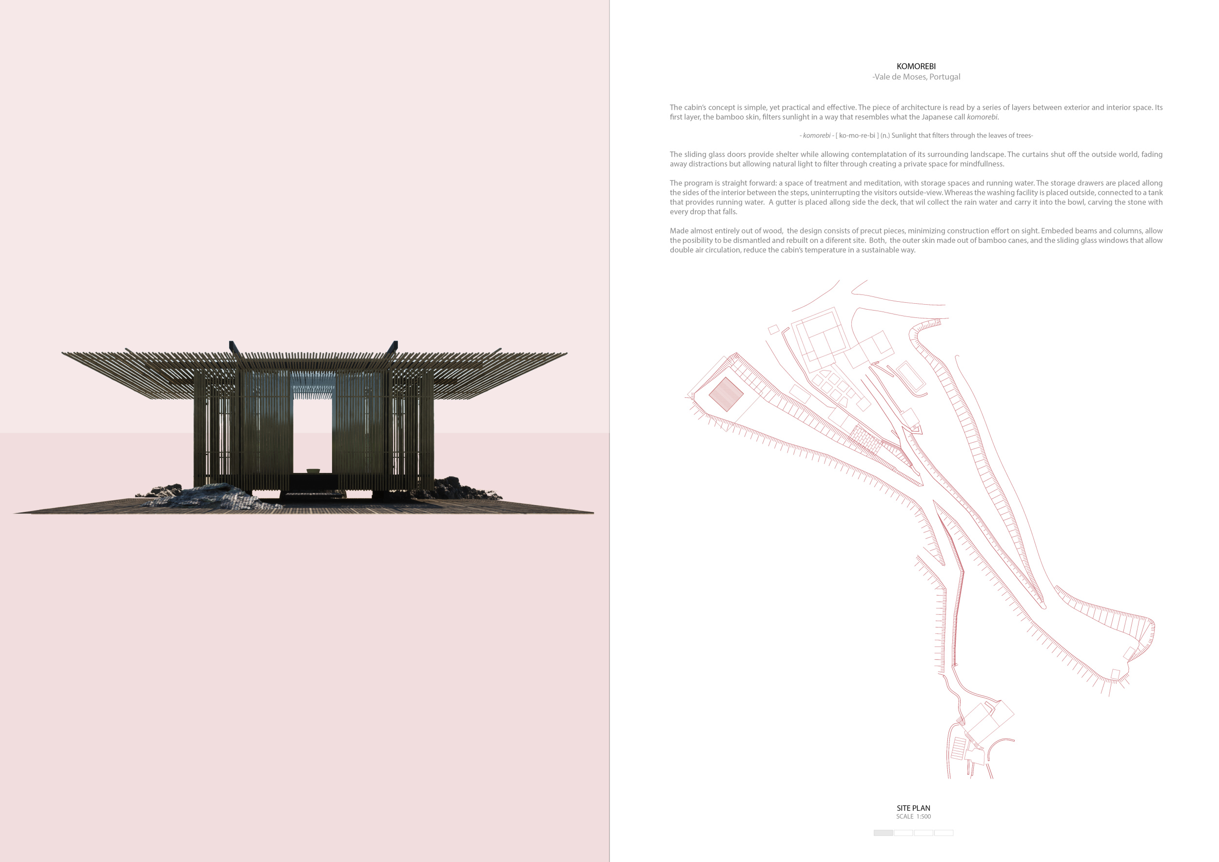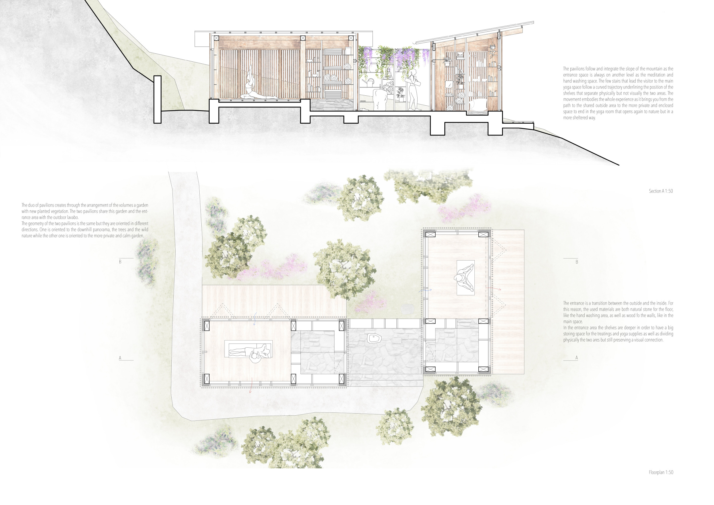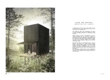 Participants were tasked here with submitting designs for a replicable ‘cabin’ for guest treatments and meditation sessions. The cabin is to be a space that allows guests to connect with the surrounding forest and gardens as part of a meditative and personal experience. Each cabin should provide sufficient space for one guest and one therapist.