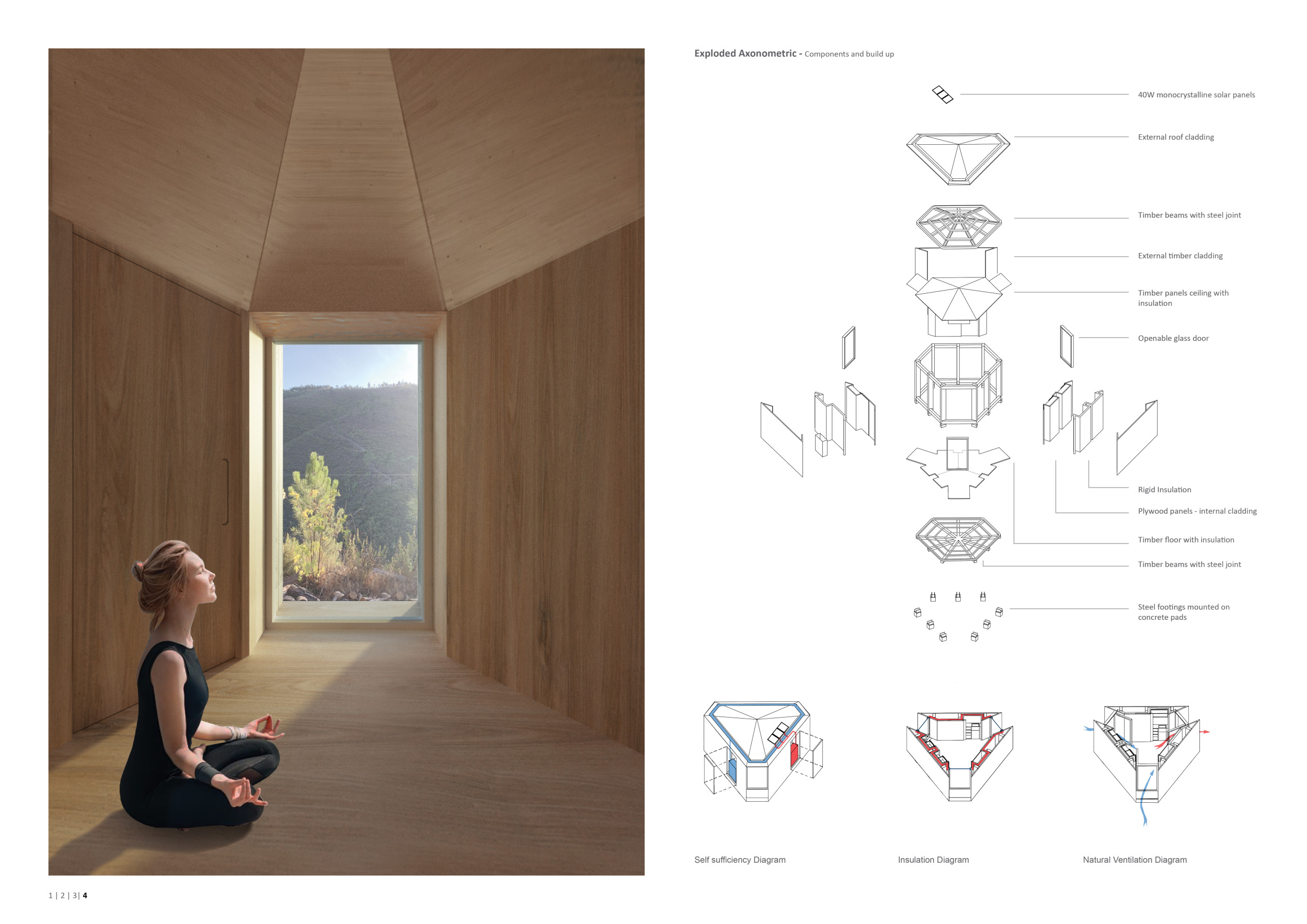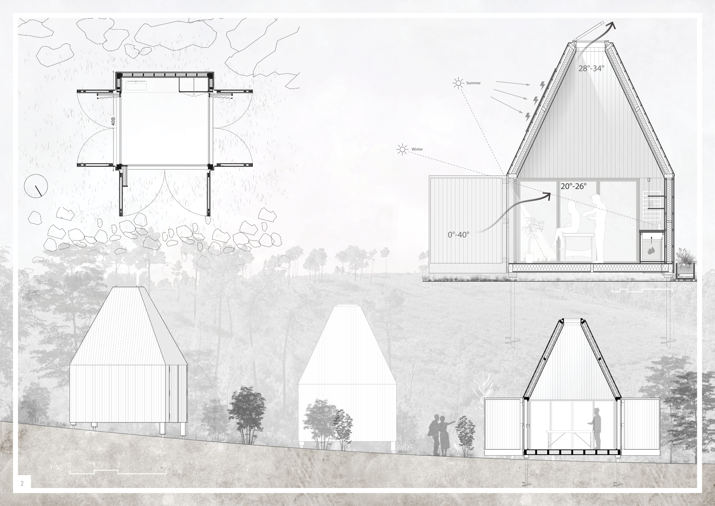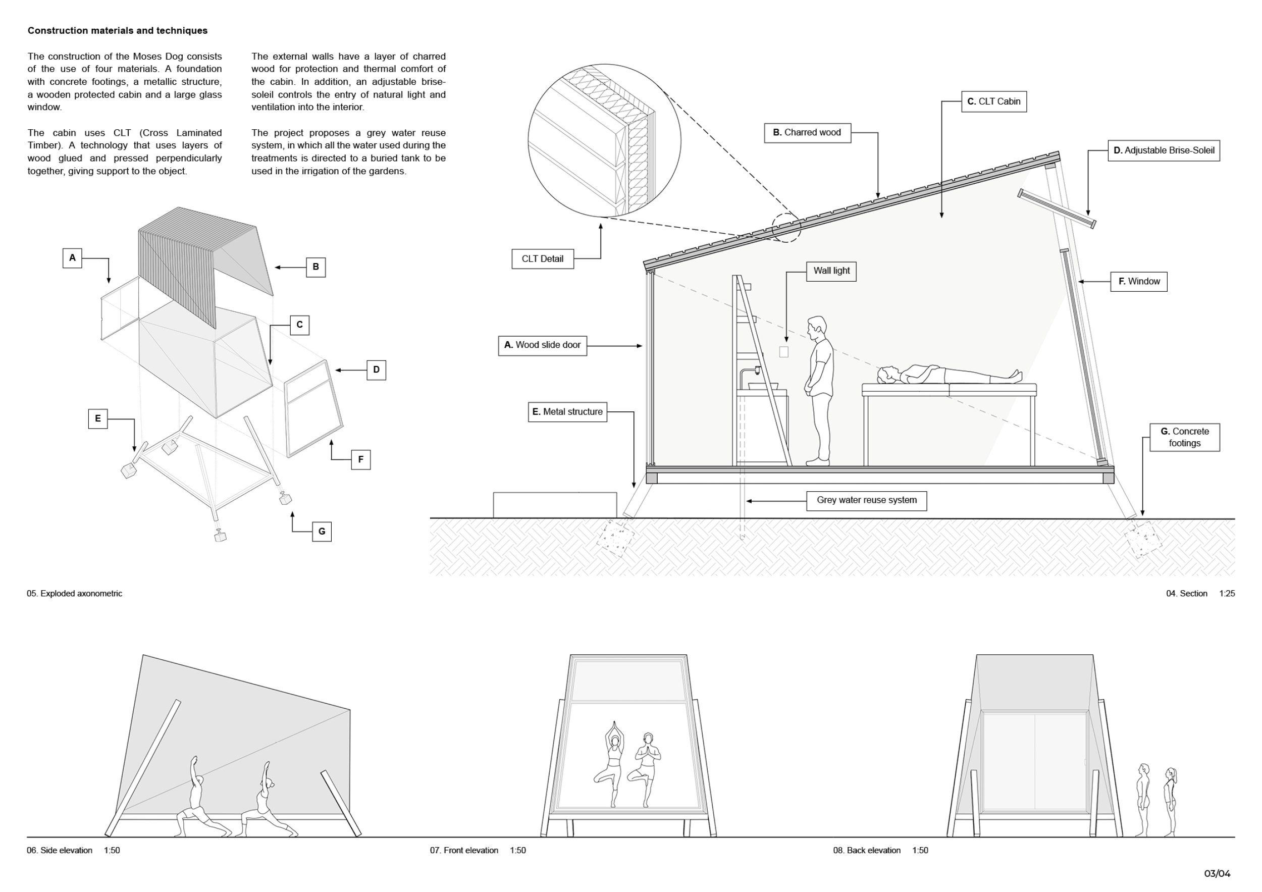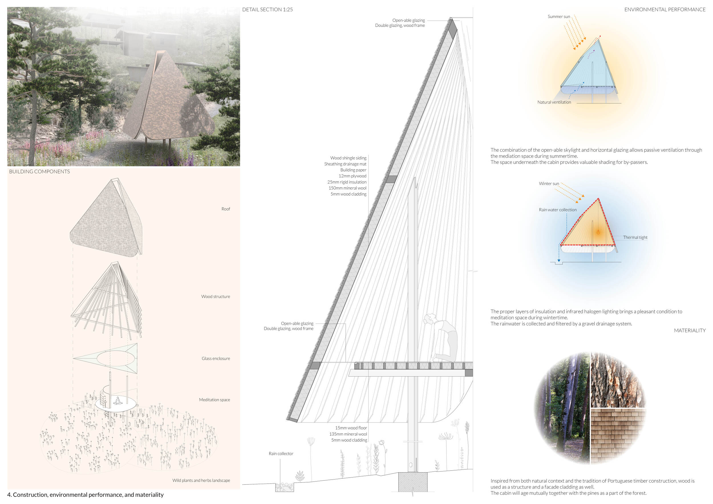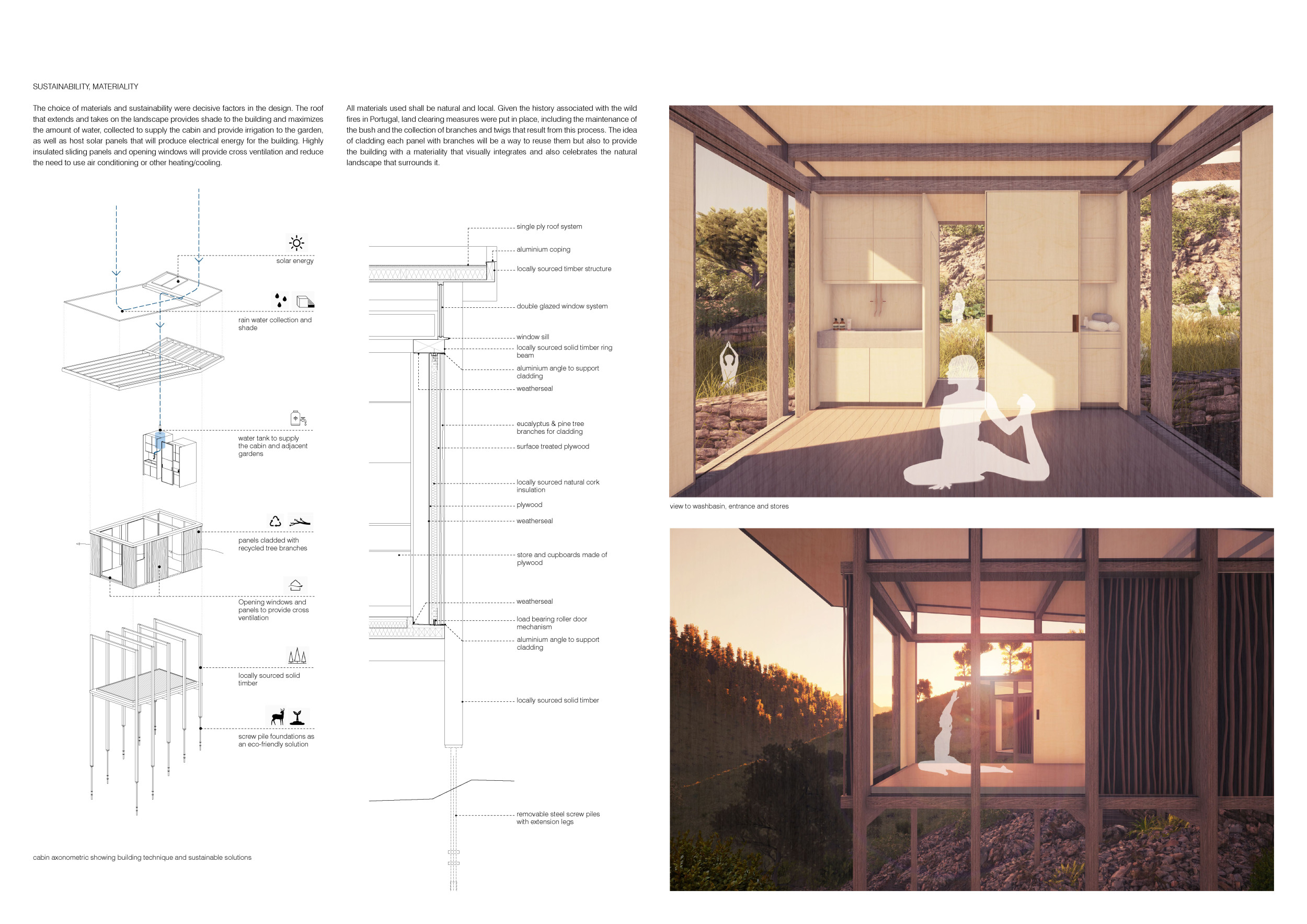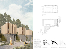 Participants were tasked here with submitting designs for a replicable ‘cabin’ for guest treatments and meditation sessions. The cabin is to be a space that allows guests to connect with the surrounding forest and gardens as part of a meditative and personal experience. Each cabin should provide sufficient space for one guest and one therapist.