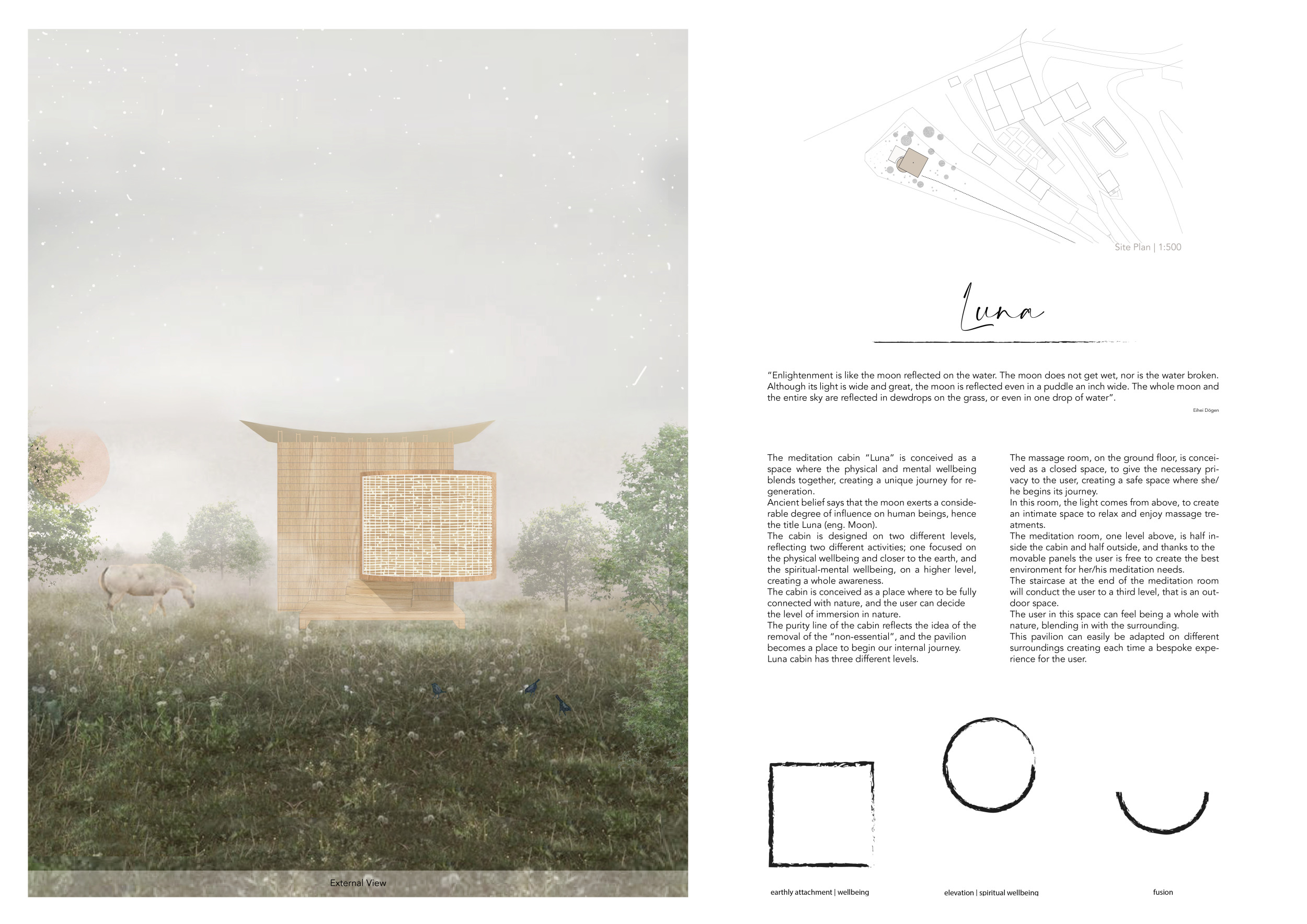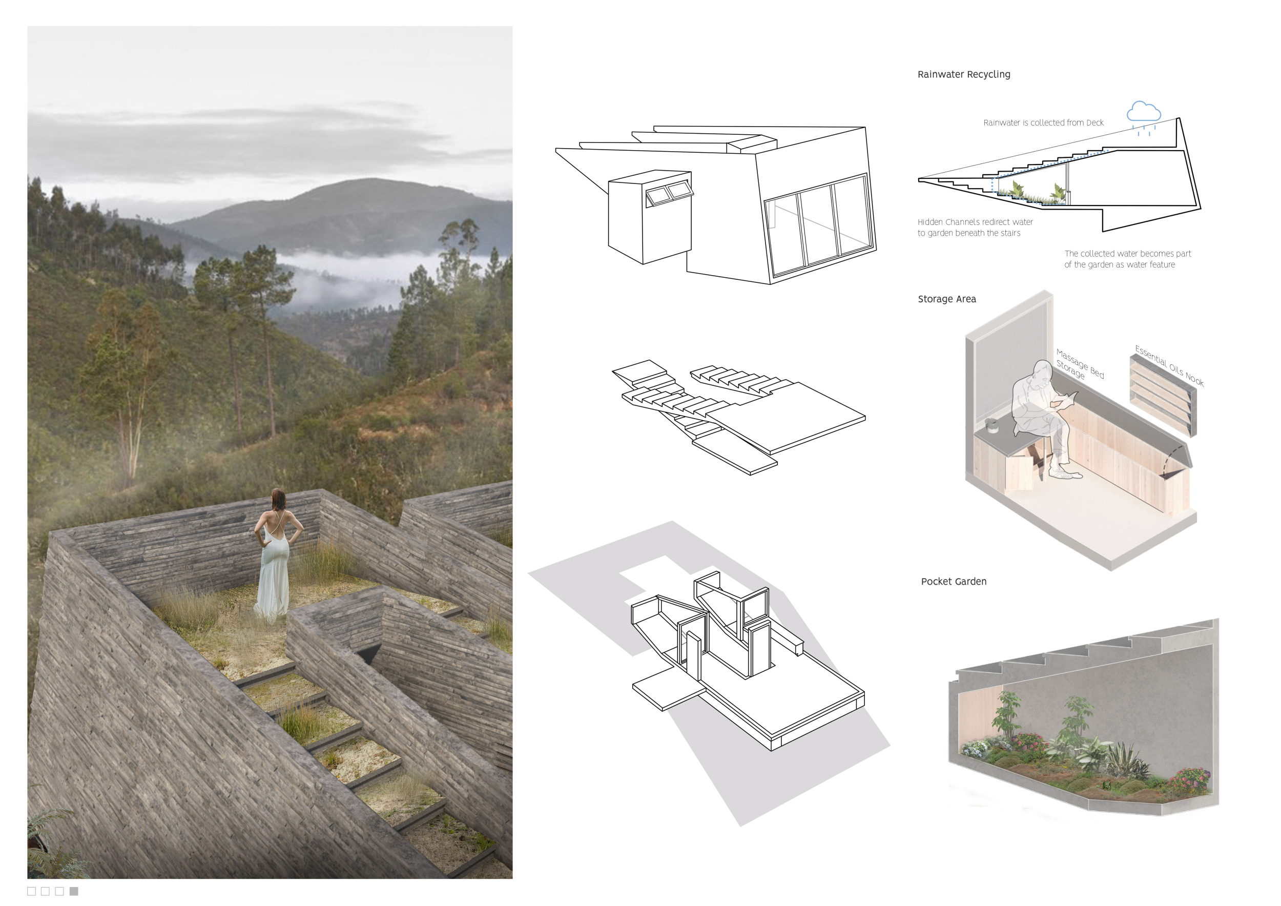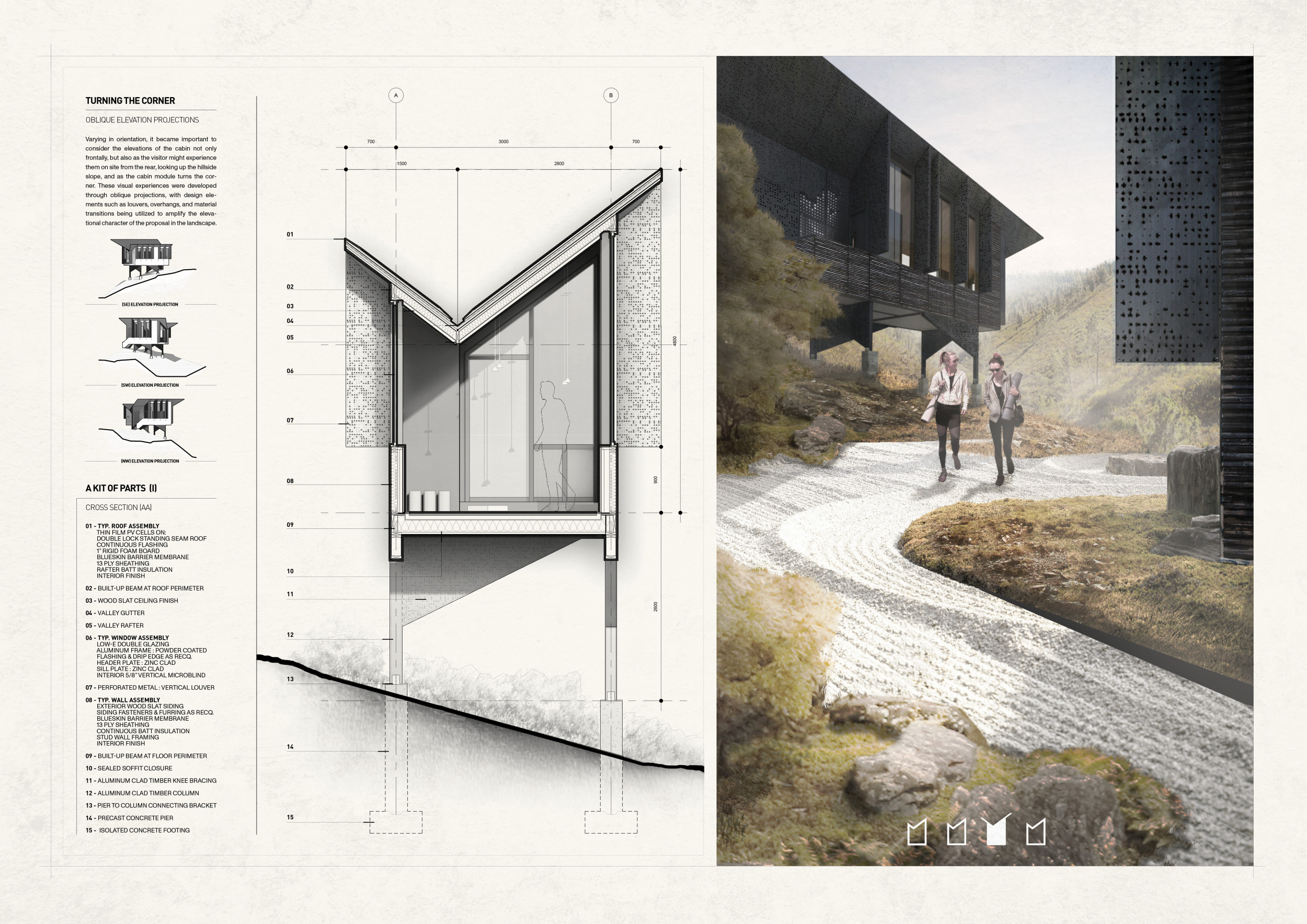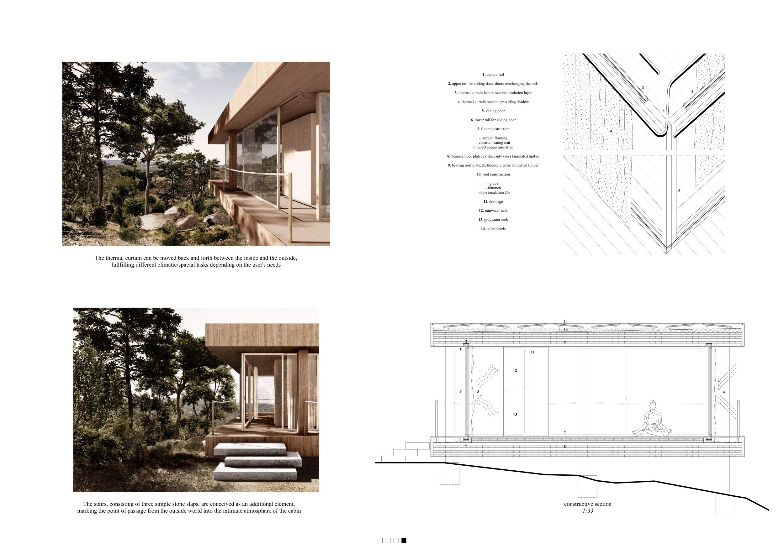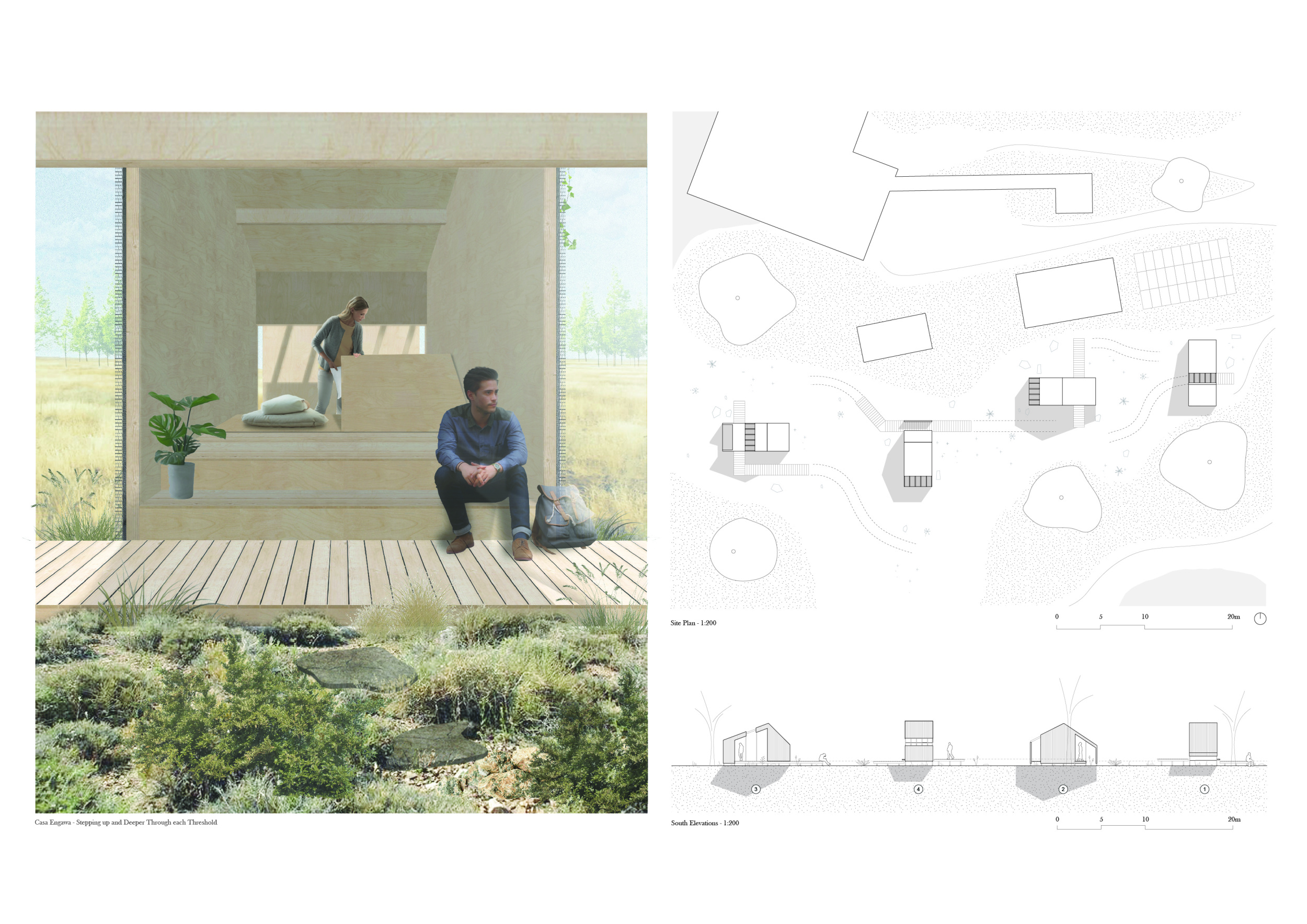 Participants were tasked here with submitting designs for a replicable ‘cabin’ for guest treatments and meditation sessions. The cabin is to be a space that allows guests to connect with the surrounding forest and gardens as part of a meditative and personal experience. Each cabin should provide sufficient space for one guest and one therapist.