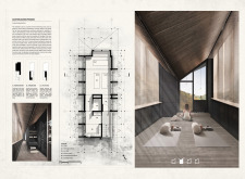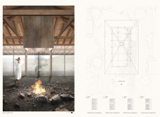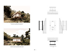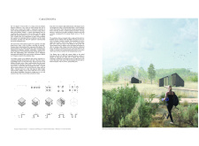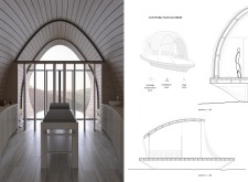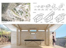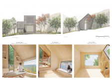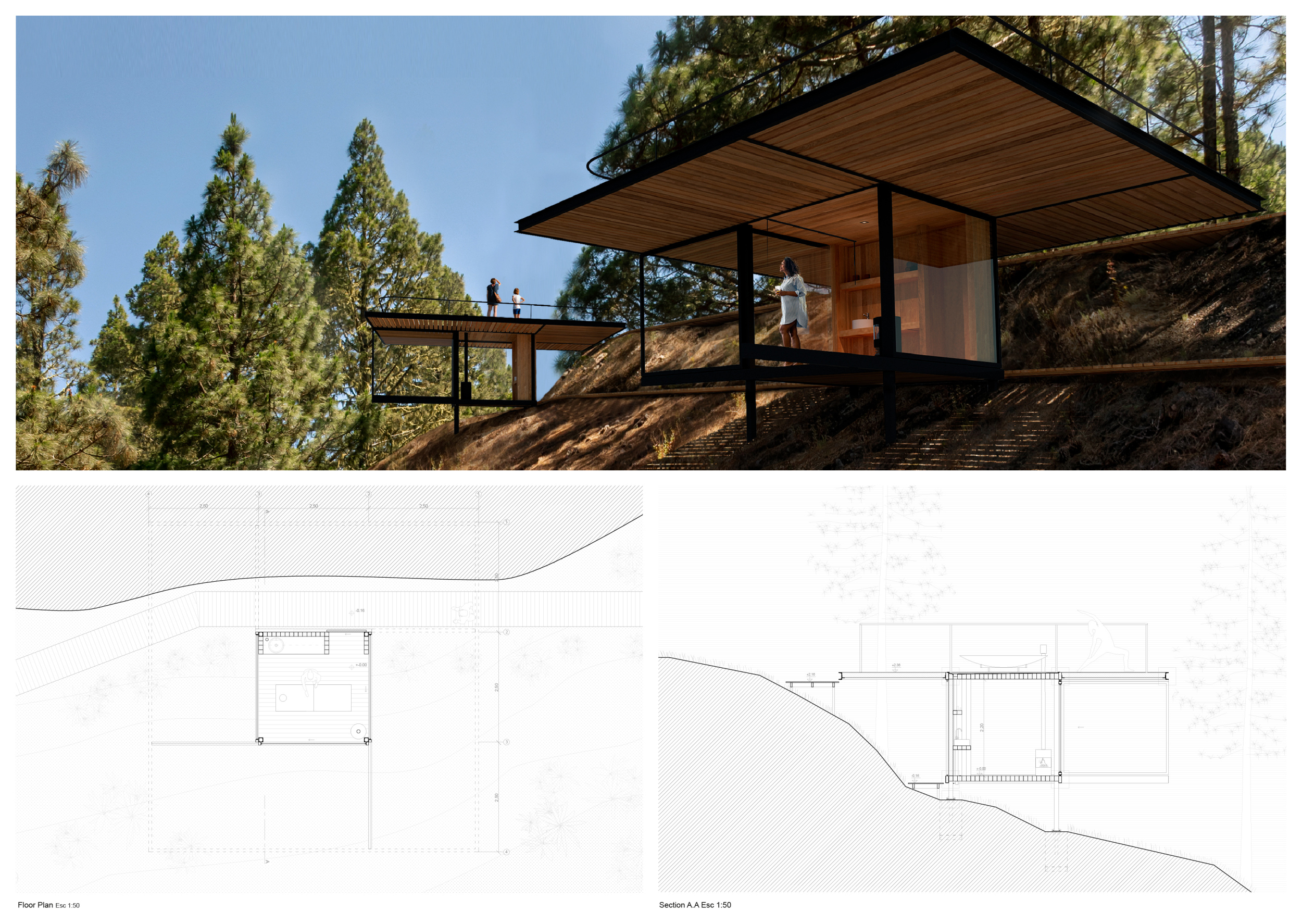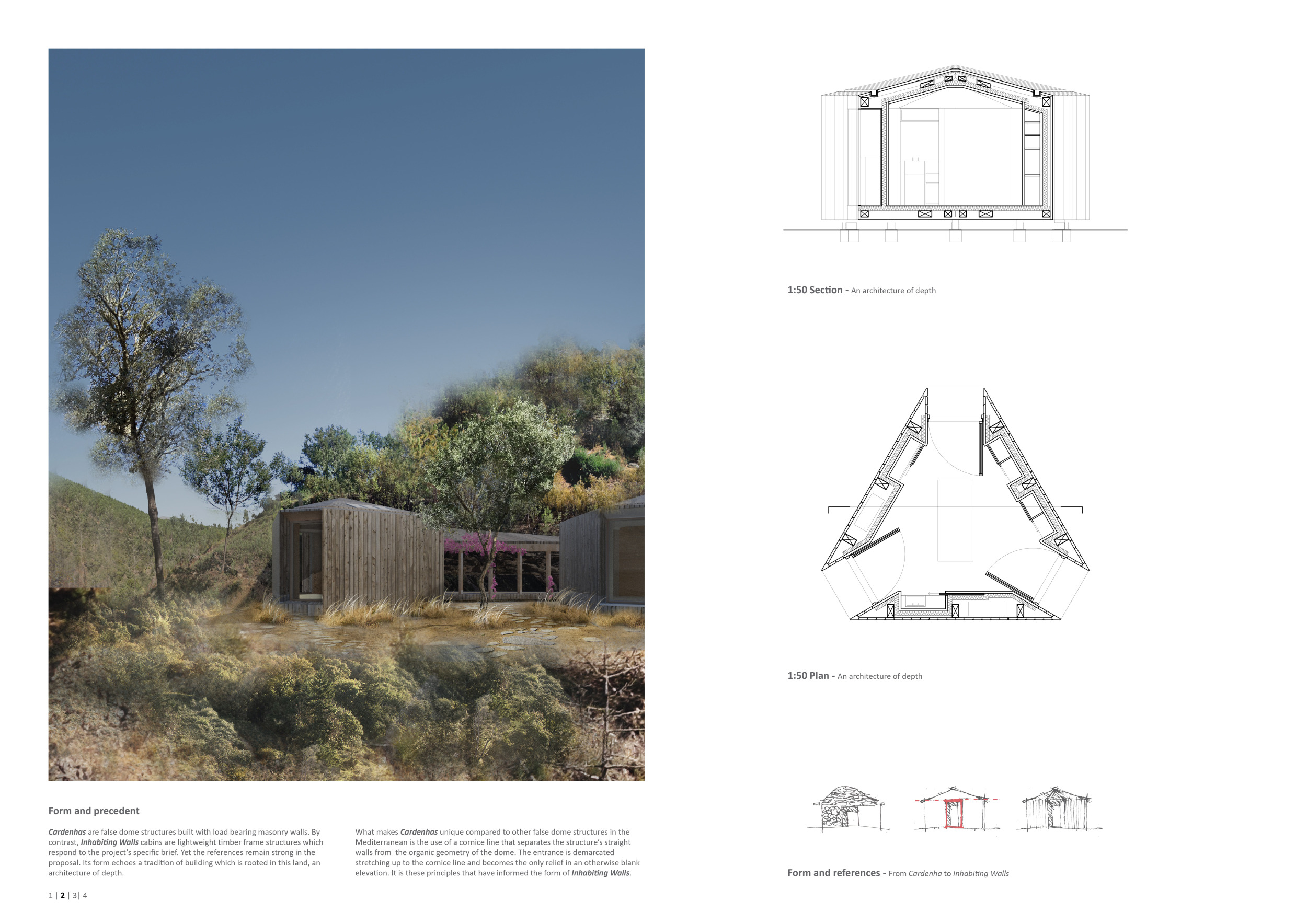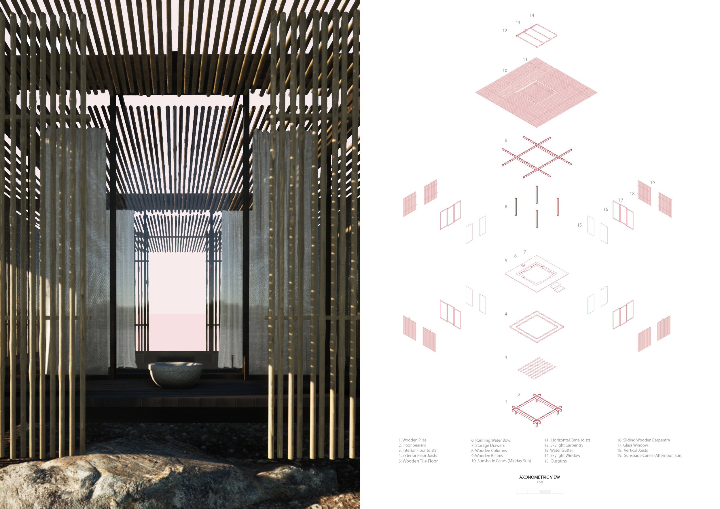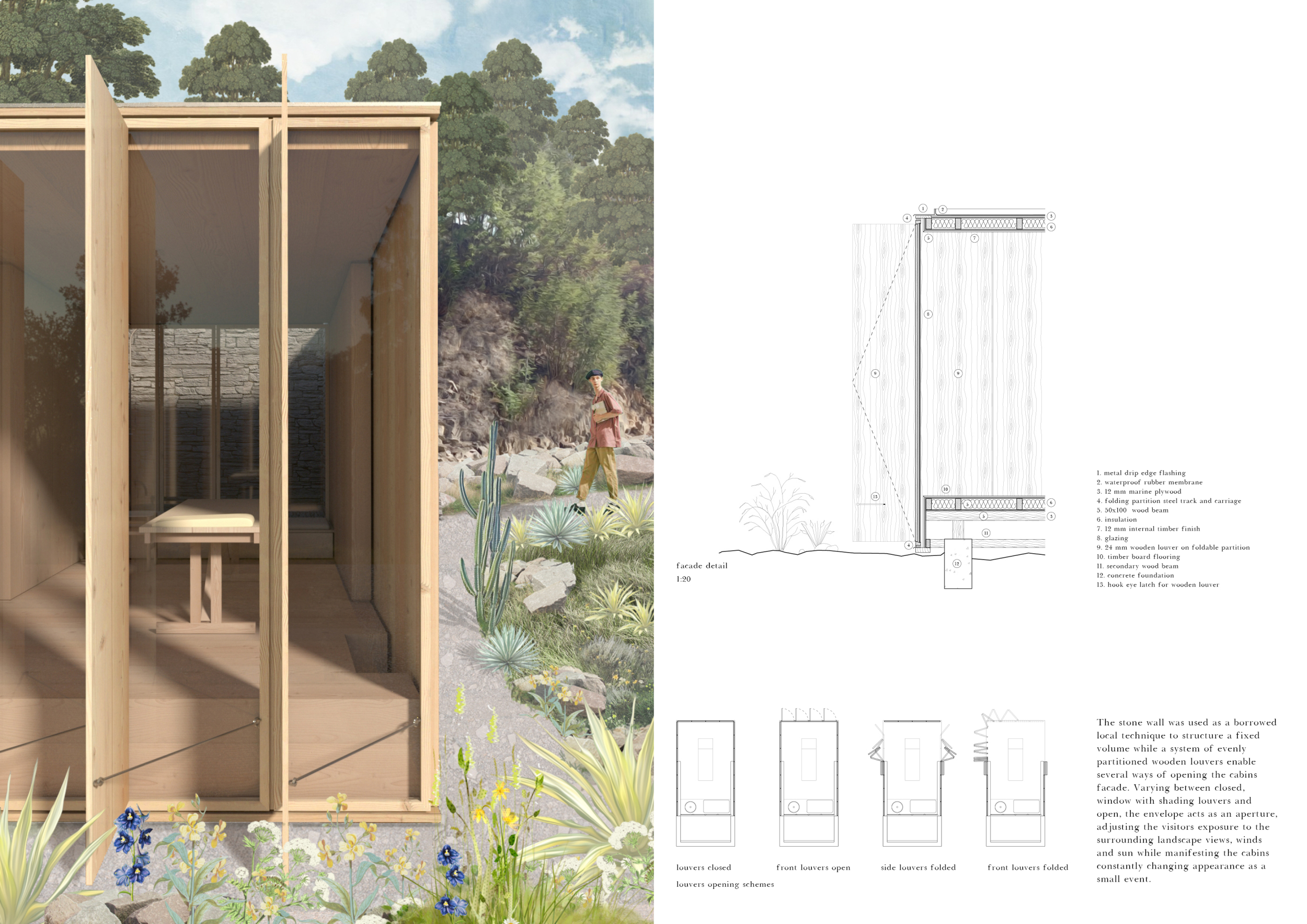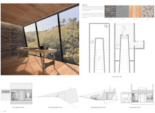 Participants were tasked here with submitting designs for a replicable ‘cabin’ for guest treatments and meditation sessions. The cabin is to be a space that allows guests to connect with the surrounding forest and gardens as part of a meditative and personal experience. Each cabin should provide sufficient space for one guest and one therapist.