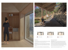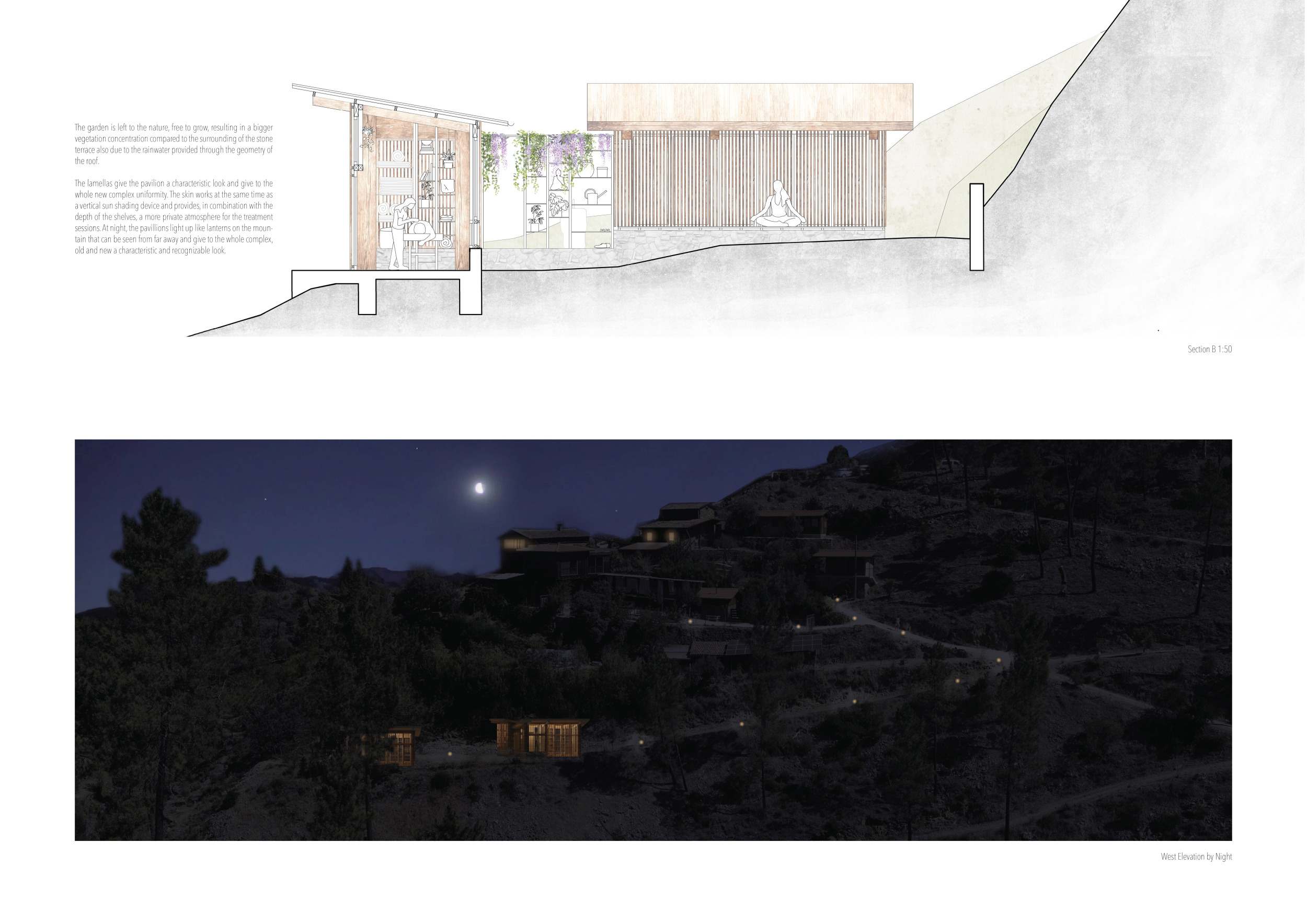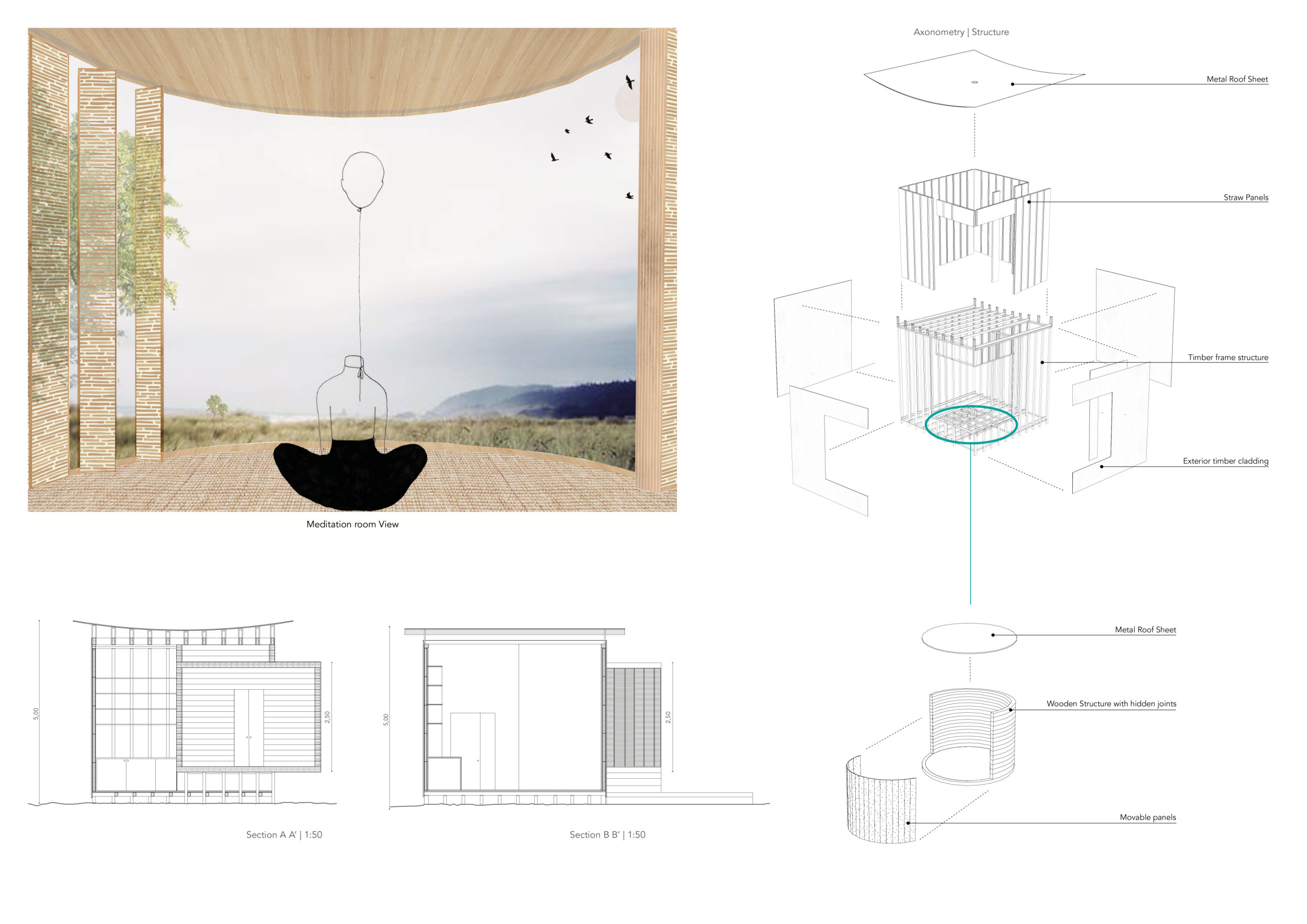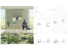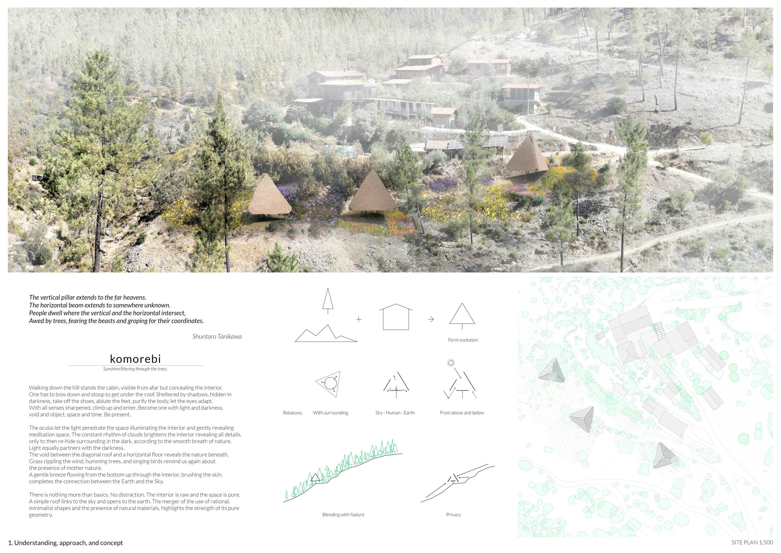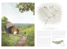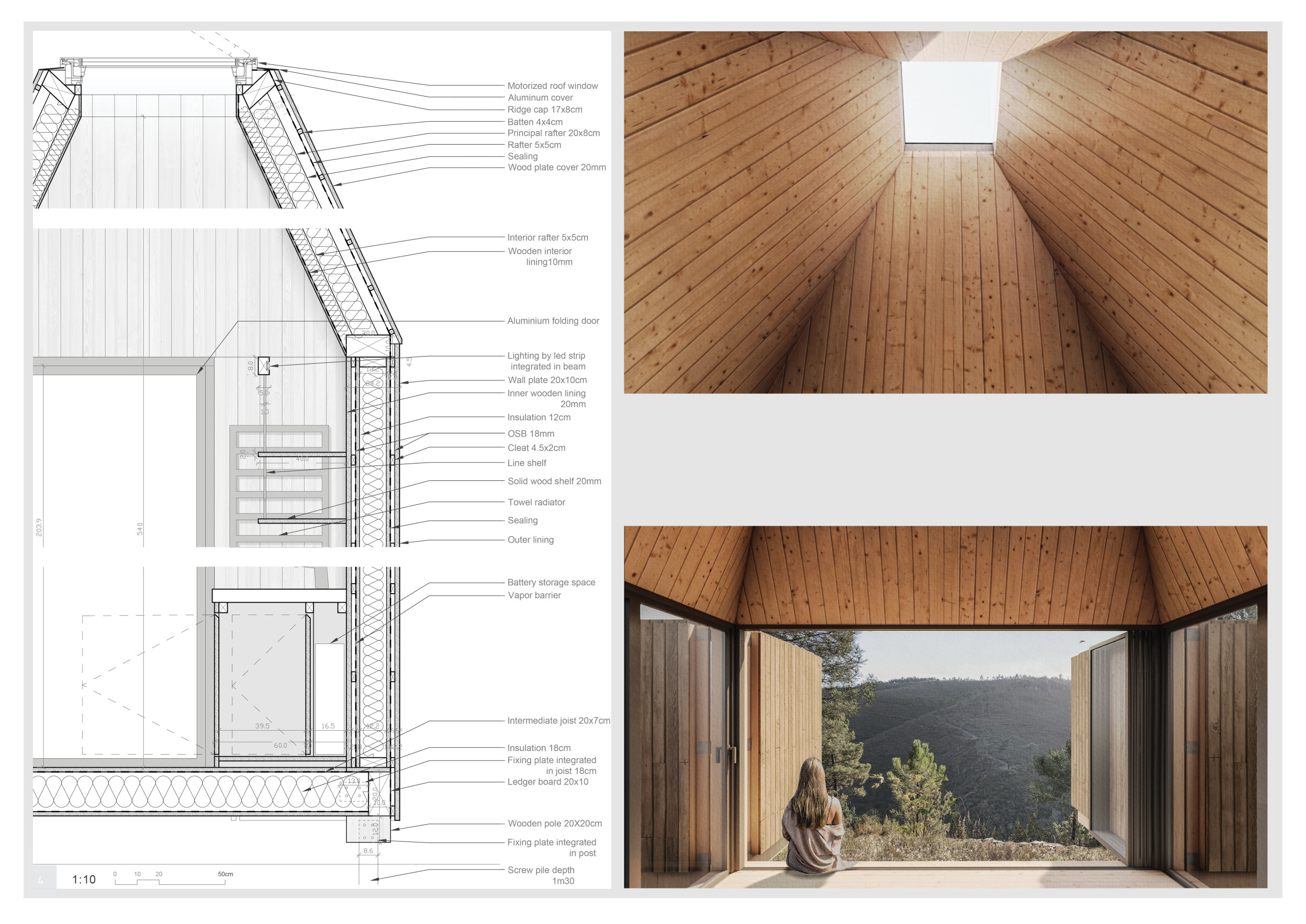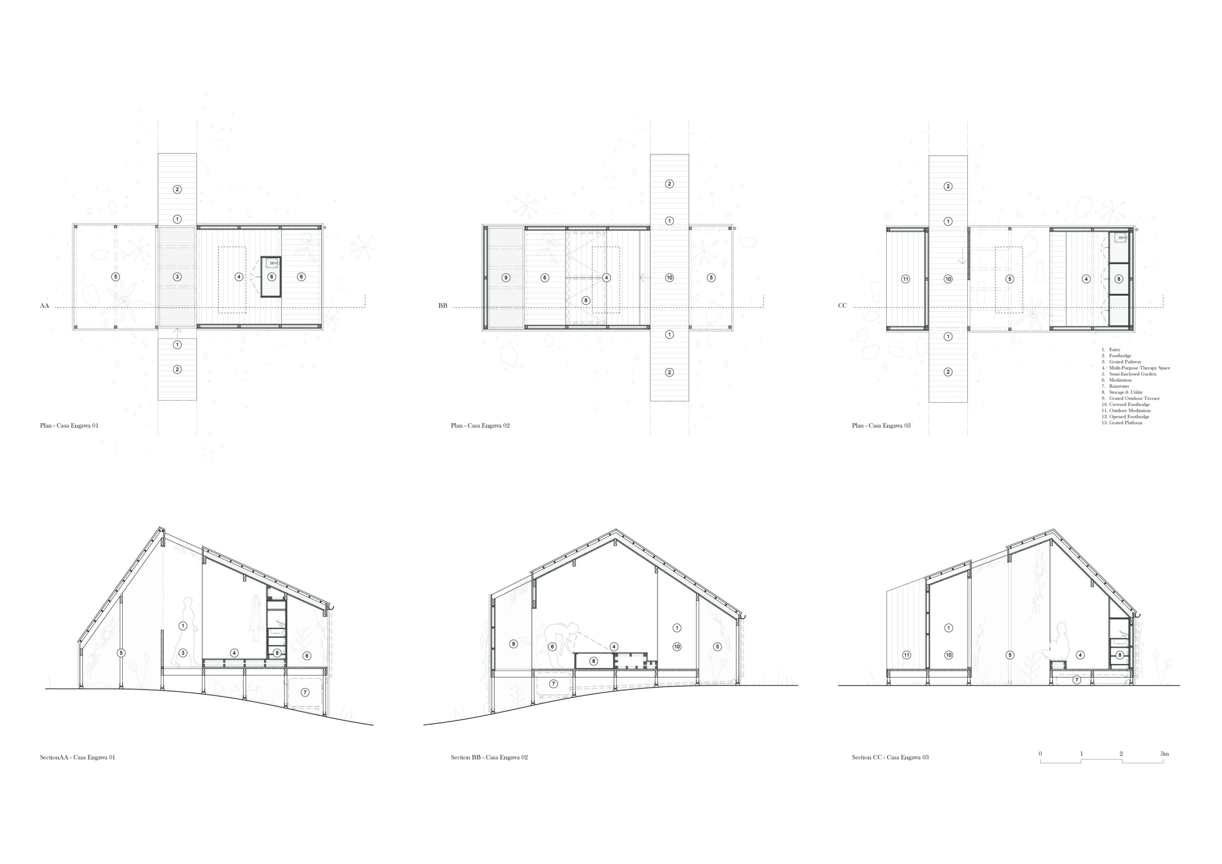 Participants were tasked here with submitting designs for a replicable ‘cabin’ for guest treatments and meditation sessions. The cabin is to be a space that allows guests to connect with the surrounding forest and gardens as part of a meditative and personal experience. Each cabin should provide sufficient space for one guest and one therapist.
