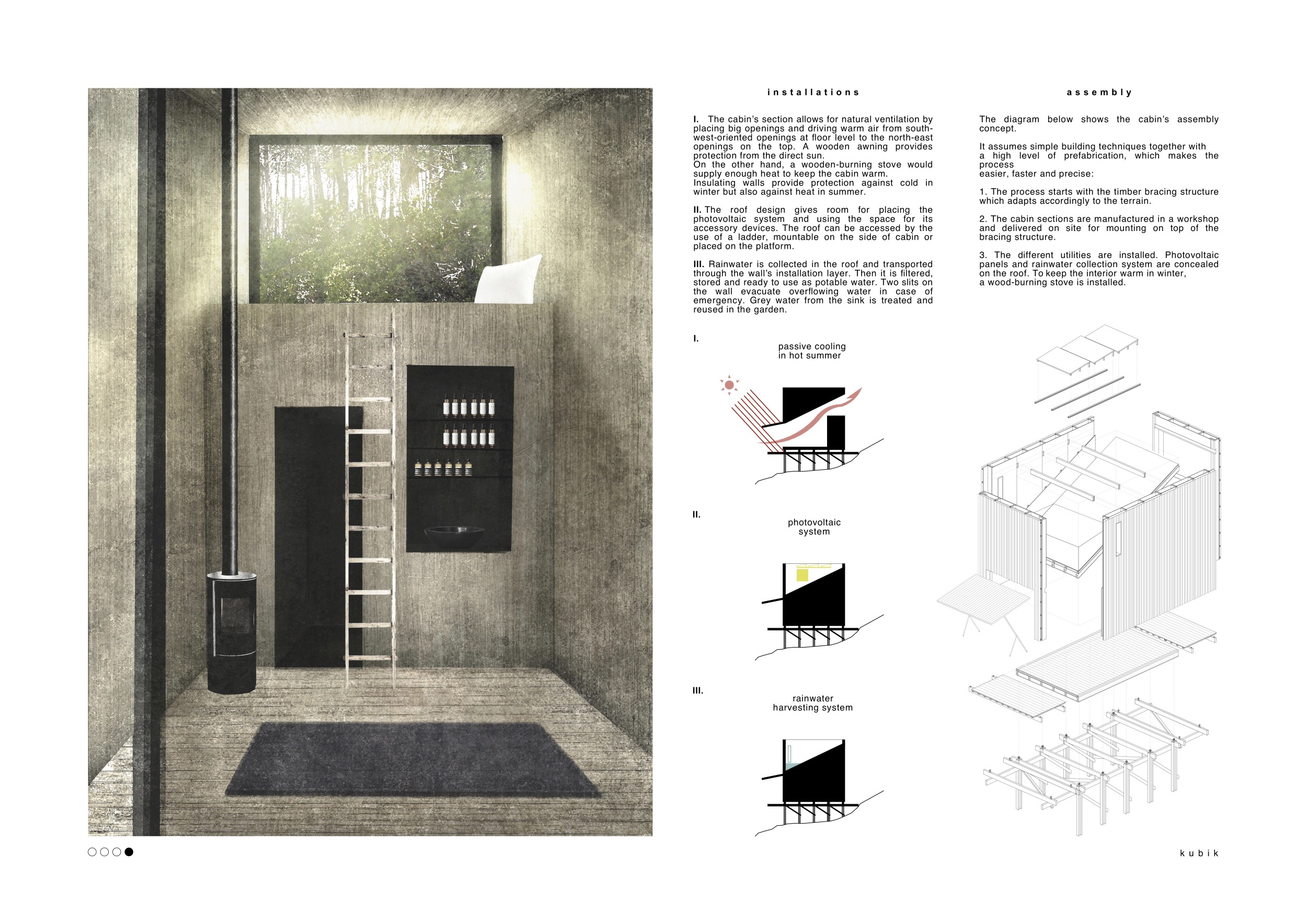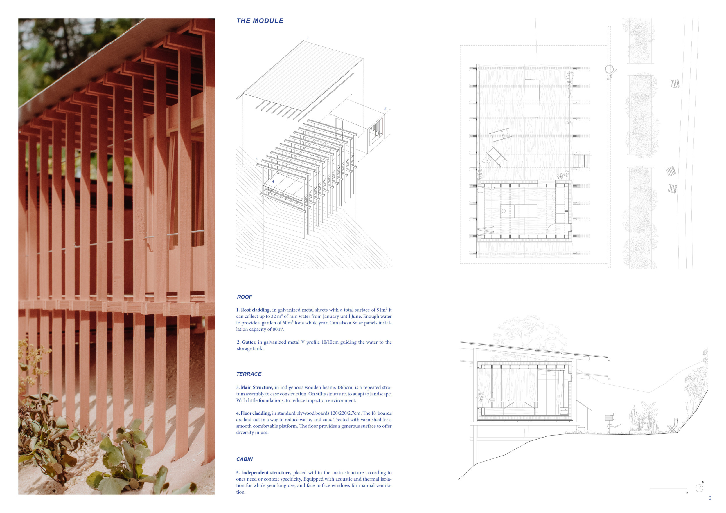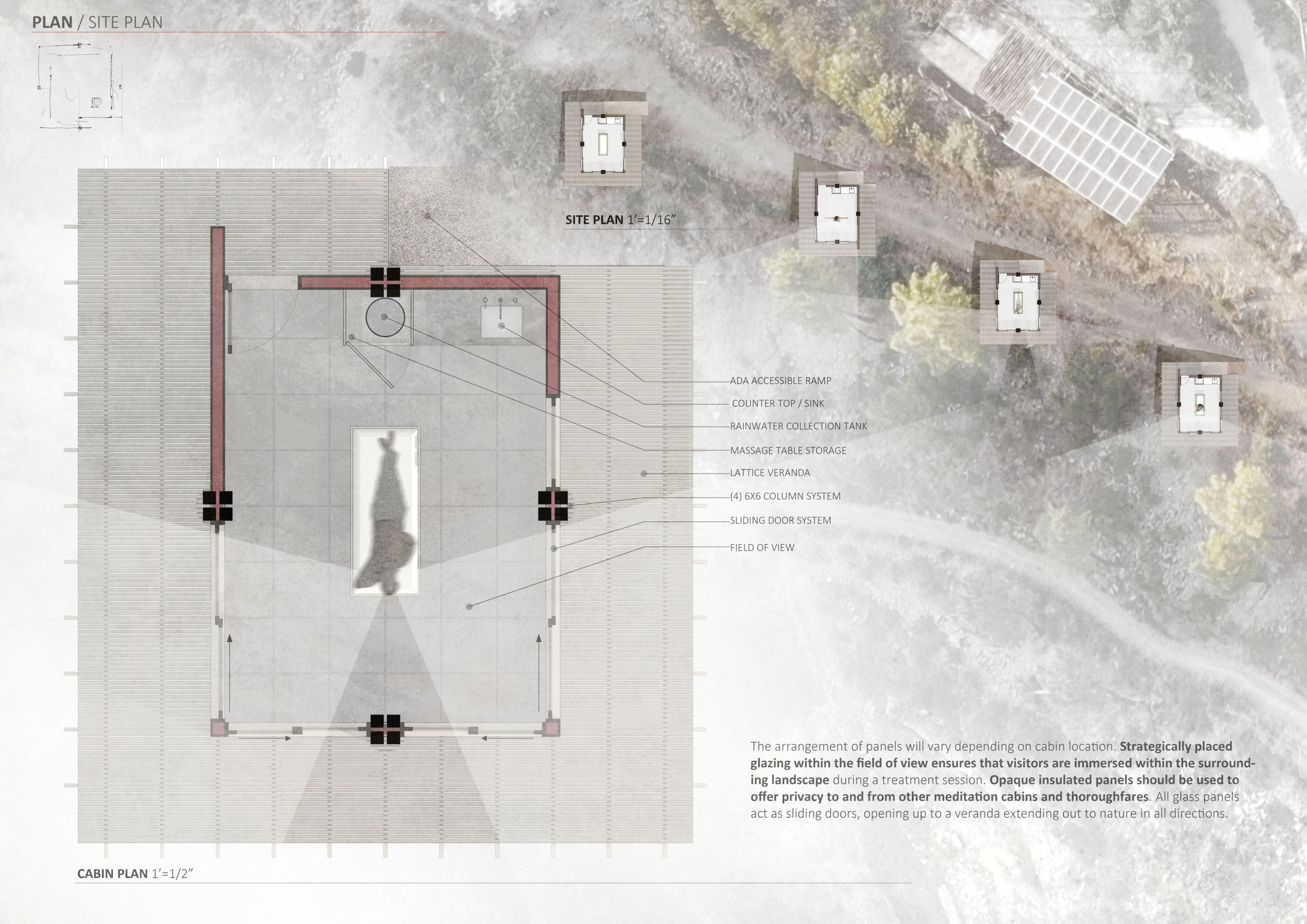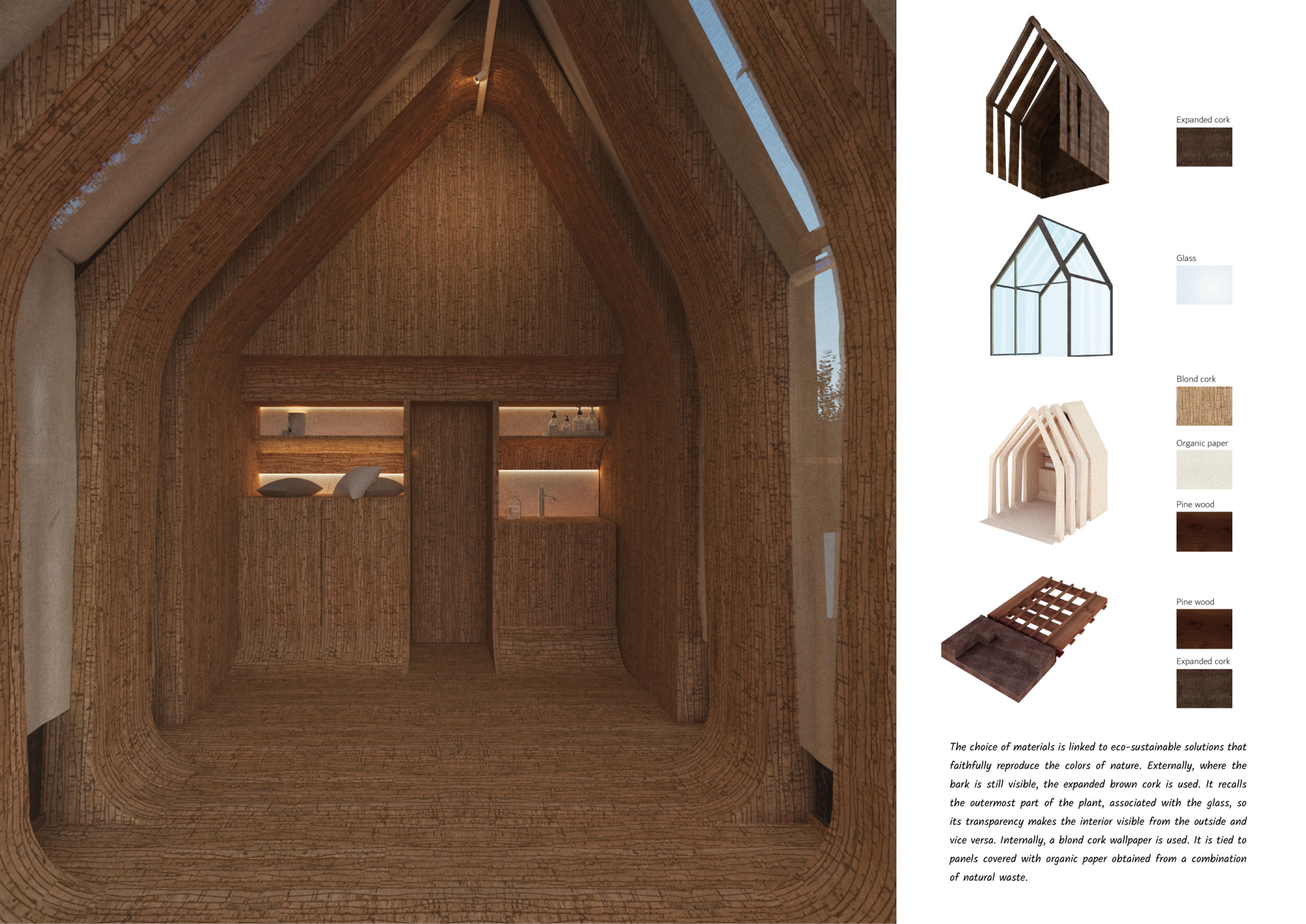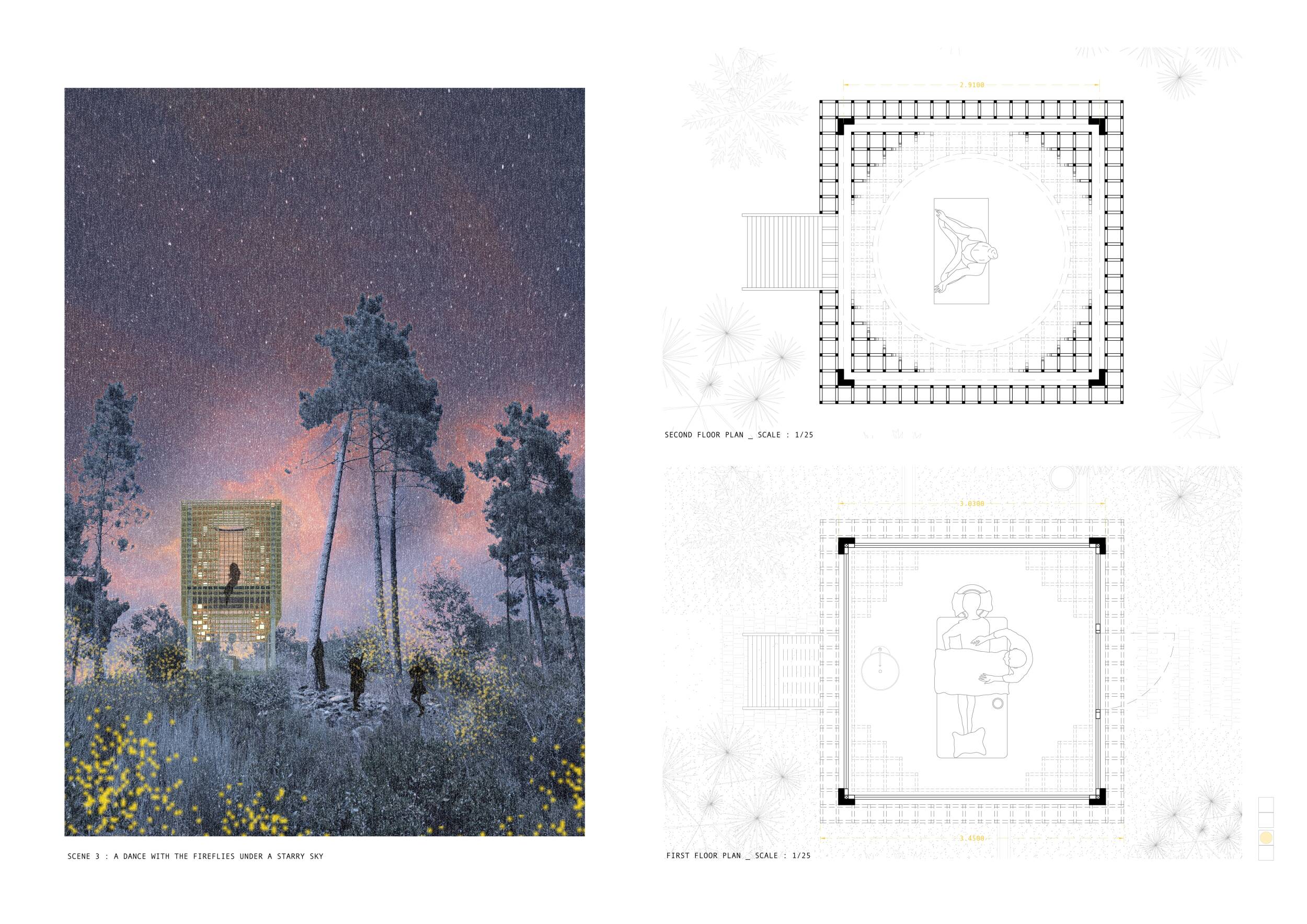 Participants were tasked here with submitting designs for a replicable ‘cabin’ for guest treatments and meditation sessions. The cabin is to be a space that allows guests to connect with the surrounding forest and gardens as part of a meditative and personal experience. Each cabin should provide sufficient space for one guest and one therapist.