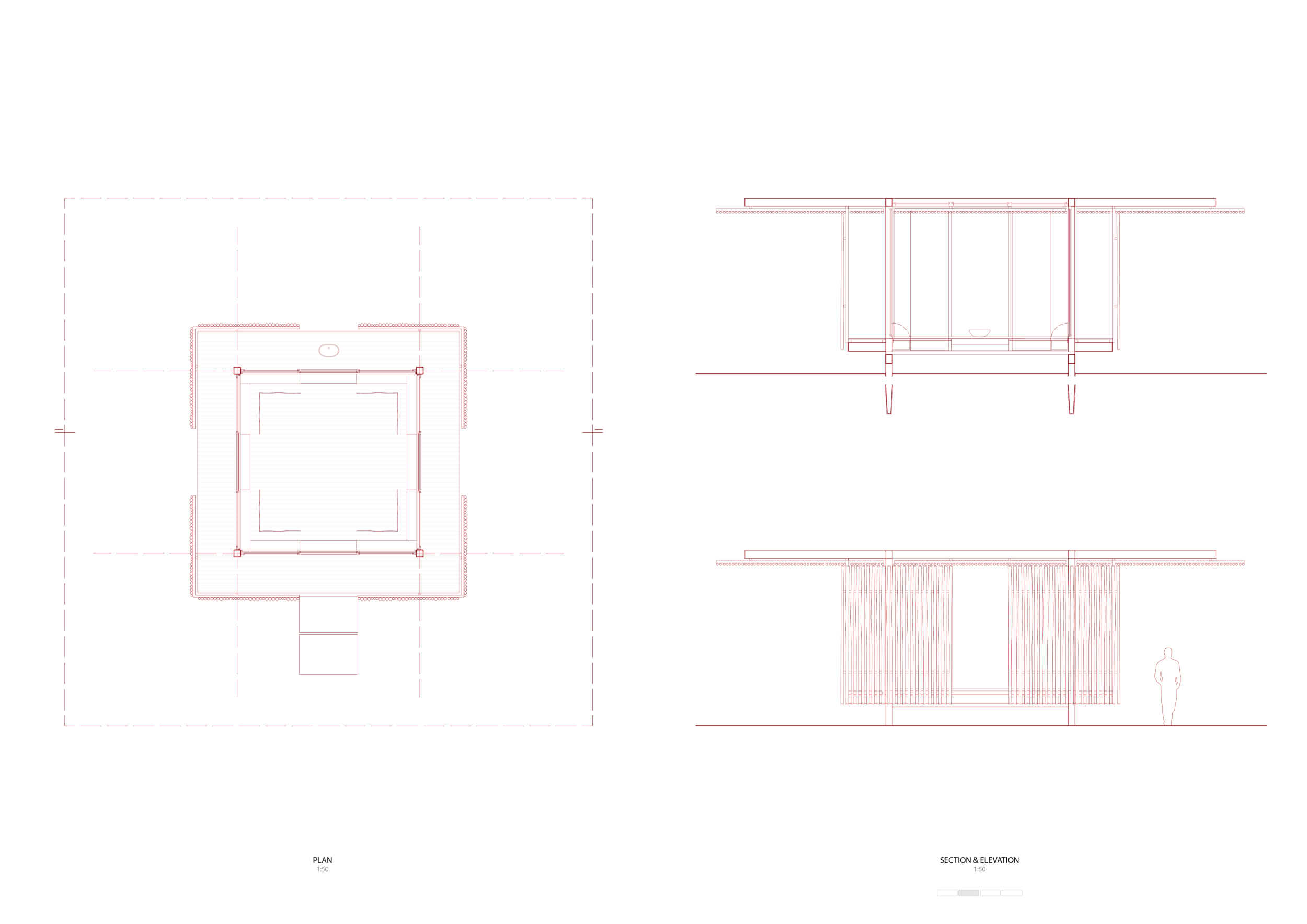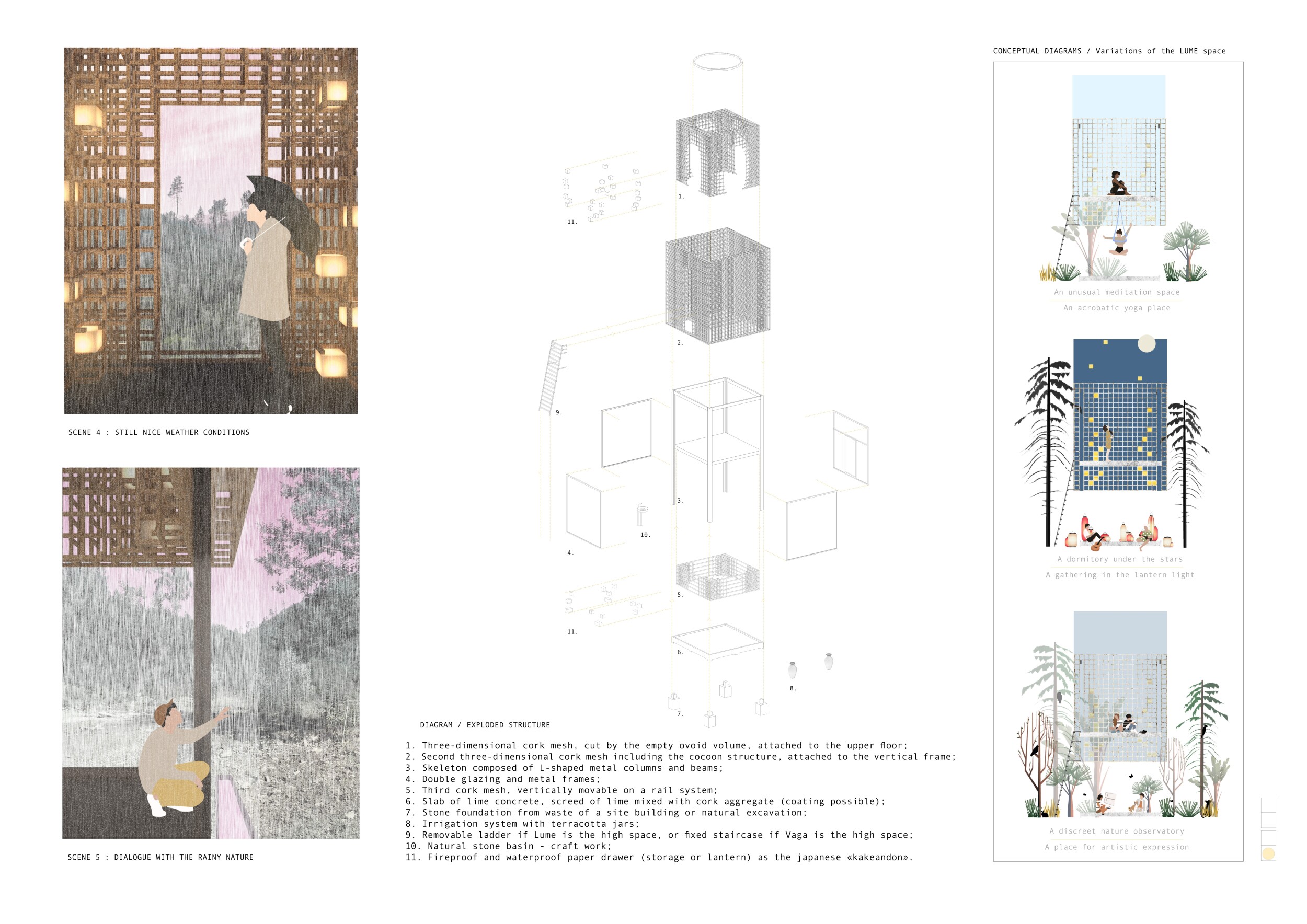 This winning project consists of two stacked 2.9-meter cubes: at the ground level, a glass-enclosed therapy space, just large enough to house a massage table; and above, an open-air meditation space within a dense lattice of cork. The lattice structure is accessed by a ladder and supports a constellation of paper lanterns, in the vein of the japanese ‘kake-andon’.