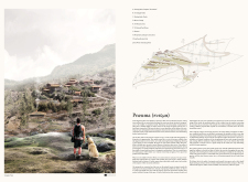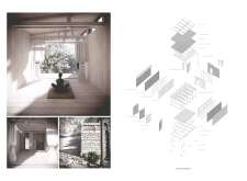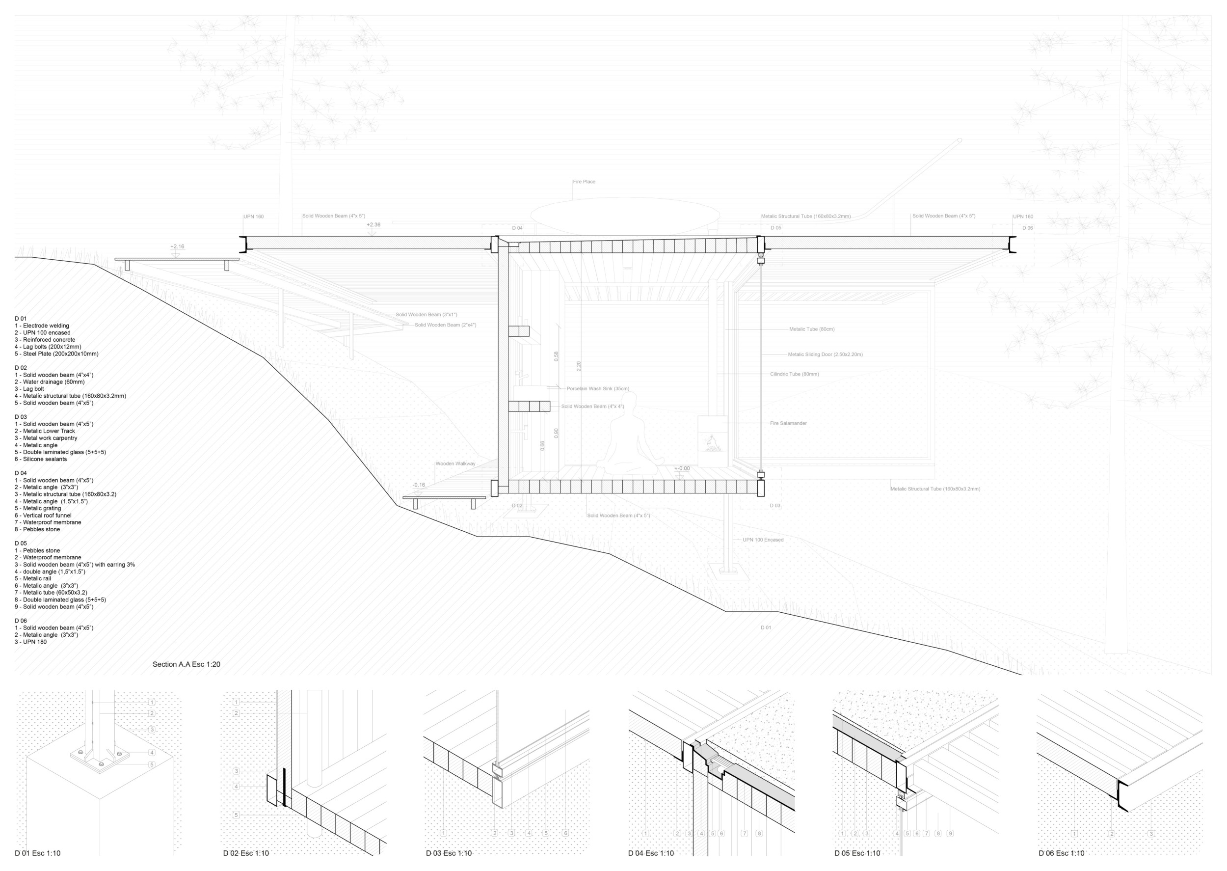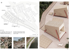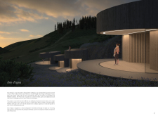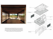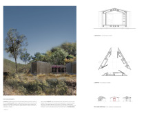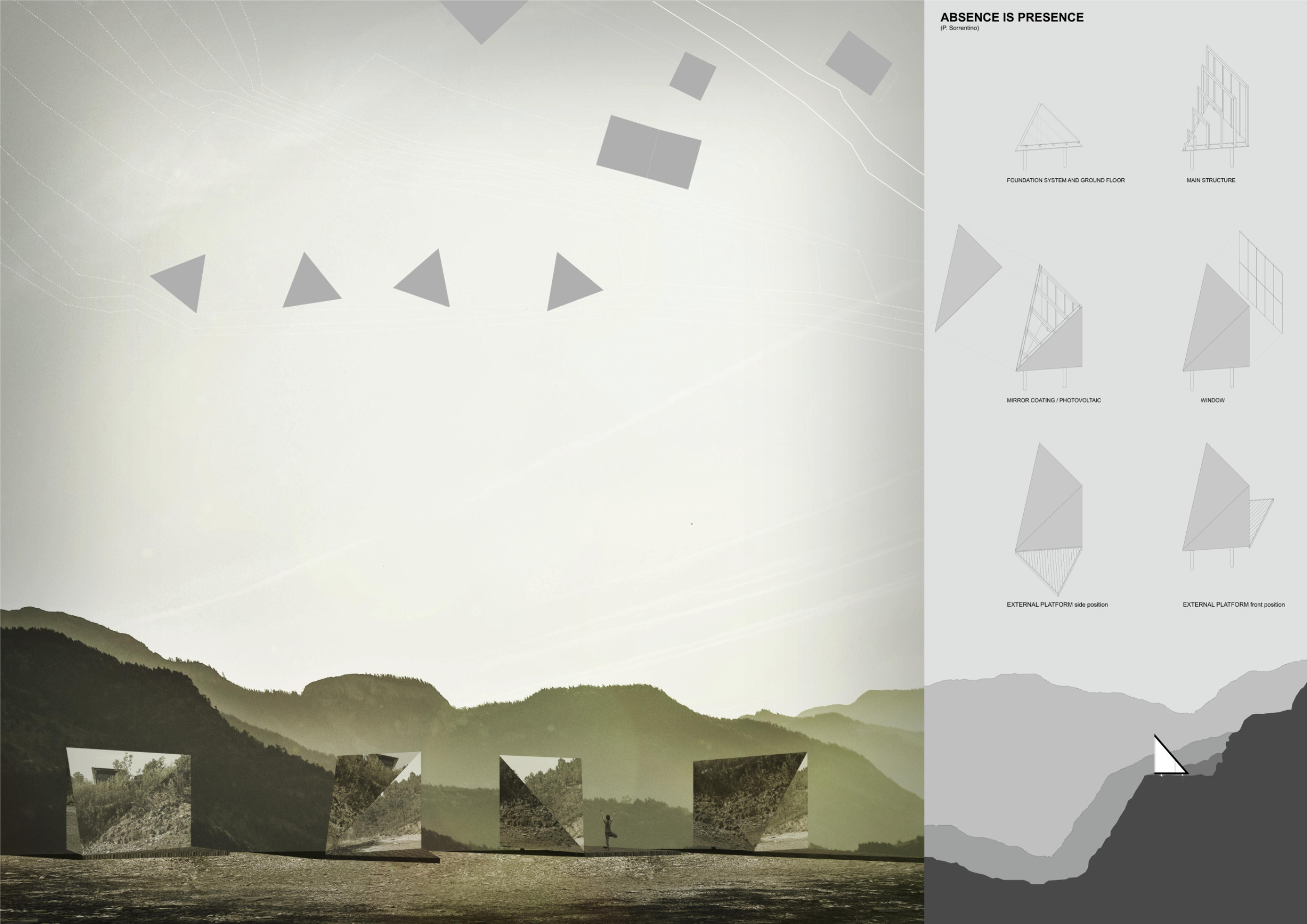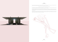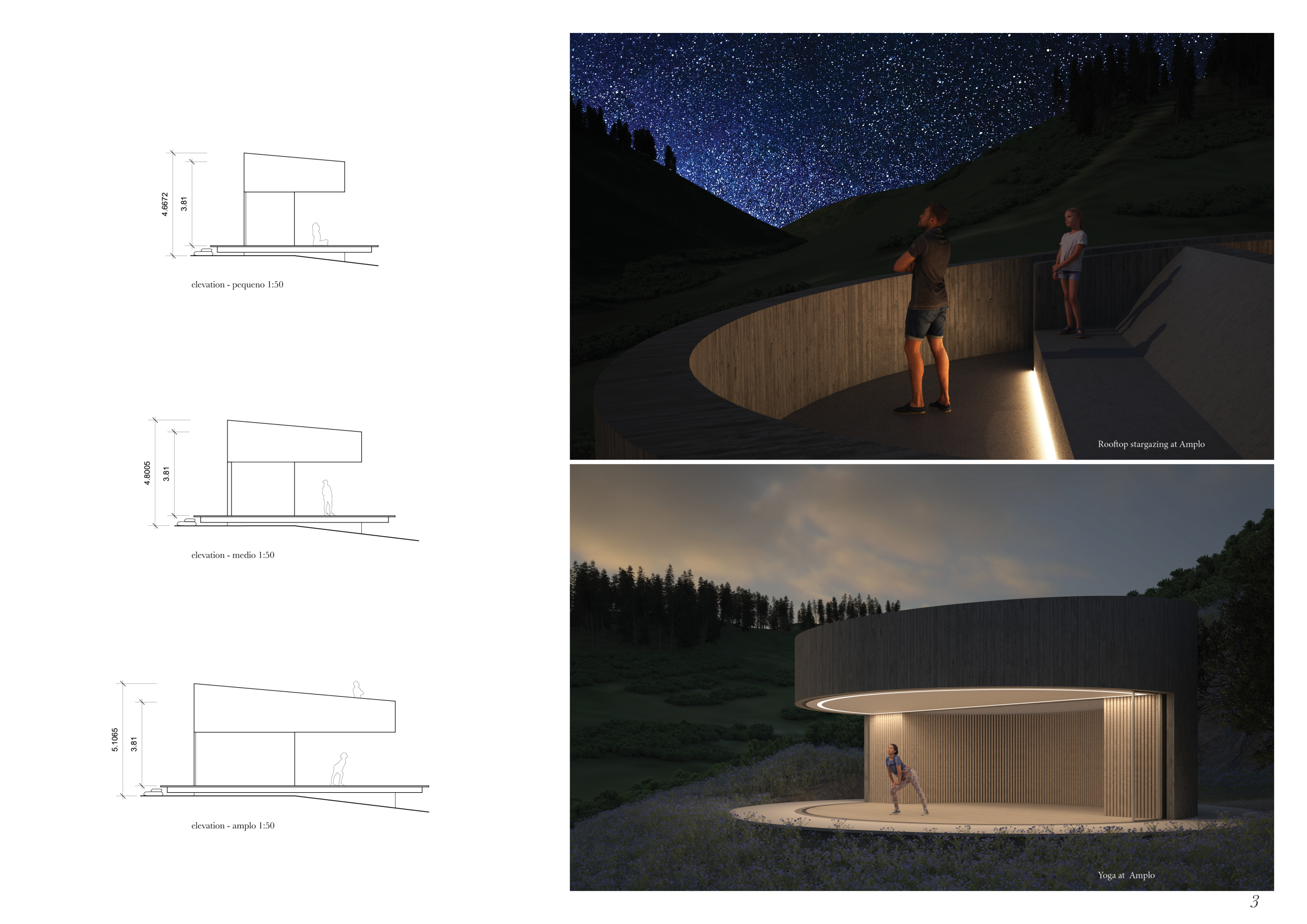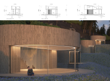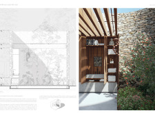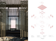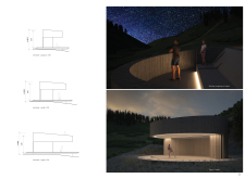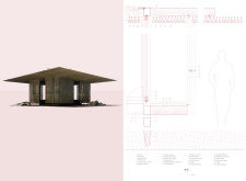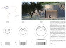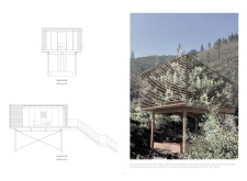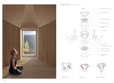 The project is a successful exploration in form. A circular platform topped by a three-sided, fragmented, and pyramidal roof supported by a wood frame. The jury writes: “The project establishes a very interesting relationship with the environment, and it manages to convey the sense of spirituality and tranquility.