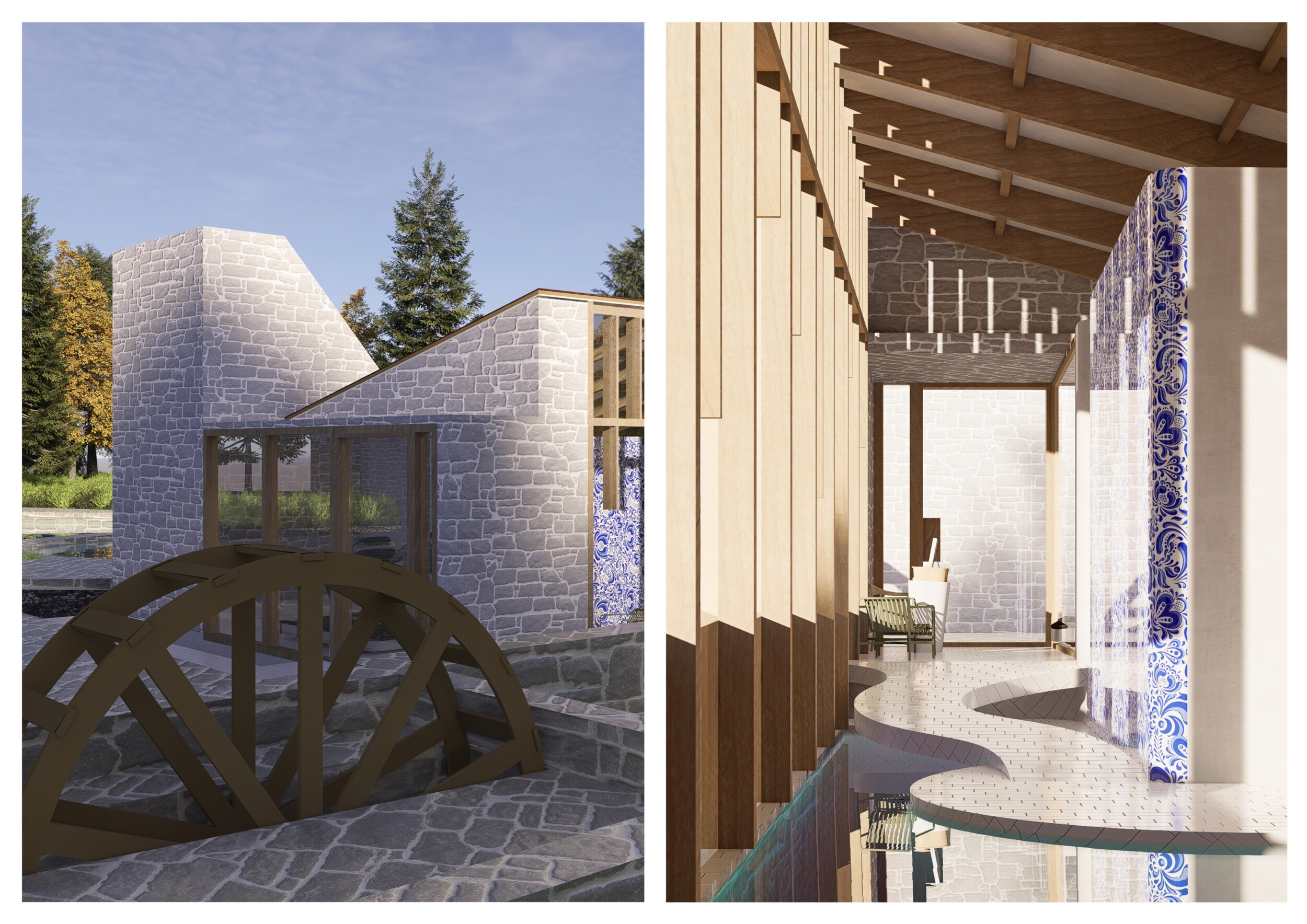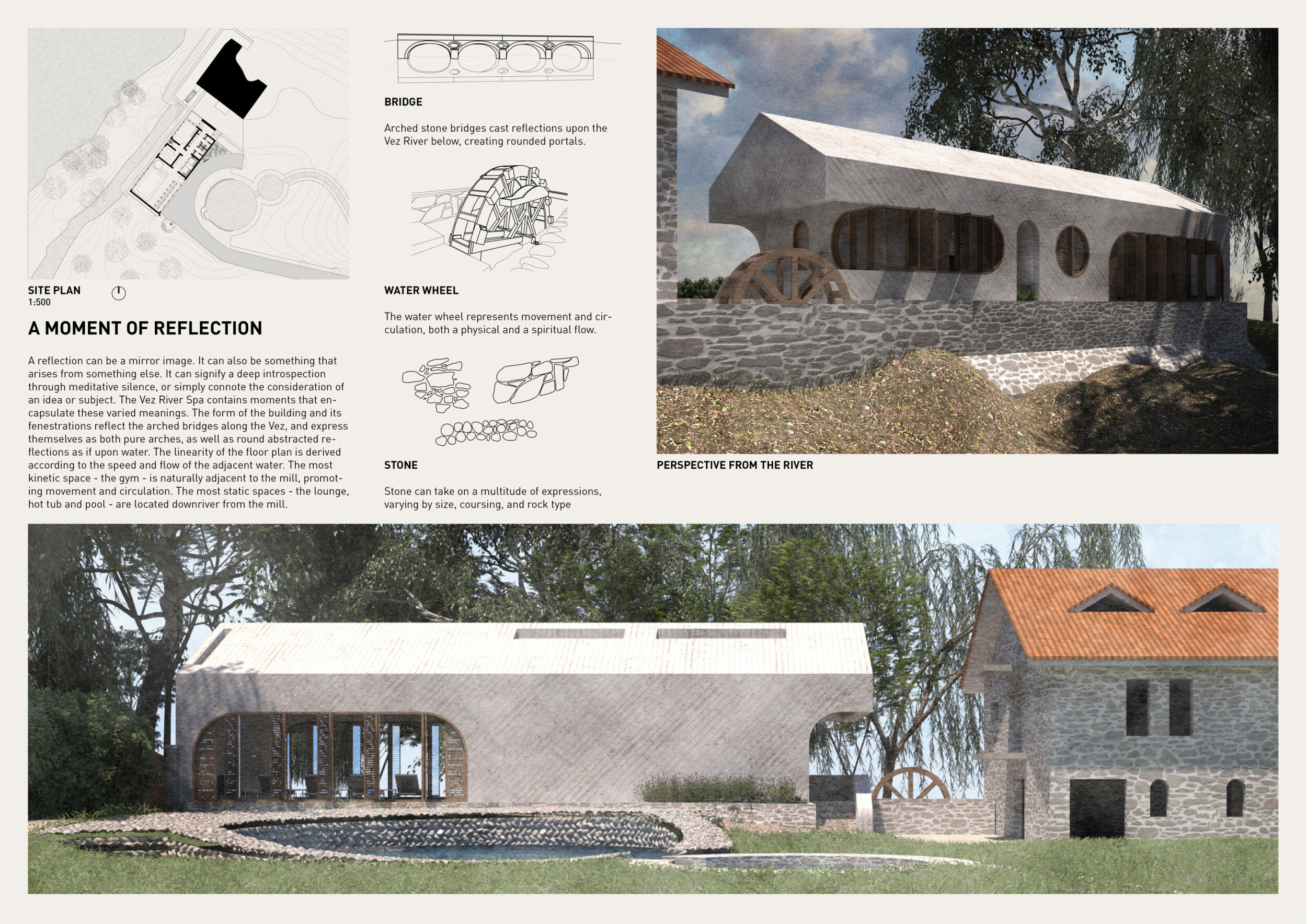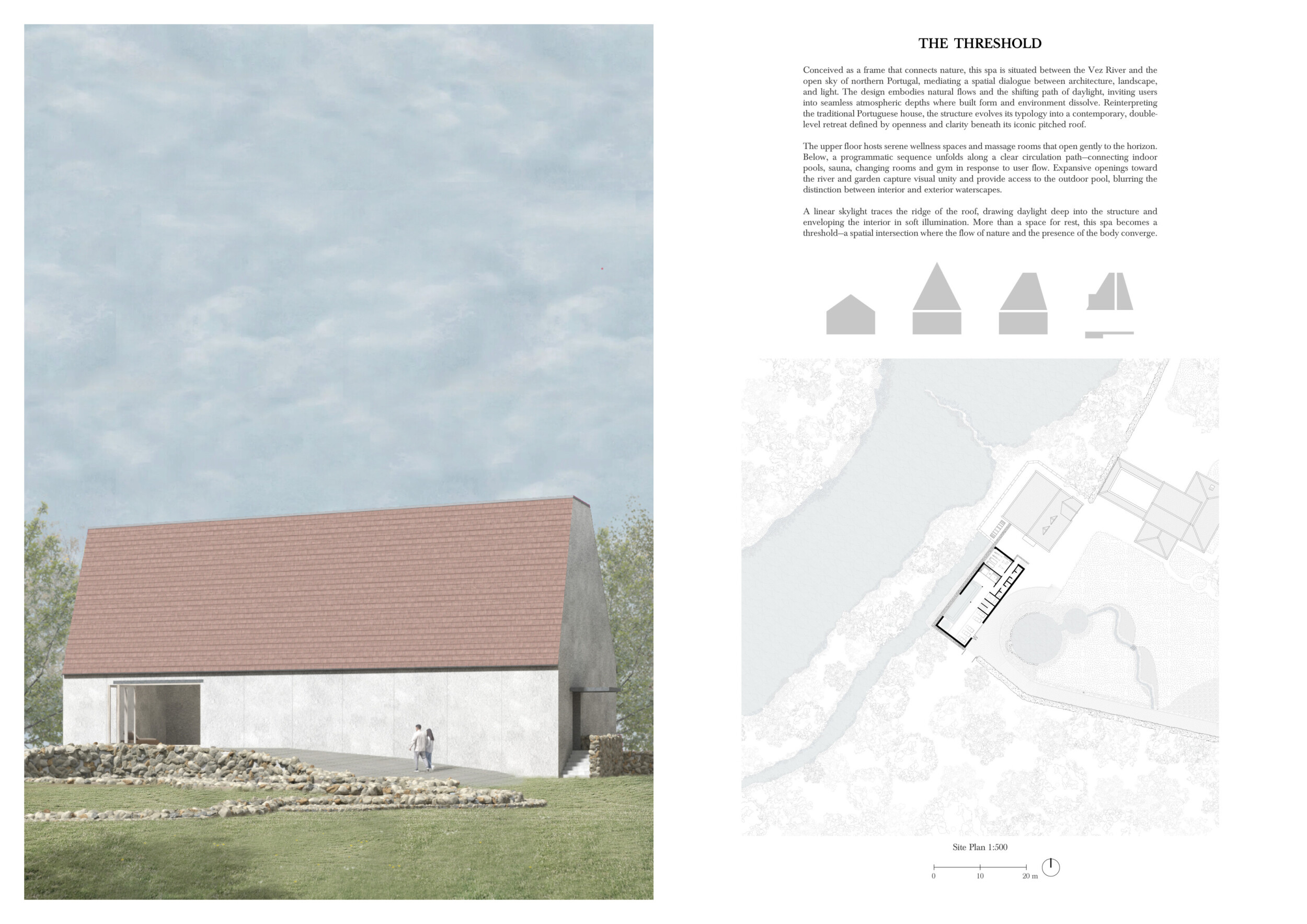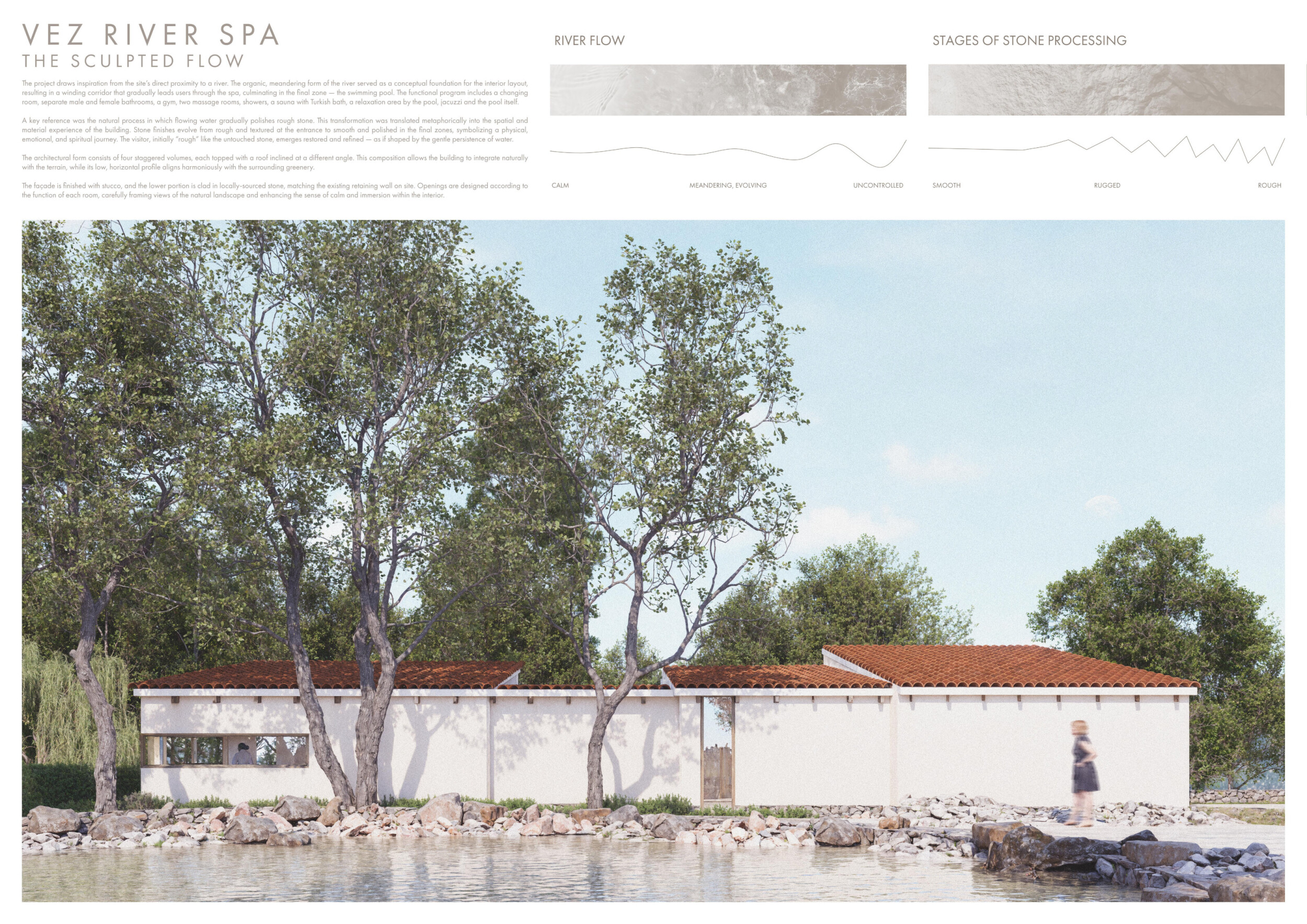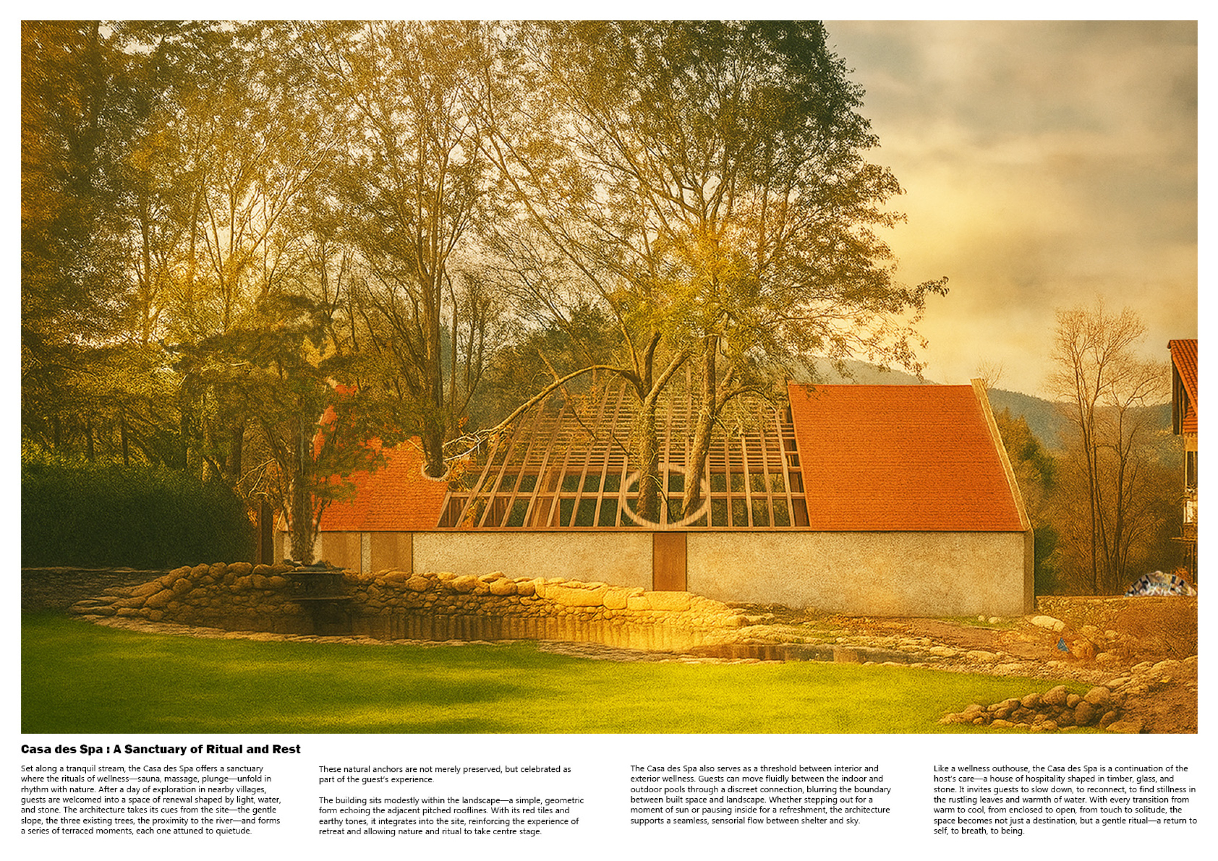 This project presents a bathhouse designed as a sequence of atmospheric, elemental experiences deeply rooted in place. Organized around a linear axis that runs parallel to a river, the architecture draws from vernacular cues — pitched roofs, stone walls, and terracotta tiles — to form a quiet yet immersive world.