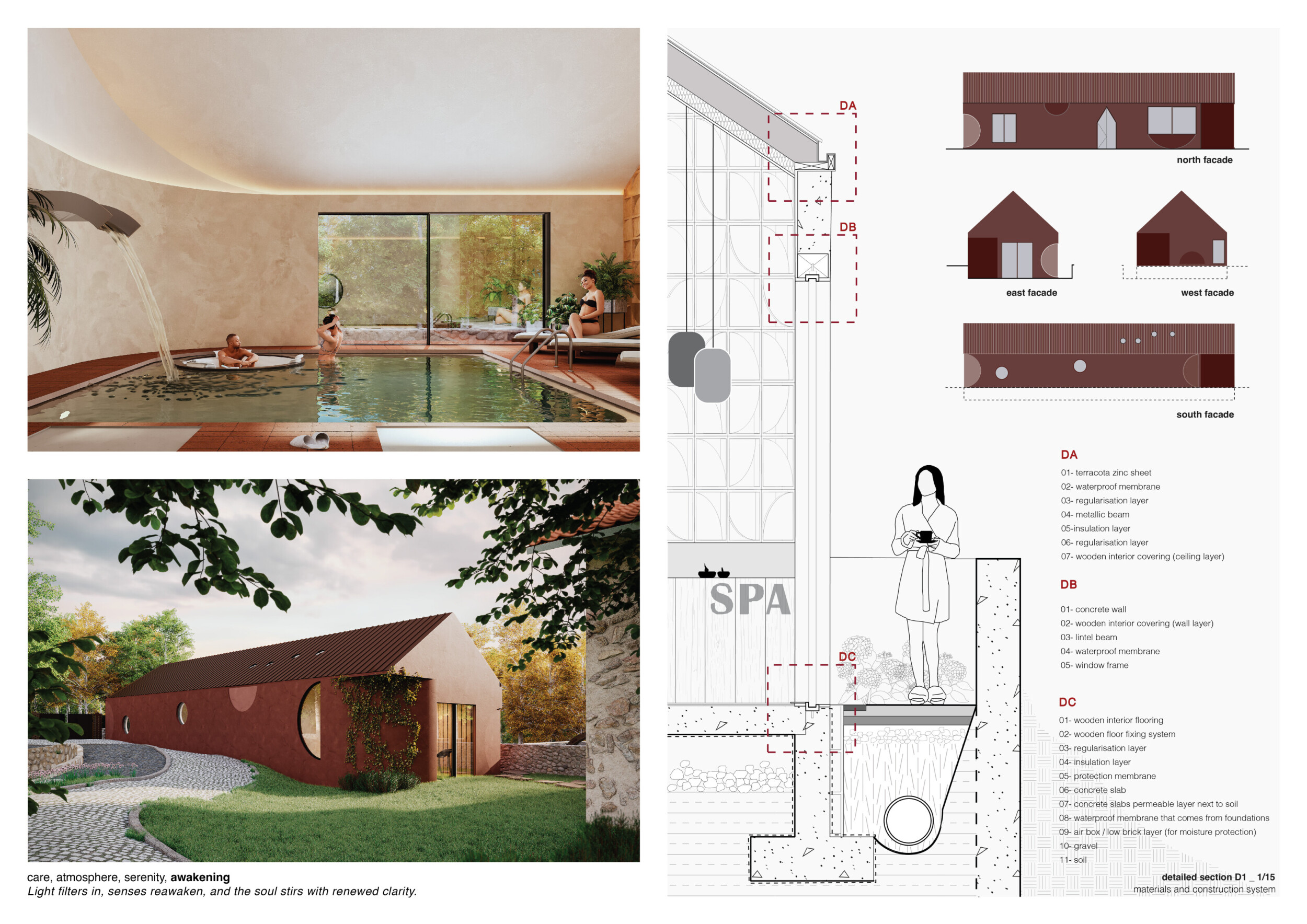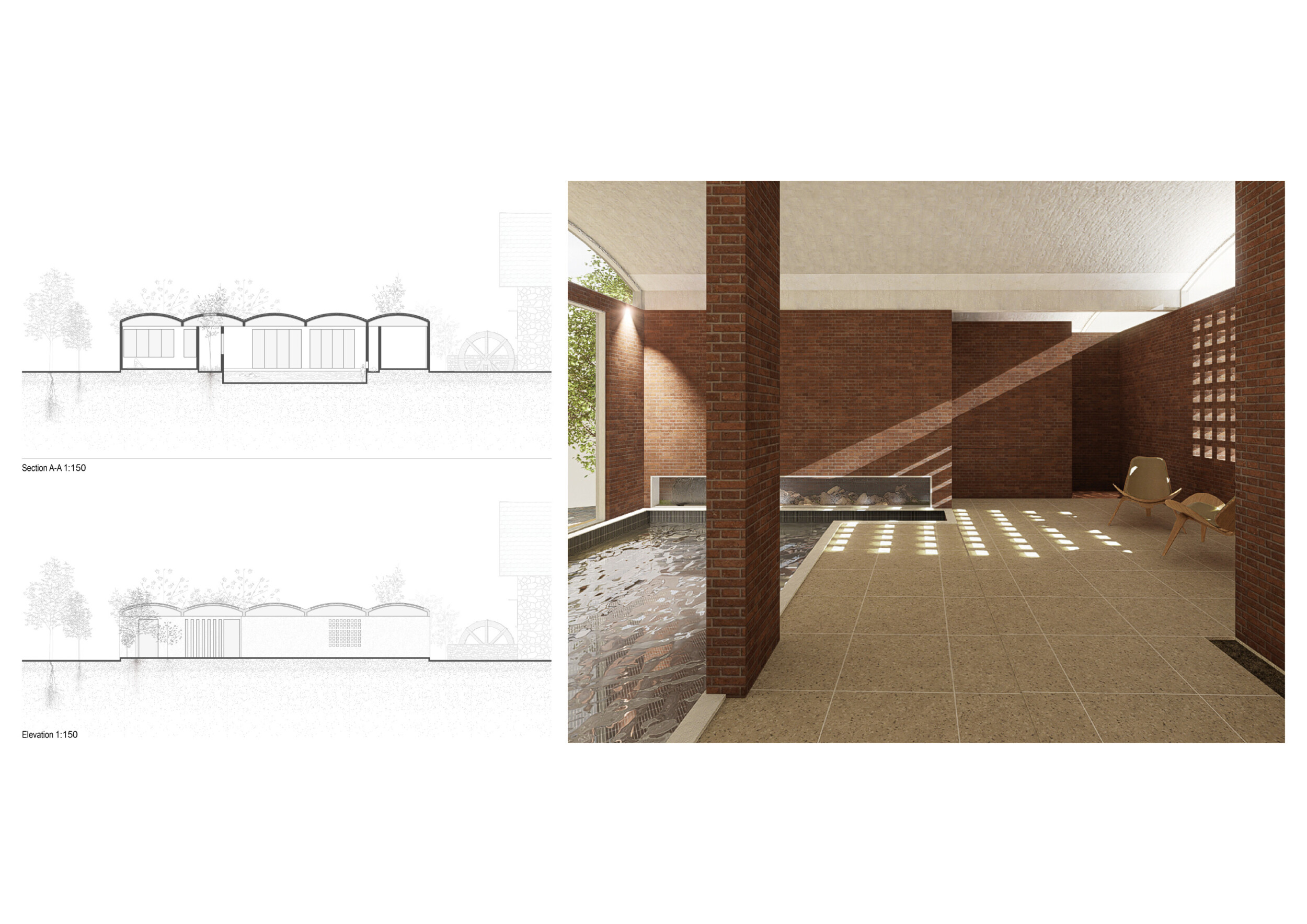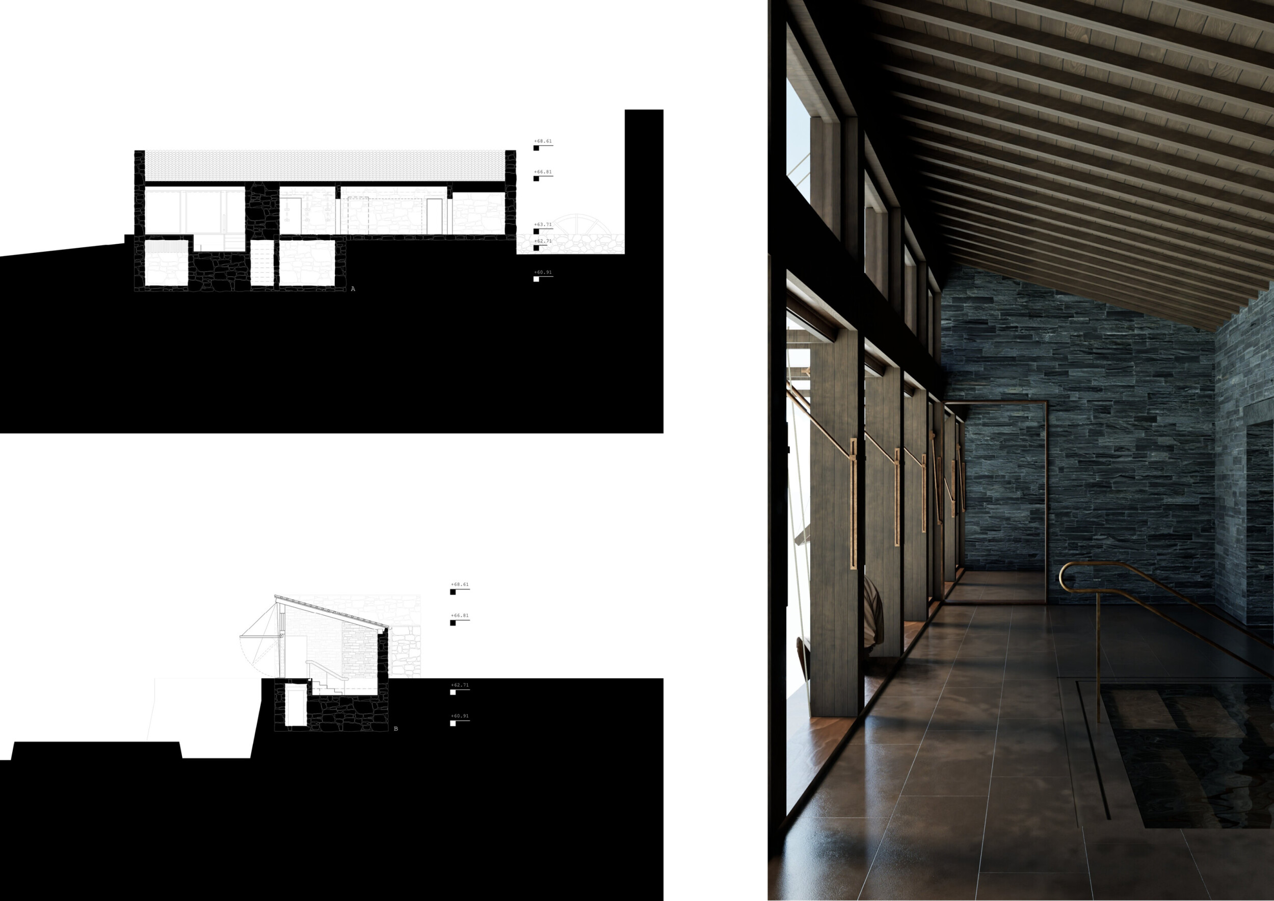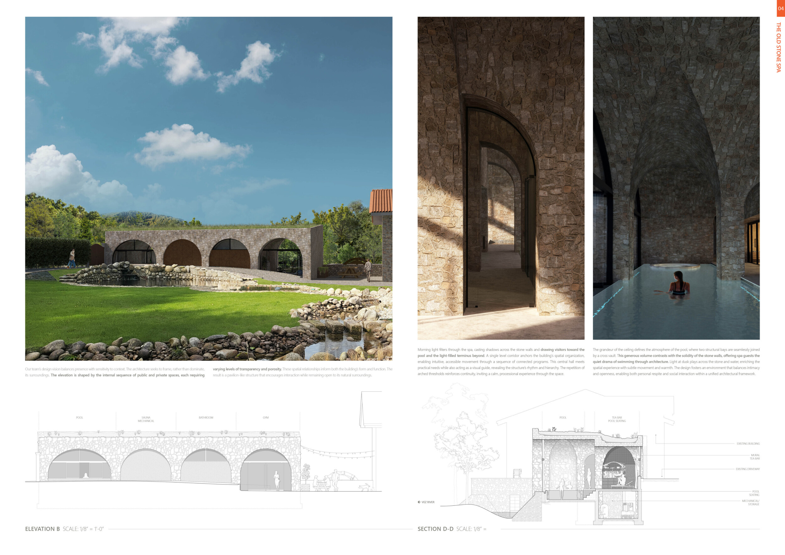 This project presents a bathhouse designed as a sequence of atmospheric, elemental experiences deeply rooted in place. Organized around a linear axis that runs parallel to a river, the architecture draws from vernacular cues — pitched roofs, stone walls, and terracotta tiles — to form a quiet yet immersive world.