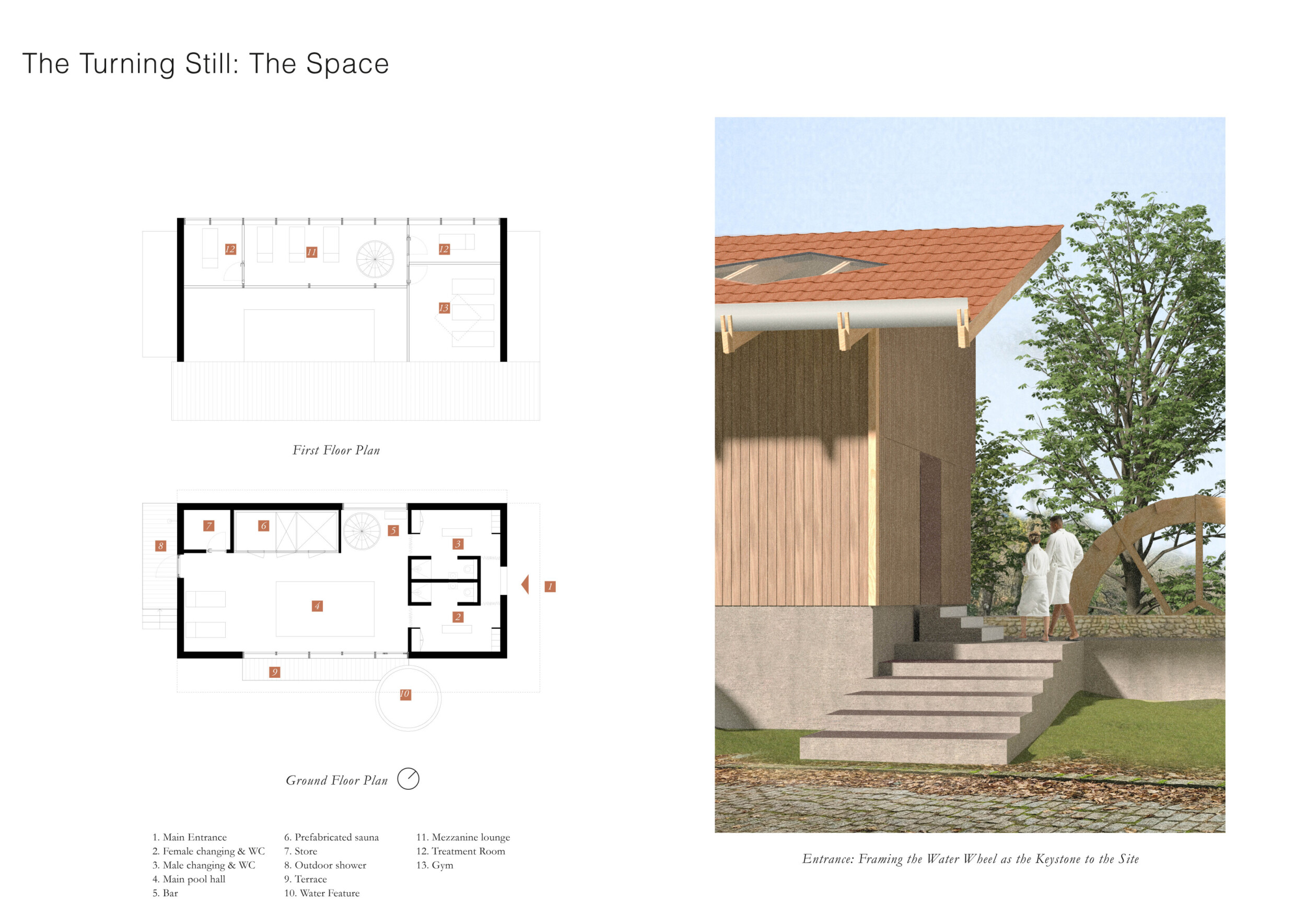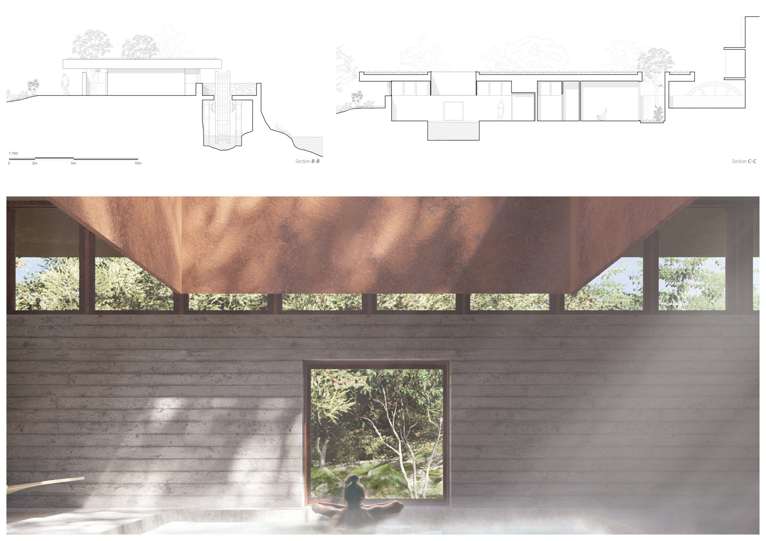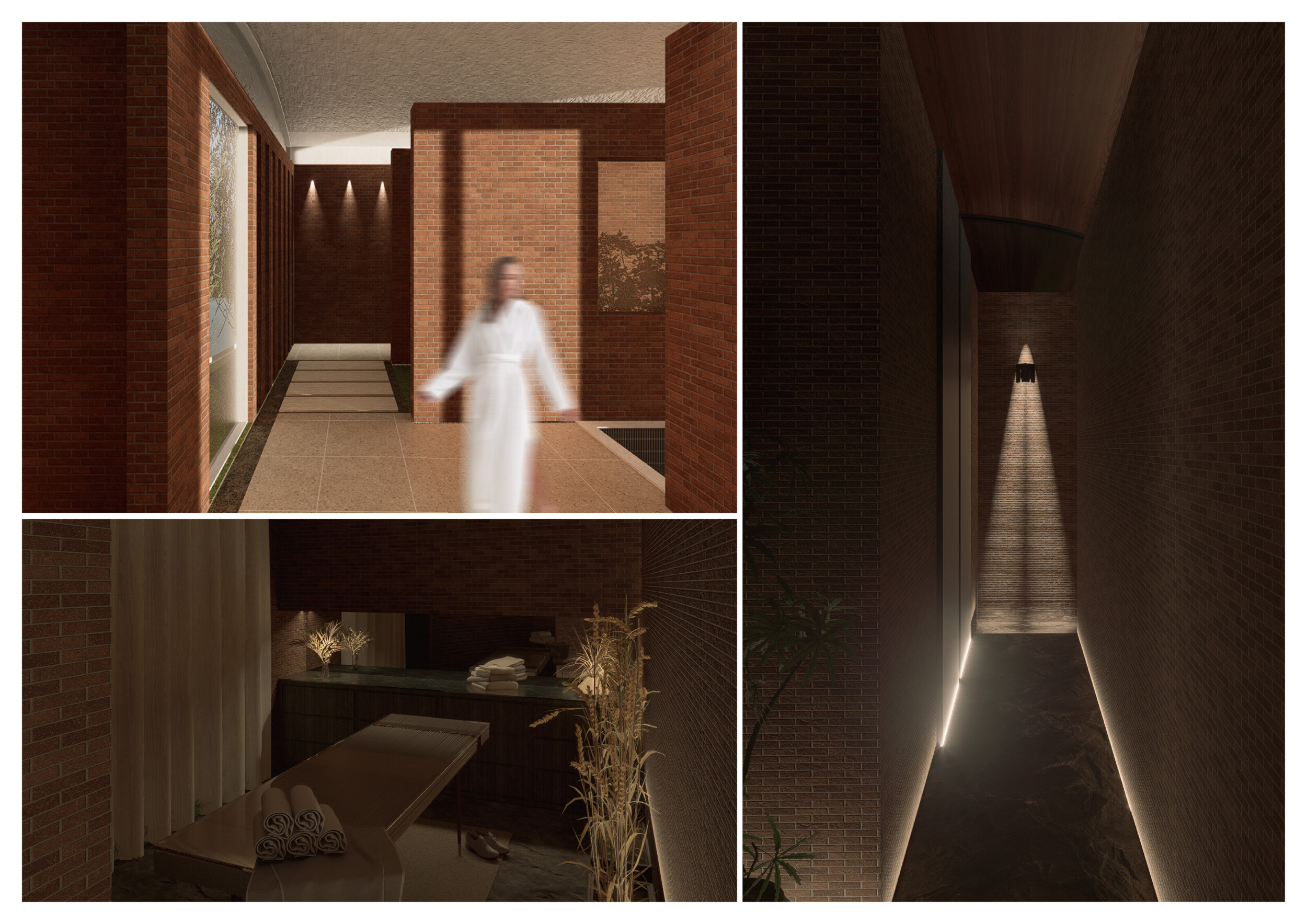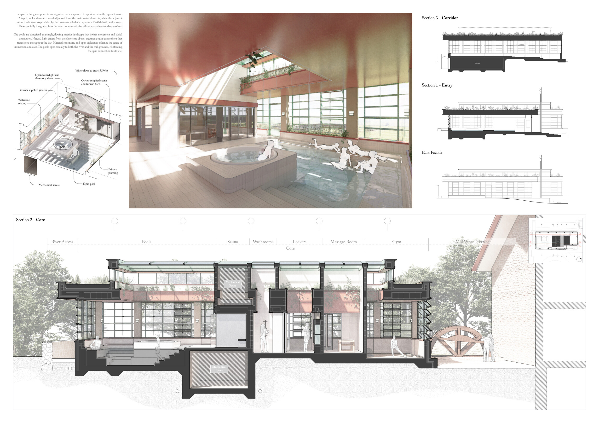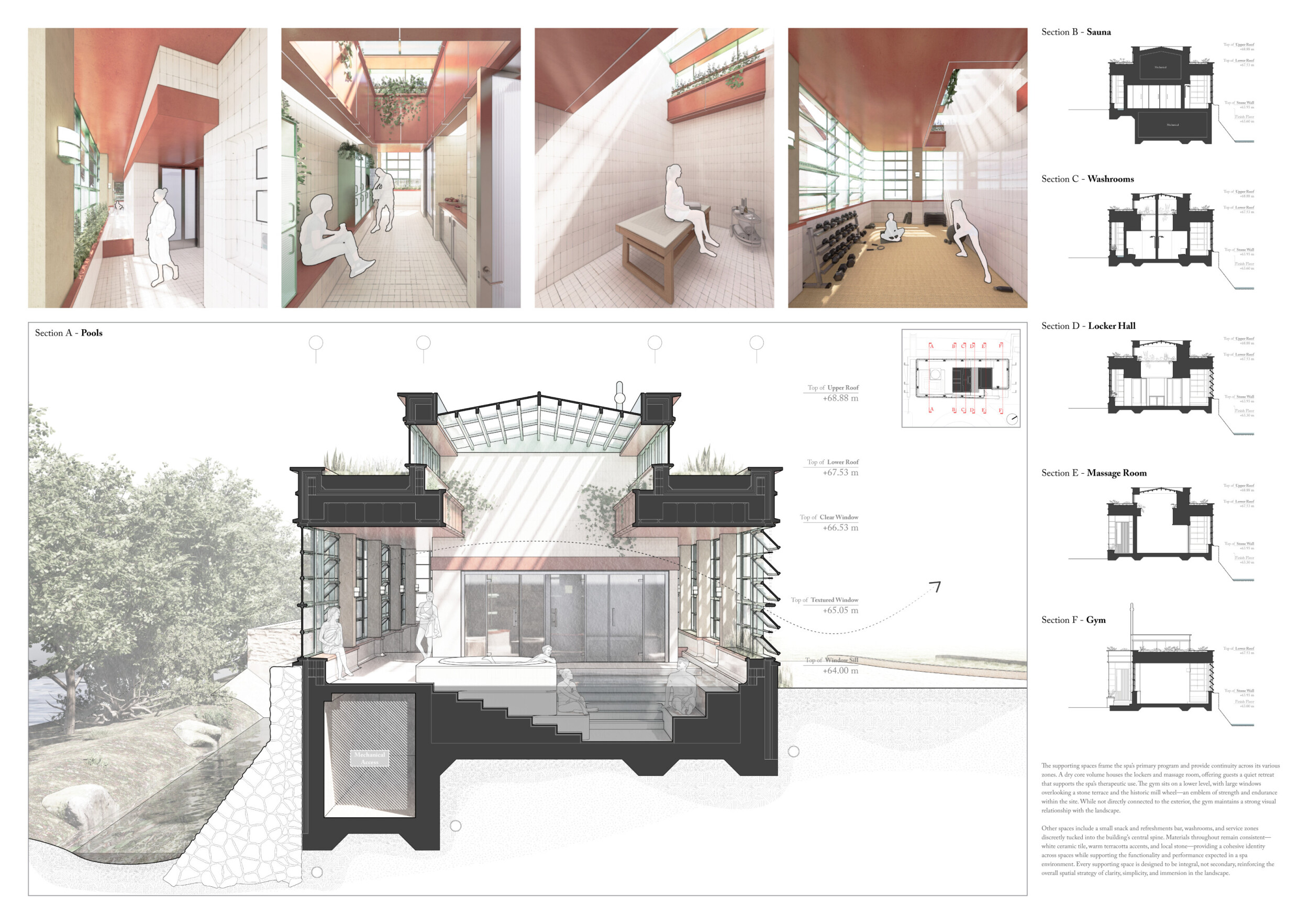 This project presents a bathhouse designed as a sequence of atmospheric, elemental experiences deeply rooted in place. Organized around a linear axis that runs parallel to a river, the architecture draws from vernacular cues — pitched roofs, stone walls, and terracotta tiles — to form a quiet yet immersive world.
