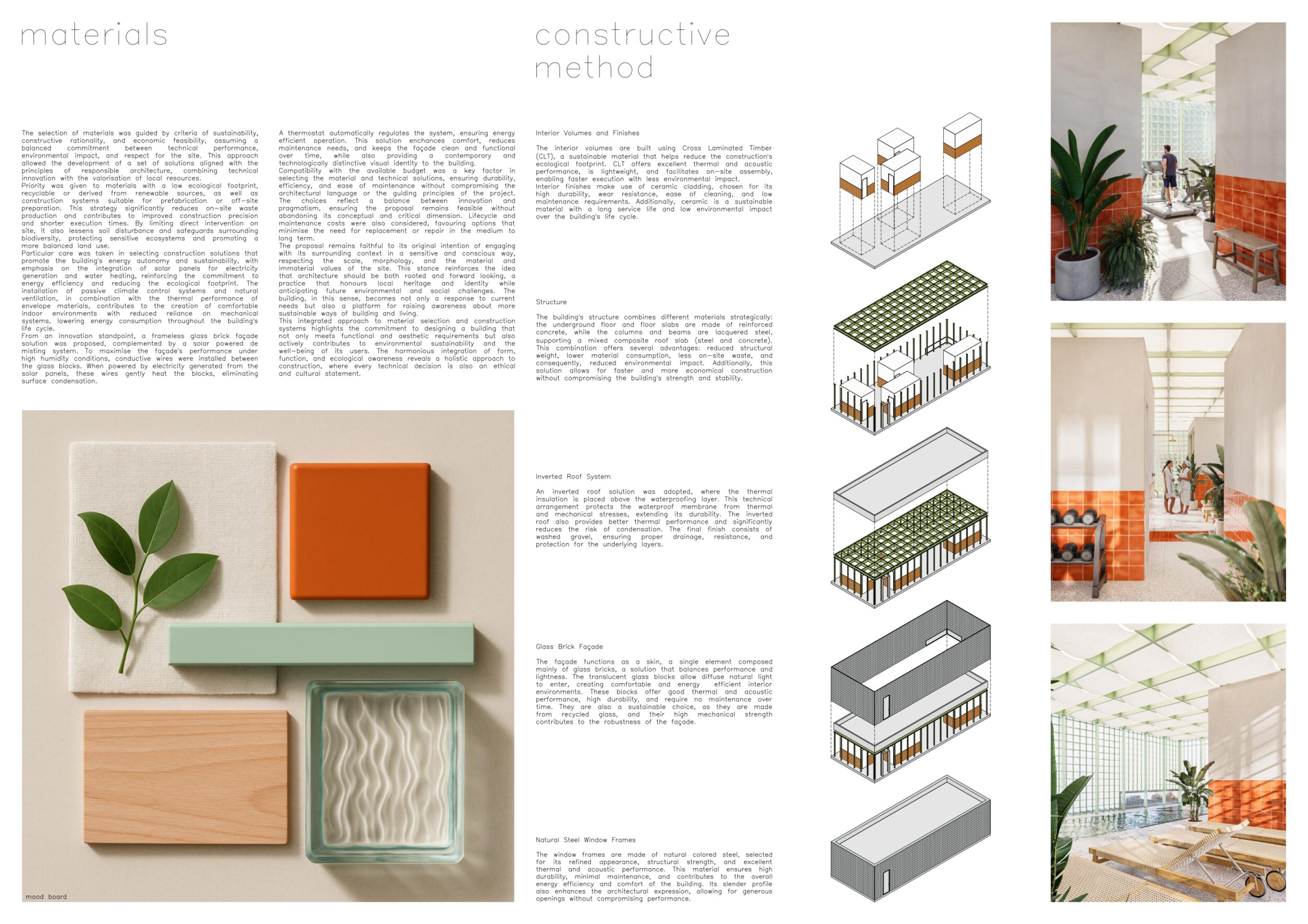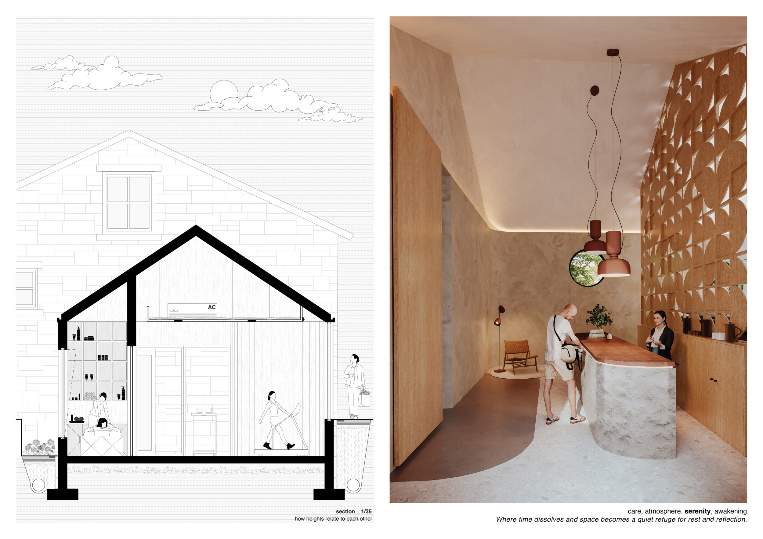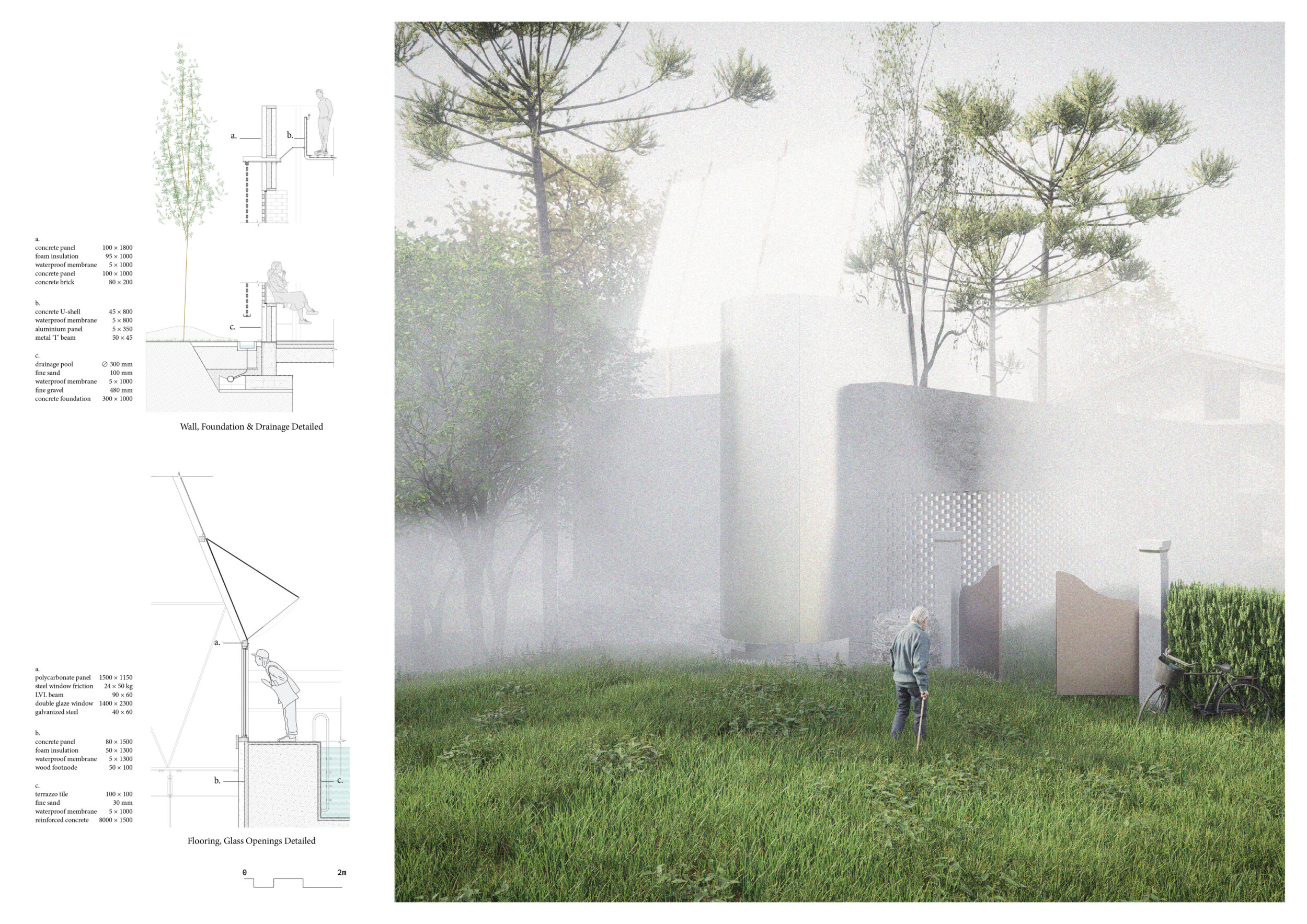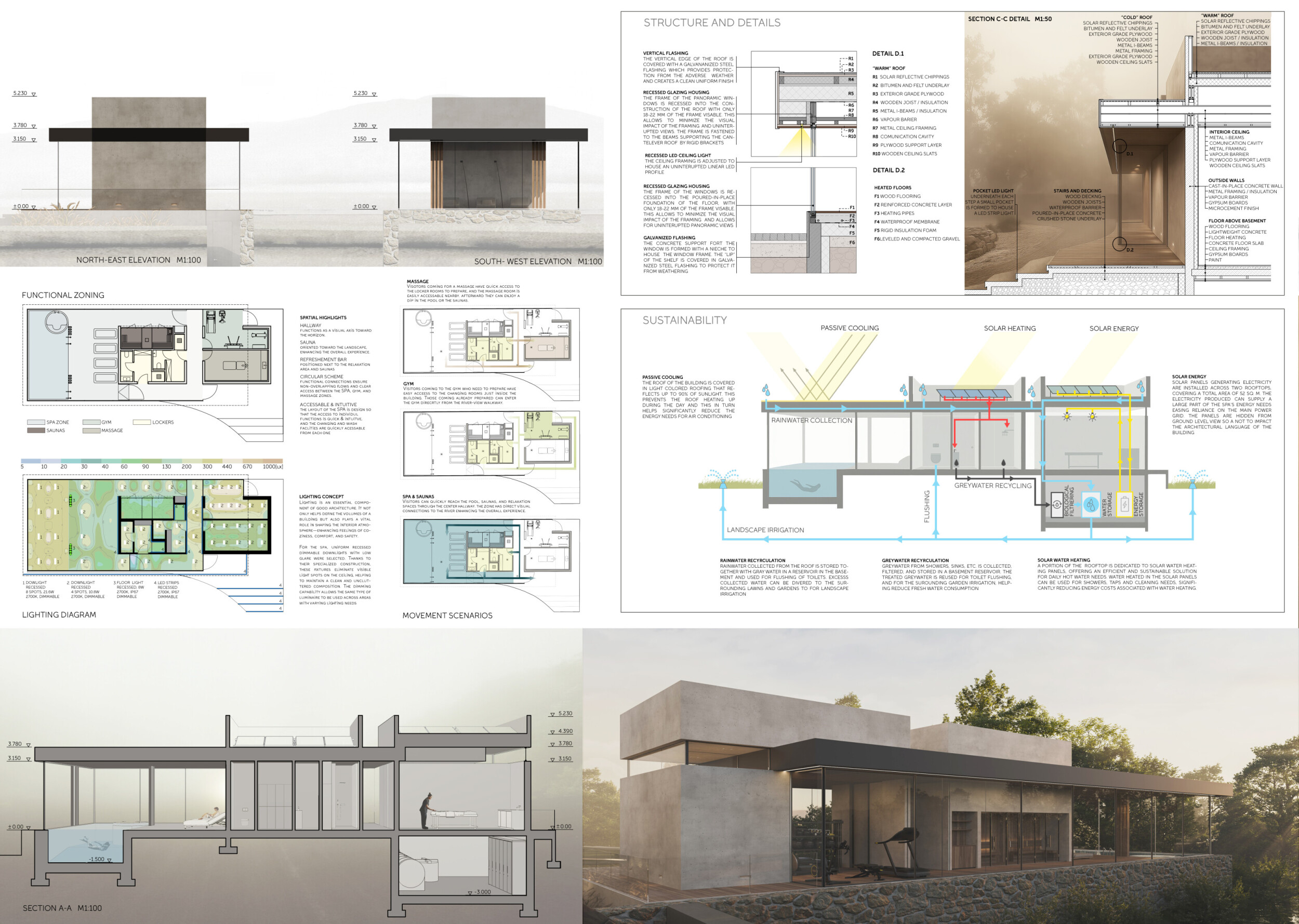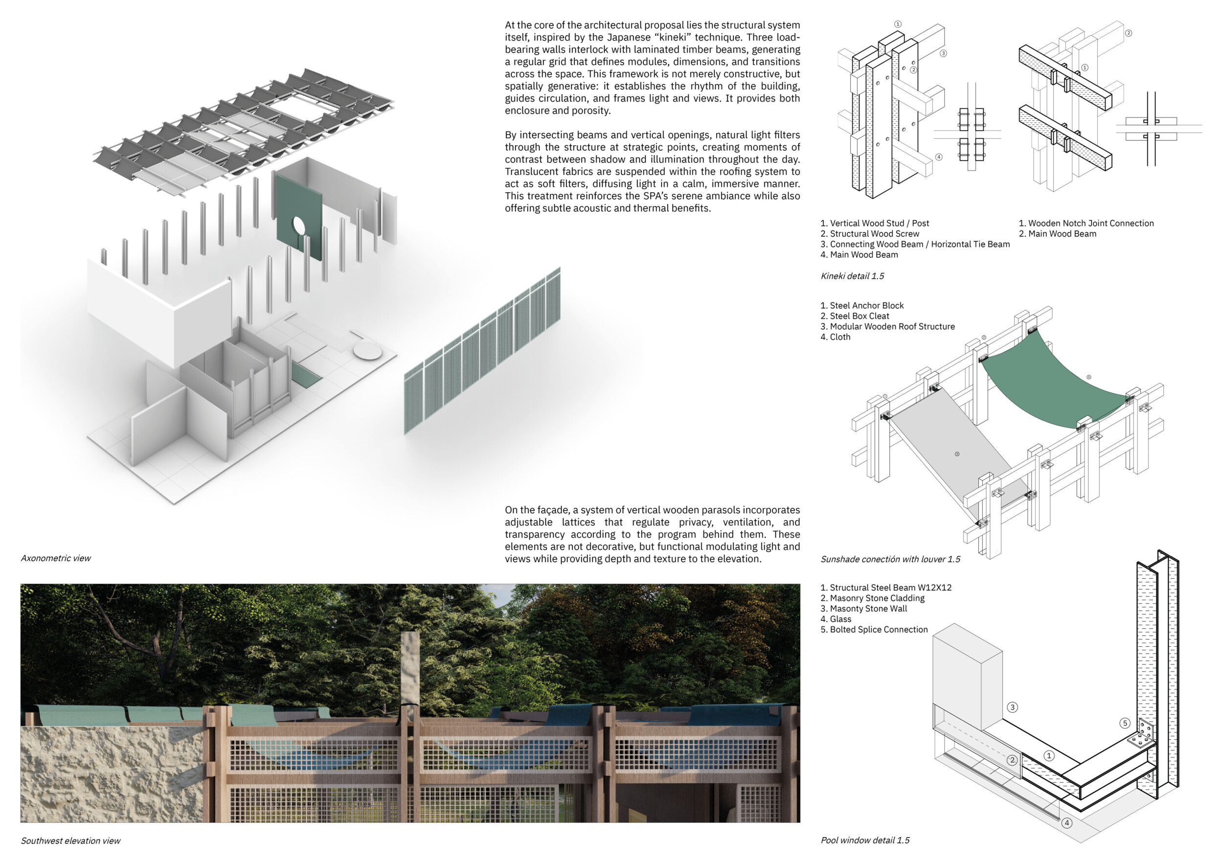 This is a sophisticated and mature proposal that effectively balances atmosphere, technical clarity, and narrative intent. The architectural expression is grounded in local typologies, but avoids pastiche through thoughtful reinterpretation and precision in detail. Diagrams are clean and legible, and the integration of structural axonometric, environmental strategies, and material references demonstrates a command of both architectural thinking and presentation craft.