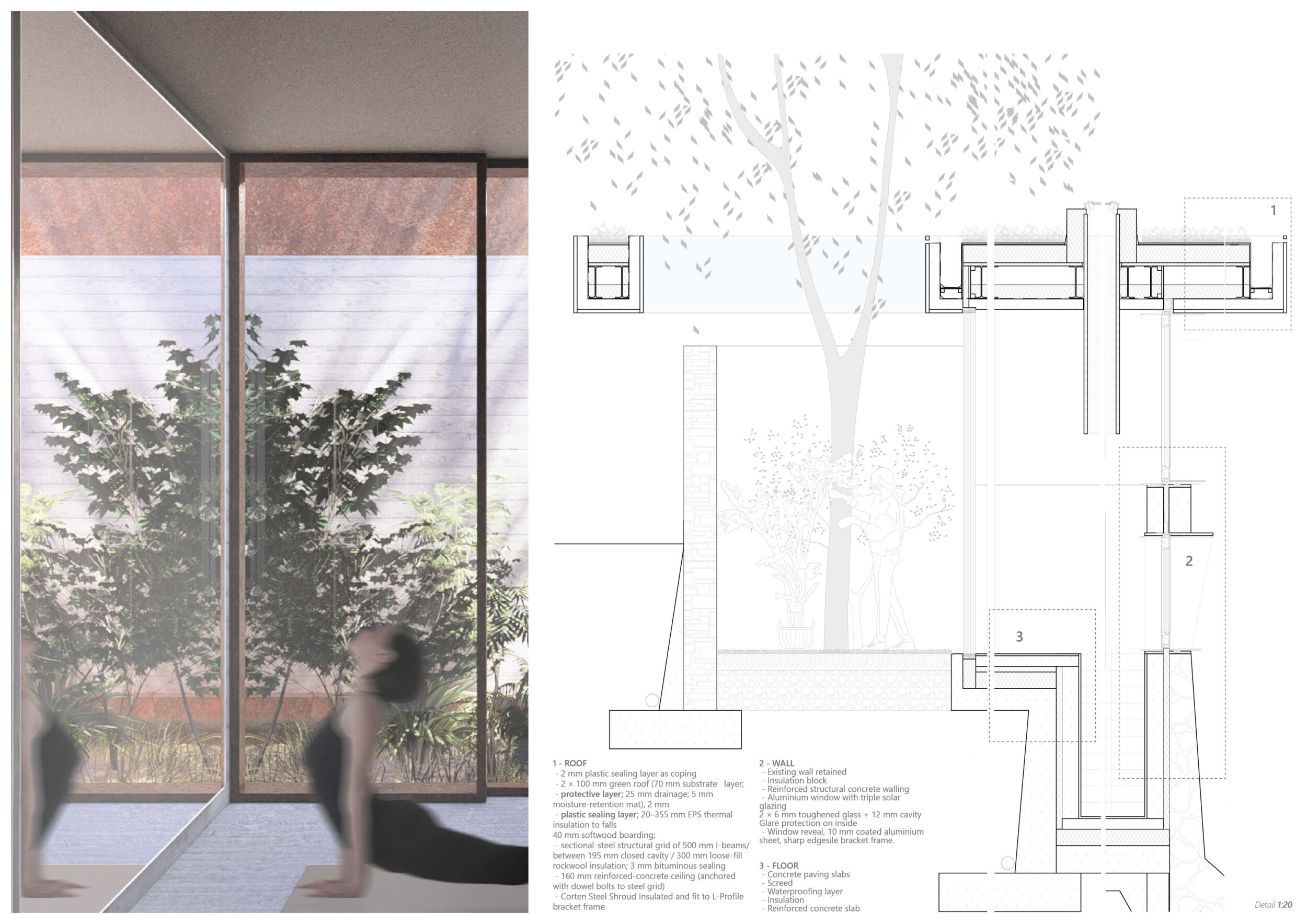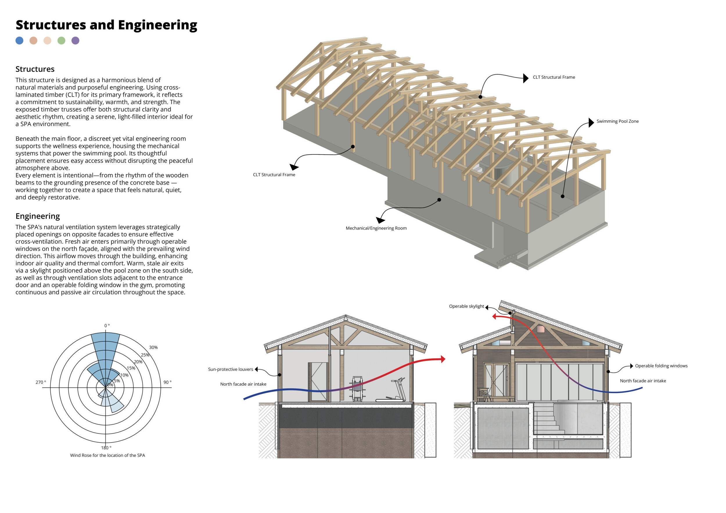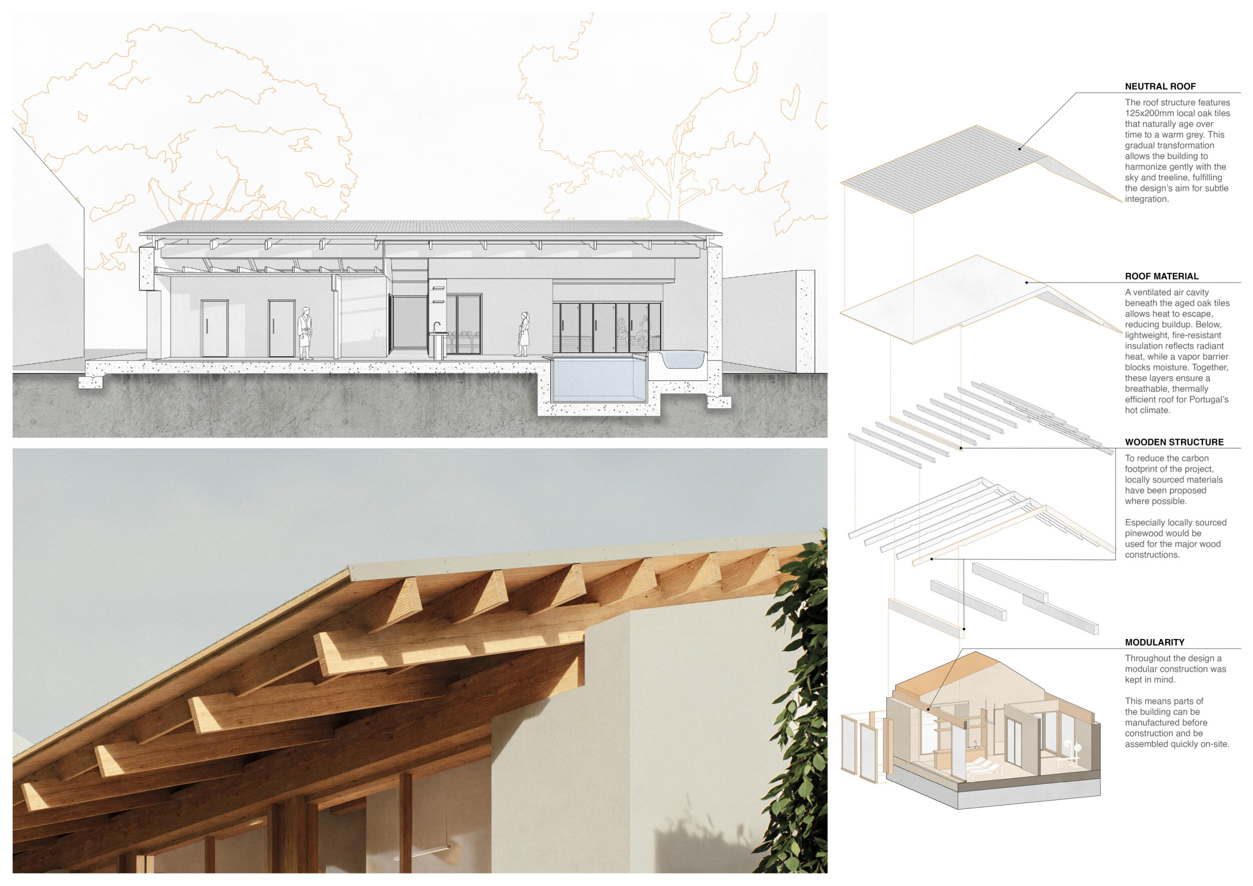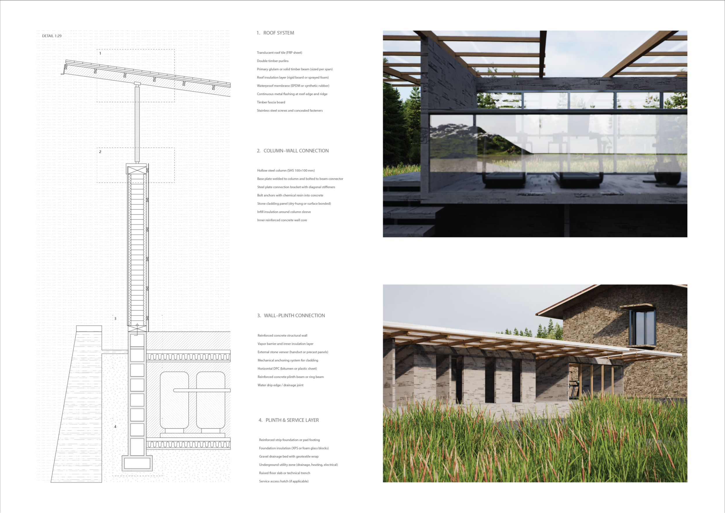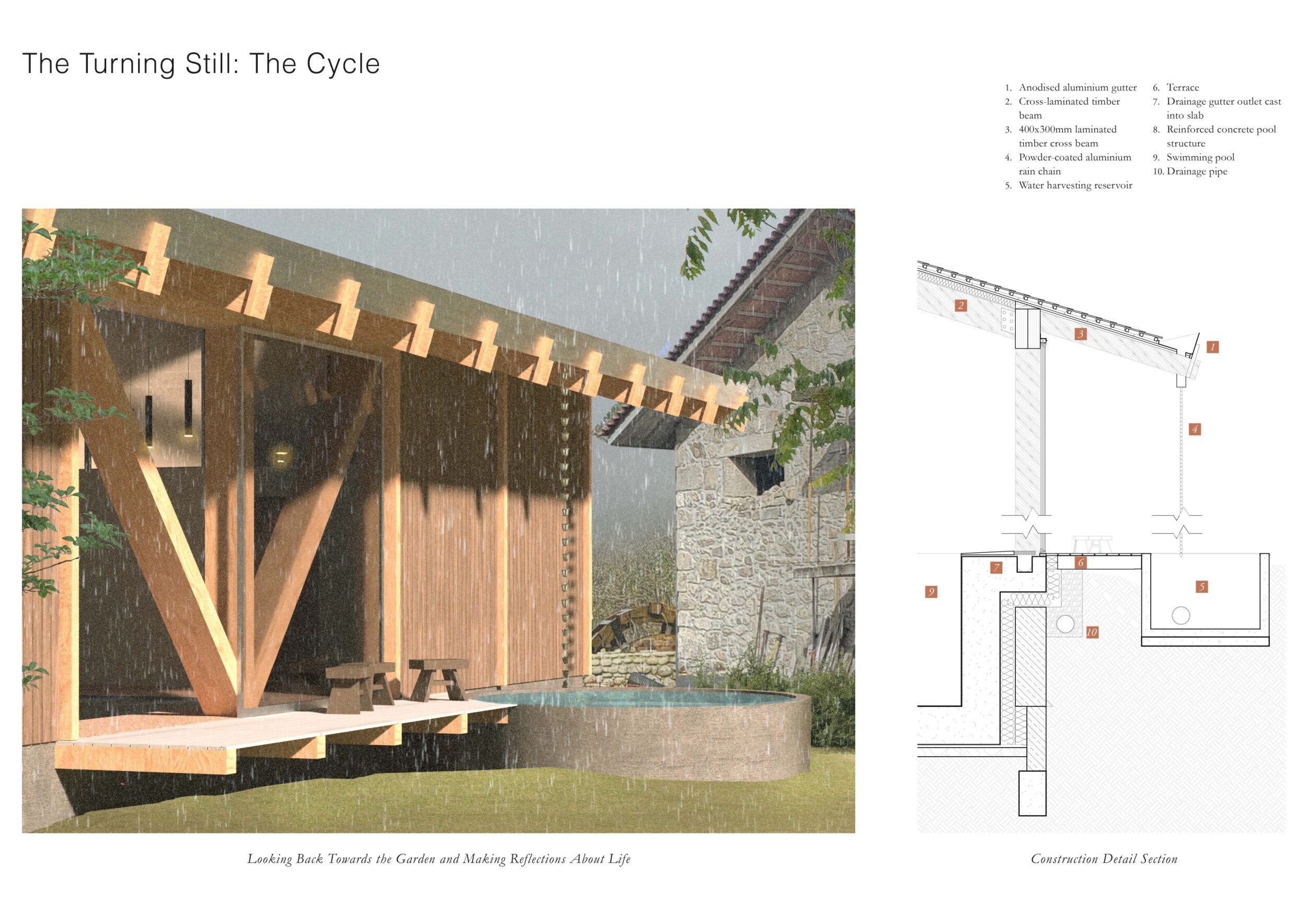 This is a sophisticated and mature proposal that effectively balances atmosphere, technical clarity, and narrative intent. The architectural expression is grounded in local typologies, but avoids pastiche through thoughtful reinterpretation and precision in detail. Diagrams are clean and legible, and the integration of structural axonometric, environmental strategies, and material references demonstrates a command of both architectural thinking and presentation craft.