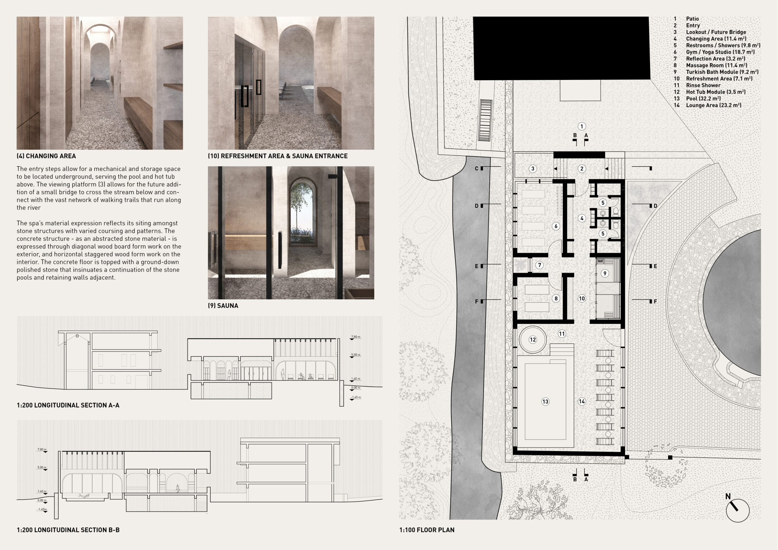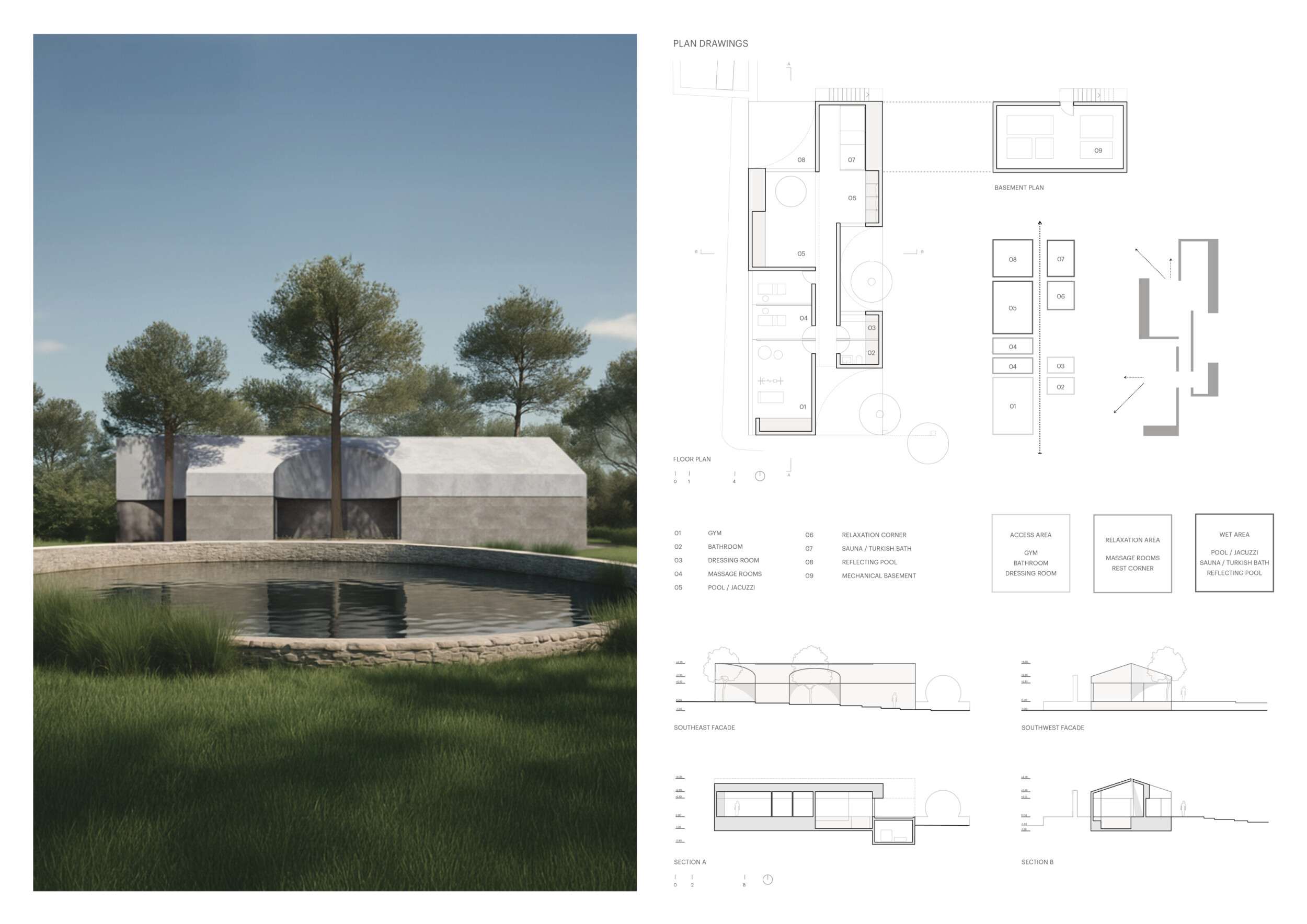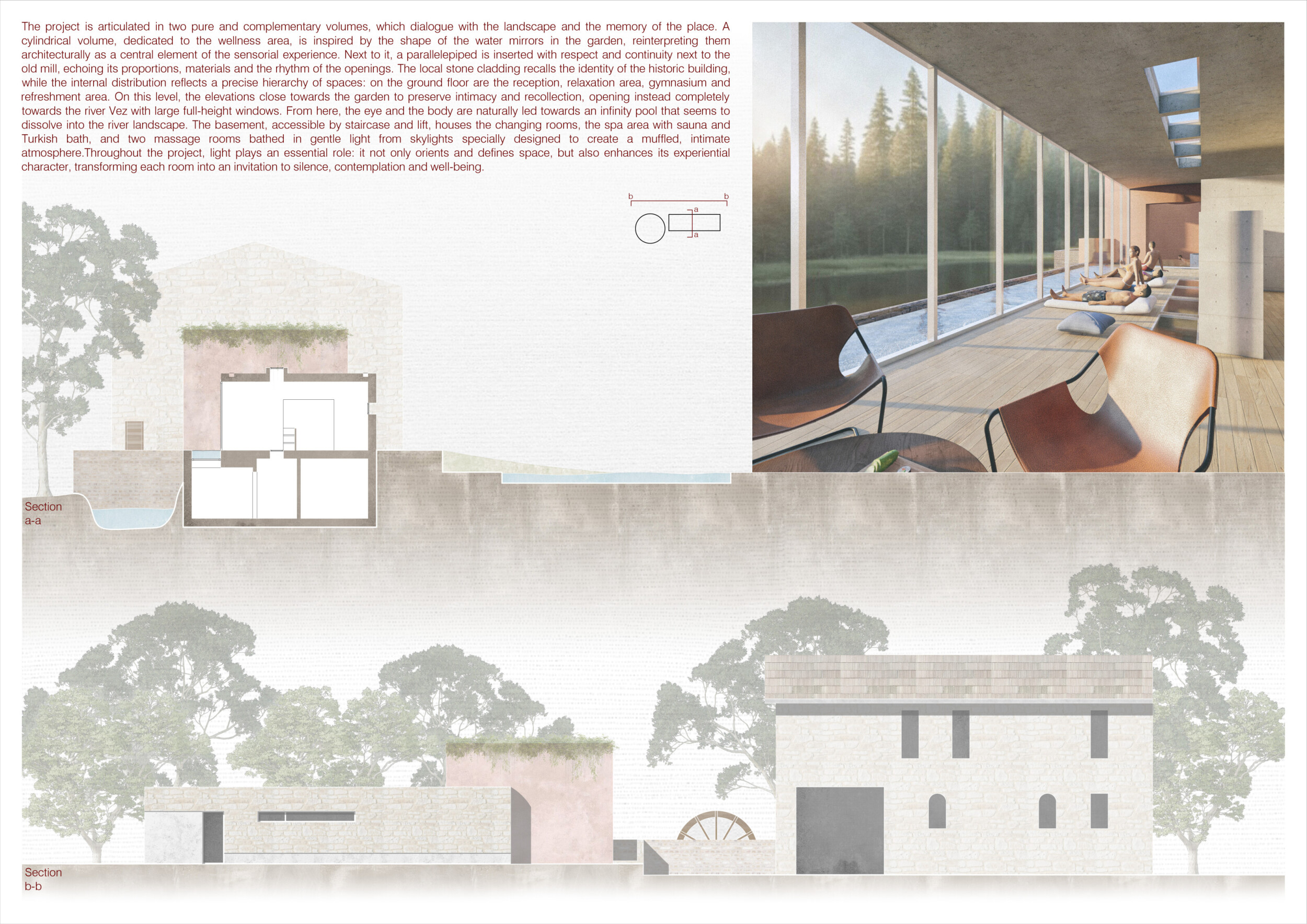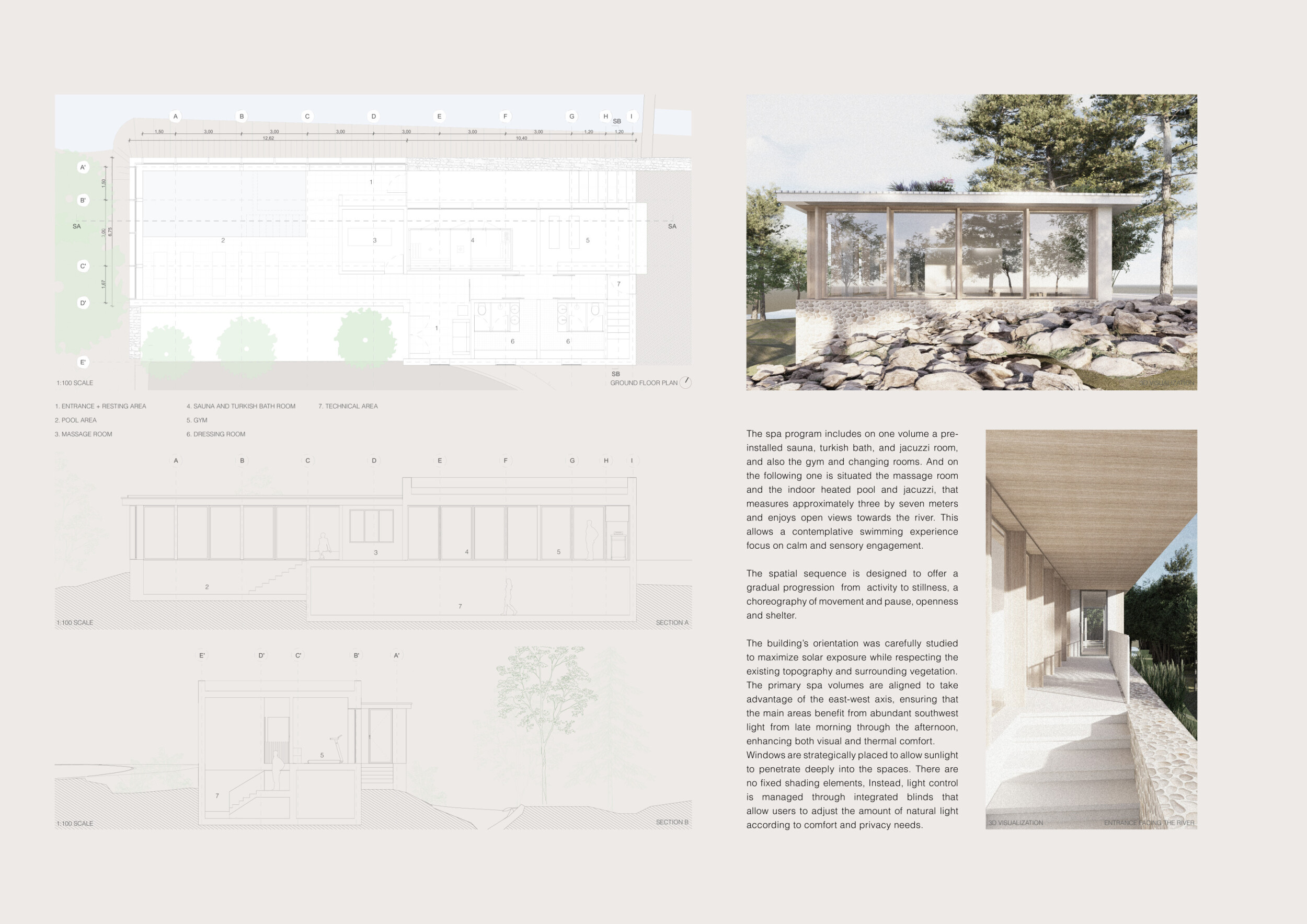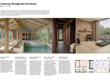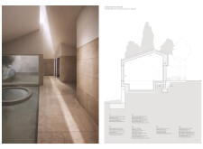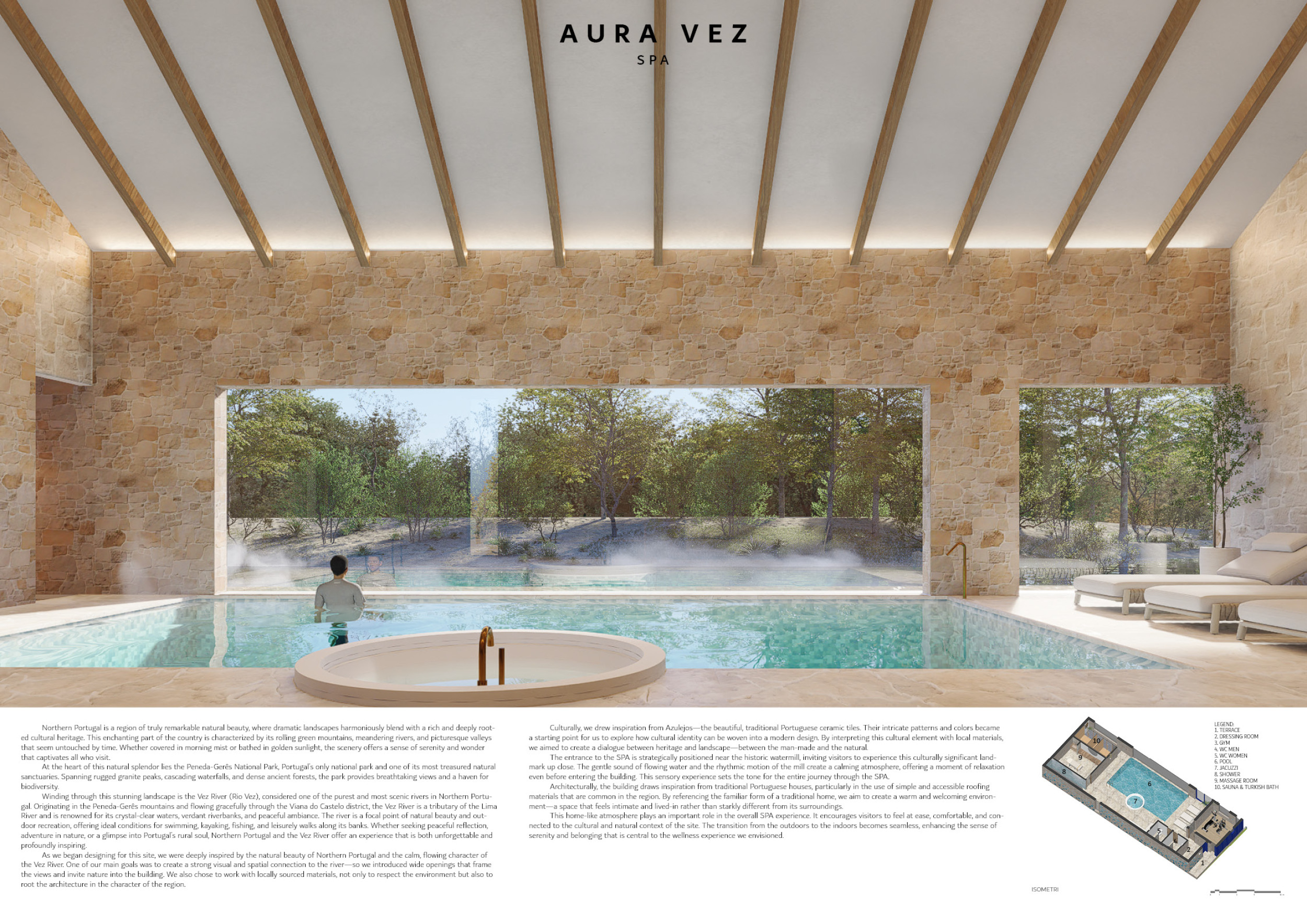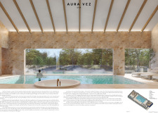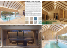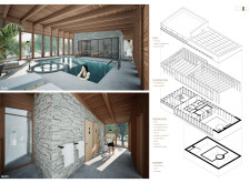 The project comprises three primary volumes: two solid stone blocks and a lighter timber structure that serves as the transitional dressing space. These elements frame a courtyard and are carefully positioned in response to a sensitive site analysis, emphasizing material tactility and landscape integration. The main spaces—a pool and relaxation zone, gym, sauna, and massage rooms—are arranged along a progression from communal to intimate experiences.