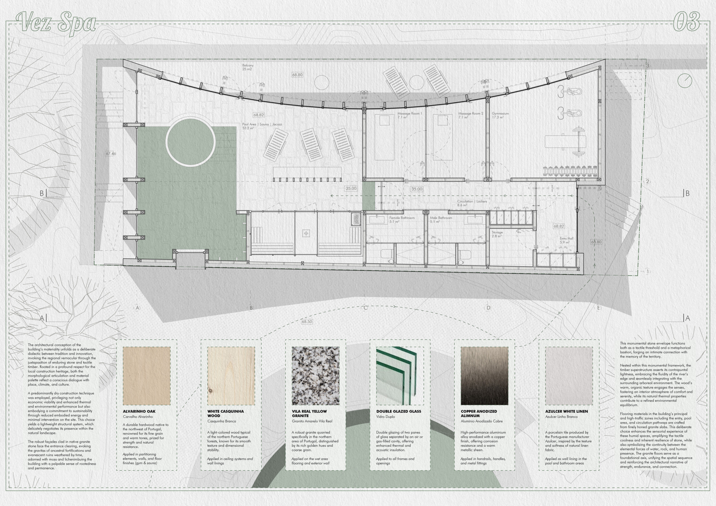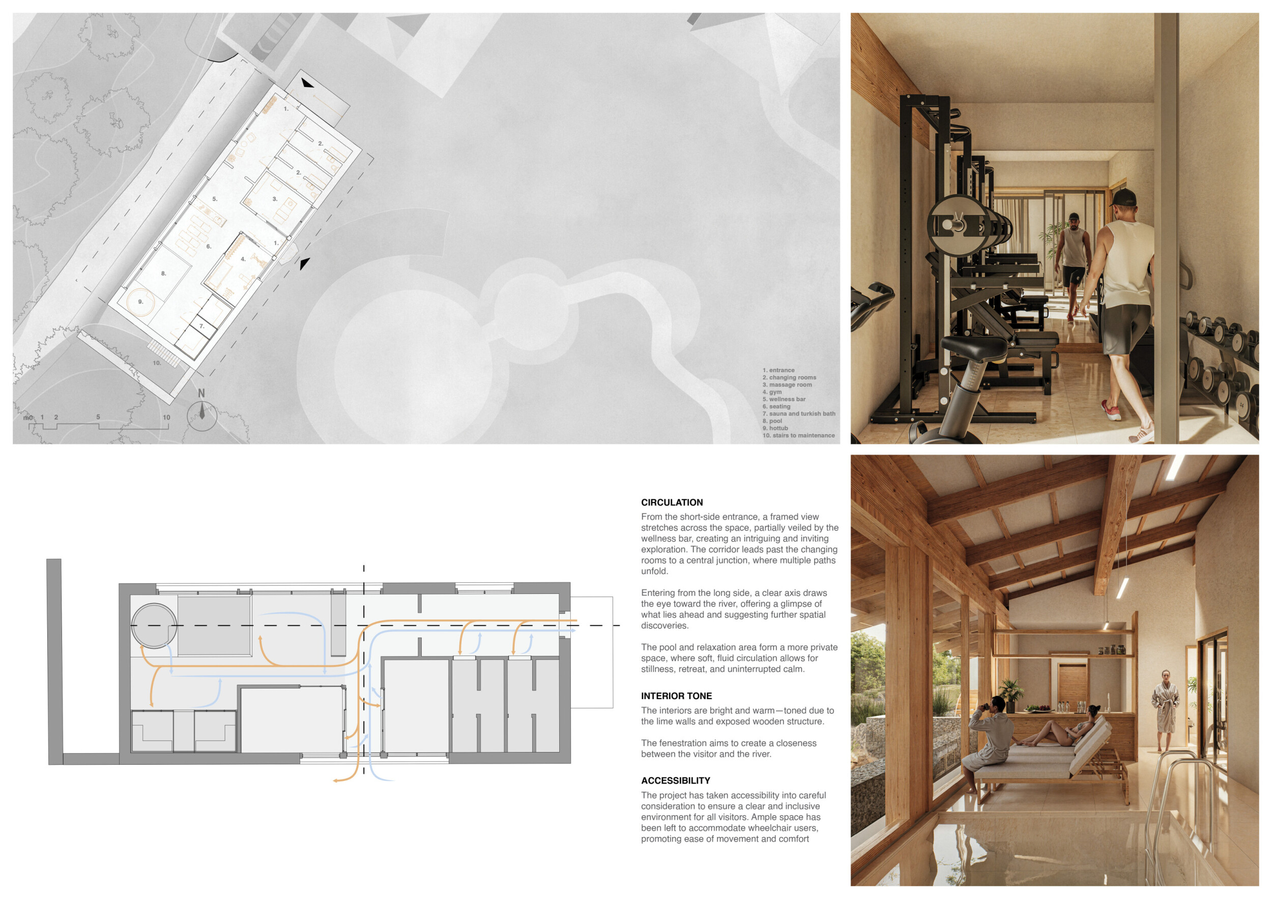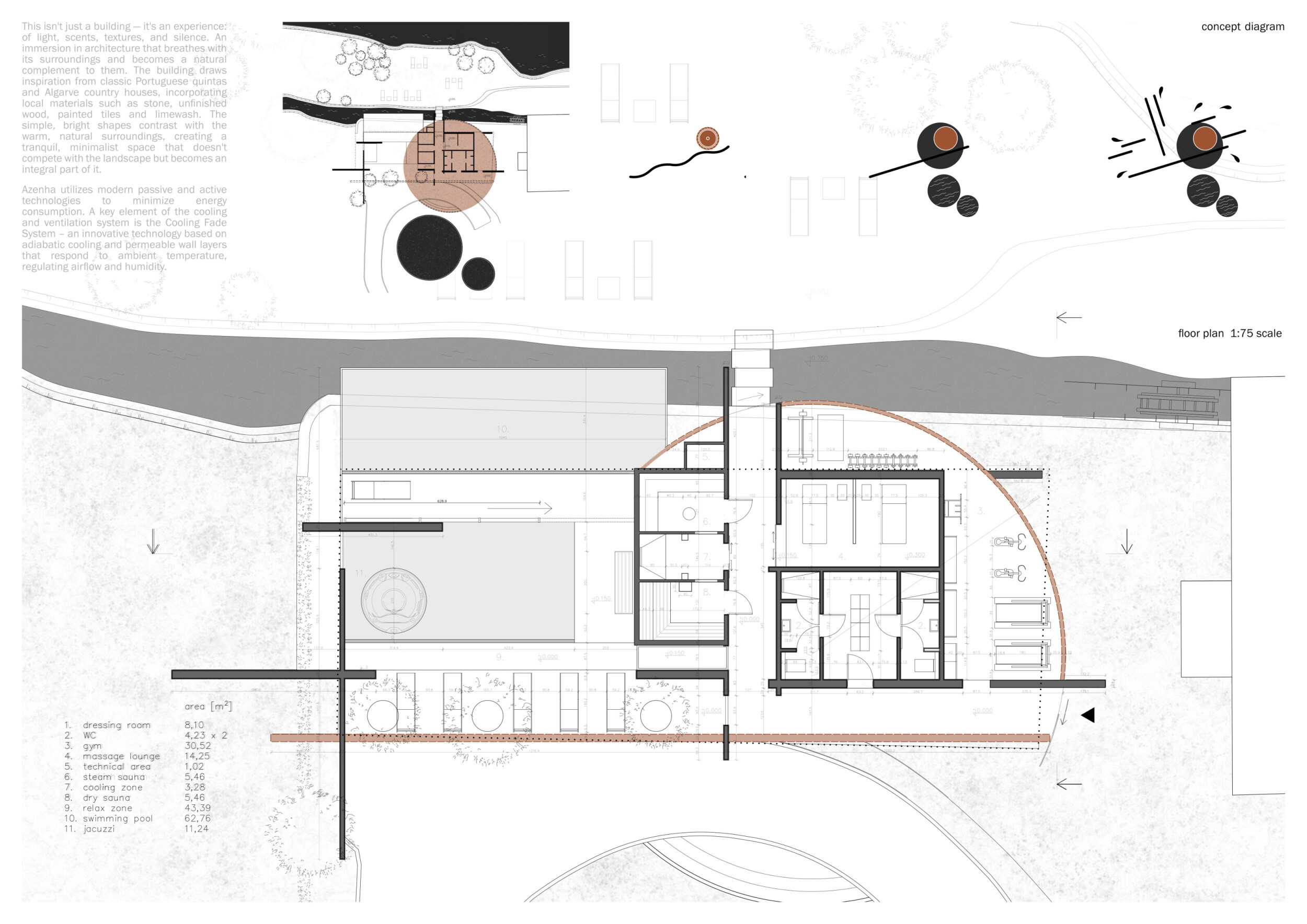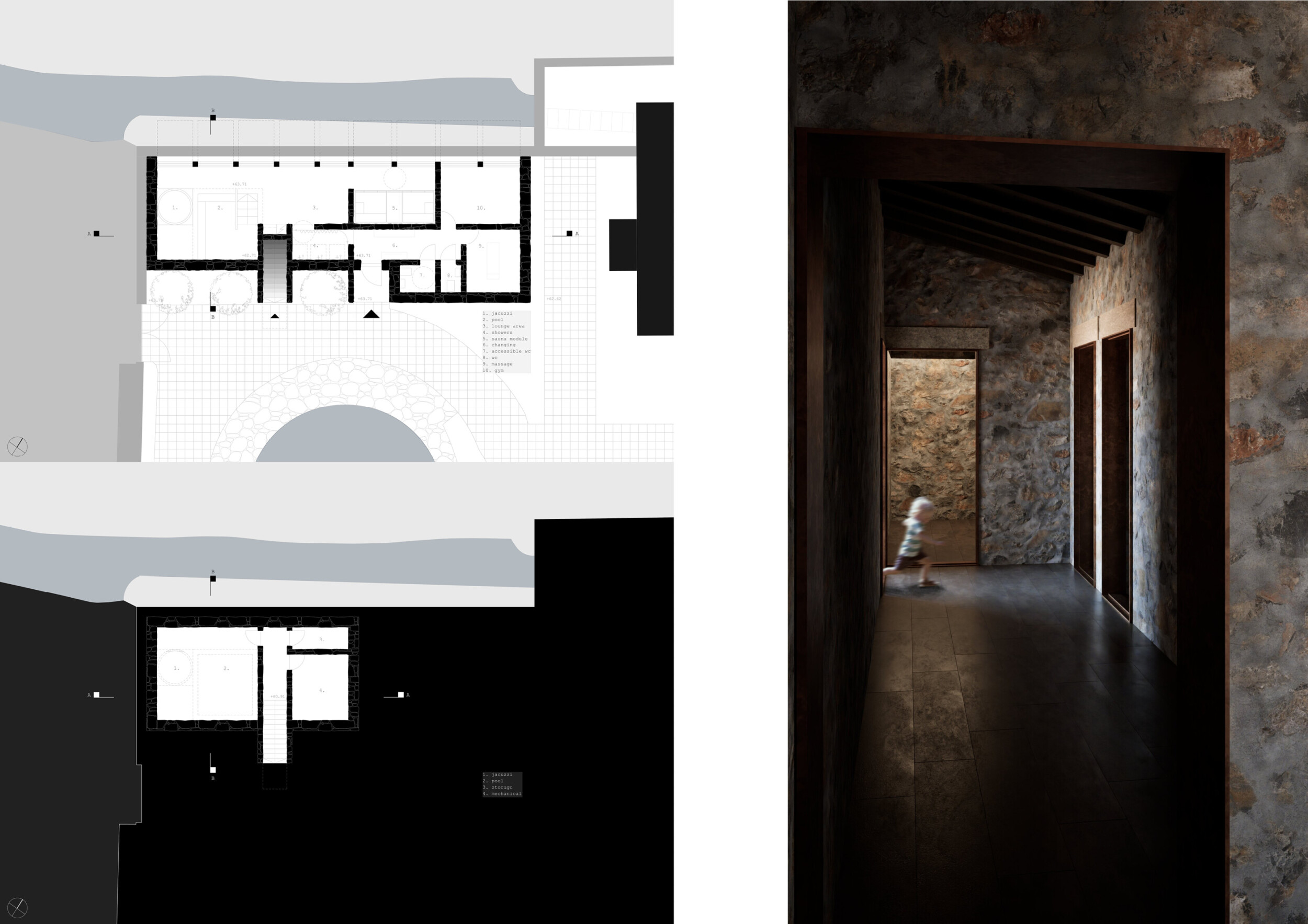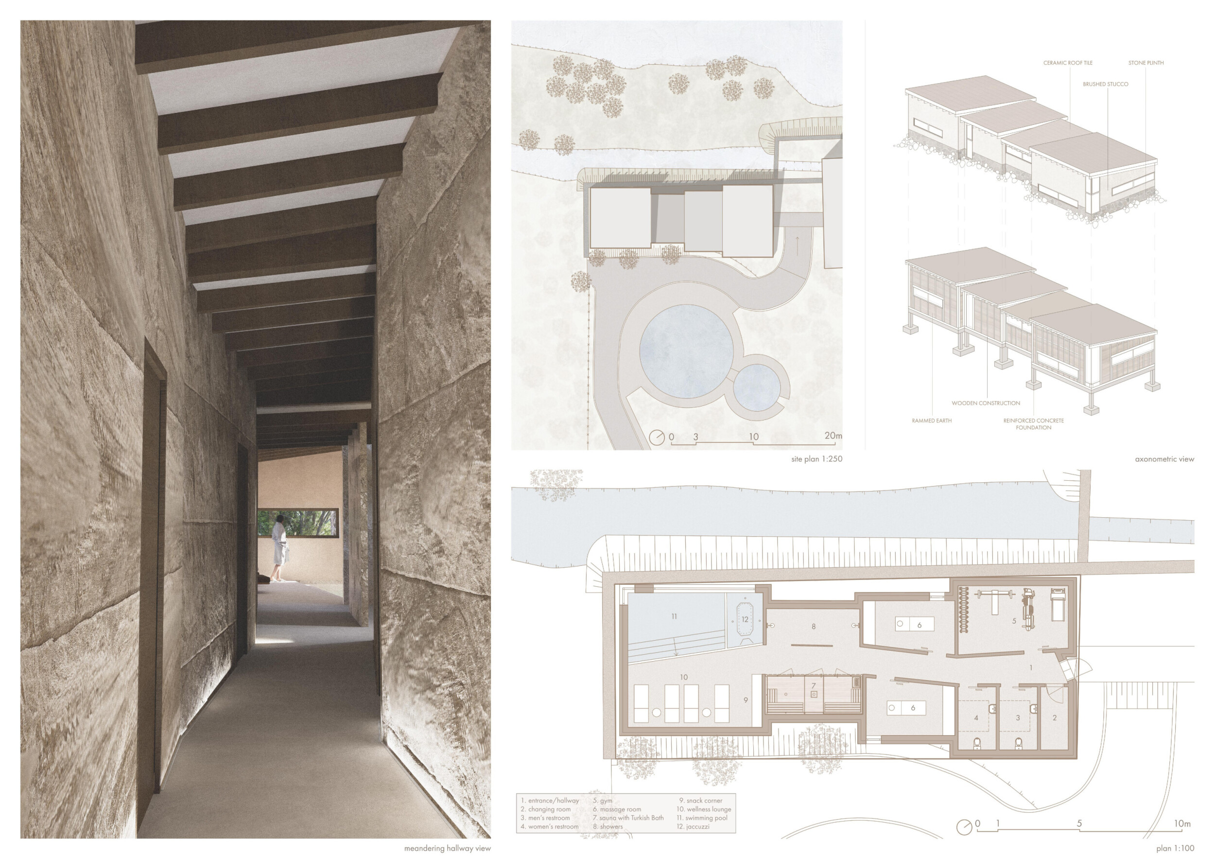 The project comprises three primary volumes: two solid stone blocks and a lighter timber structure that serves as the transitional dressing space. These elements frame a courtyard and are carefully positioned in response to a sensitive site analysis, emphasizing material tactility and landscape integration. The main spaces—a pool and relaxation zone, gym, sauna, and massage rooms—are arranged along a progression from communal to intimate experiences.