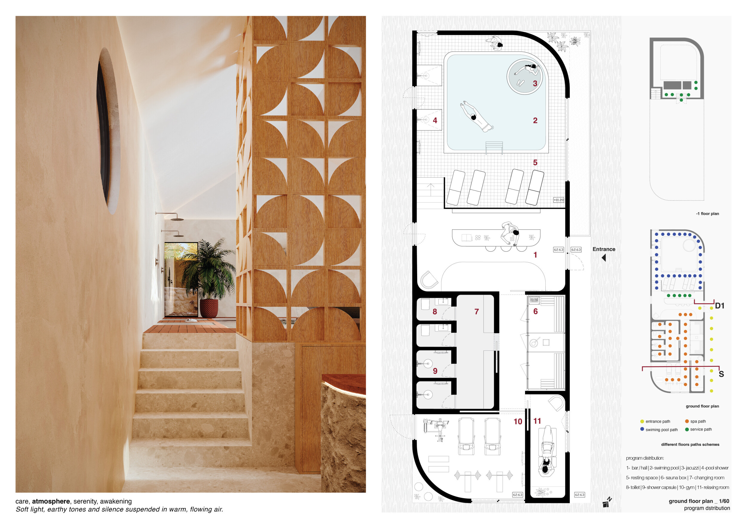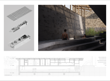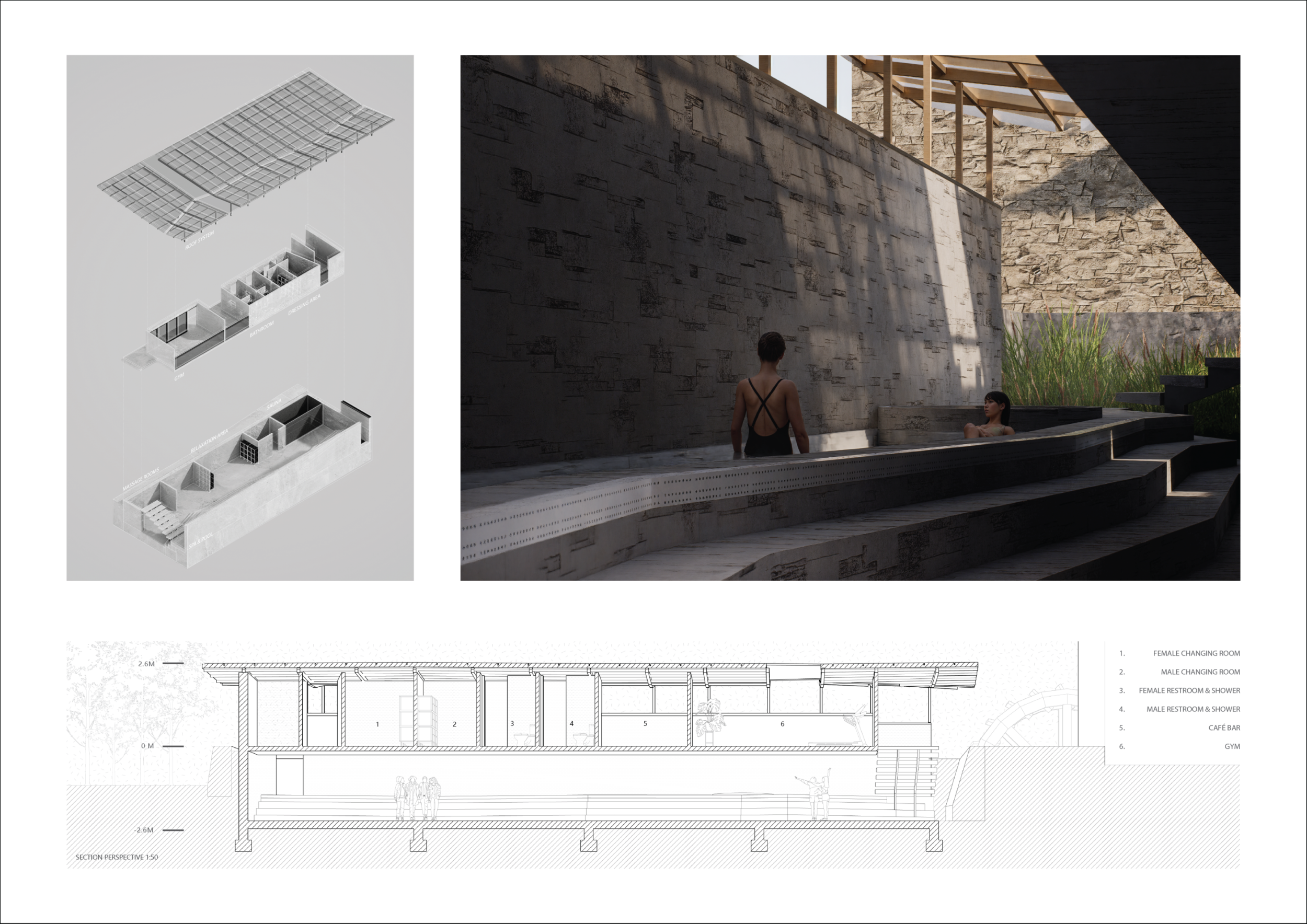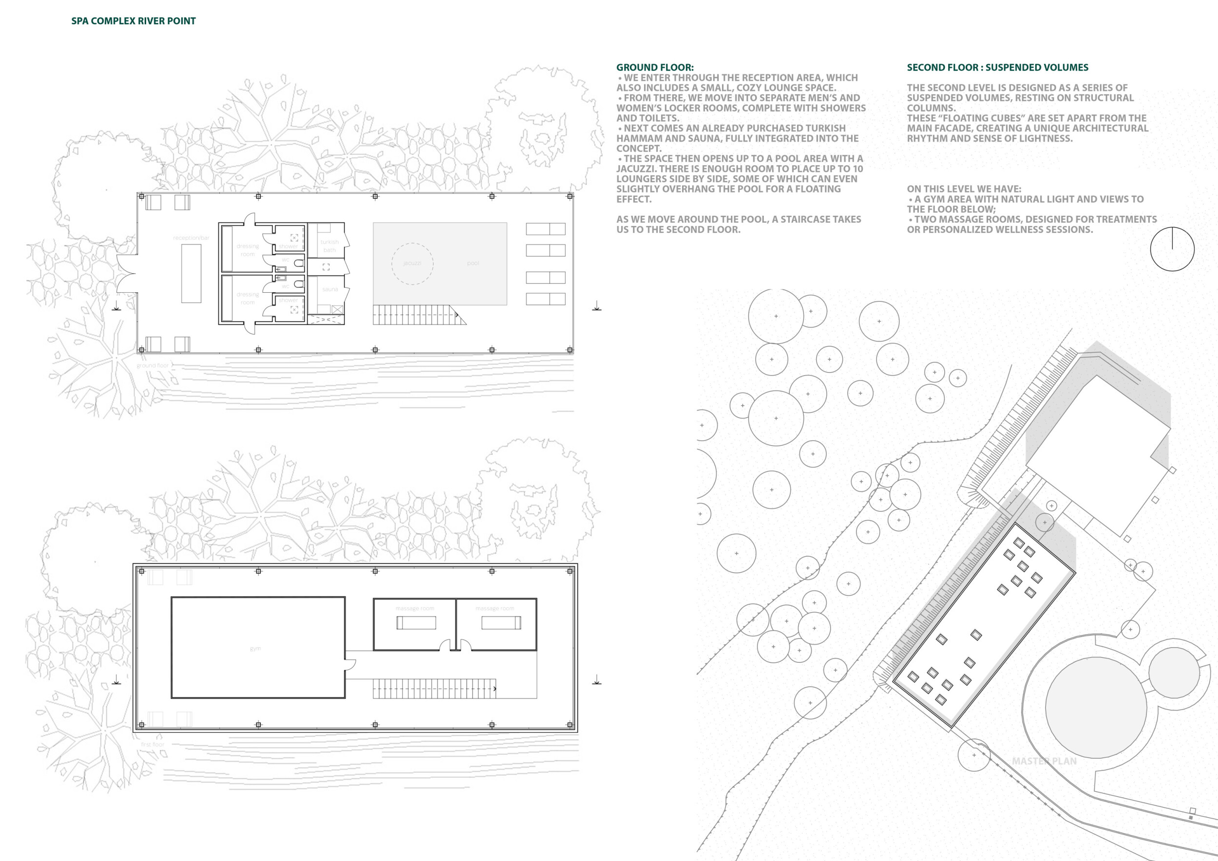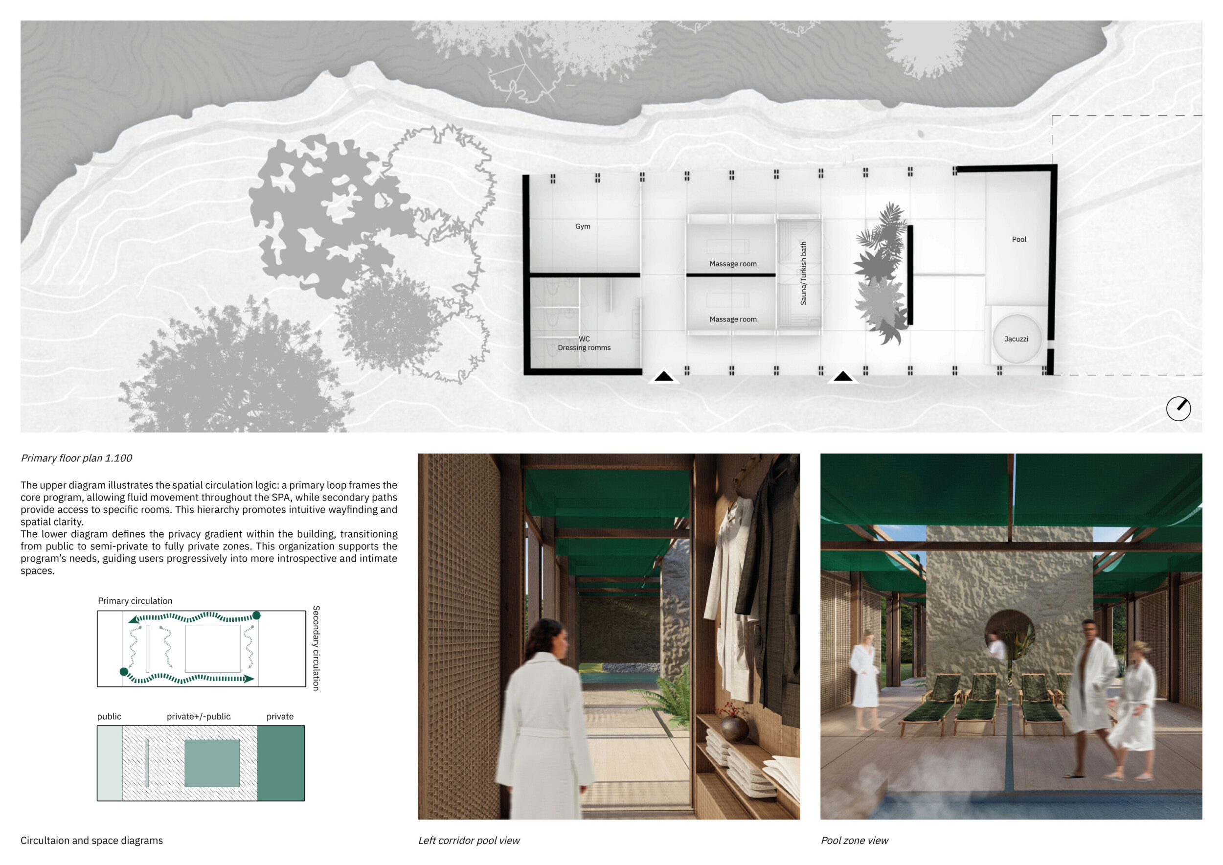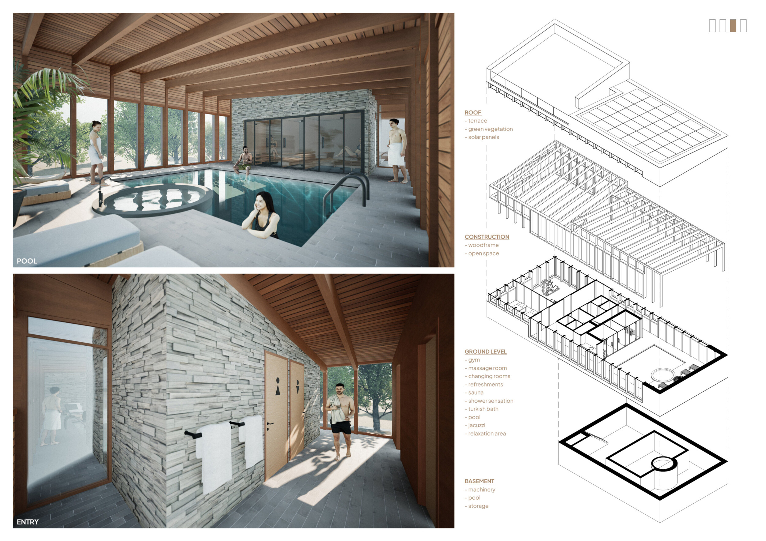 The project comprises three primary volumes: two solid stone blocks and a lighter timber structure that serves as the transitional dressing space. These elements frame a courtyard and are carefully positioned in response to a sensitive site analysis, emphasizing material tactility and landscape integration. The main spaces—a pool and relaxation zone, gym, sauna, and massage rooms—are arranged along a progression from communal to intimate experiences.