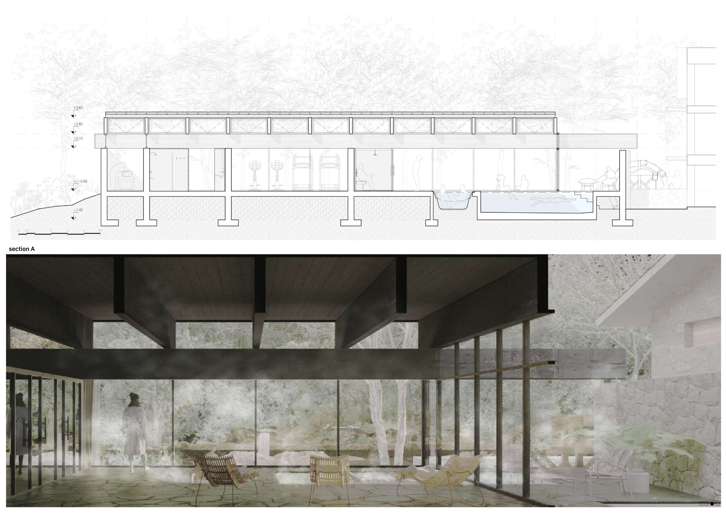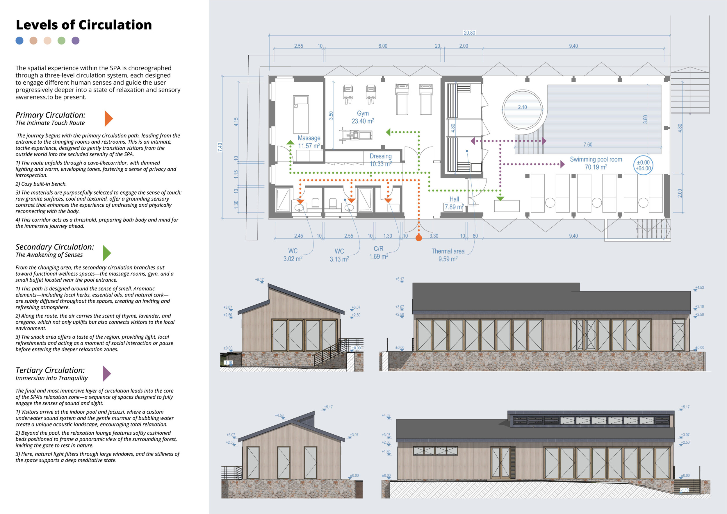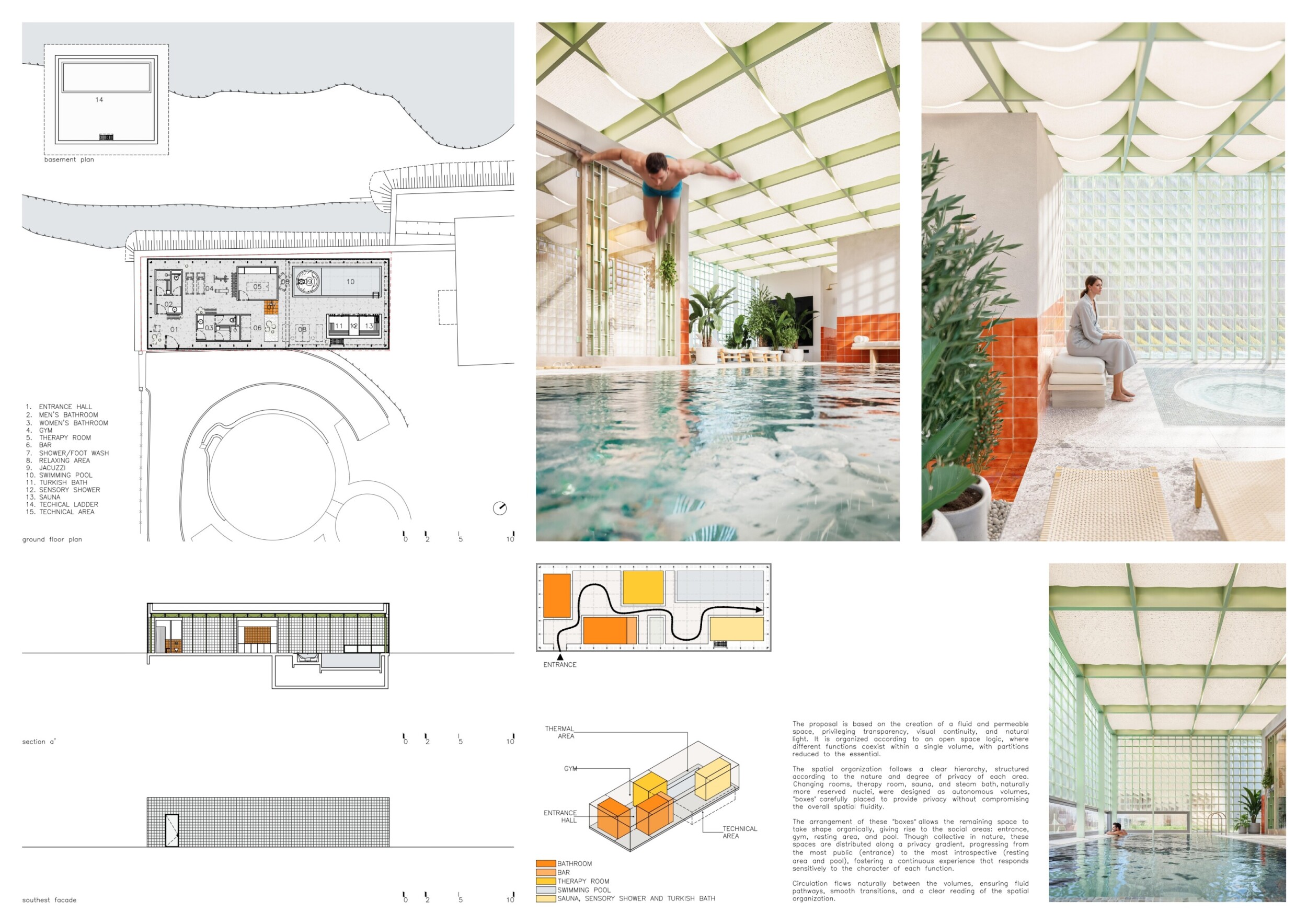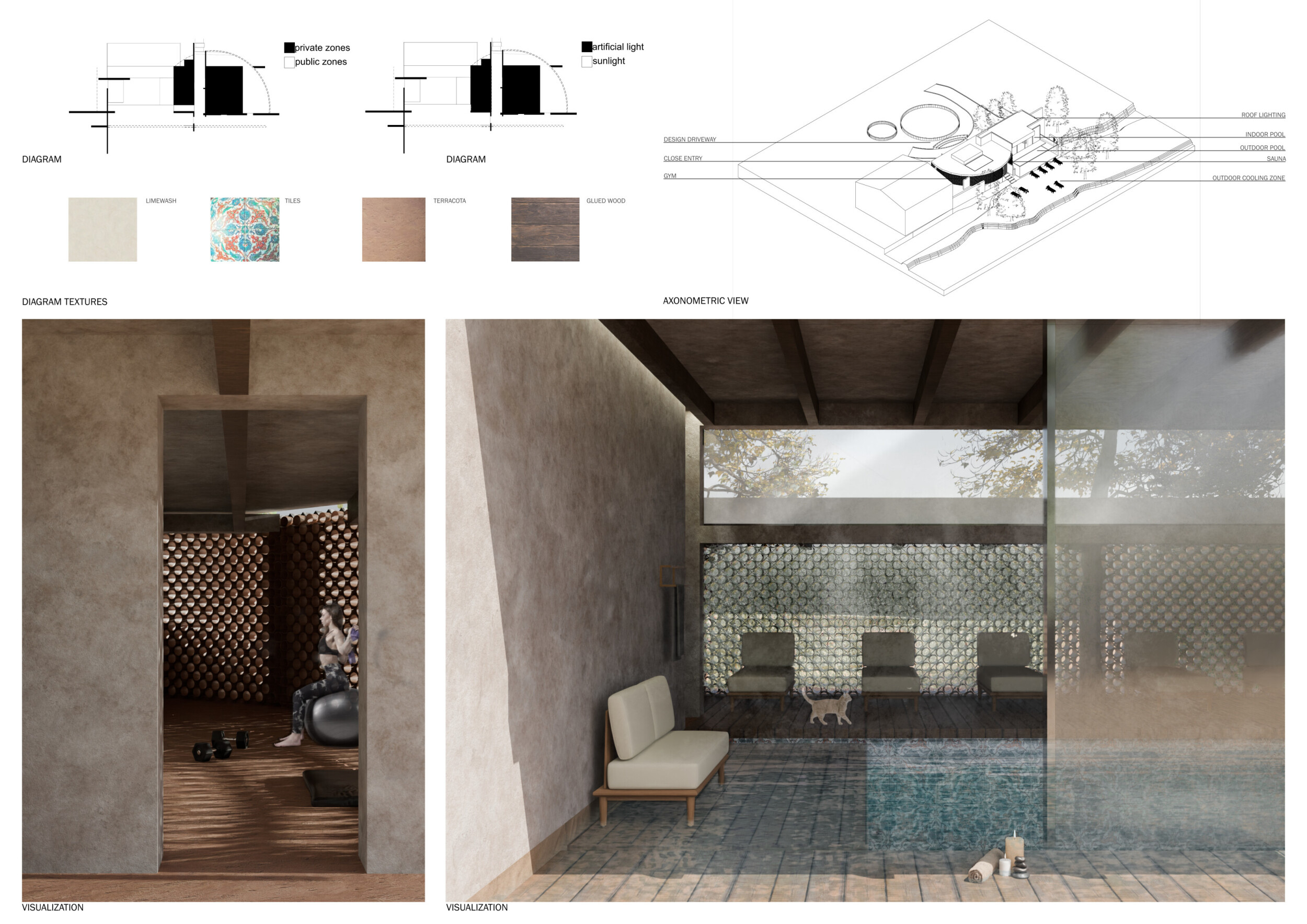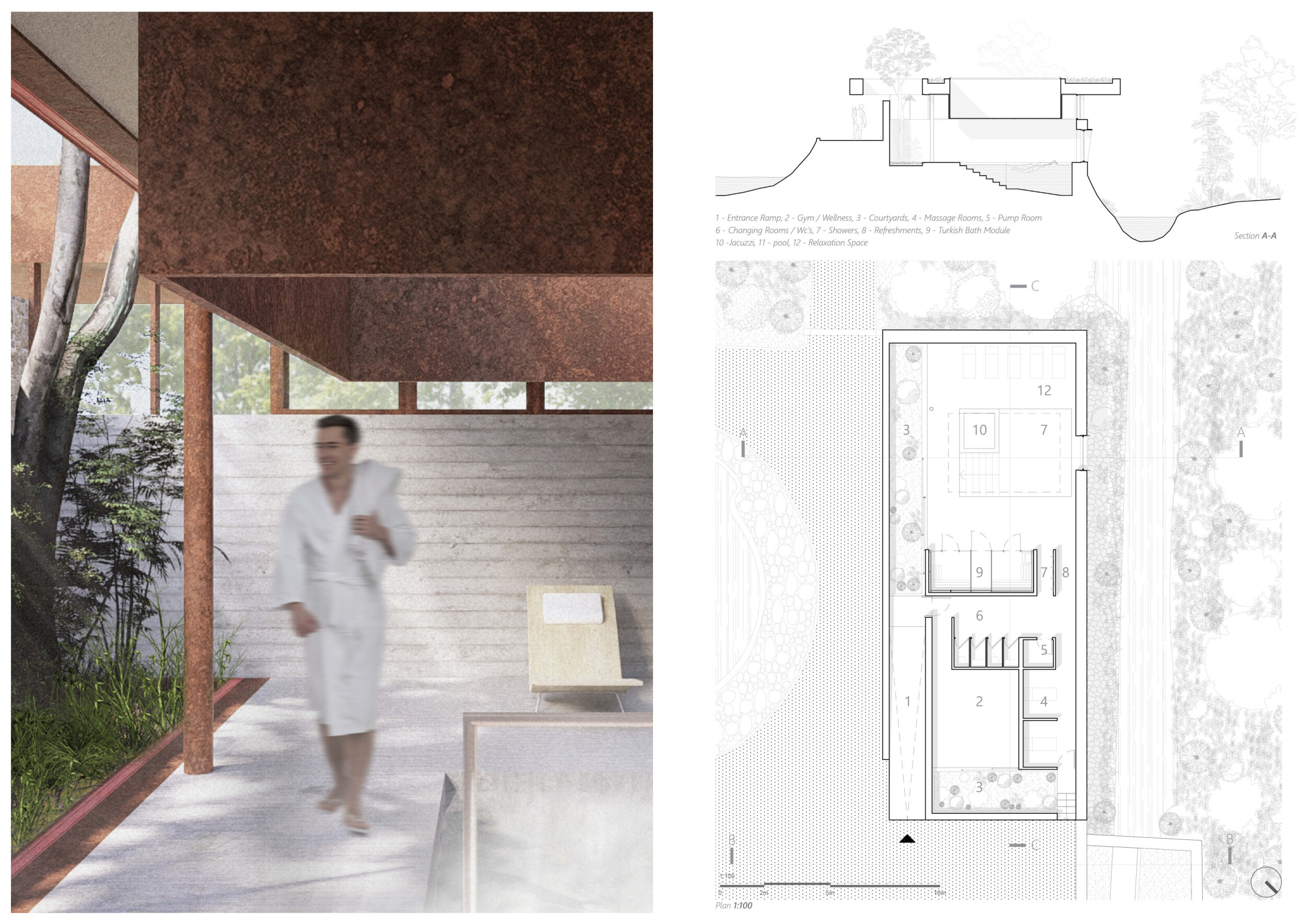 The project comprises three primary volumes: two solid stone blocks and a lighter timber structure that serves as the transitional dressing space. These elements frame a courtyard and are carefully positioned in response to a sensitive site analysis, emphasizing material tactility and landscape integration. The main spaces—a pool and relaxation zone, gym, sauna, and massage rooms—are arranged along a progression from communal to intimate experiences.