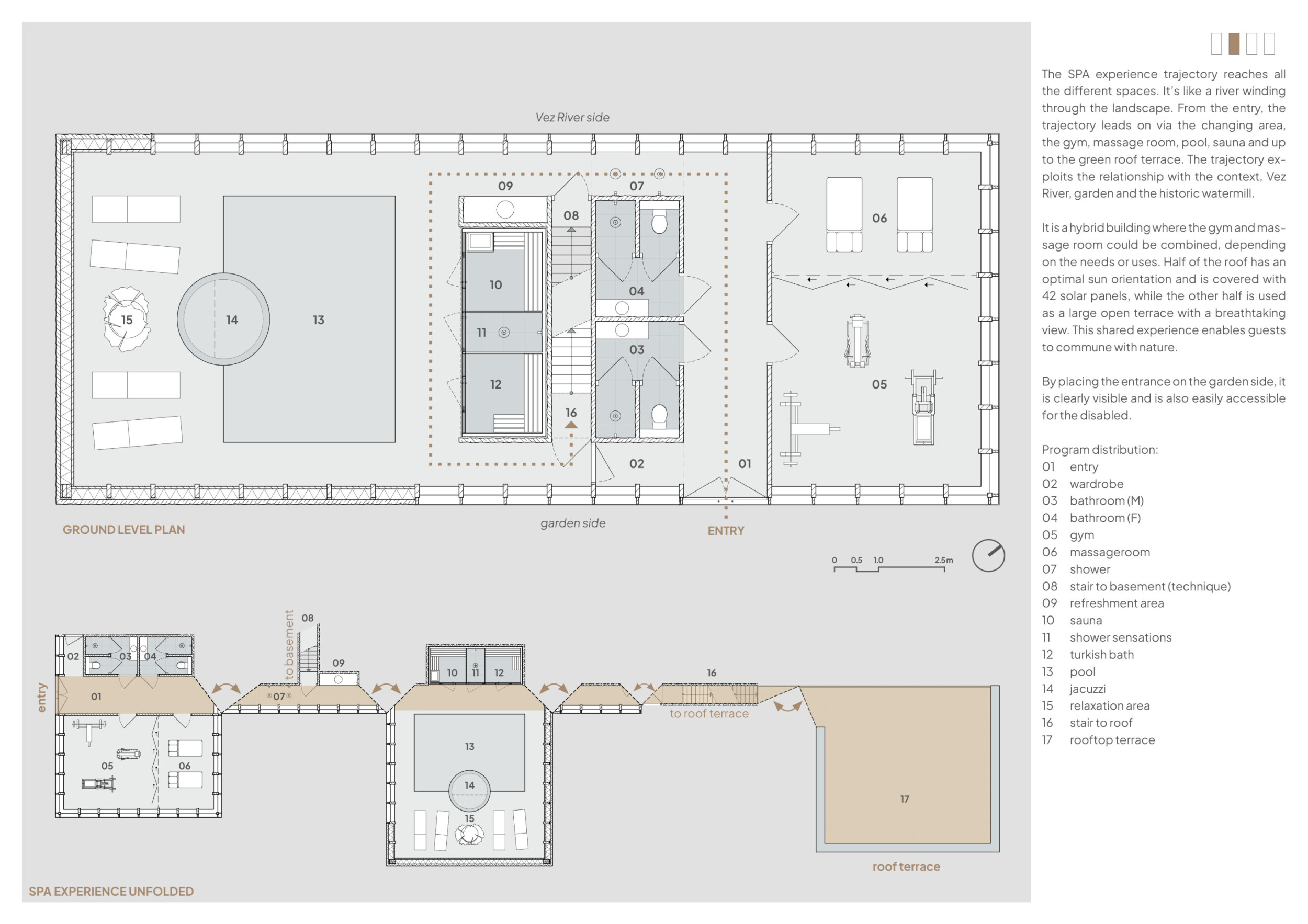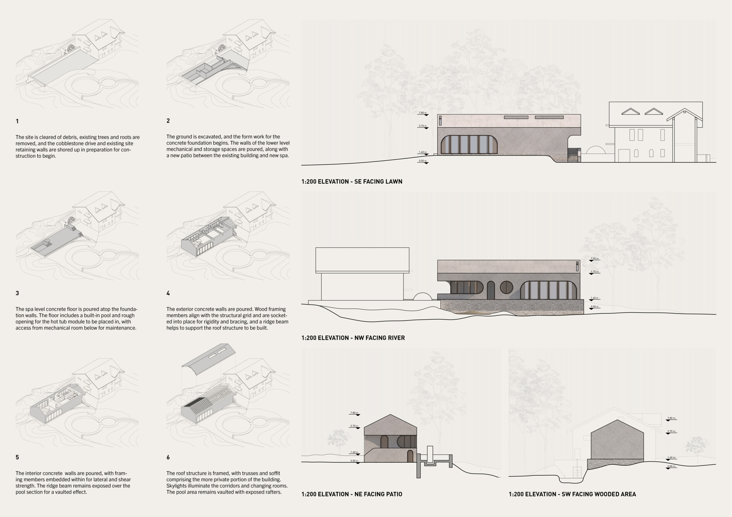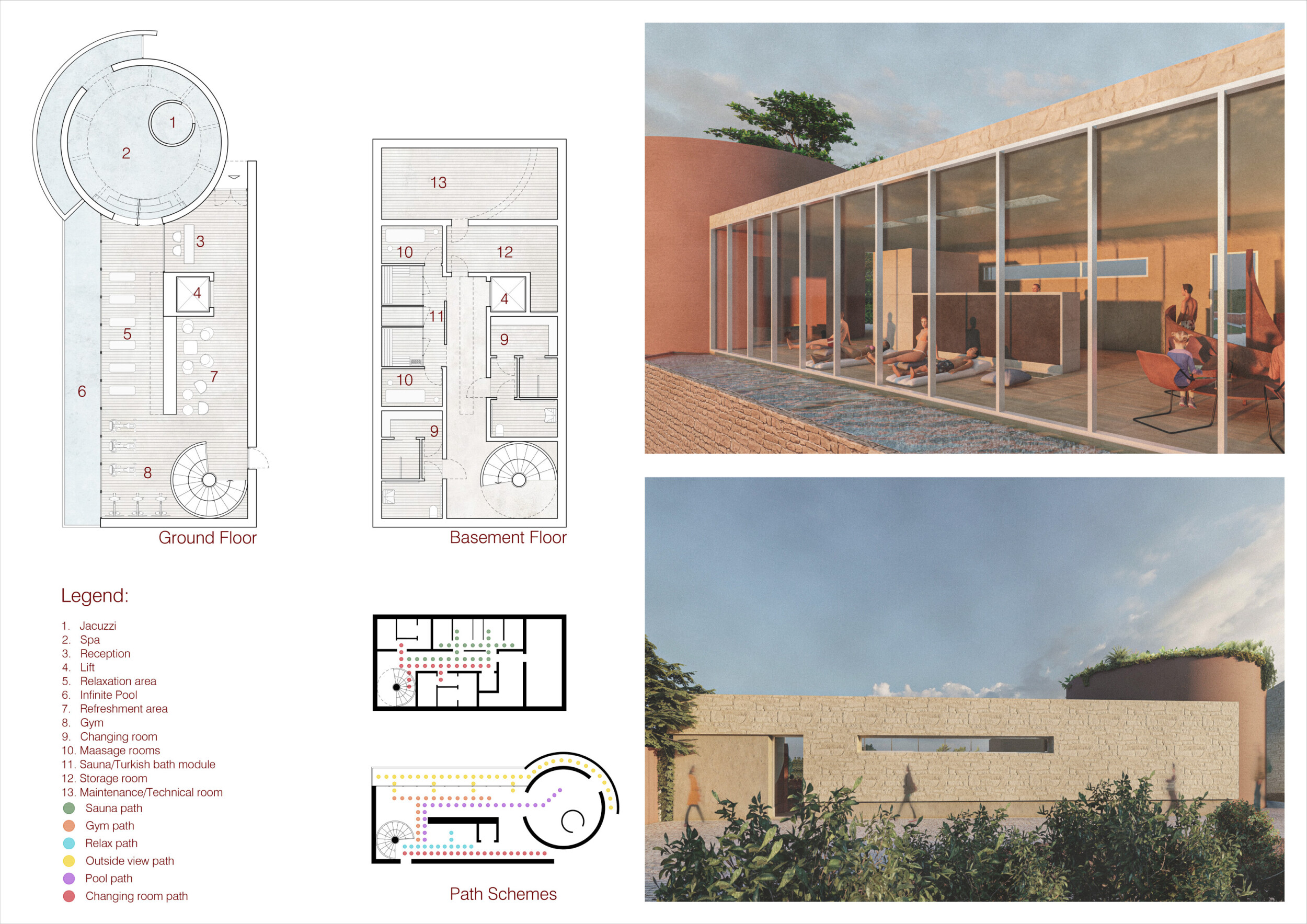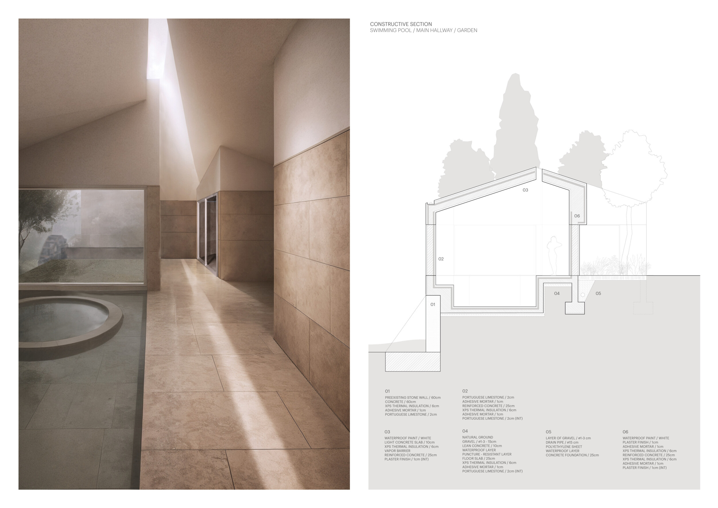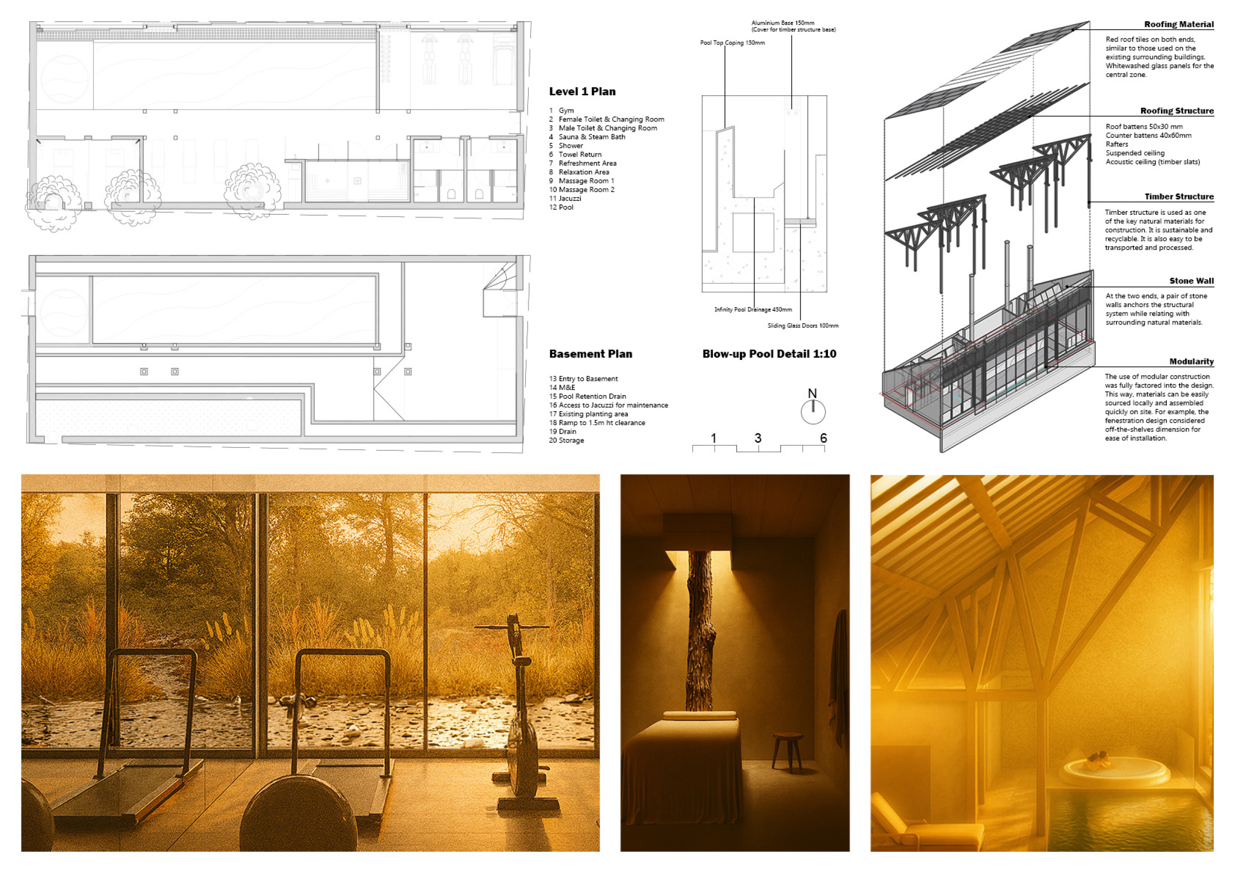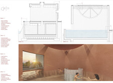 The project comprises three primary volumes: two solid stone blocks and a lighter timber structure that serves as the transitional dressing space. These elements frame a courtyard and are carefully positioned in response to a sensitive site analysis, emphasizing material tactility and landscape integration. The main spaces—a pool and relaxation zone, gym, sauna, and massage rooms—are arranged along a progression from communal to intimate experiences.