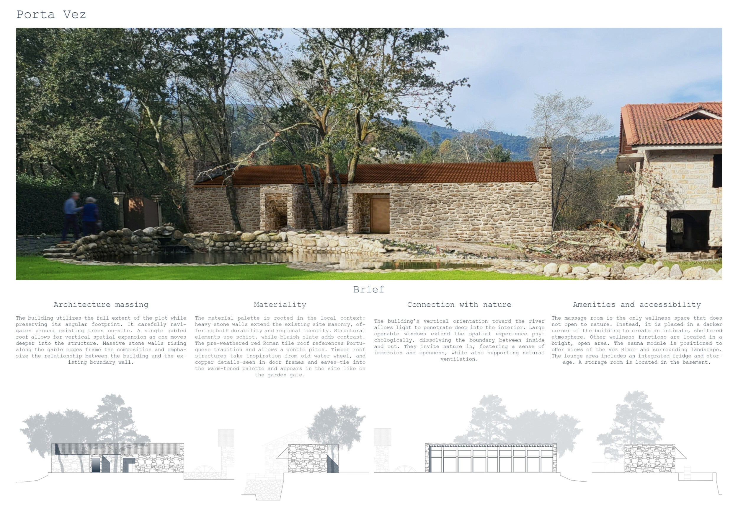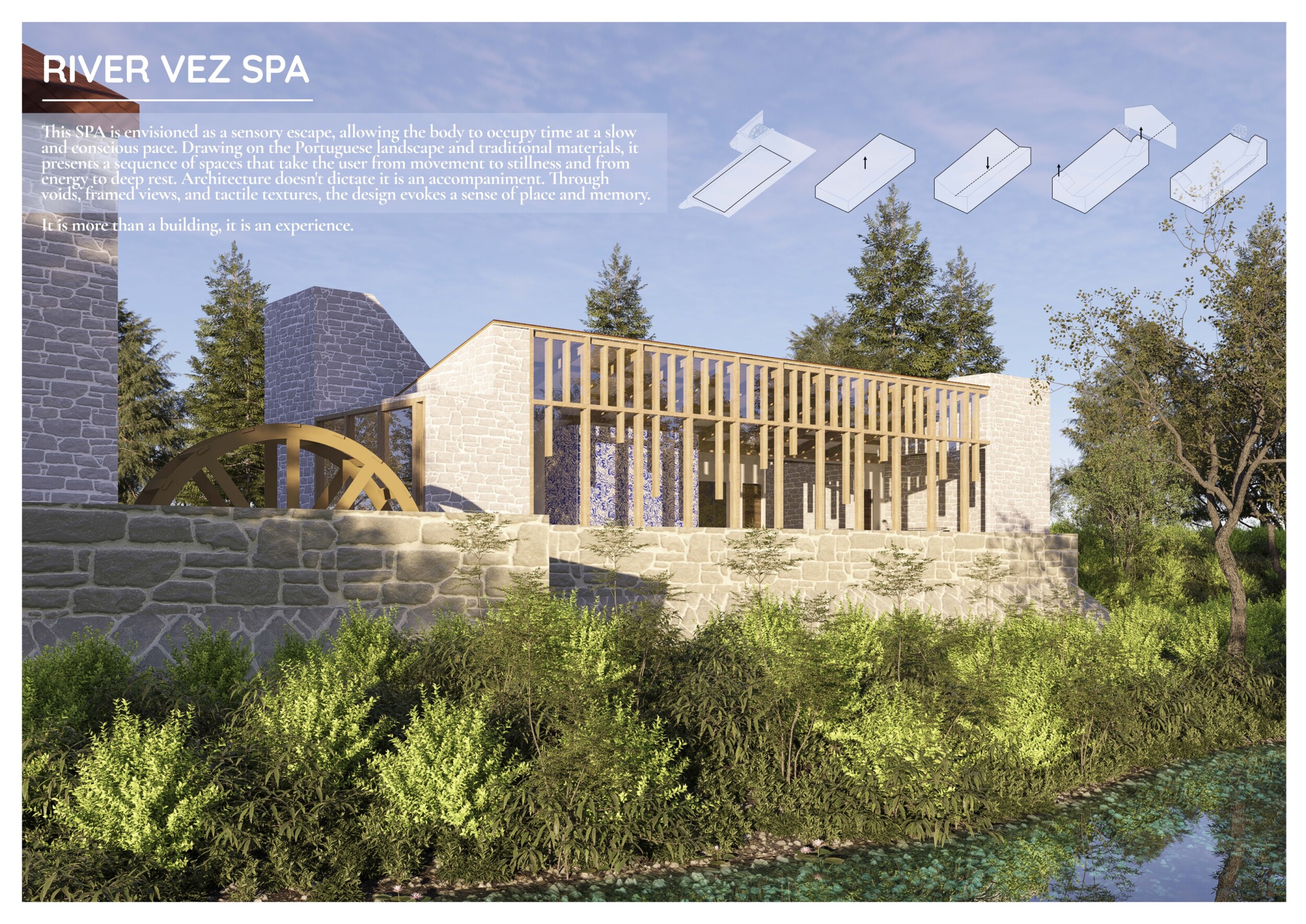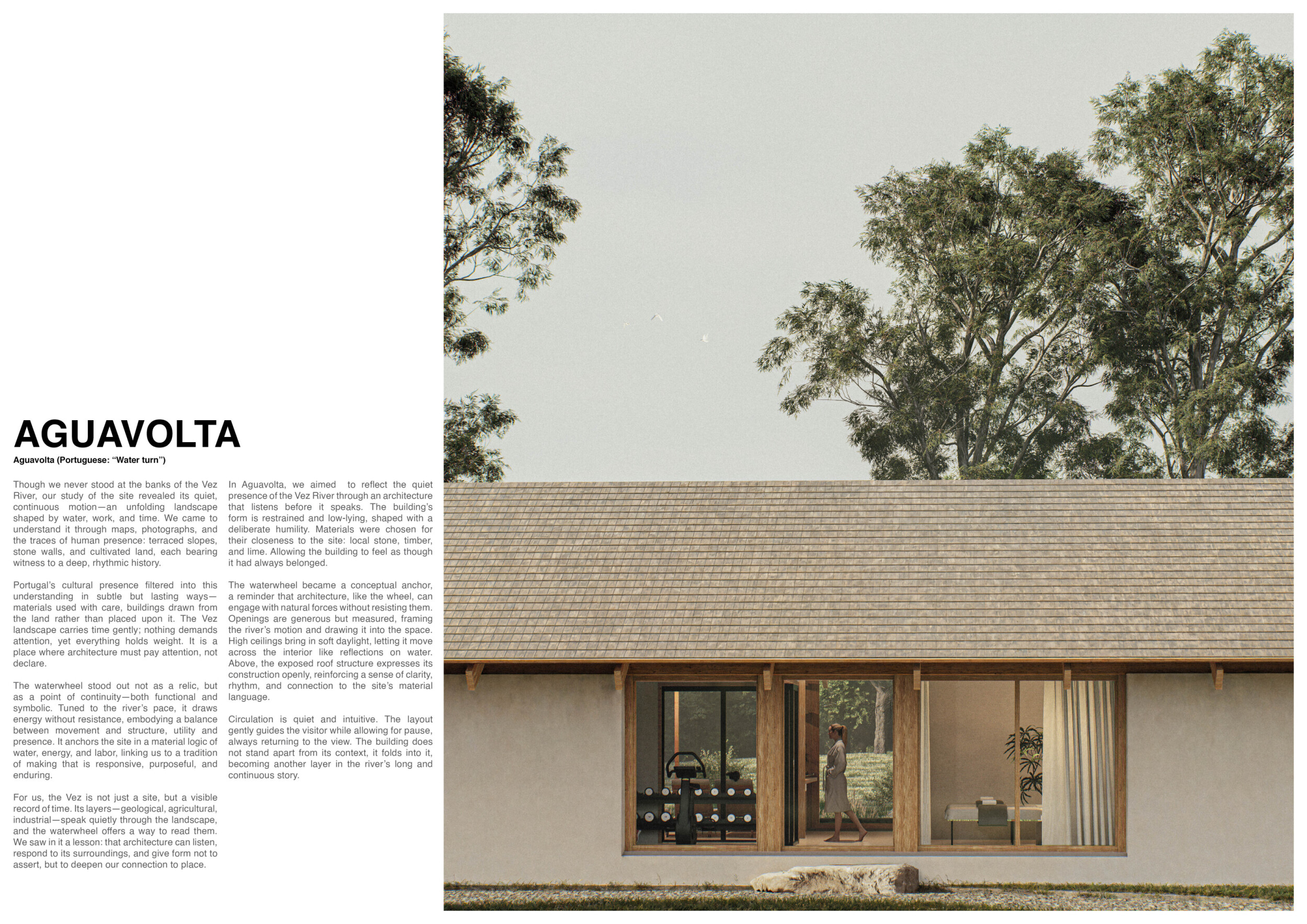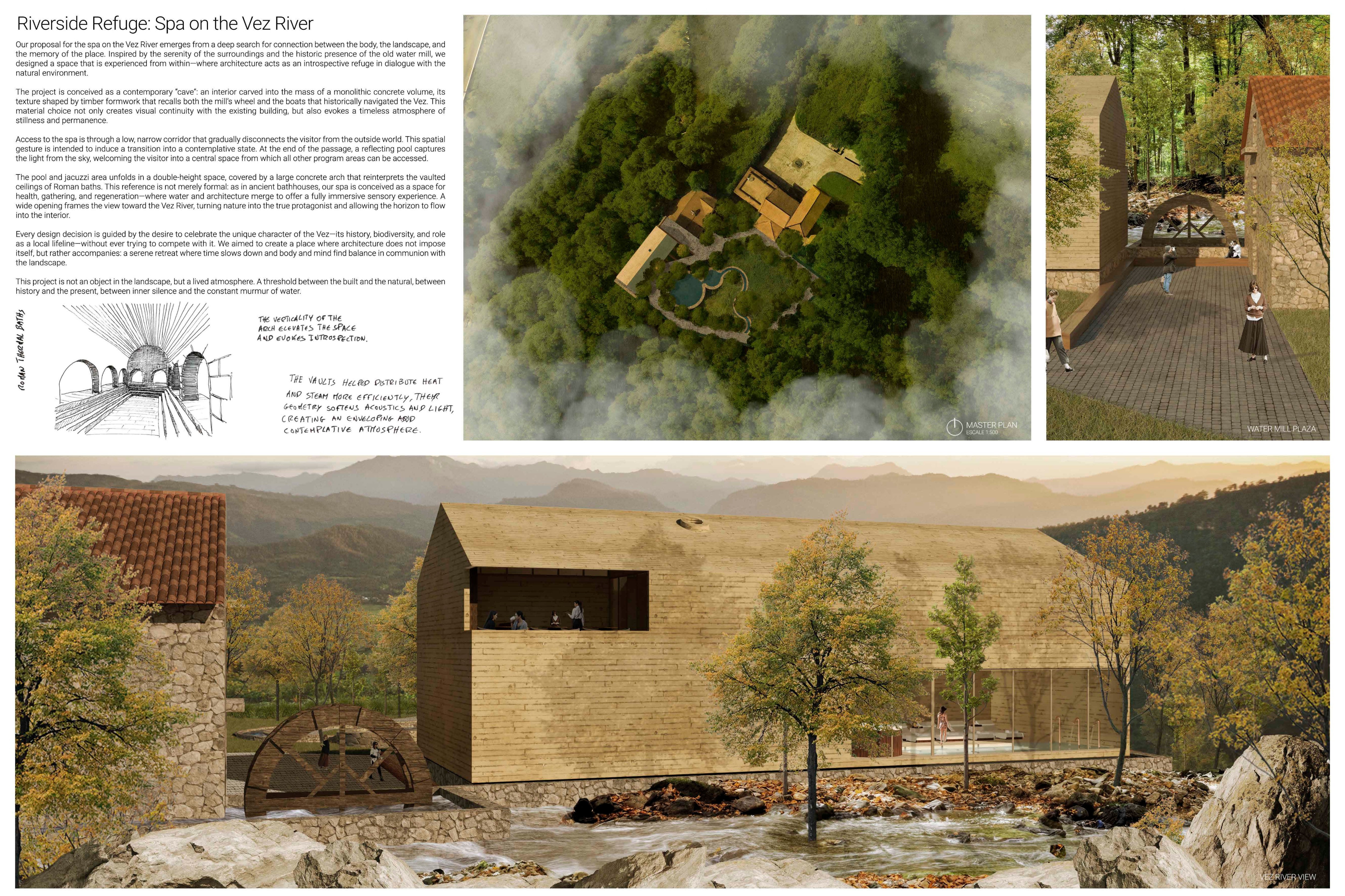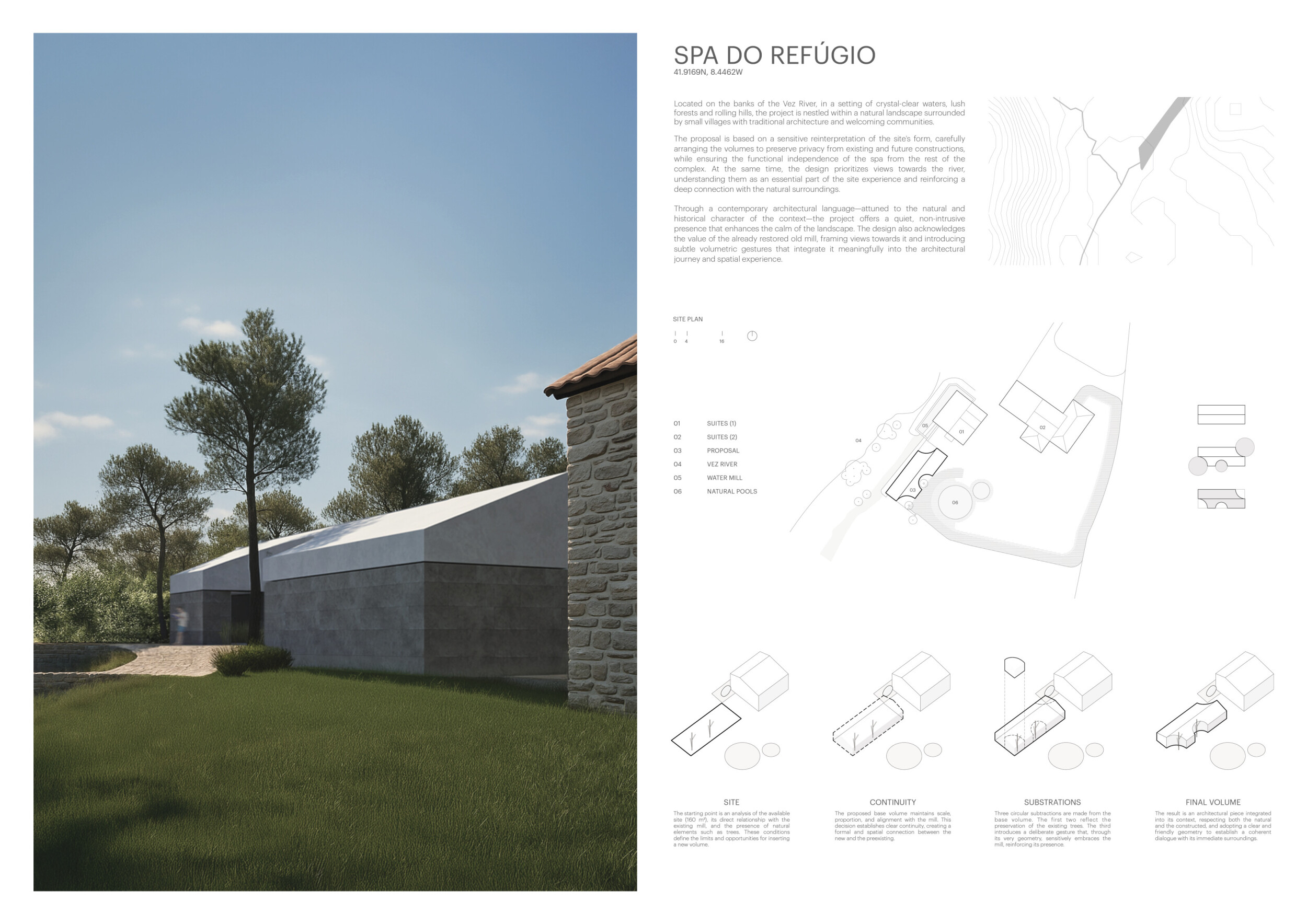 Proposals were evaluated for their ability to blend into the environment, enhance the guest experience, and embody the spirit of the Vez River—timeless, calm, and restorative. The results reflect an inspiring range of responses, from poetic interpretations of the landscape to finely crafted spatial sequences designed for relaxation and introspection.