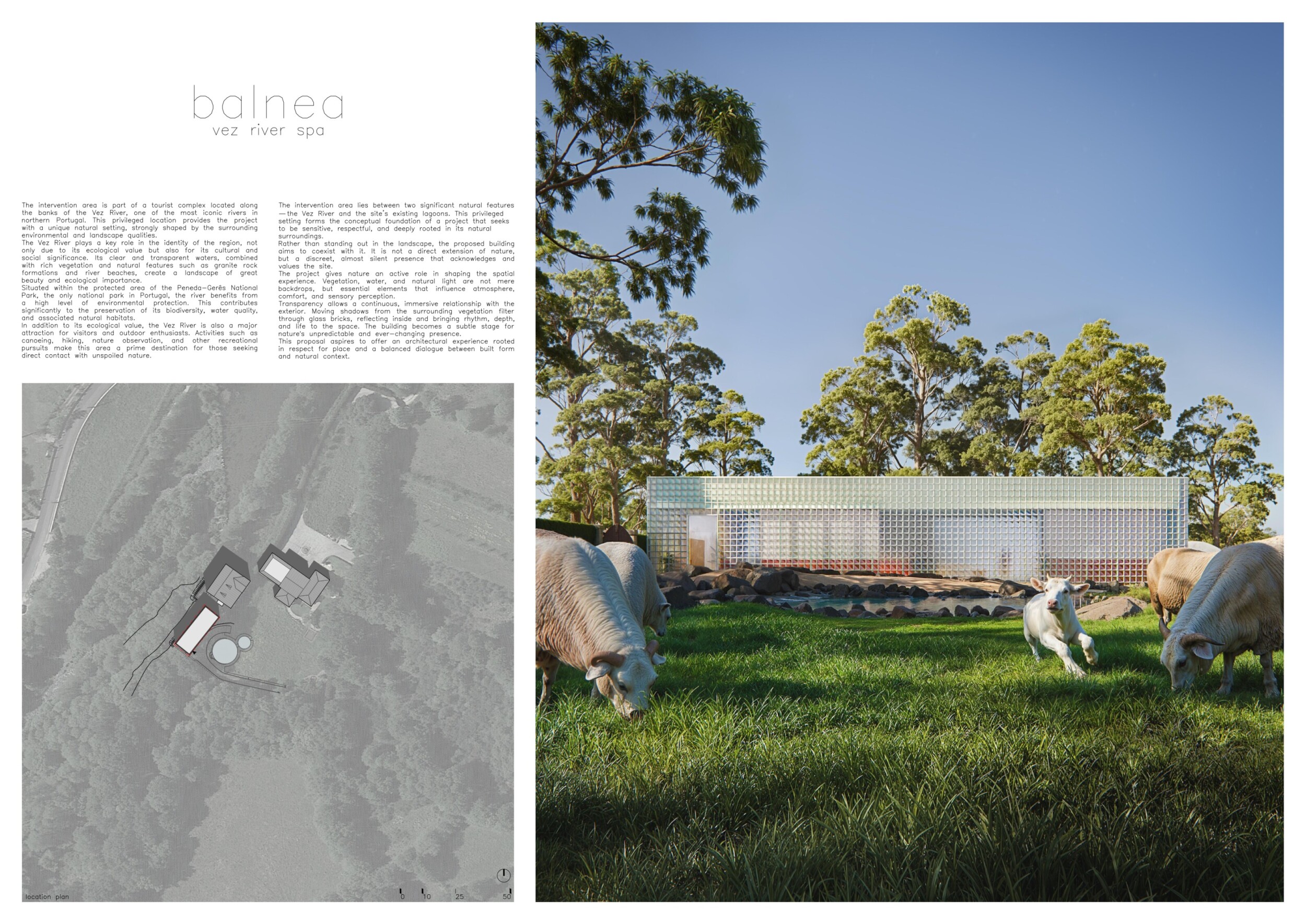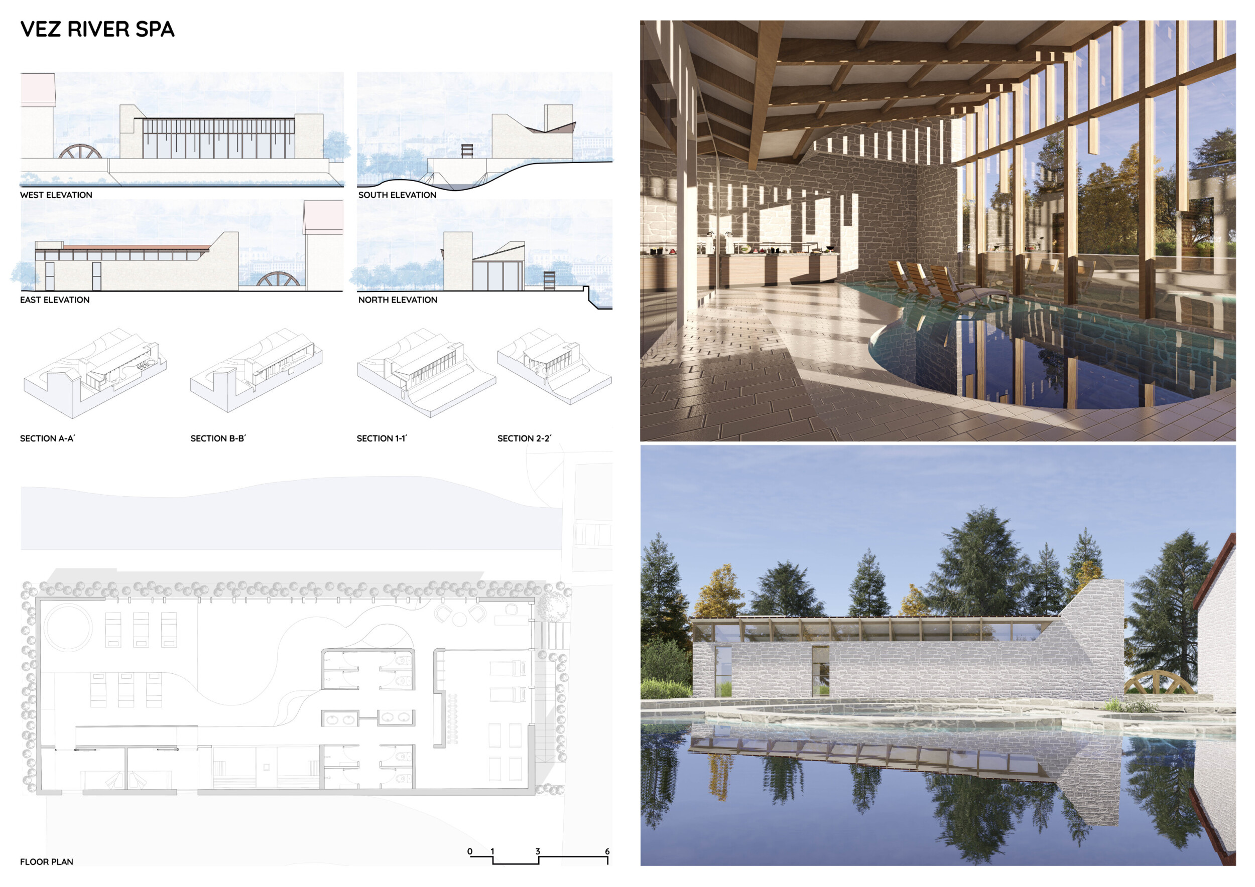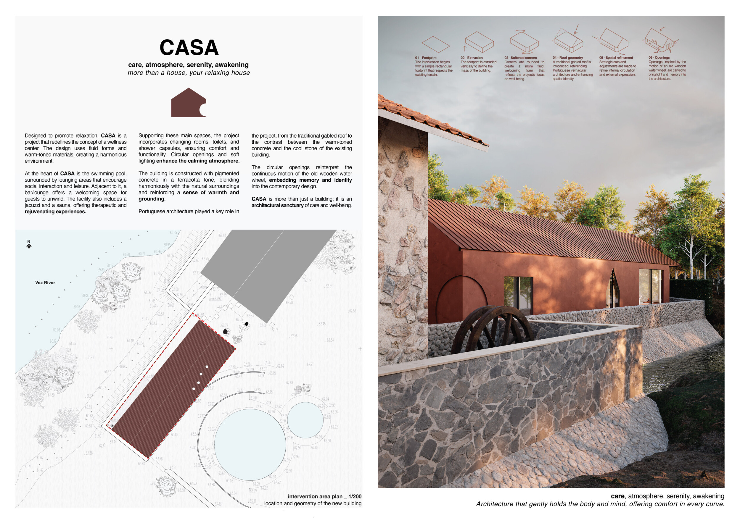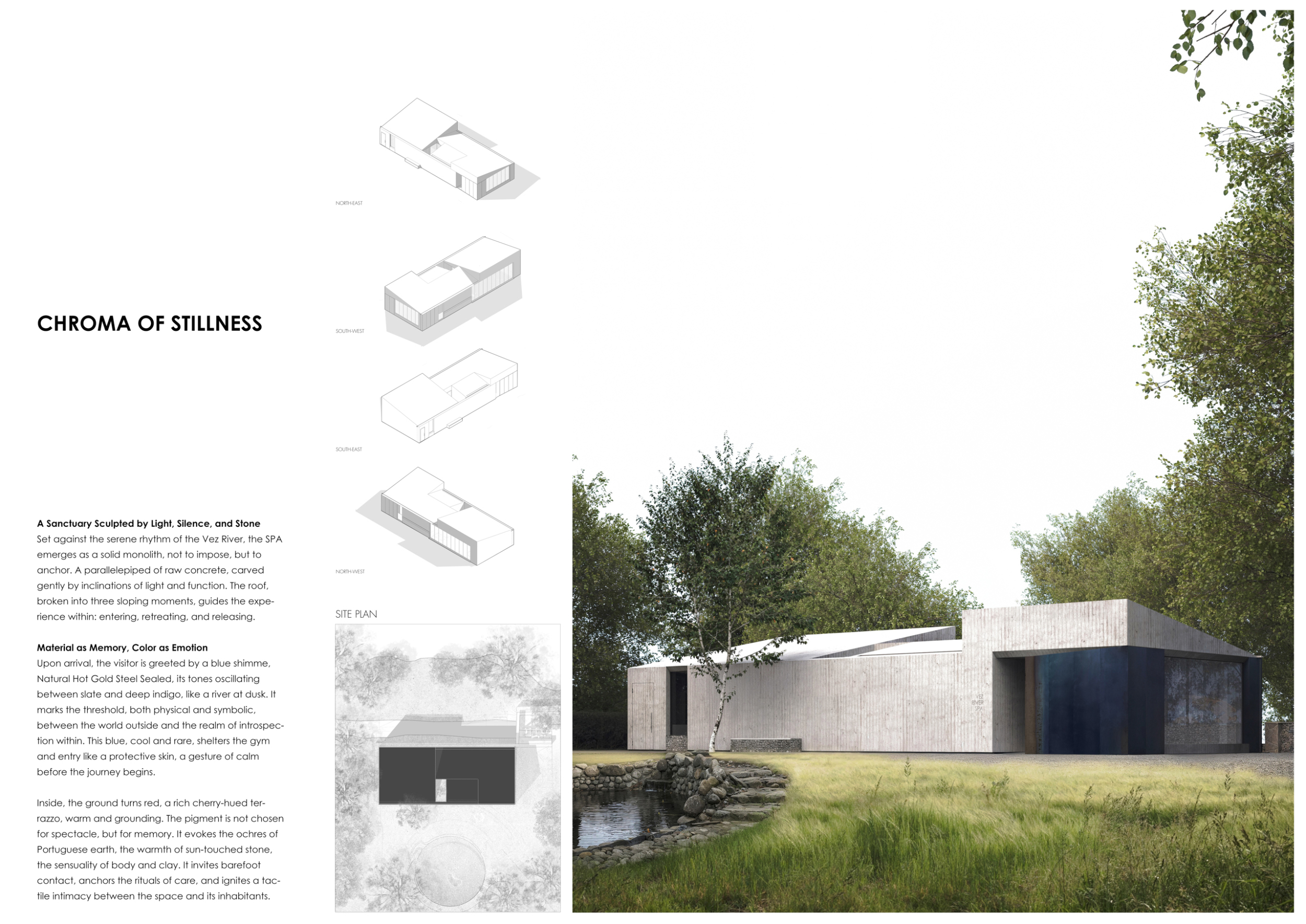 Proposals were evaluated for their ability to blend into the environment, enhance the guest experience, and embody the spirit of the Vez River—timeless, calm, and restorative. The results reflect an inspiring range of responses, from poetic interpretations of the landscape to finely crafted spatial sequences designed for relaxation and introspection.