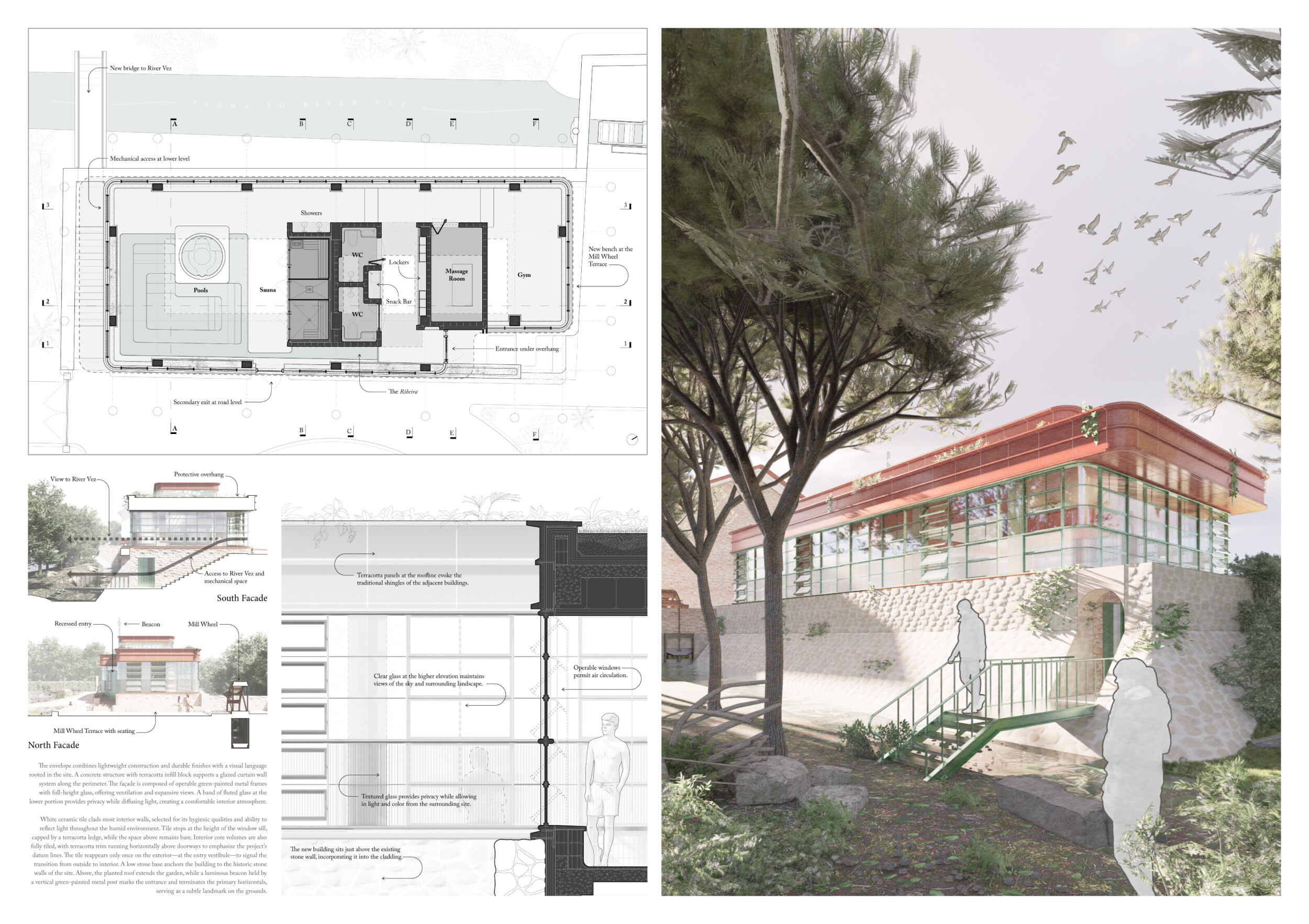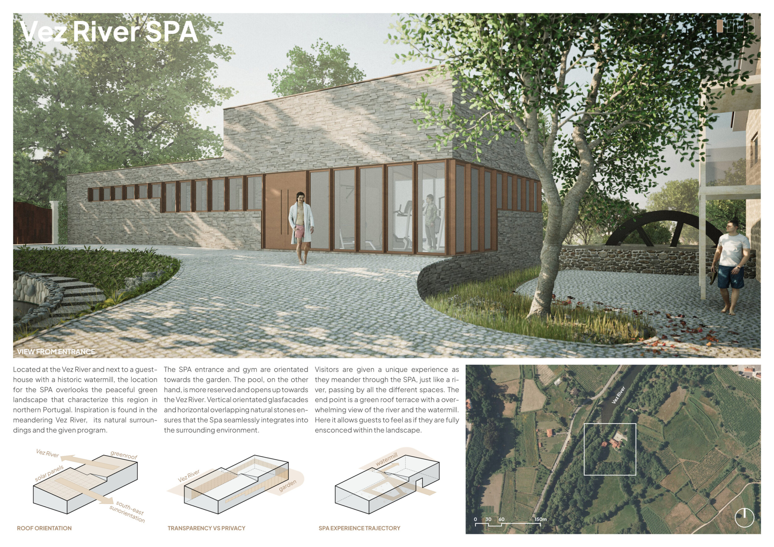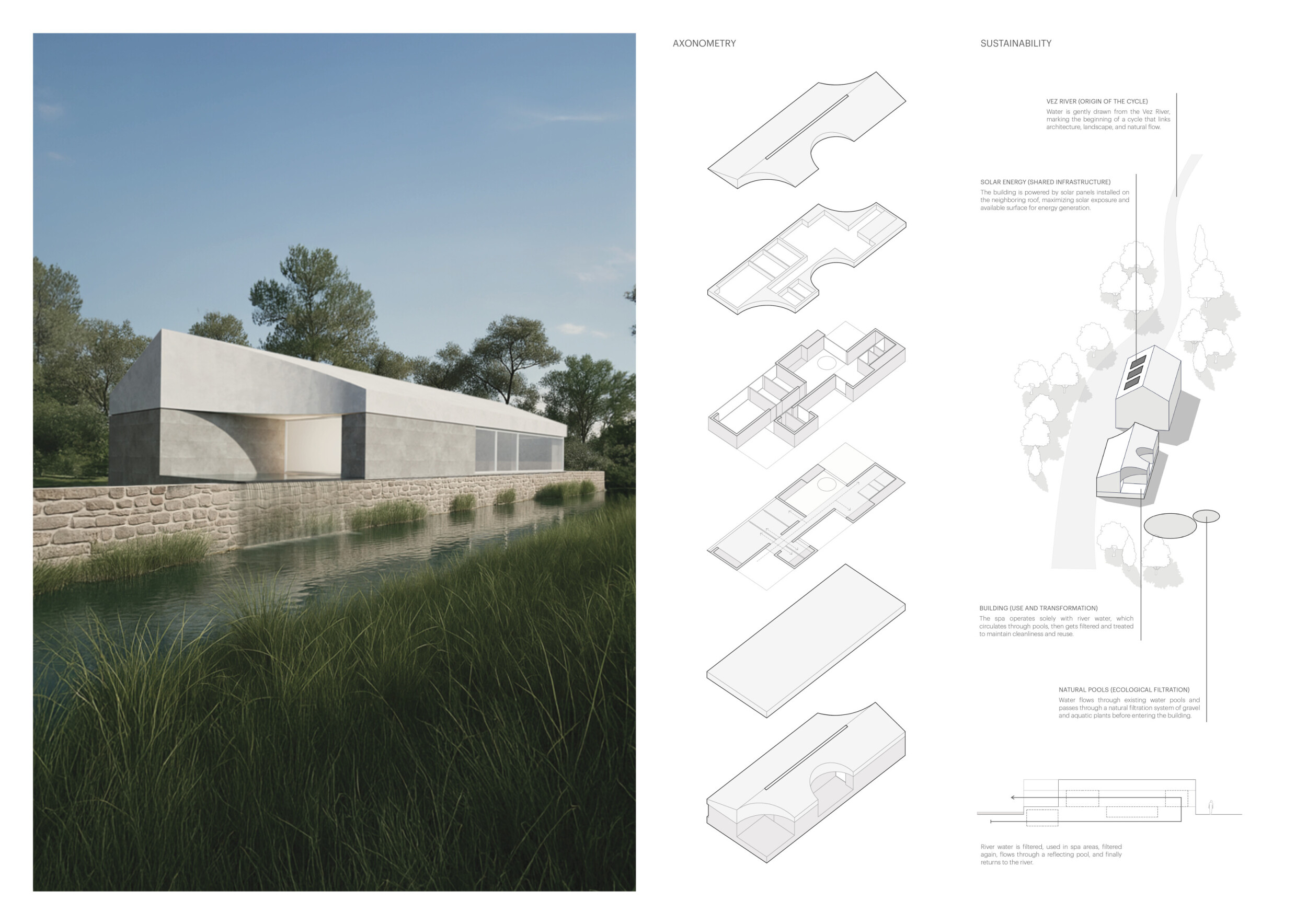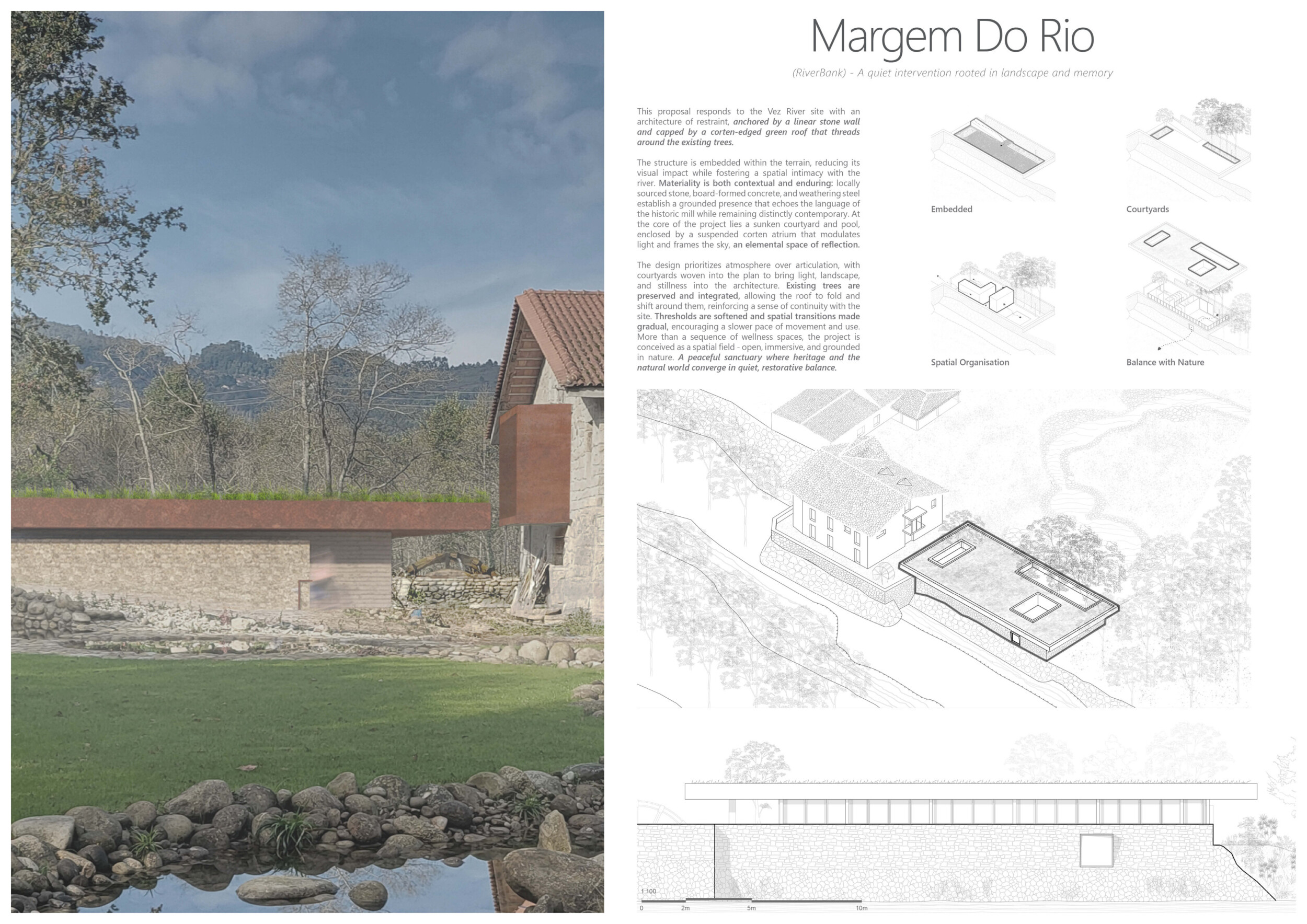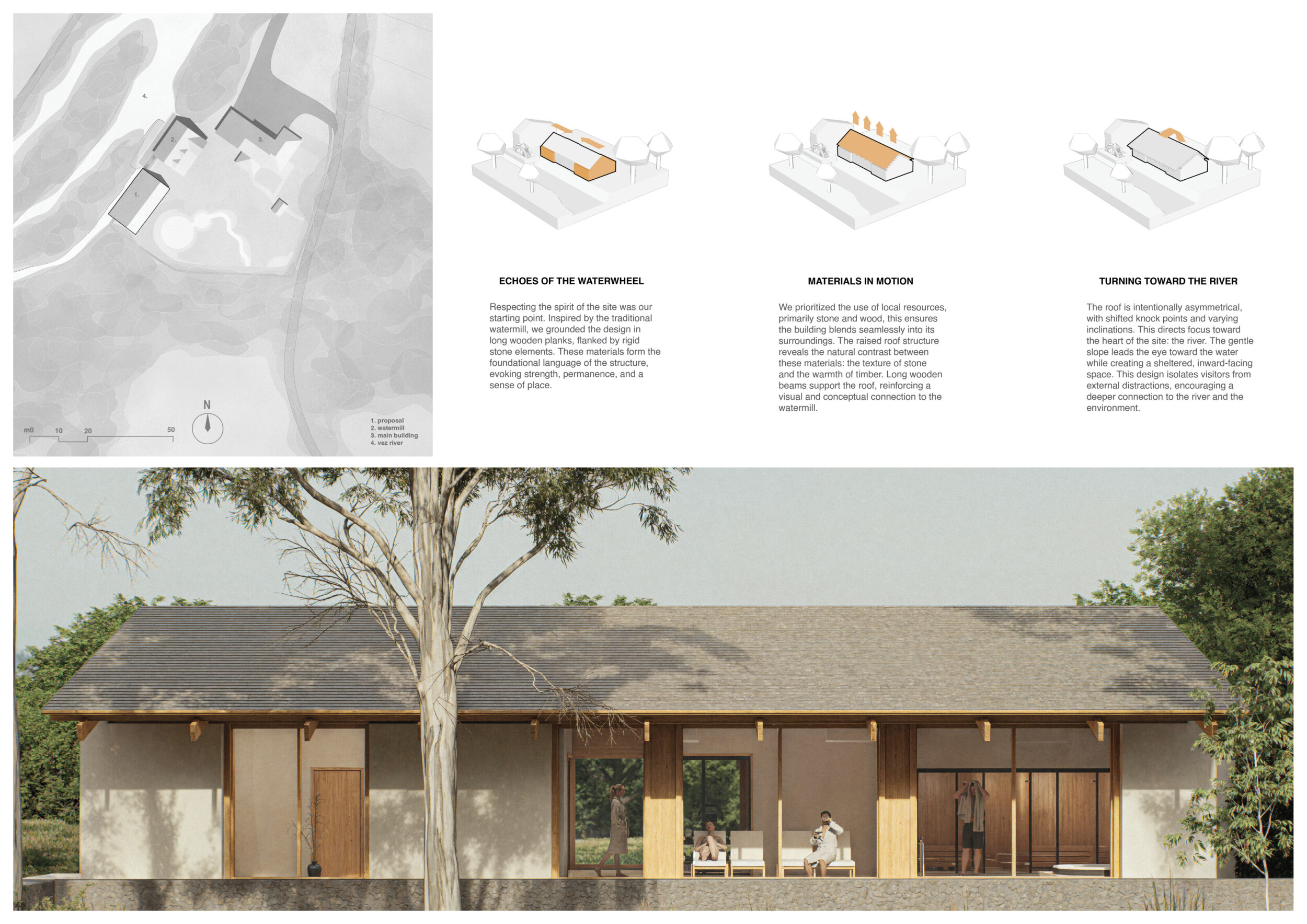 Proposals were evaluated for their ability to blend into the environment, enhance the guest experience, and embody the spirit of the Vez River—timeless, calm, and restorative. The results reflect an inspiring range of responses, from poetic interpretations of the landscape to finely crafted spatial sequences designed for relaxation and introspection.