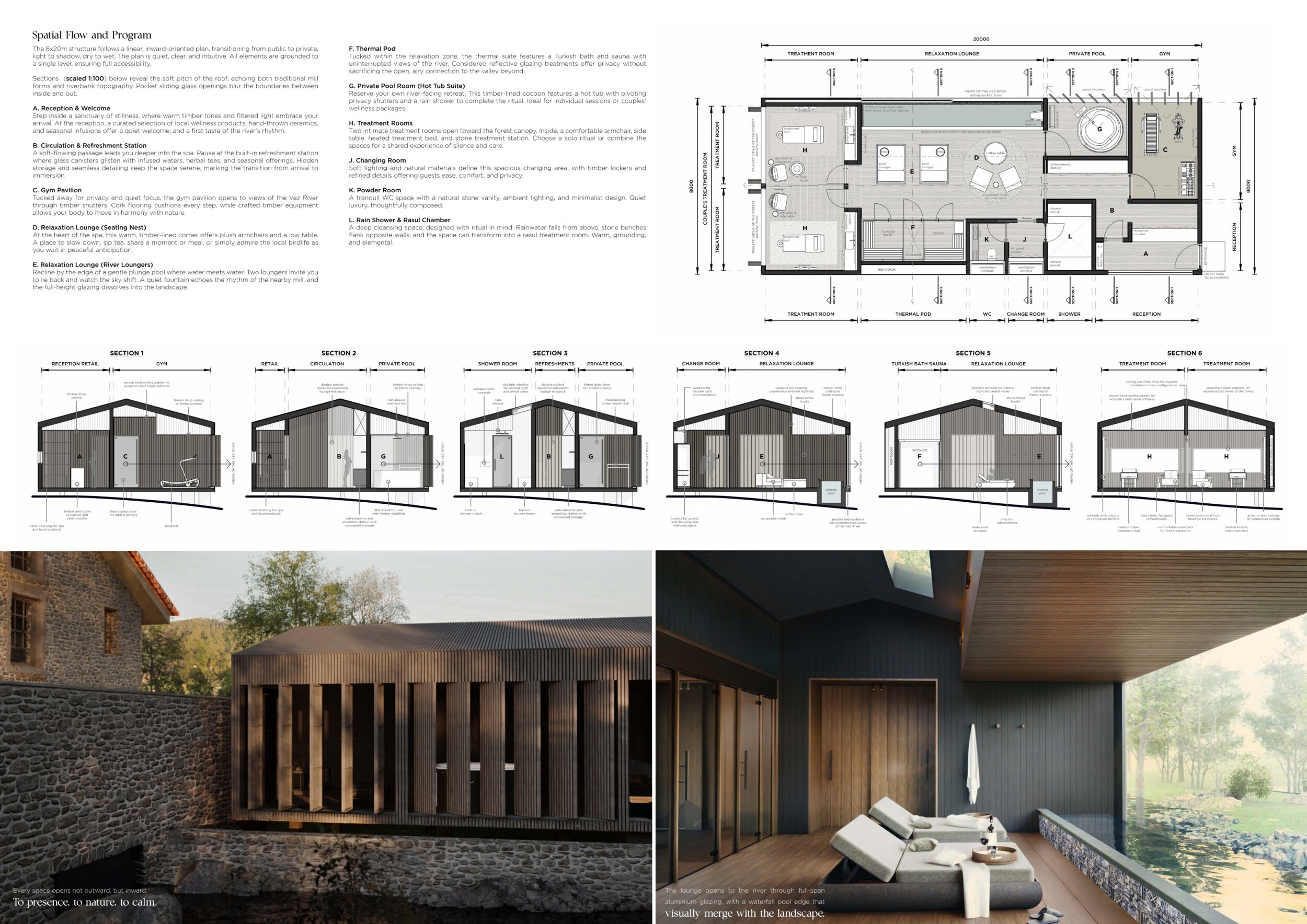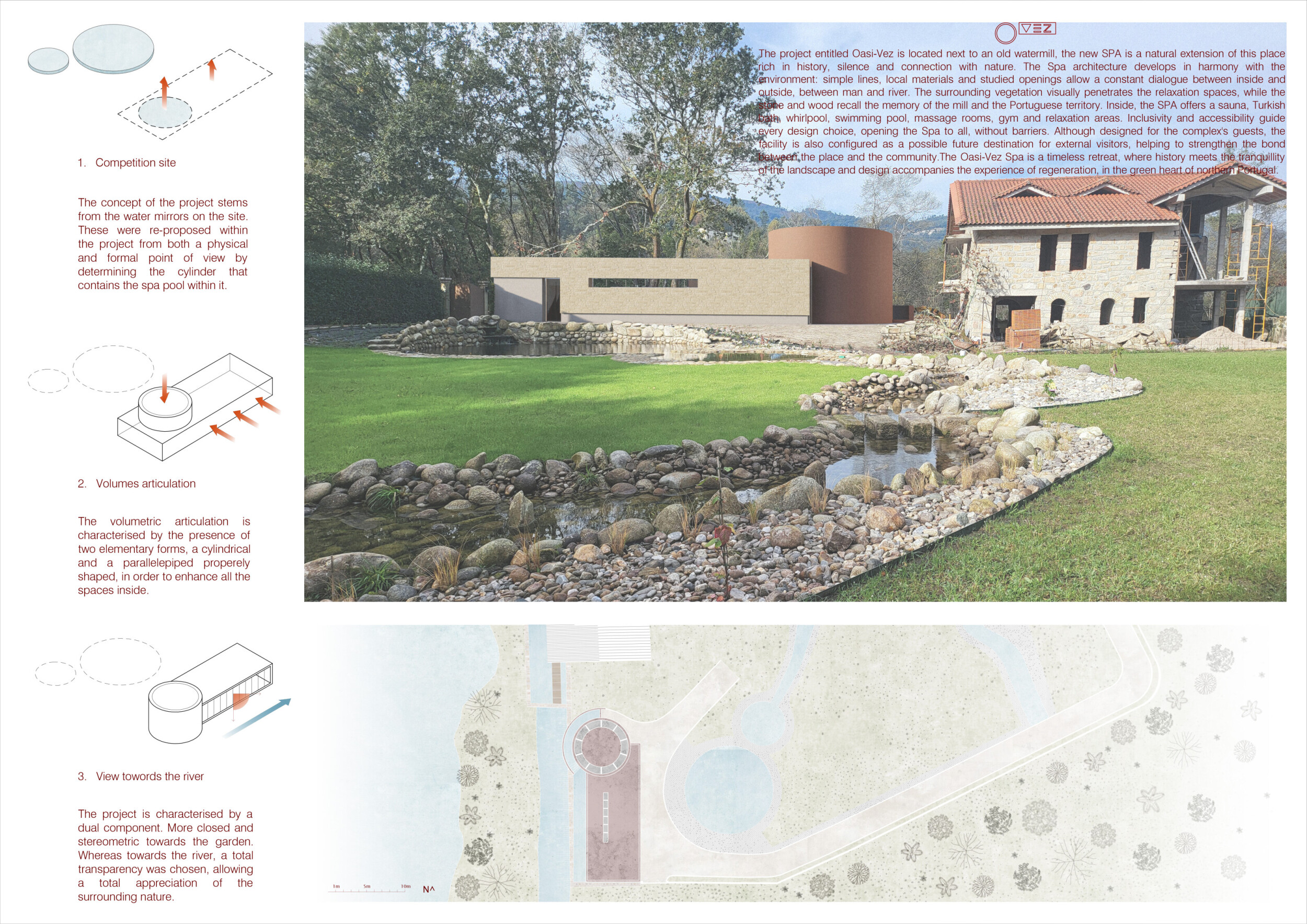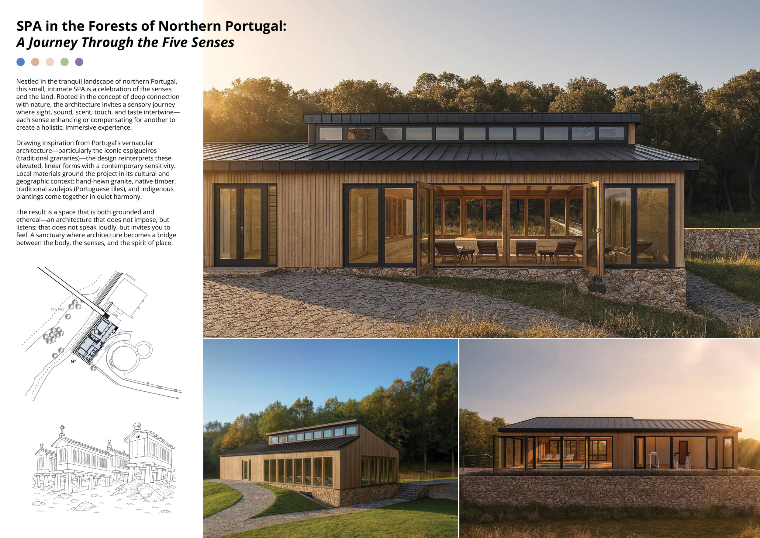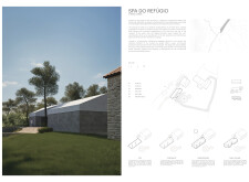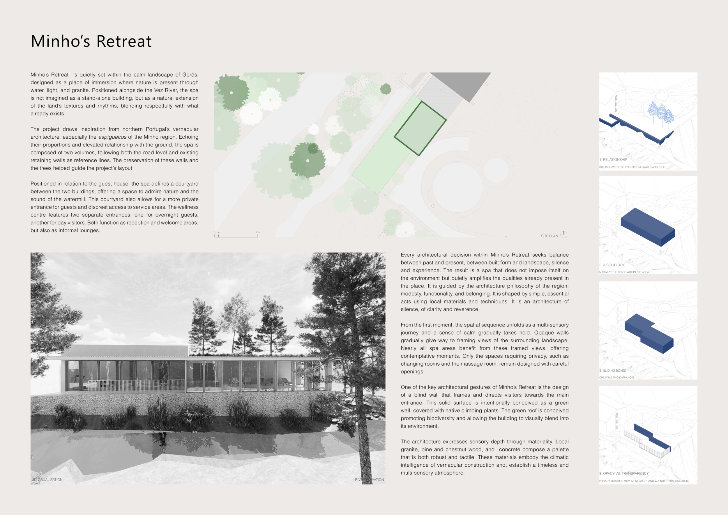 Proposals were evaluated for their ability to blend into the environment, enhance the guest experience, and embody the spirit of the Vez River—timeless, calm, and restorative. The results reflect an inspiring range of responses, from poetic interpretations of the landscape to finely crafted spatial sequences designed for relaxation and introspection.