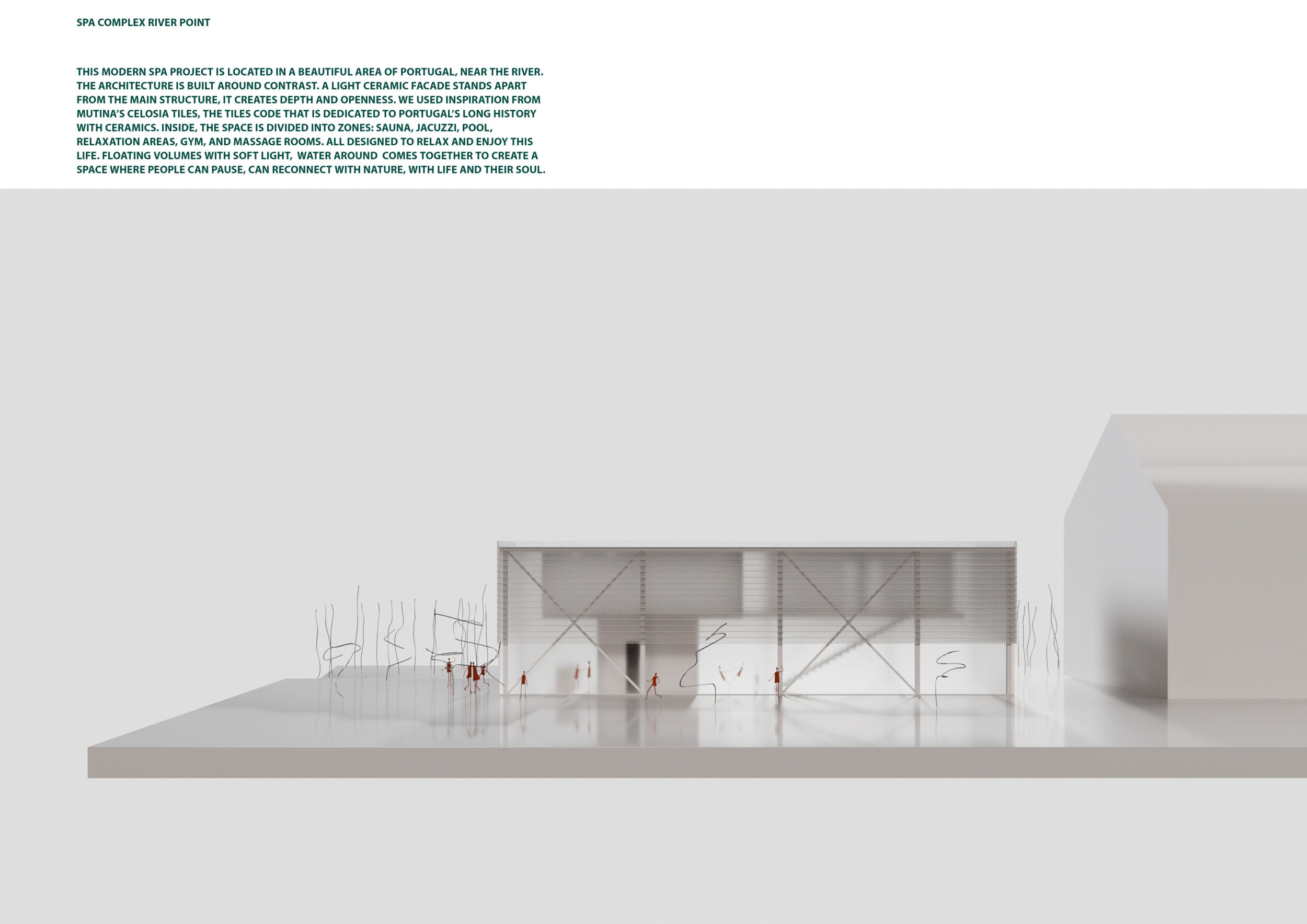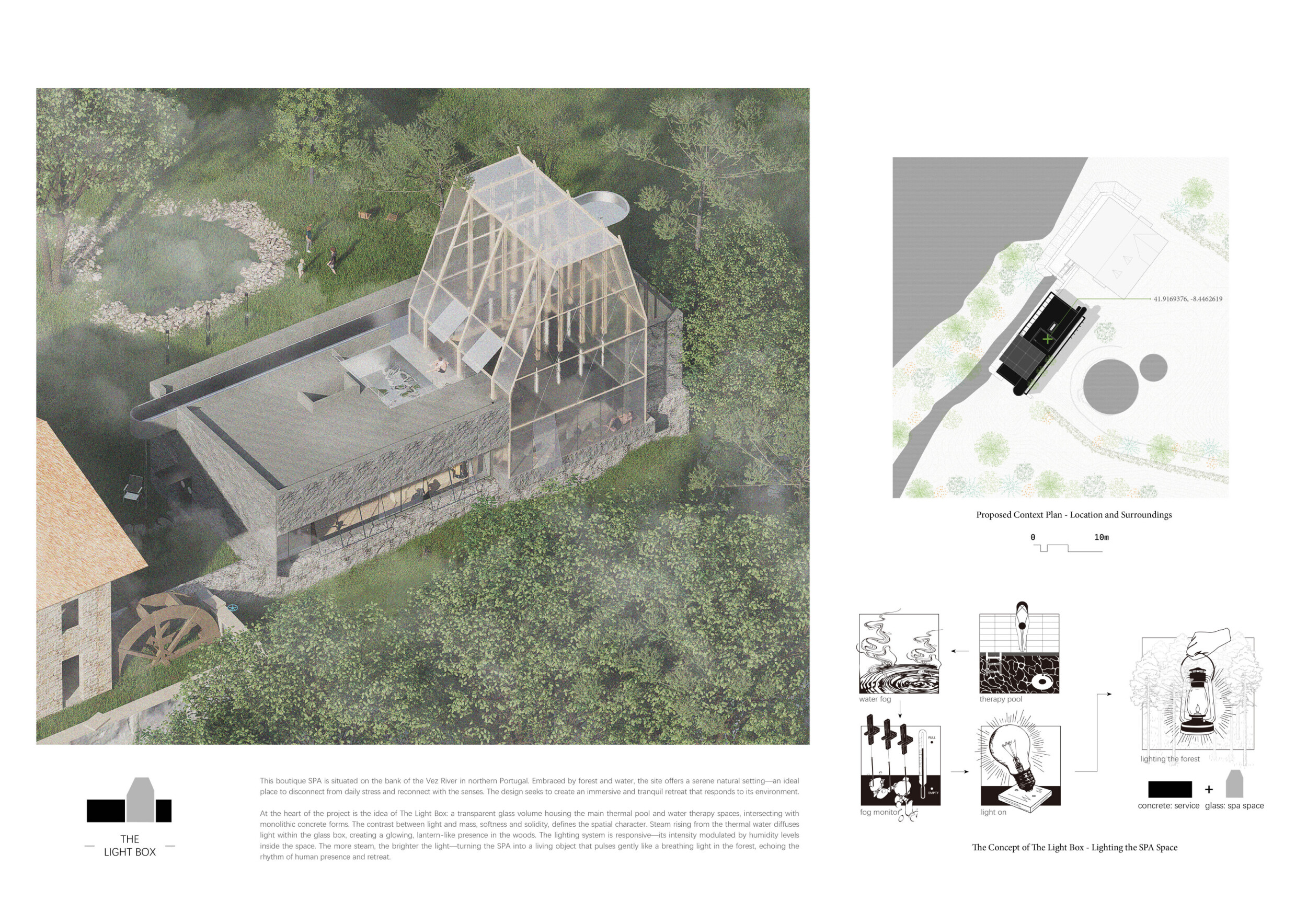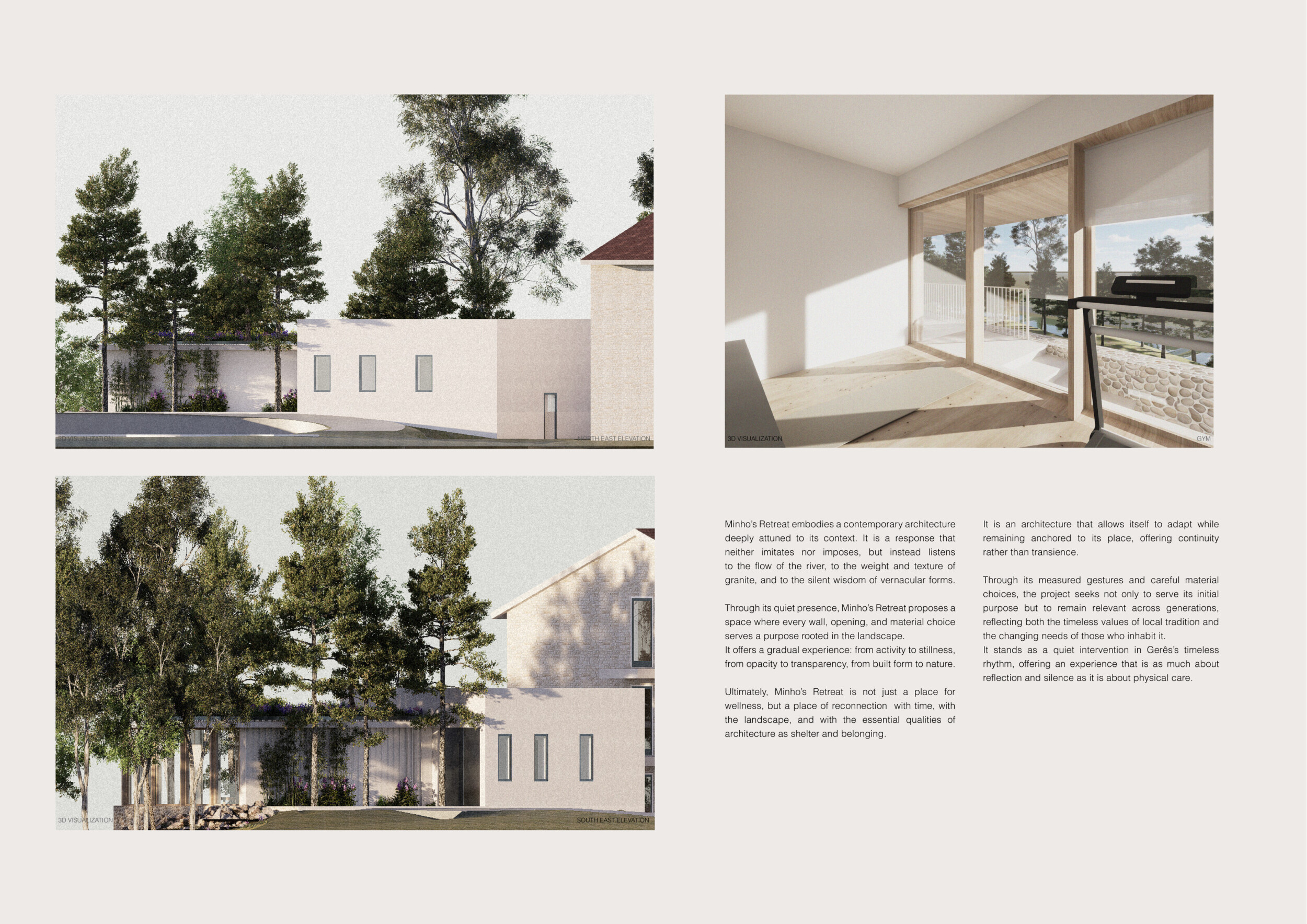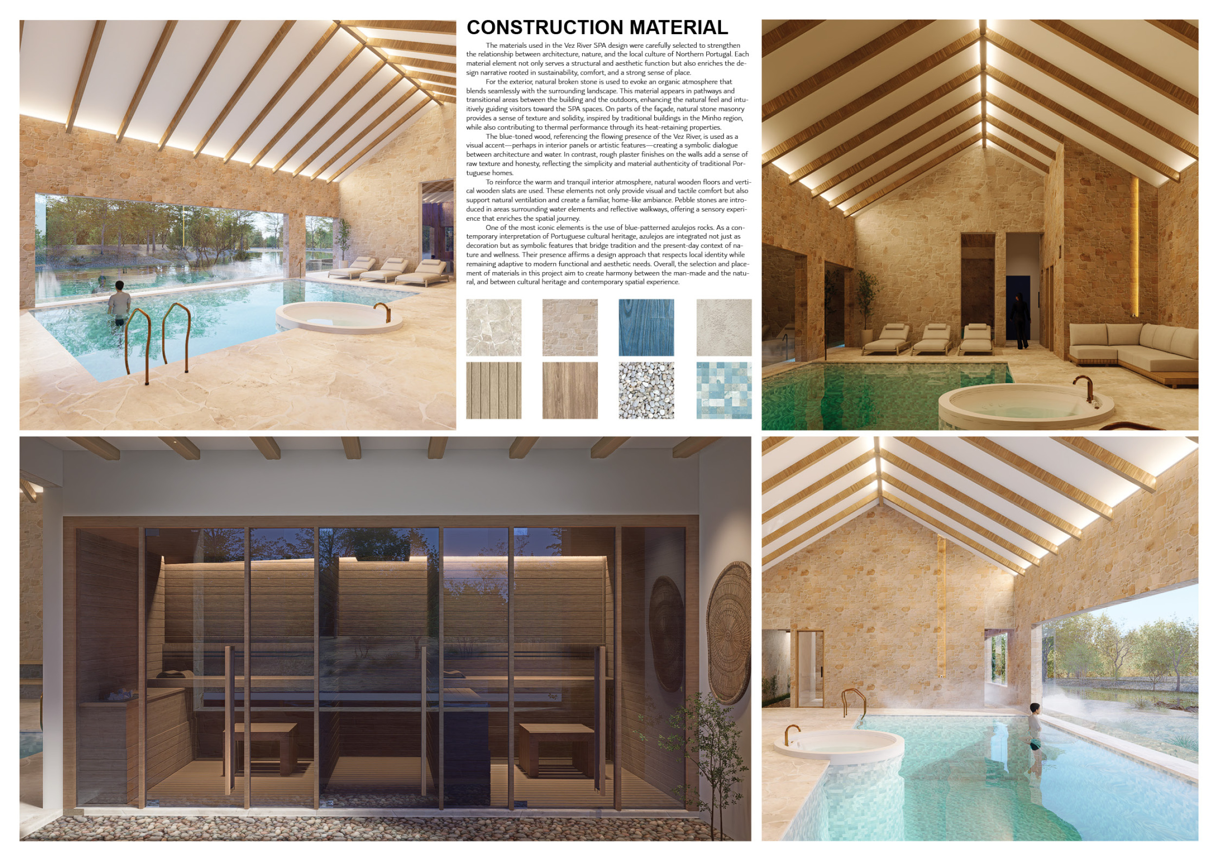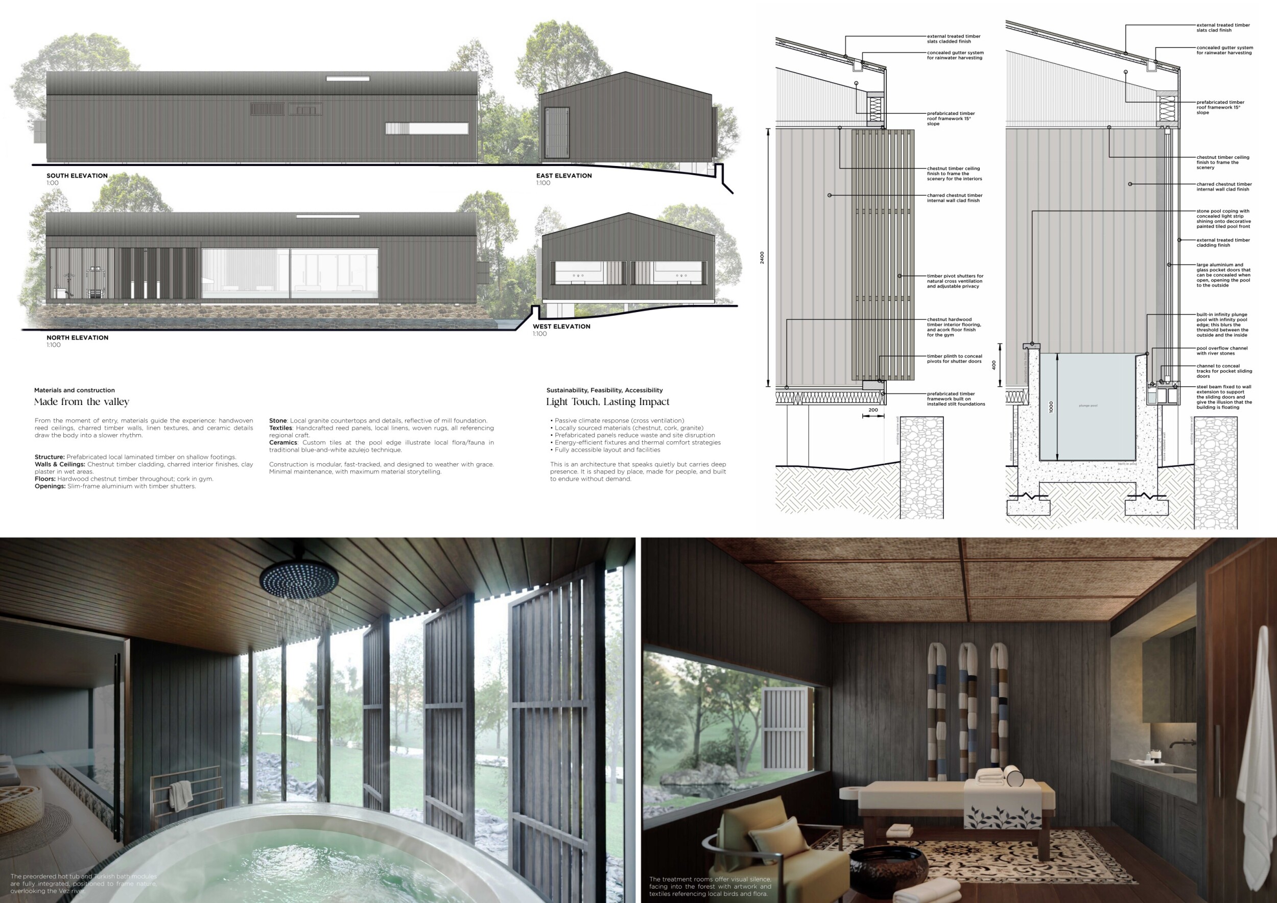 Proposals were evaluated for their ability to blend into the environment, enhance the guest experience, and embody the spirit of the Vez River—timeless, calm, and restorative. The results reflect an inspiring range of responses, from poetic interpretations of the landscape to finely crafted spatial sequences designed for relaxation and introspection.