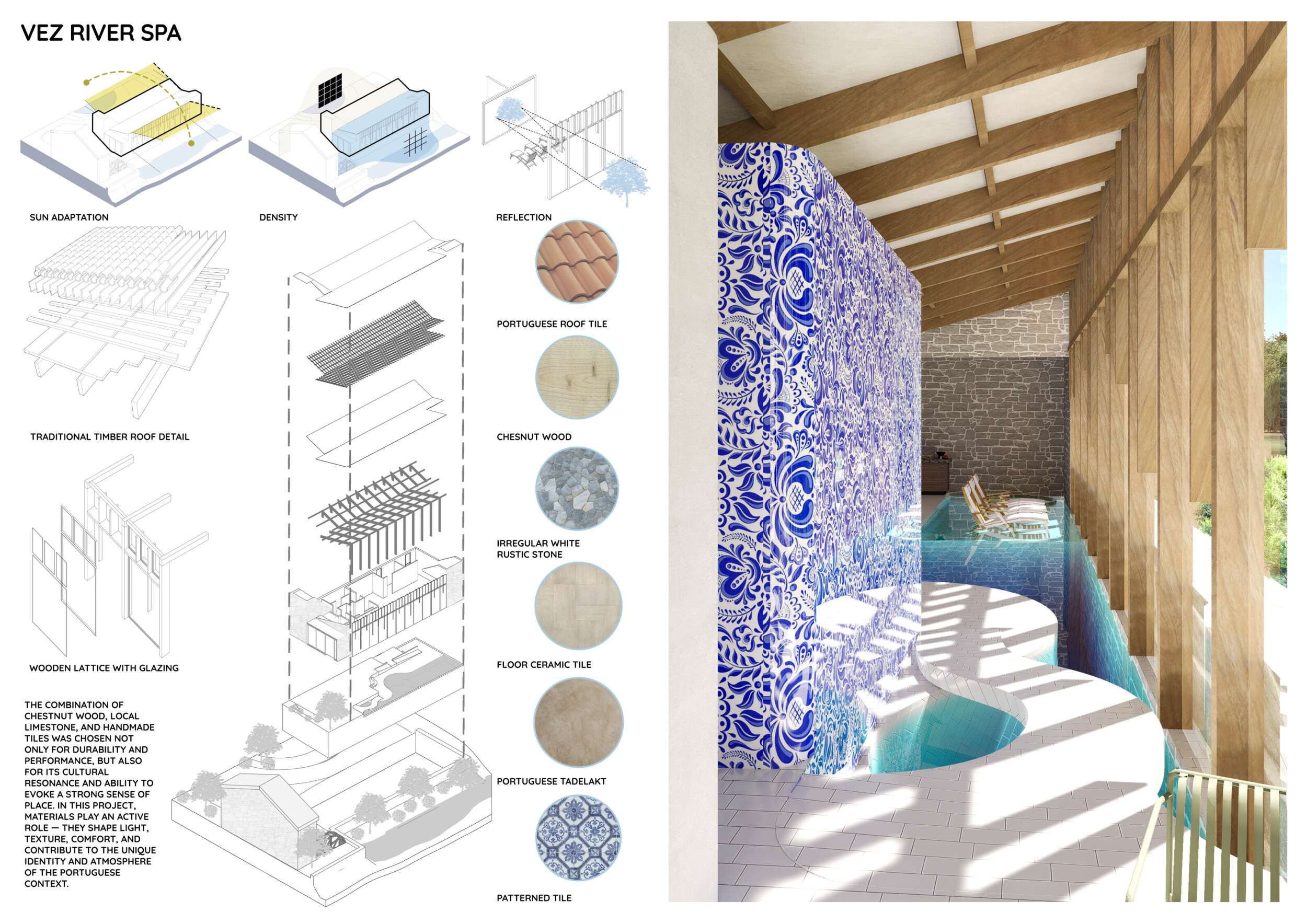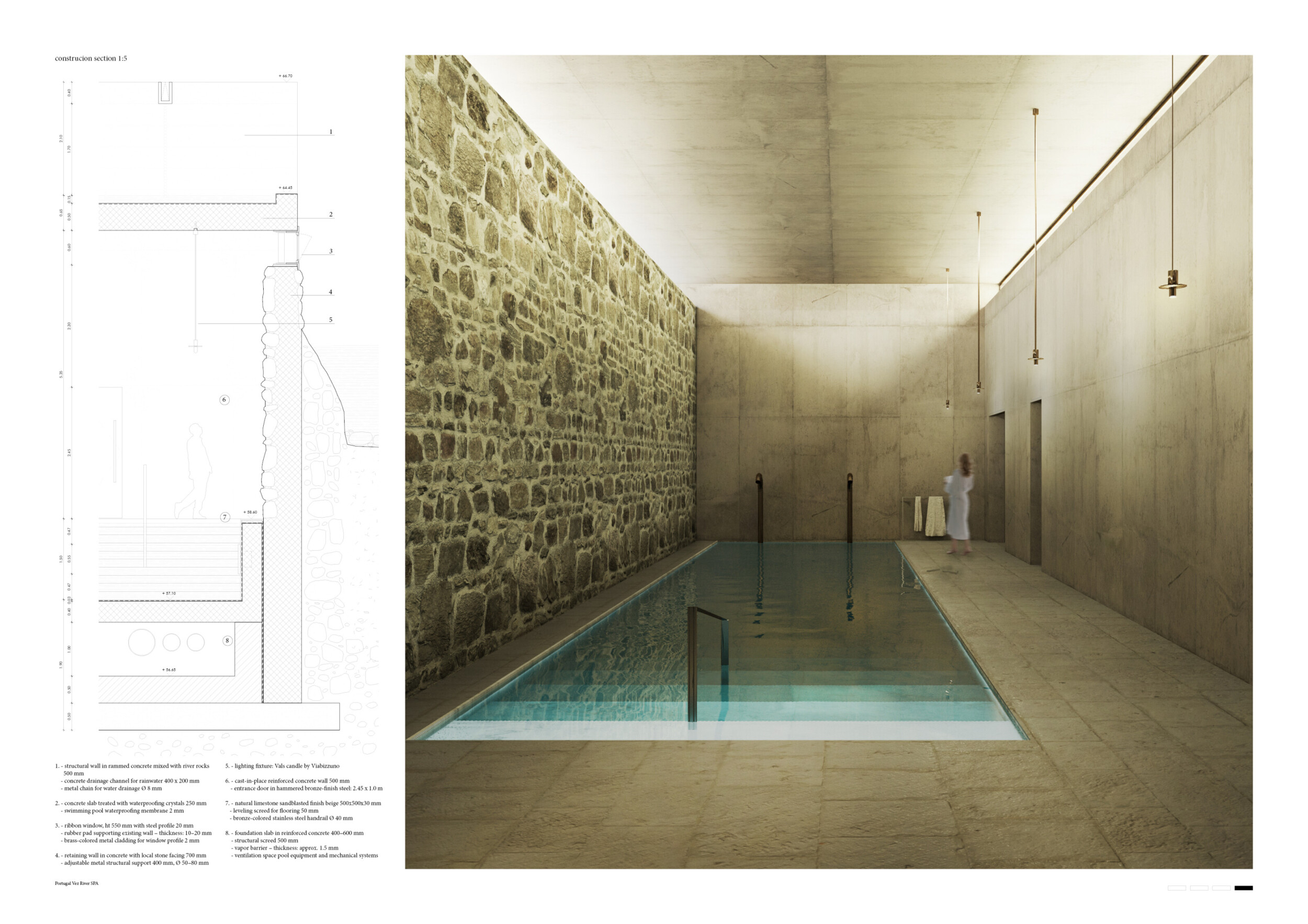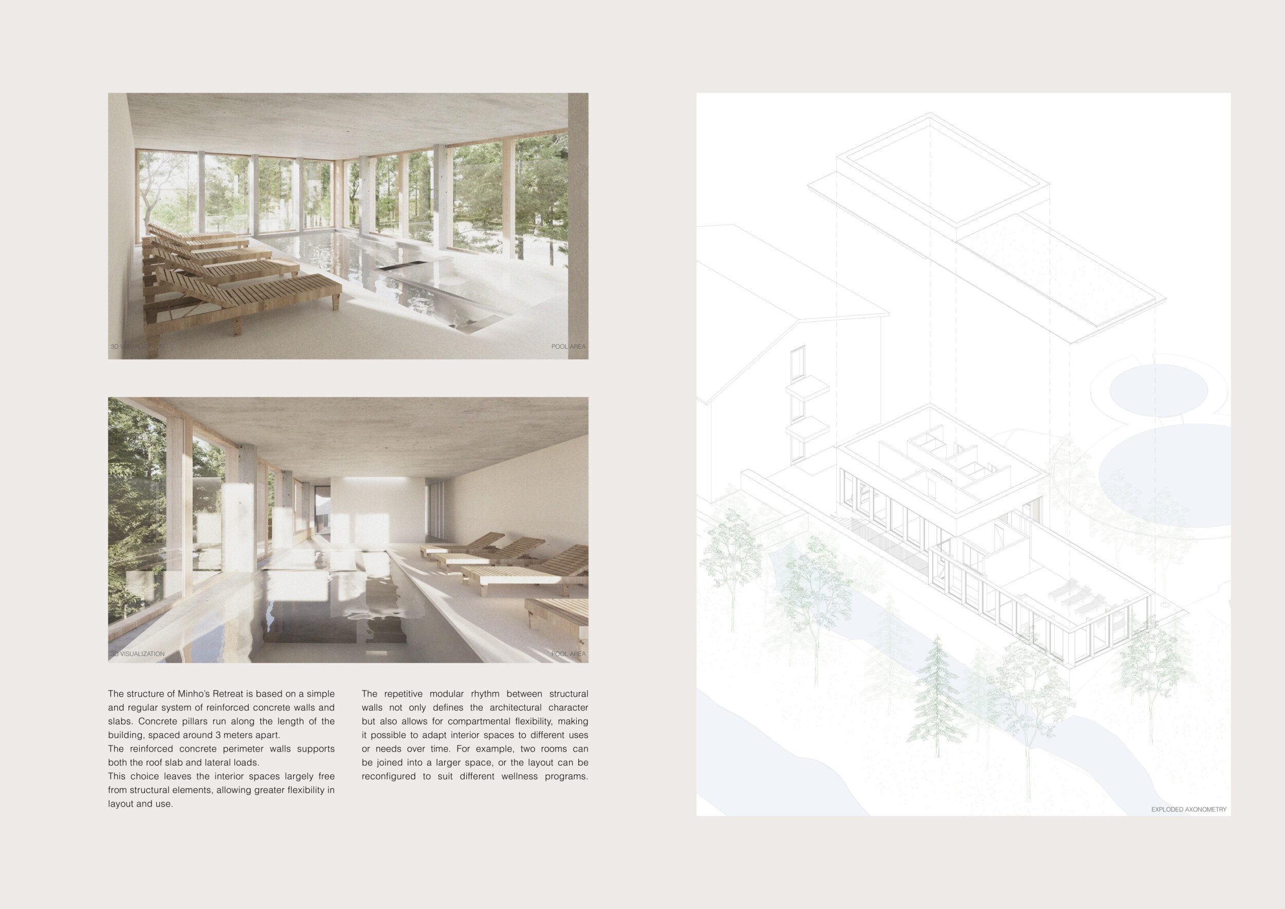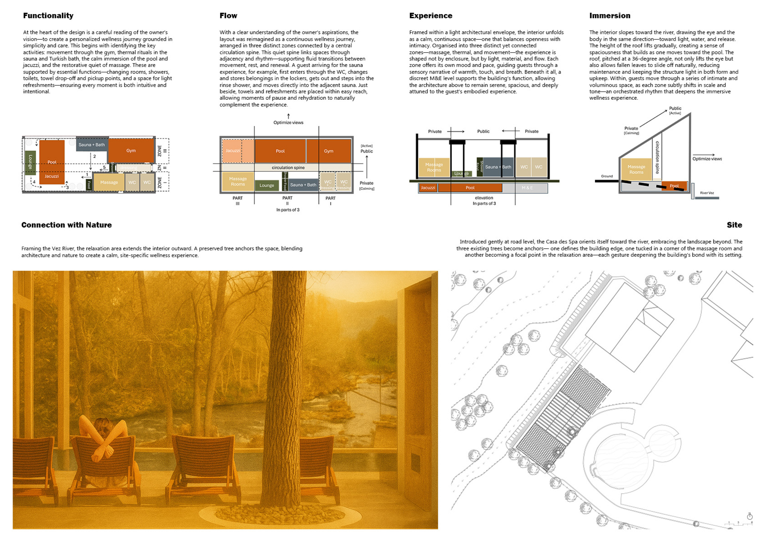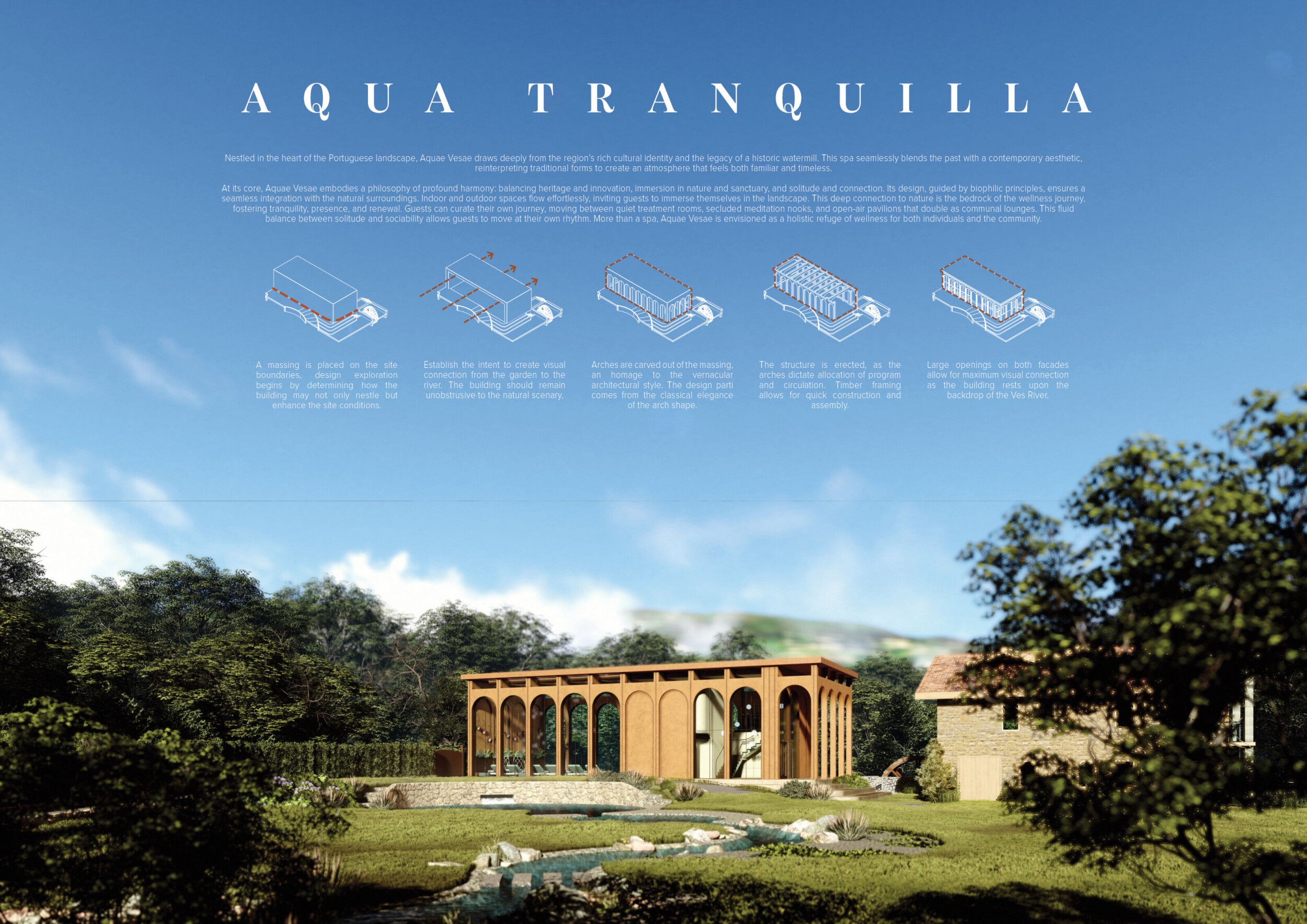 Proposals were evaluated for their ability to blend into the environment, enhance the guest experience, and embody the spirit of the Vez River—timeless, calm, and restorative. The results reflect an inspiring range of responses, from poetic interpretations of the landscape to finely crafted spatial sequences designed for relaxation and introspection.