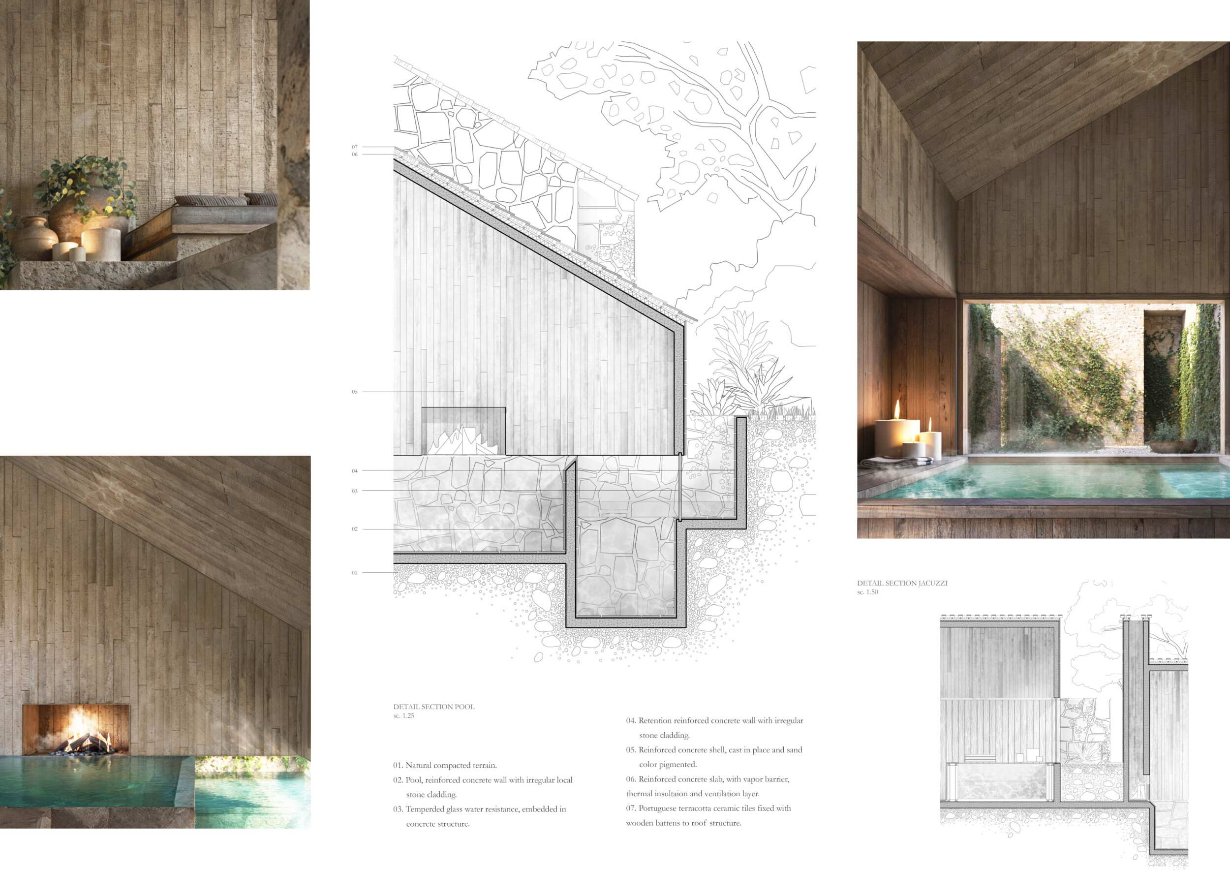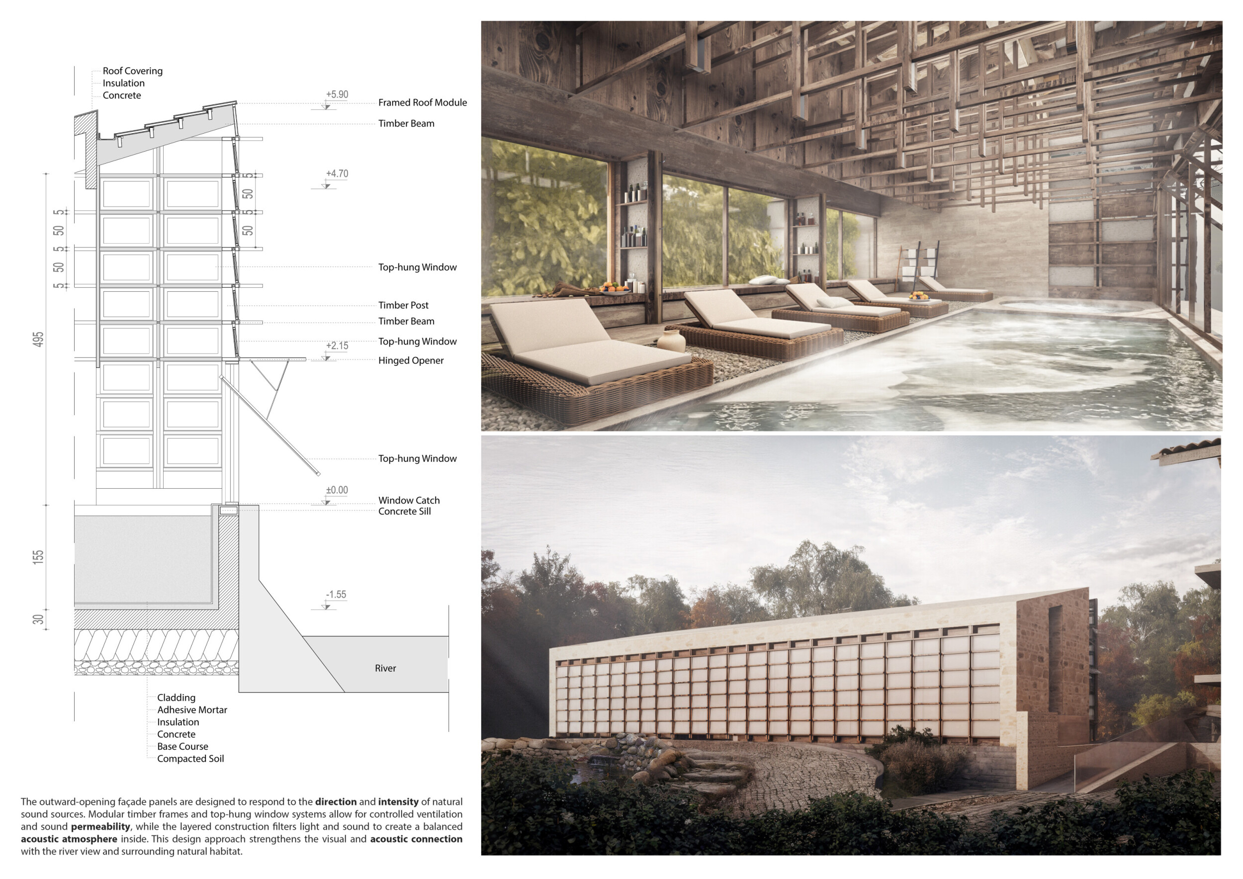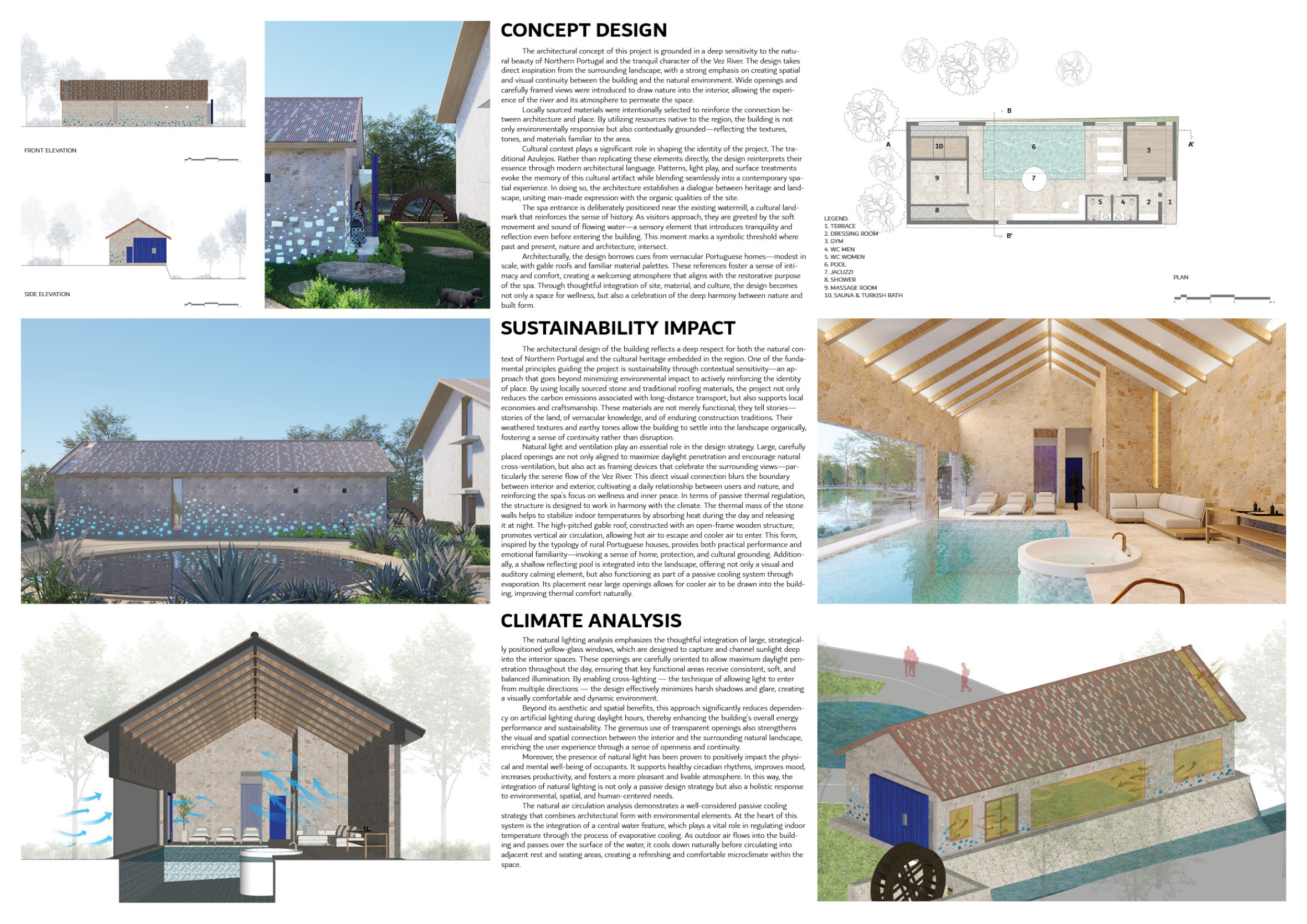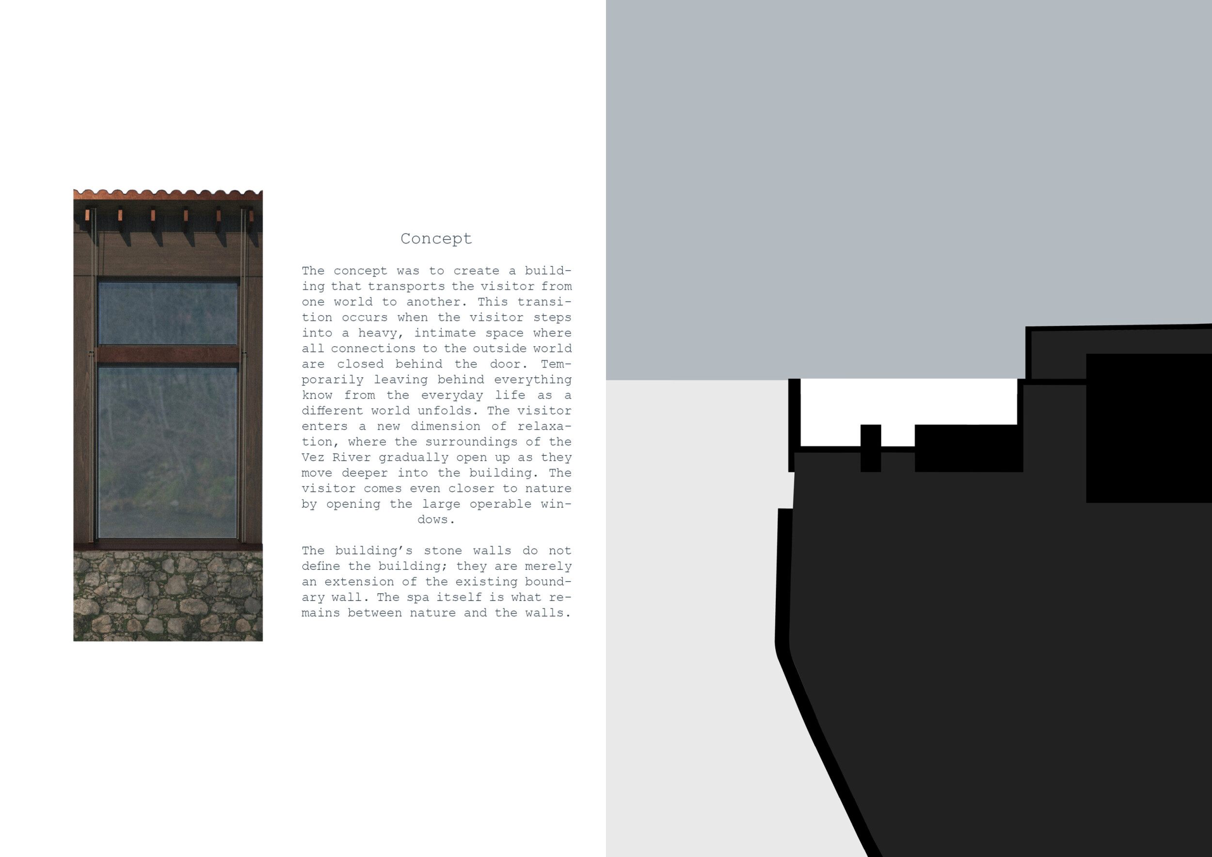 Proposals were evaluated for their ability to blend into the environment, enhance the guest experience, and embody the spirit of the Vez River—timeless, calm, and restorative. The results reflect an inspiring range of responses, from poetic interpretations of the landscape to finely crafted spatial sequences designed for relaxation and introspection.