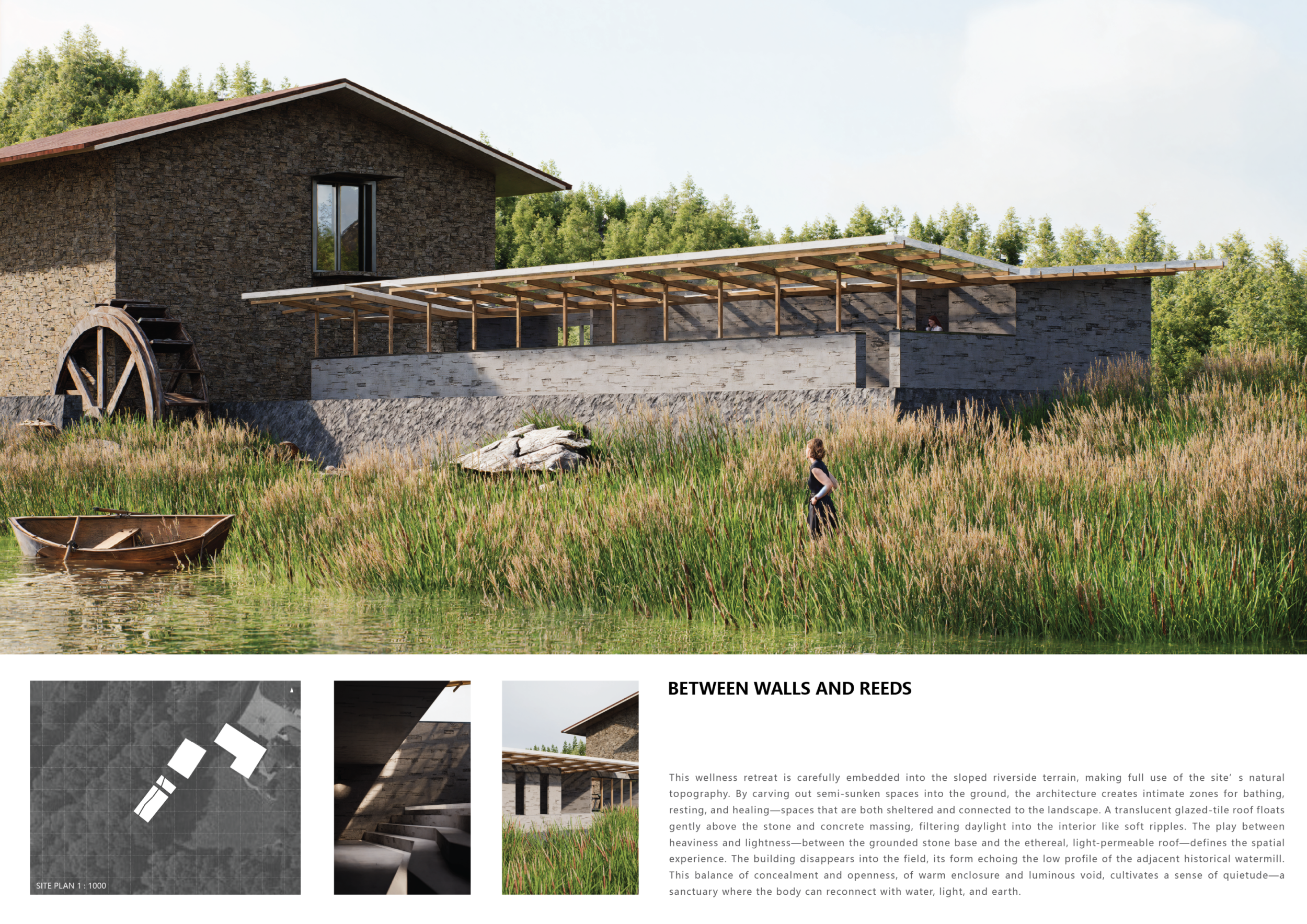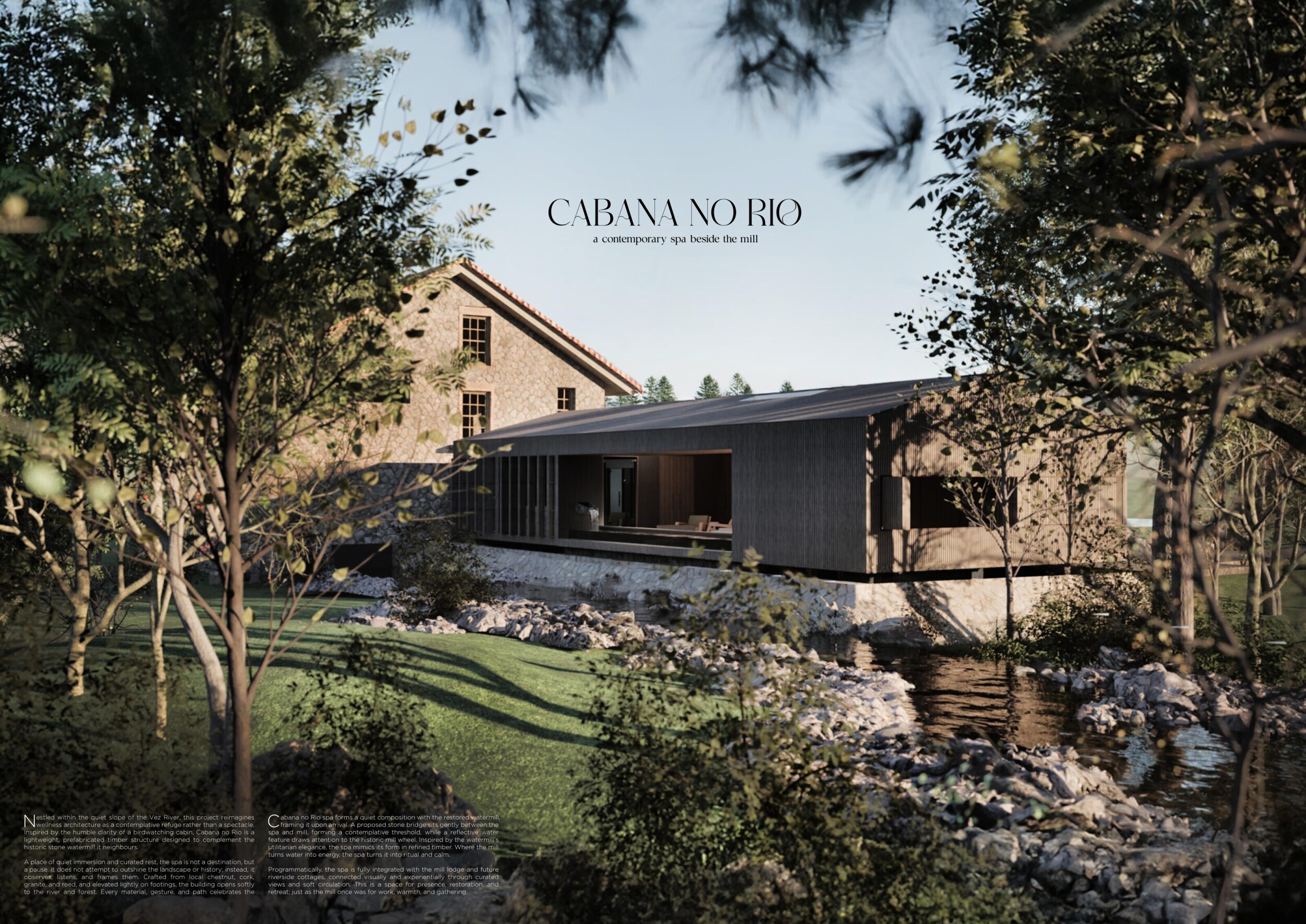 This international competition invited architects to design a boutique wellness retreat along the serene banks of the Vez River in northern Portugal. The project challenged participants to propose a space of tranquility and renewal that would harmonize with its extraordinary natural setting and complement a restored historic watermill already on site.