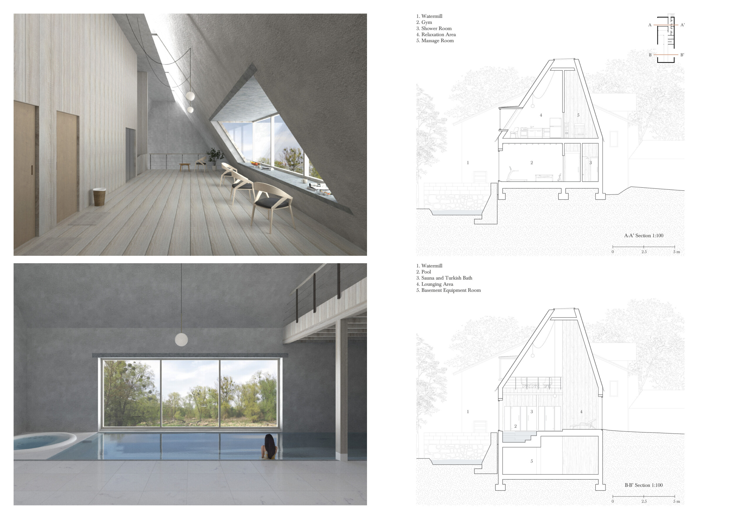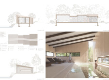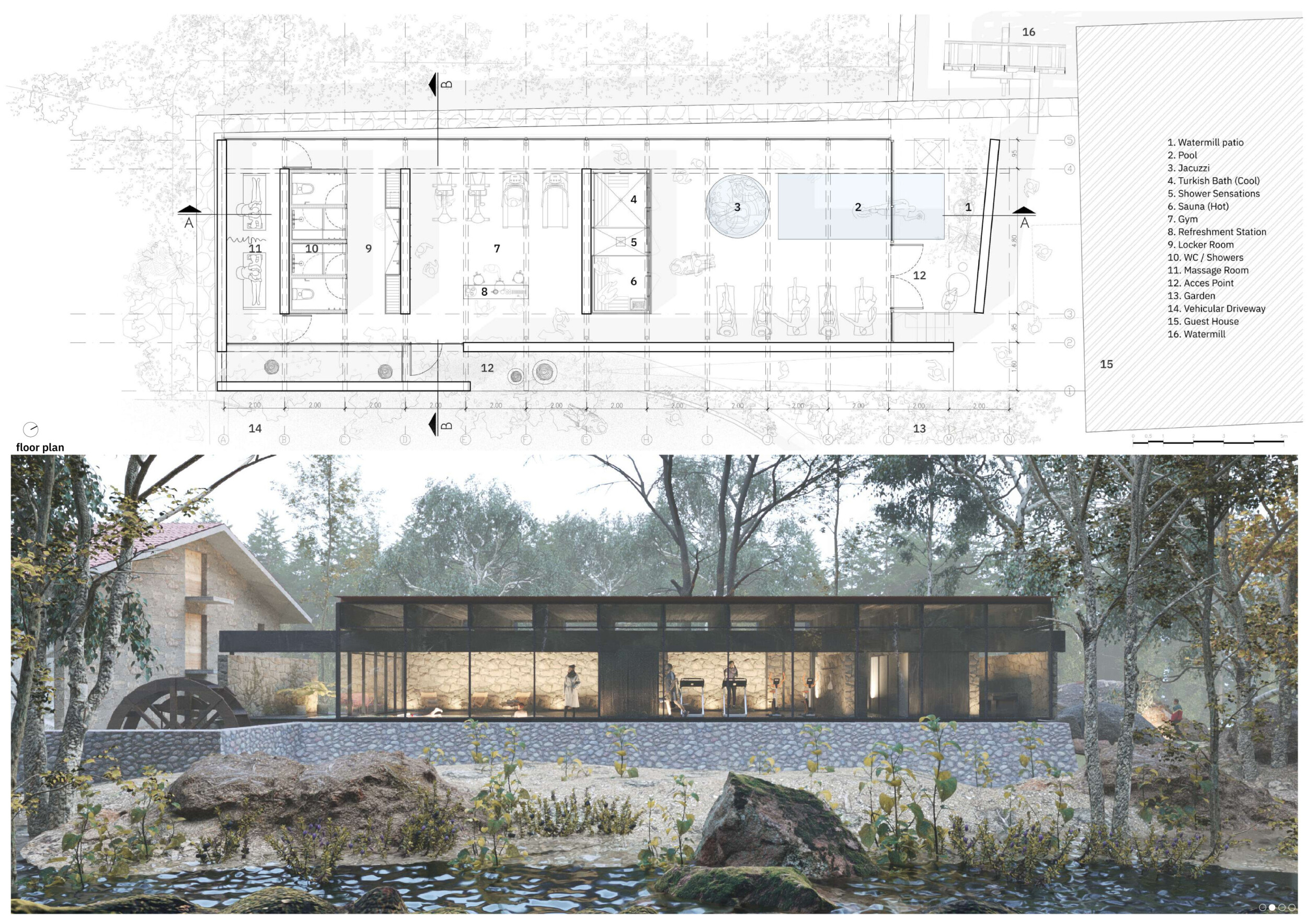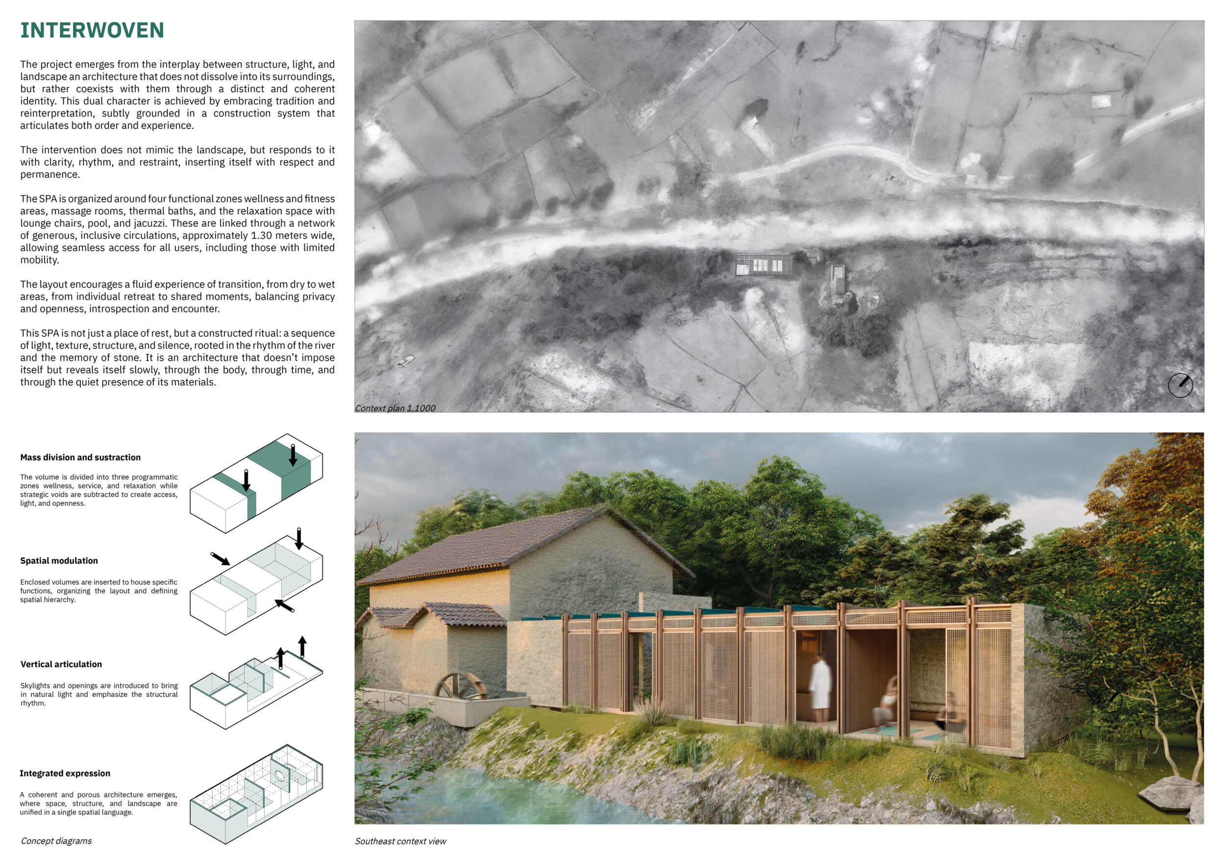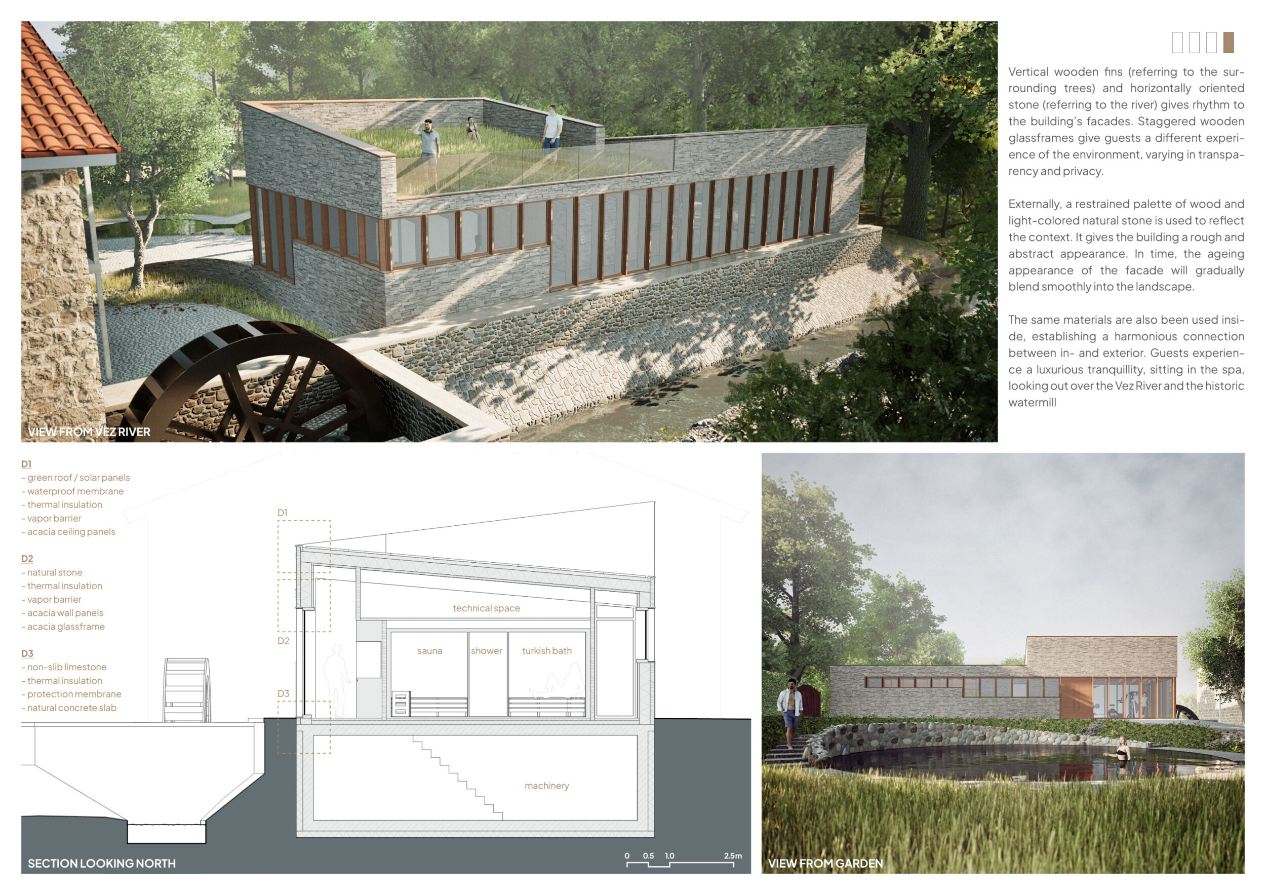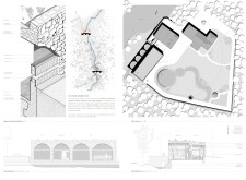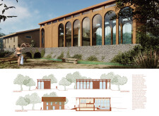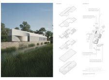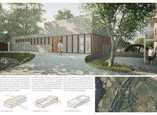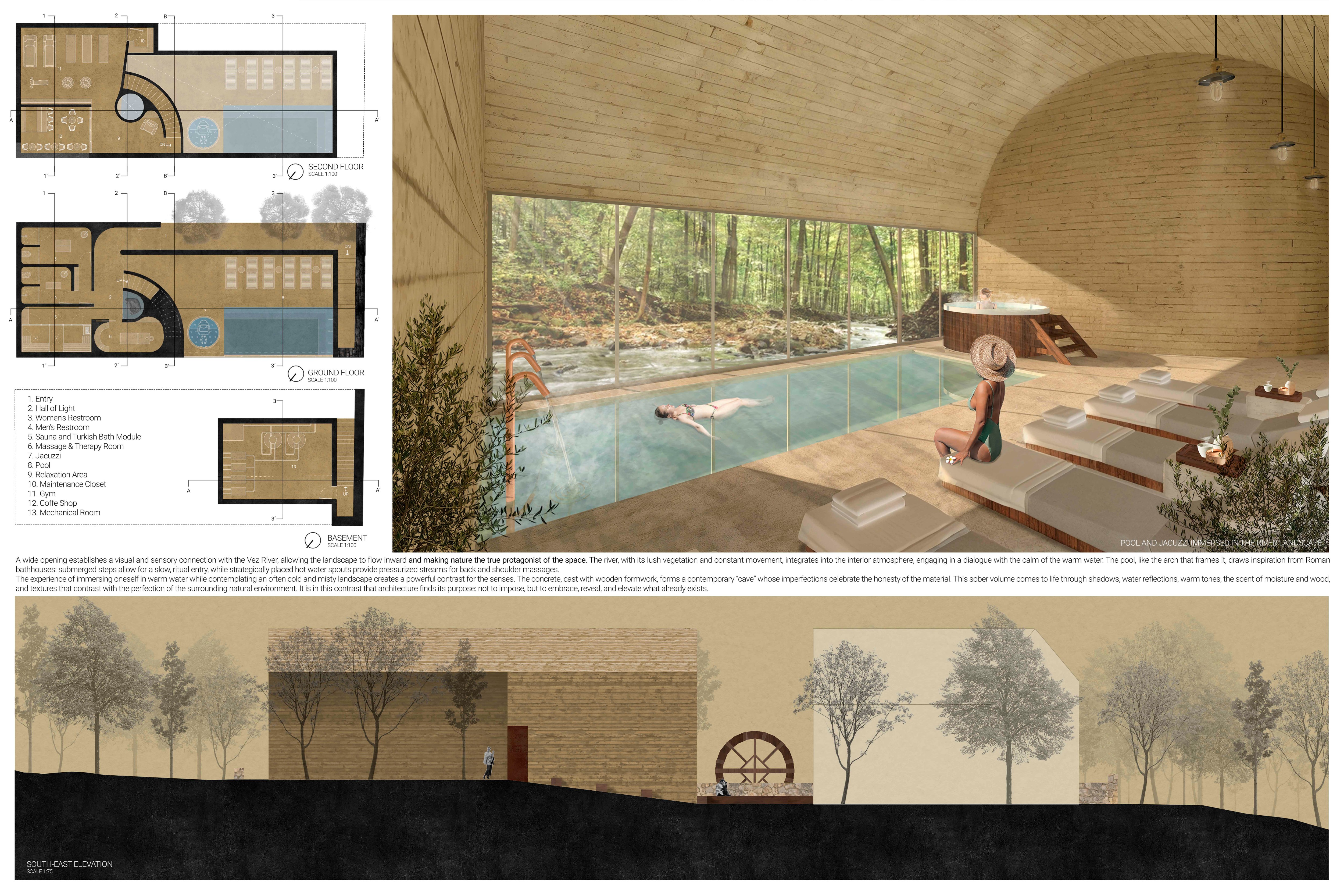 The project proposes a low-lying wellness facility set beside an existing stone mill, drawing inspiration from vernacular forms while introducing a contemporary spa program along the river’s edge. The layout centers on a carefully choreographed transition from dry to wet zones, beginning with functional programs like massage and gym, and leading toward immersive spaces such as the pool, jacuzzi, and Turkish bath. Read more A modular construction system underpins the project, combining prefabricated technical units with a structural frame and fully glazed facades to minimize disruption to the landscape. The architecture emphasizes rhythmic transparency and environmental responsiveness, orienting views toward the river and optimizing daylight through narrow, calibrated openings.