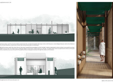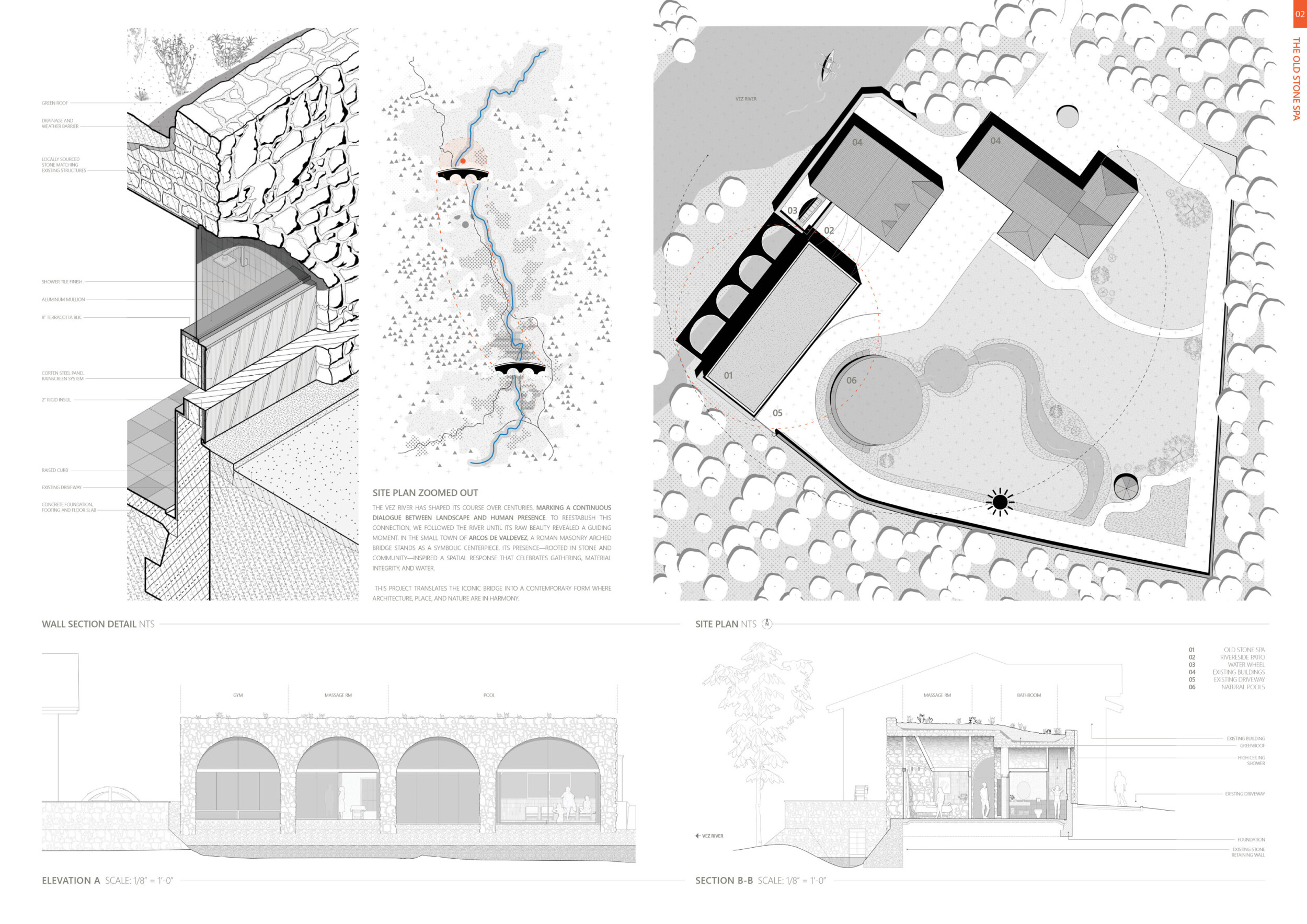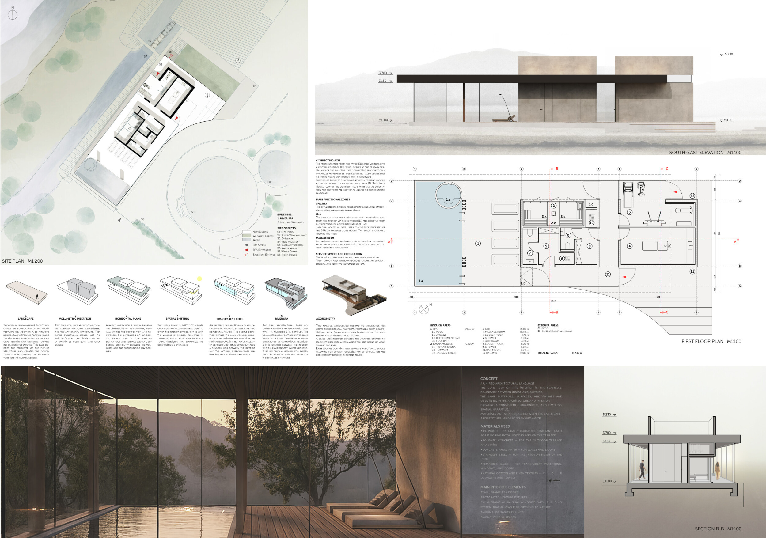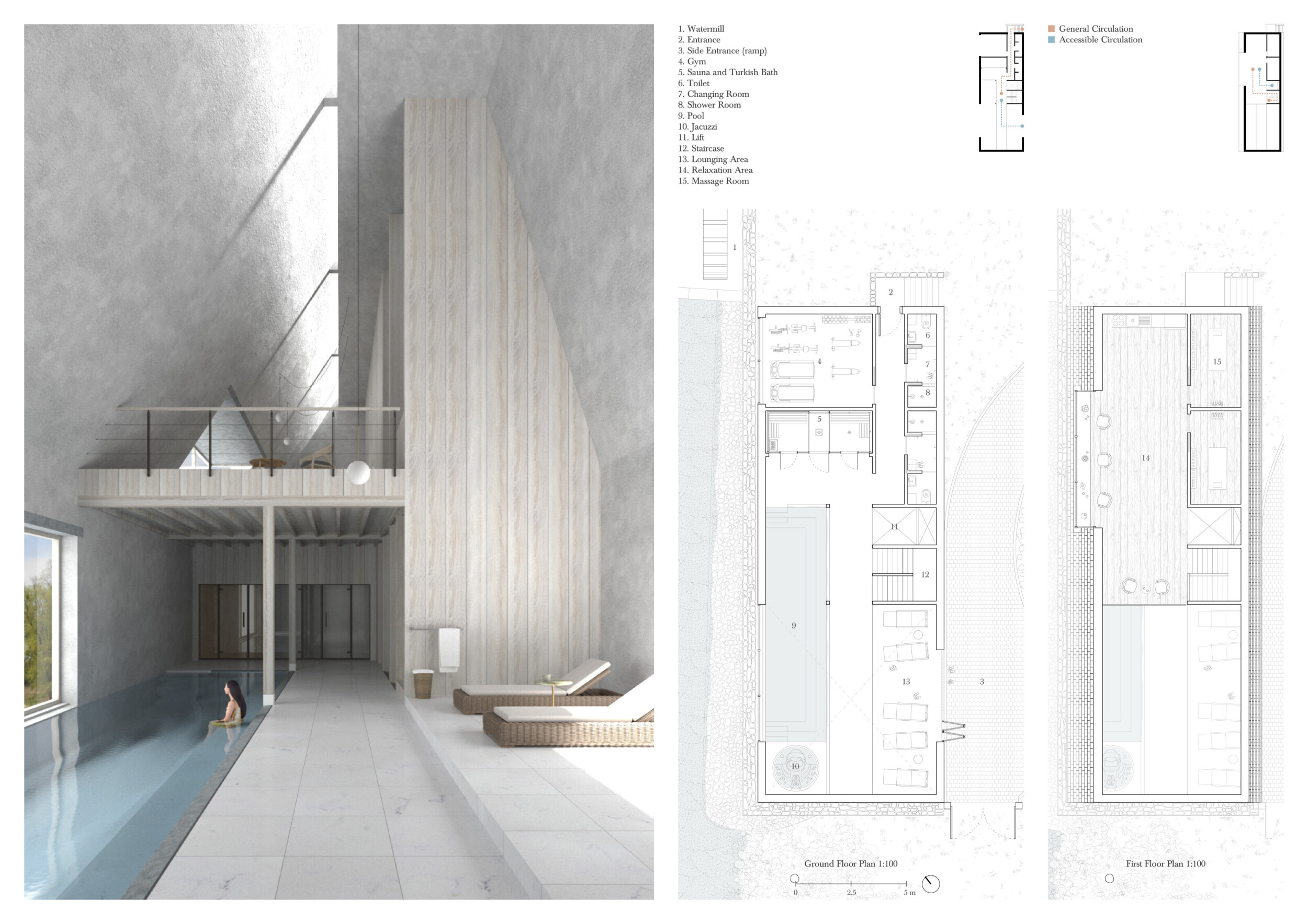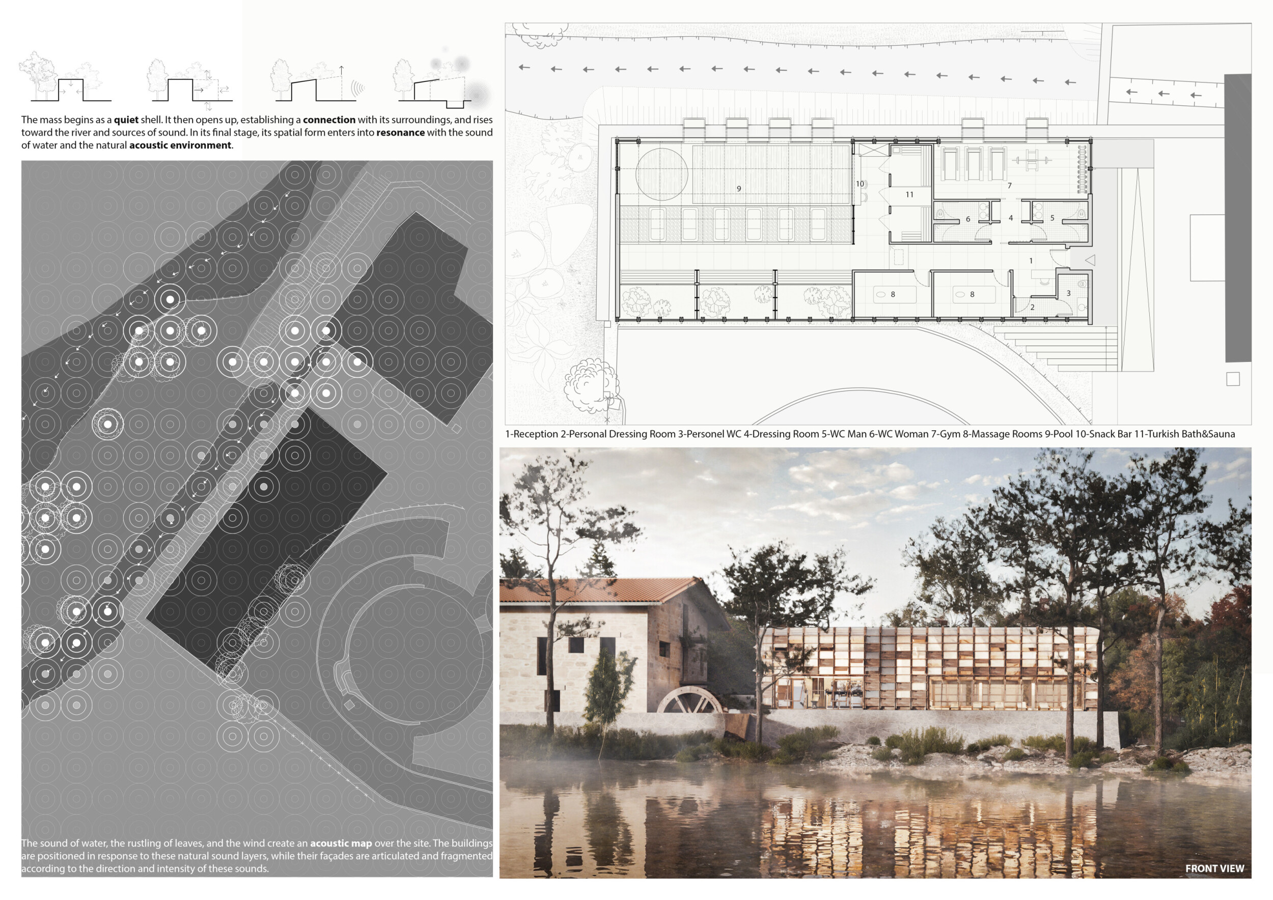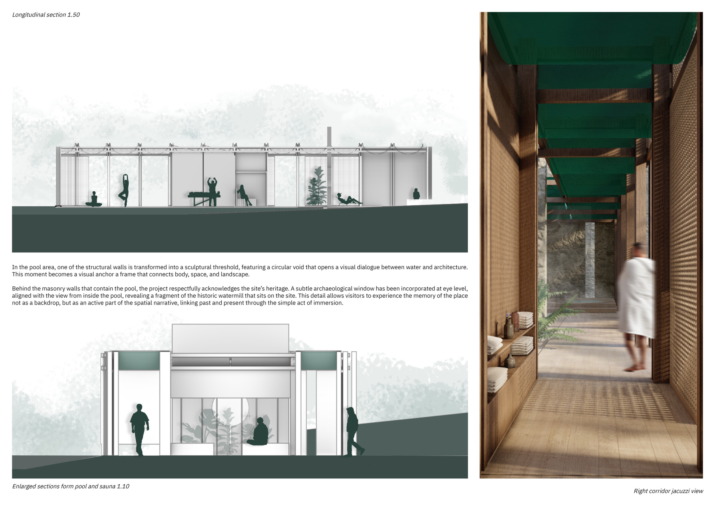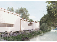 The project proposes a low-lying wellness facility set beside an existing stone mill, drawing inspiration from vernacular forms while introducing a contemporary spa program along the river’s edge. The layout centers on a carefully choreographed transition from dry to wet zones, beginning with functional programs like massage and gym, and leading toward immersive spaces such as the pool, jacuzzi, and Turkish bath. Read more A modular construction system underpins the project, combining prefabricated technical units with a structural frame and fully glazed facades to minimize disruption to the landscape. The architecture emphasizes rhythmic transparency and environmental responsiveness, orienting views toward the river and optimizing daylight through narrow, calibrated openings.