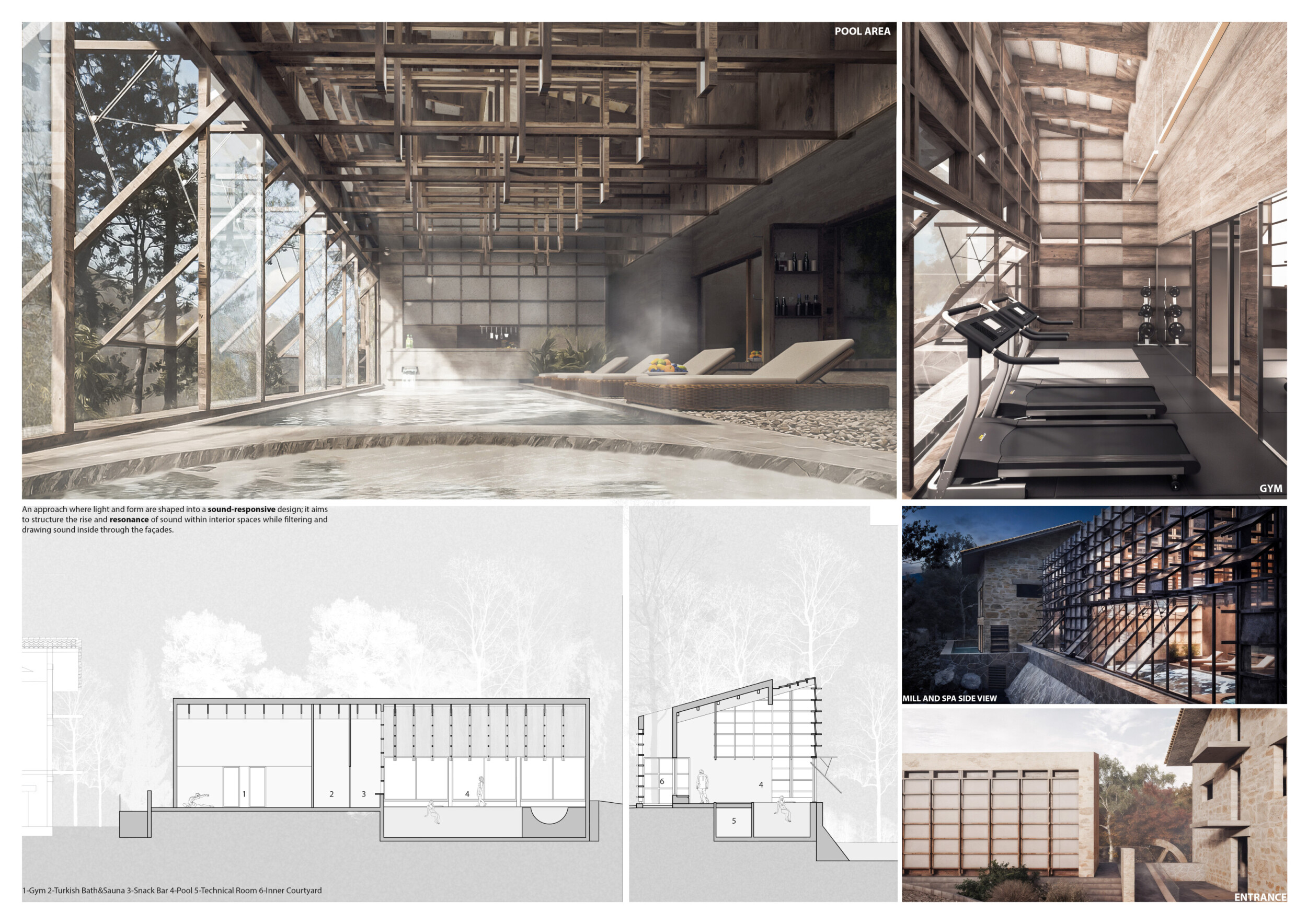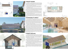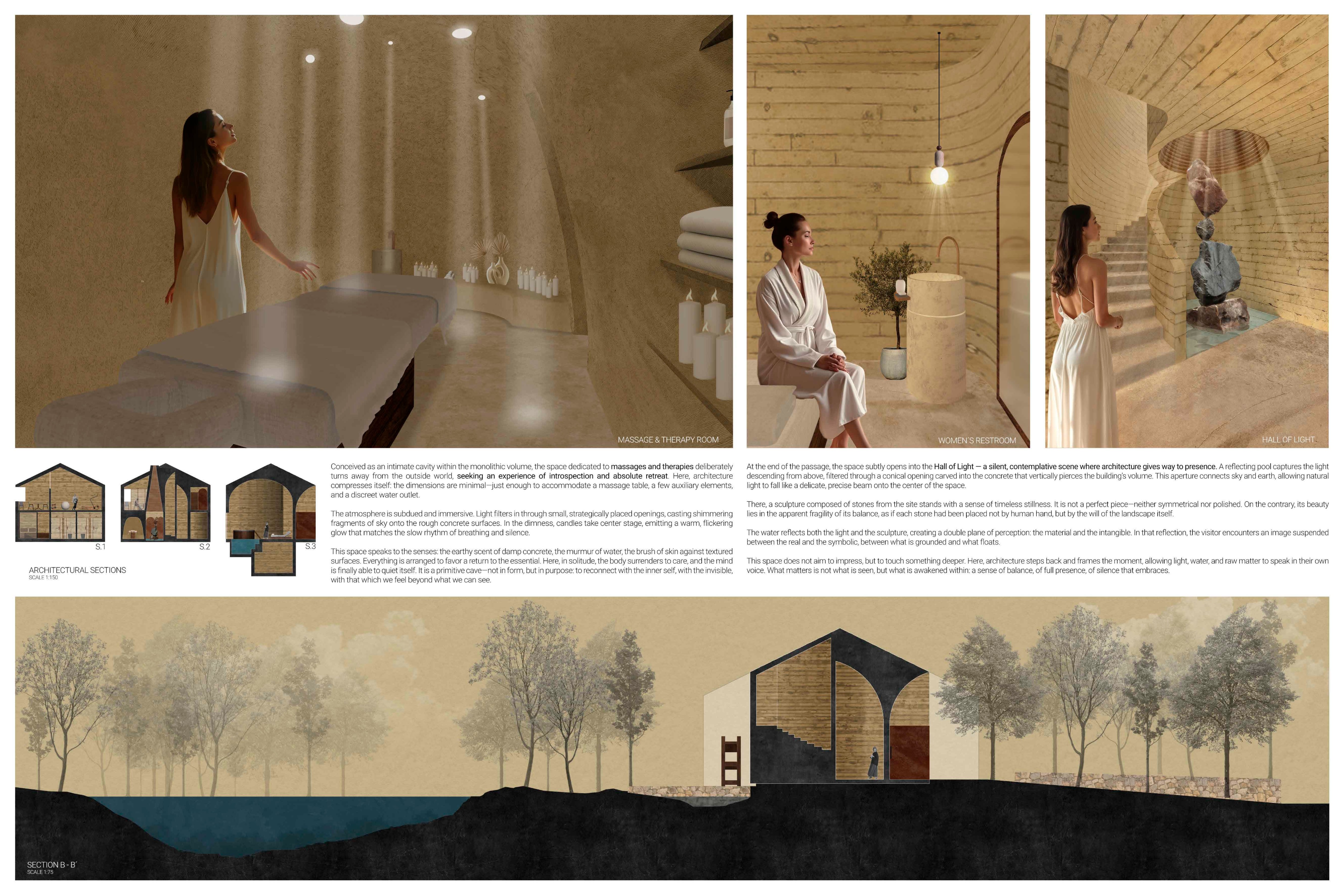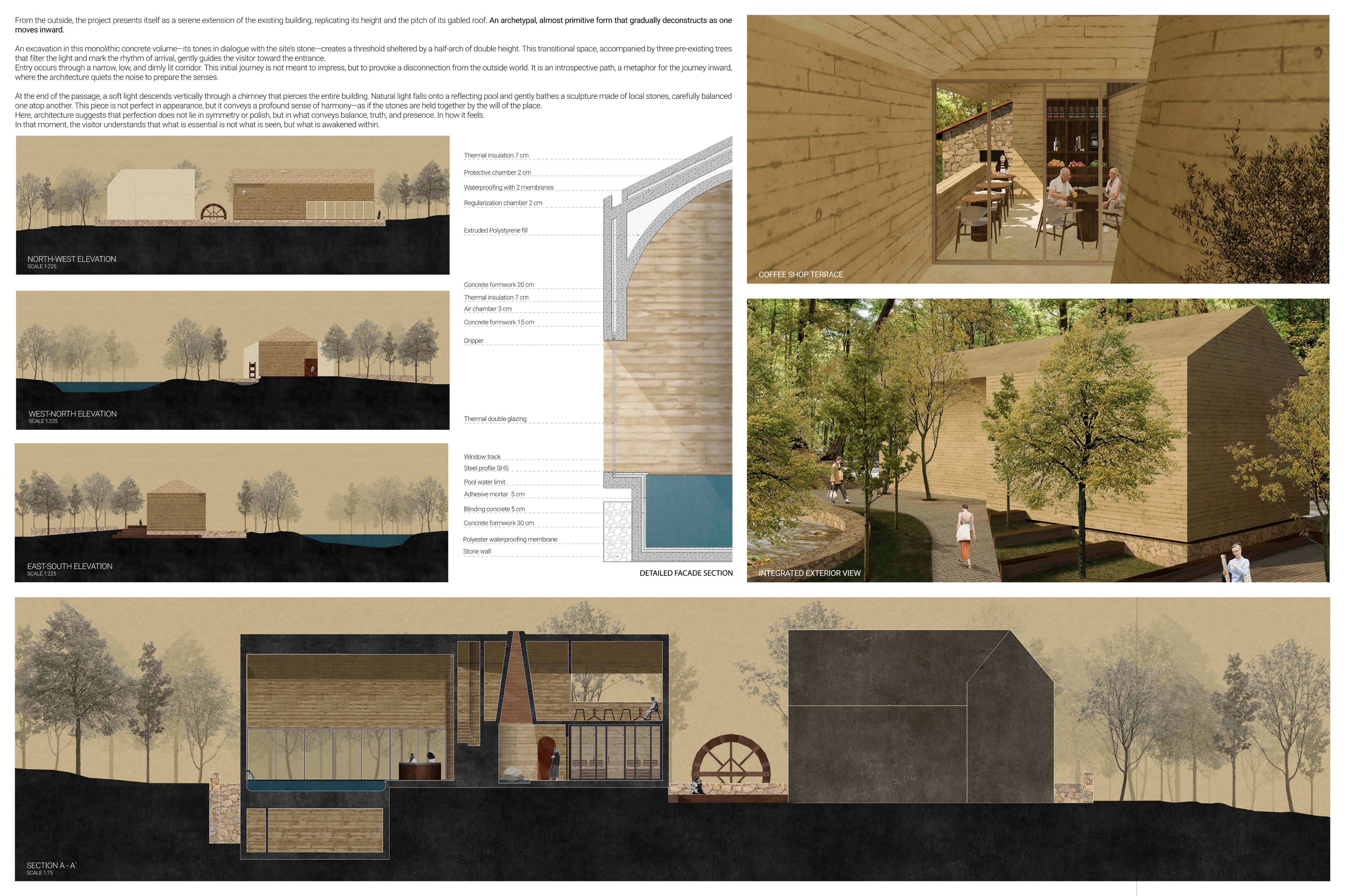 Designers were asked to develop an intimate SPA complex that thoughtfully integrates amenities such as a sauna, jacuzzi, Turkish bath, massage rooms, gym, and a pool—while preserving the quiet charm and ecological sensitivity of the site. The competition emphasized architecture rooted in sustainability, material honesty, and a deep respect for place.
