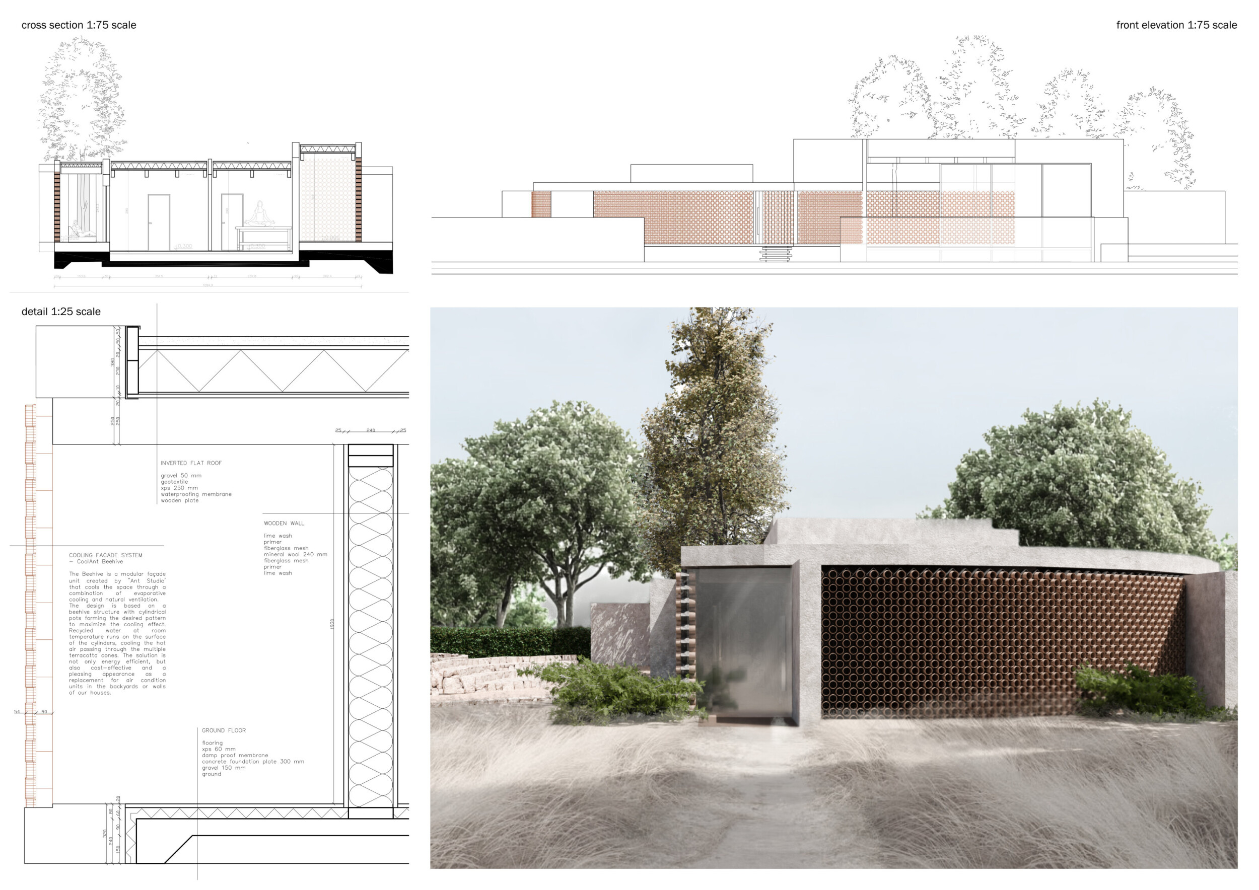 The drawings are consistently well-executed, with linework that maintains clarity across both construction diagrams and plan. The section and axonometric are especially successful at conveying structural and environmental intent, though the annotation design could better emphasize key labels through font hierarchy or contrast.