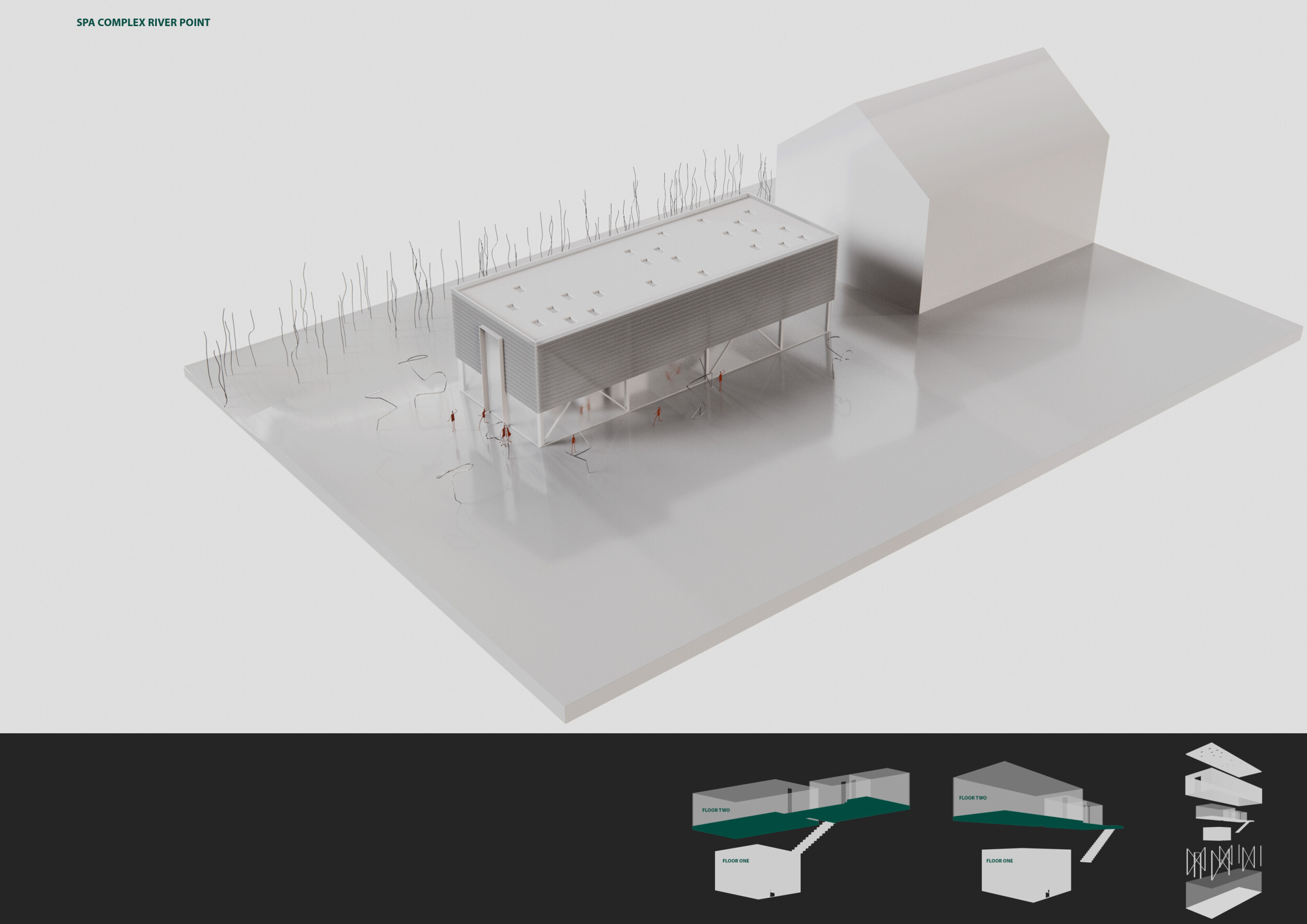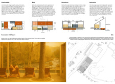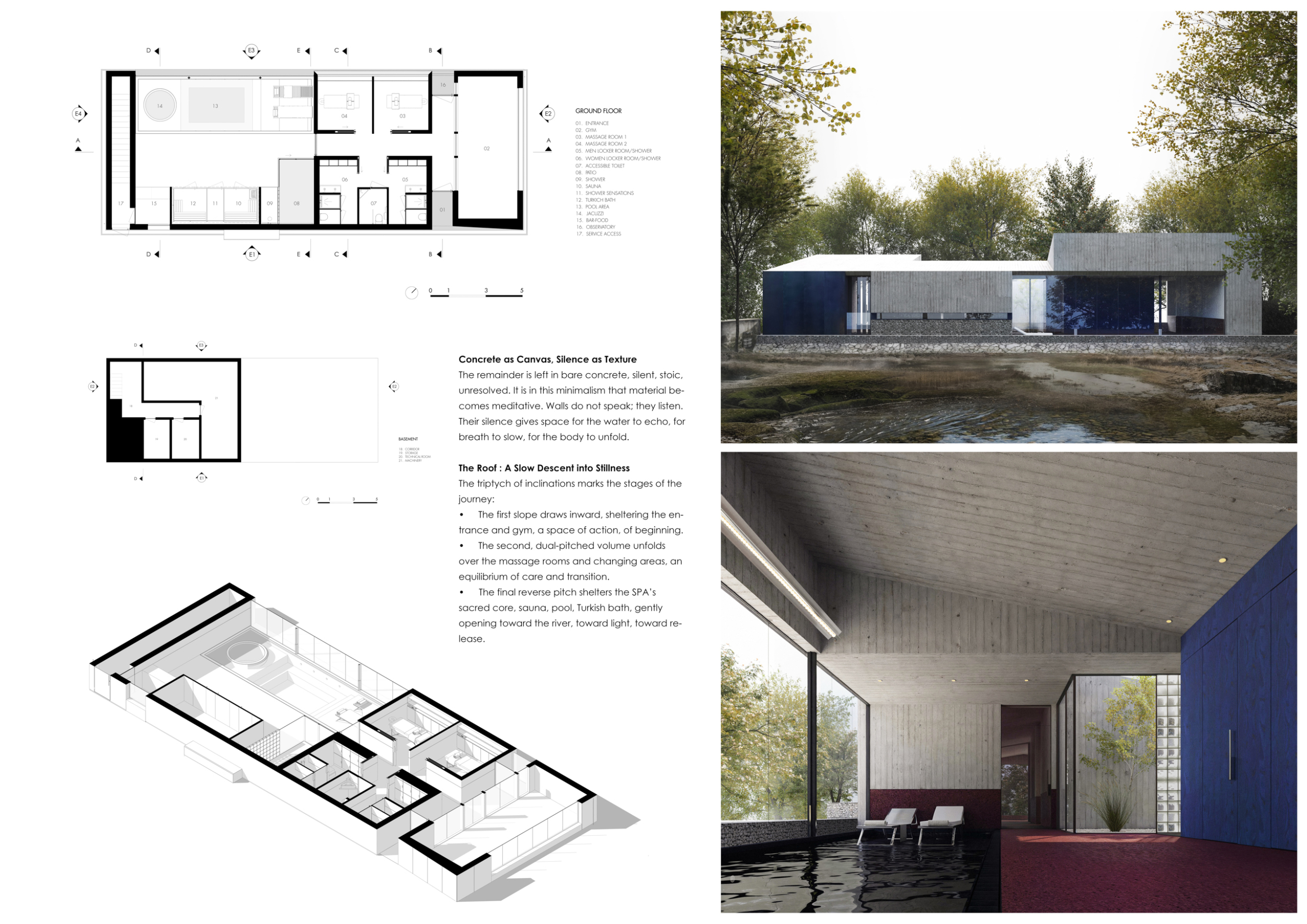 This project presents a refined intervention on the banks of a forested lake, where architecture emerges as a discreet mediator between human activity and natural context. Composed of three parallel, barn-like volumes, the scheme draws from vernacular rural forms while embracing contemporary sensibilities in materiality and spatial planning. The central volume accommodates public and wellness functions, flanked by two wings with more private programming.