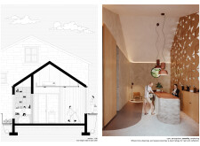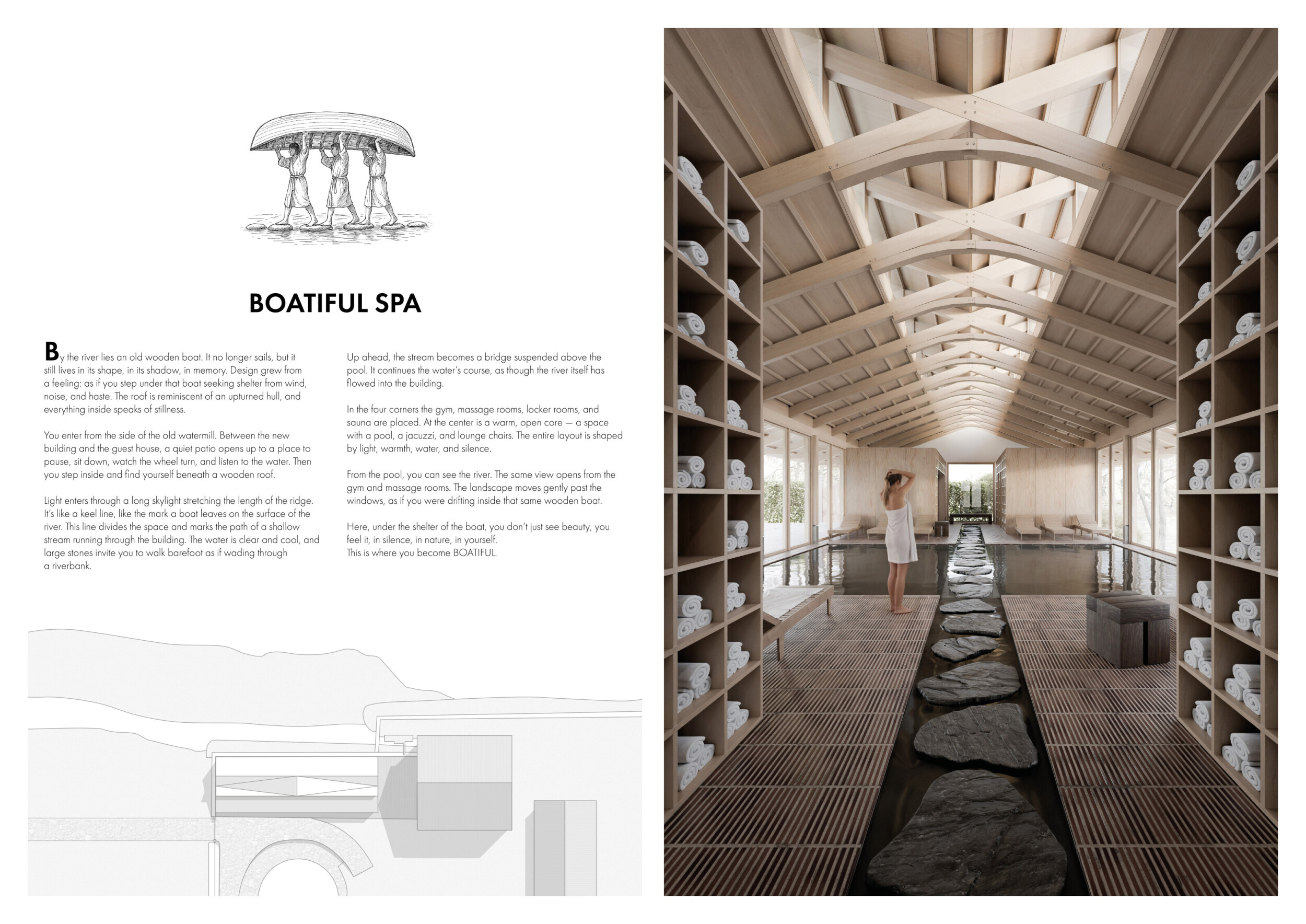 Boatifull Spa is structured around a central pool, with associated functions such as locker rooms, a gym, massage rooms, and sauna modules arranged symmetrically along its length. The architectural concept is derived from the image of an upturned wooden boat, influencing both the form of the scissor truss roof and the material expression of timber interiors. The structure features modular timber window units, reinforced concrete walls, and an underfloor technical space for pool maintenance.