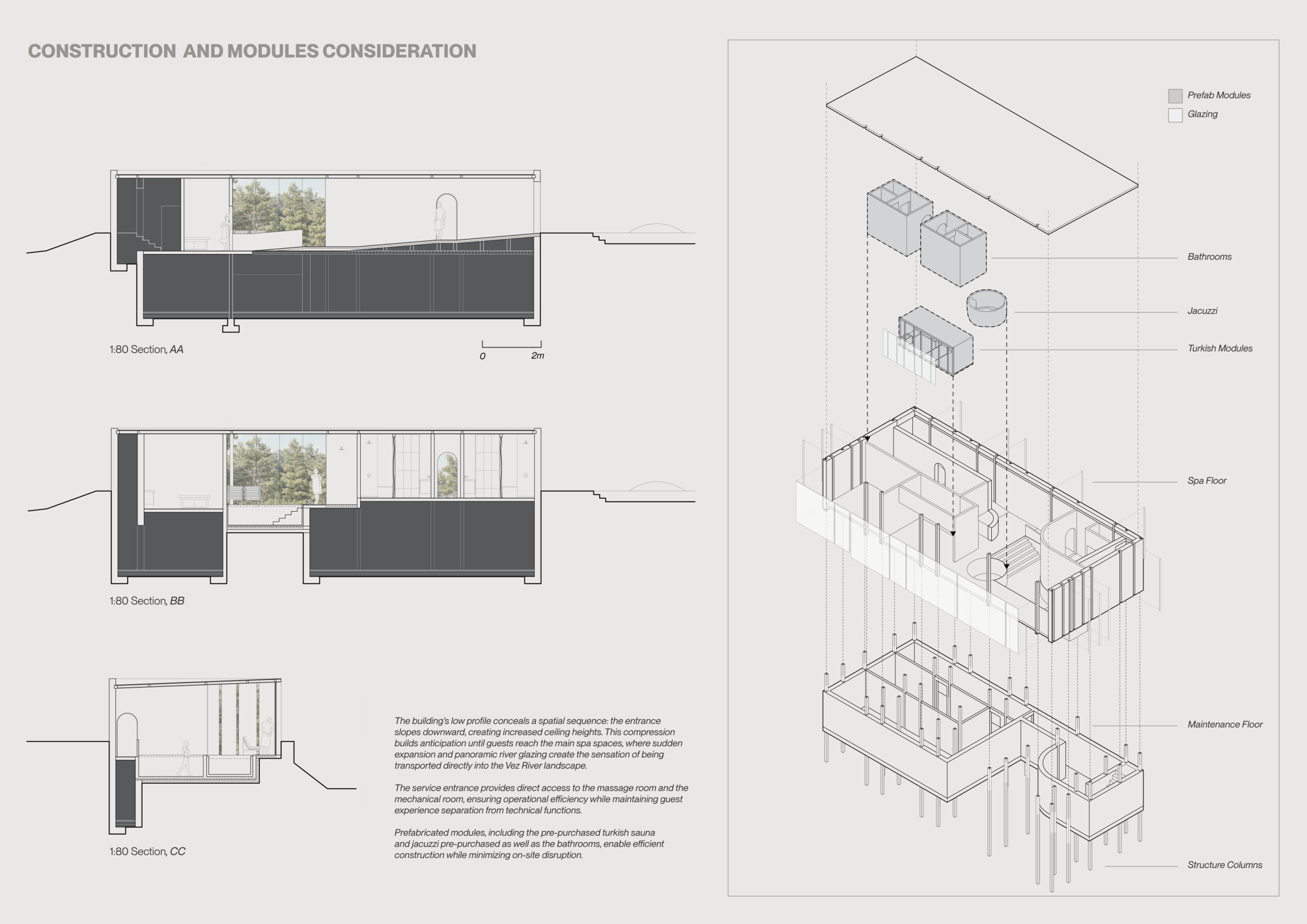 This is a cohesive and well-structured presentation that communicates the spatial choreography and modular construction strategy of the project. The diagrams and plans are clearly articulated and benefit from thoughtful zoning logic that supports the project’s narrative of transitioning experiences.